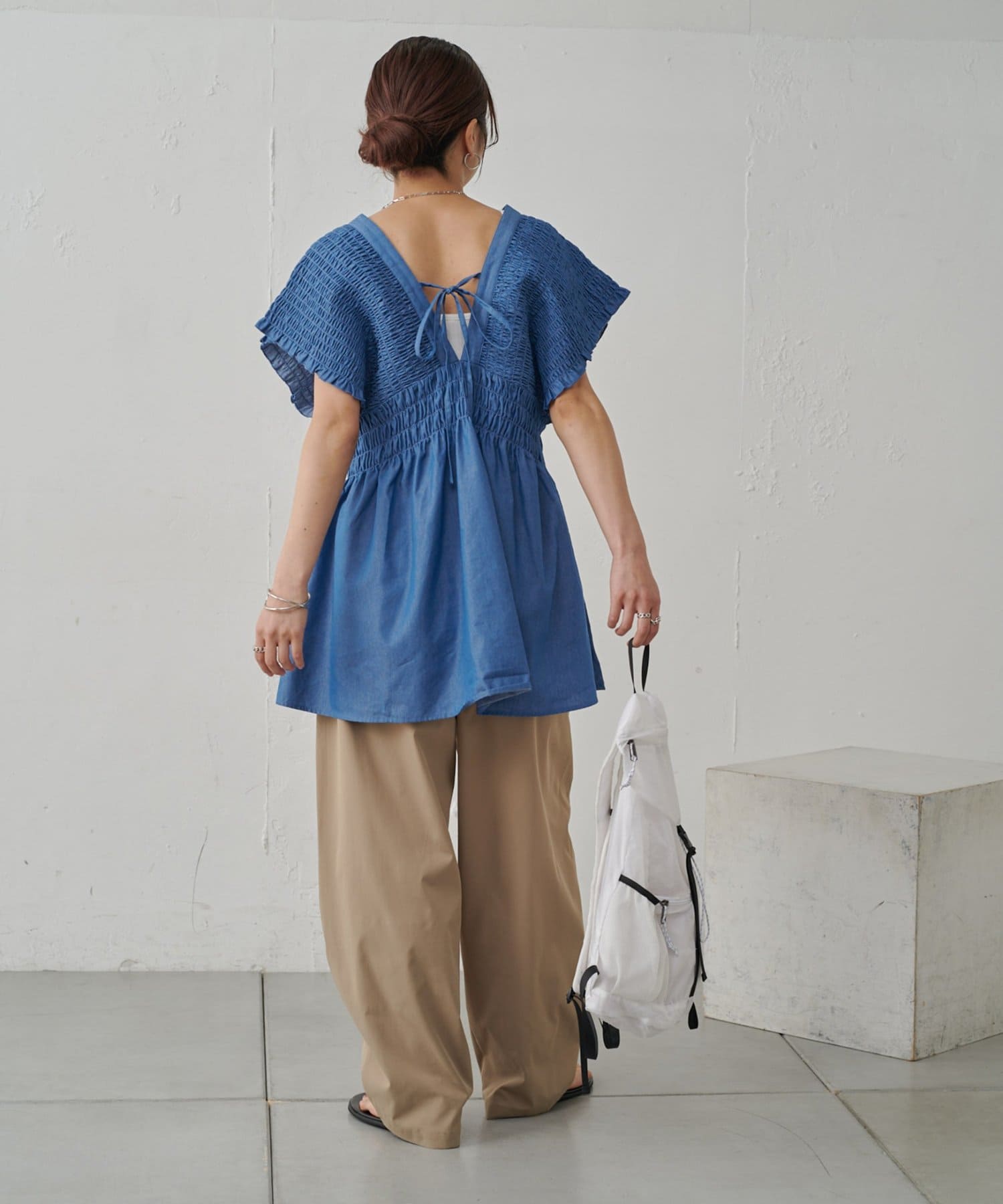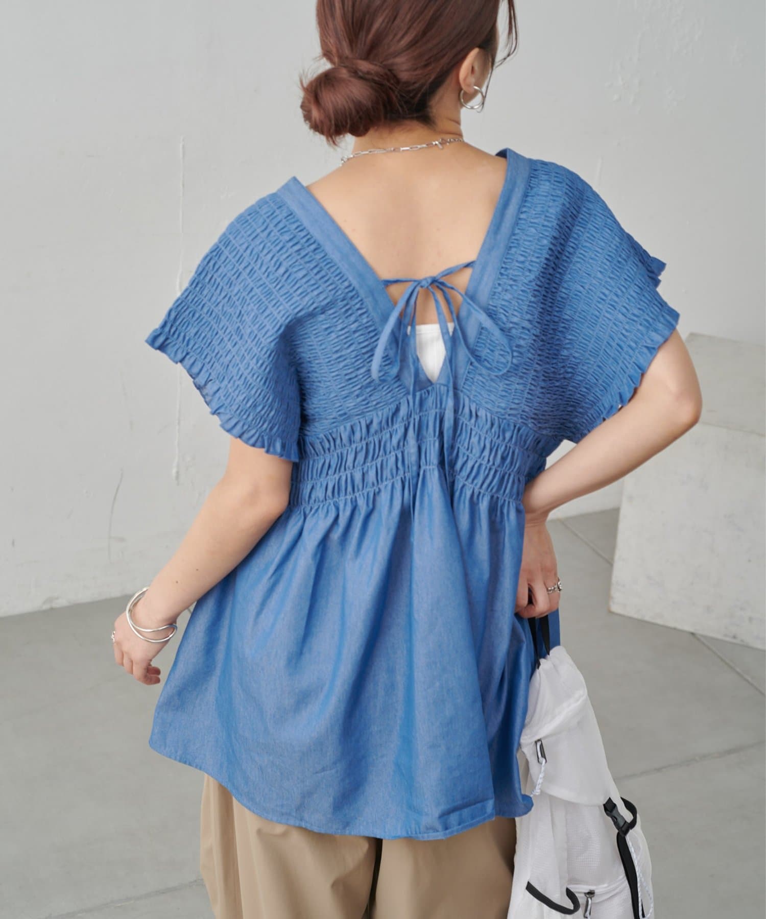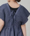 胸元のサイズ感は後ろのリボンでサイズ調整可能なので、どんなインナーと合わせてもごわつき感なく着ていただけます。