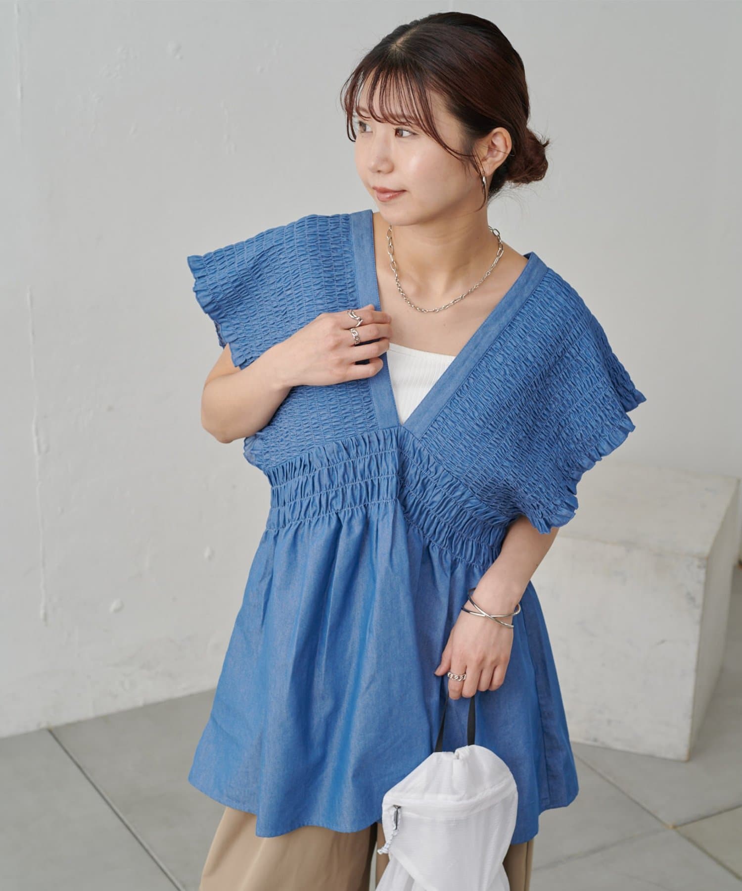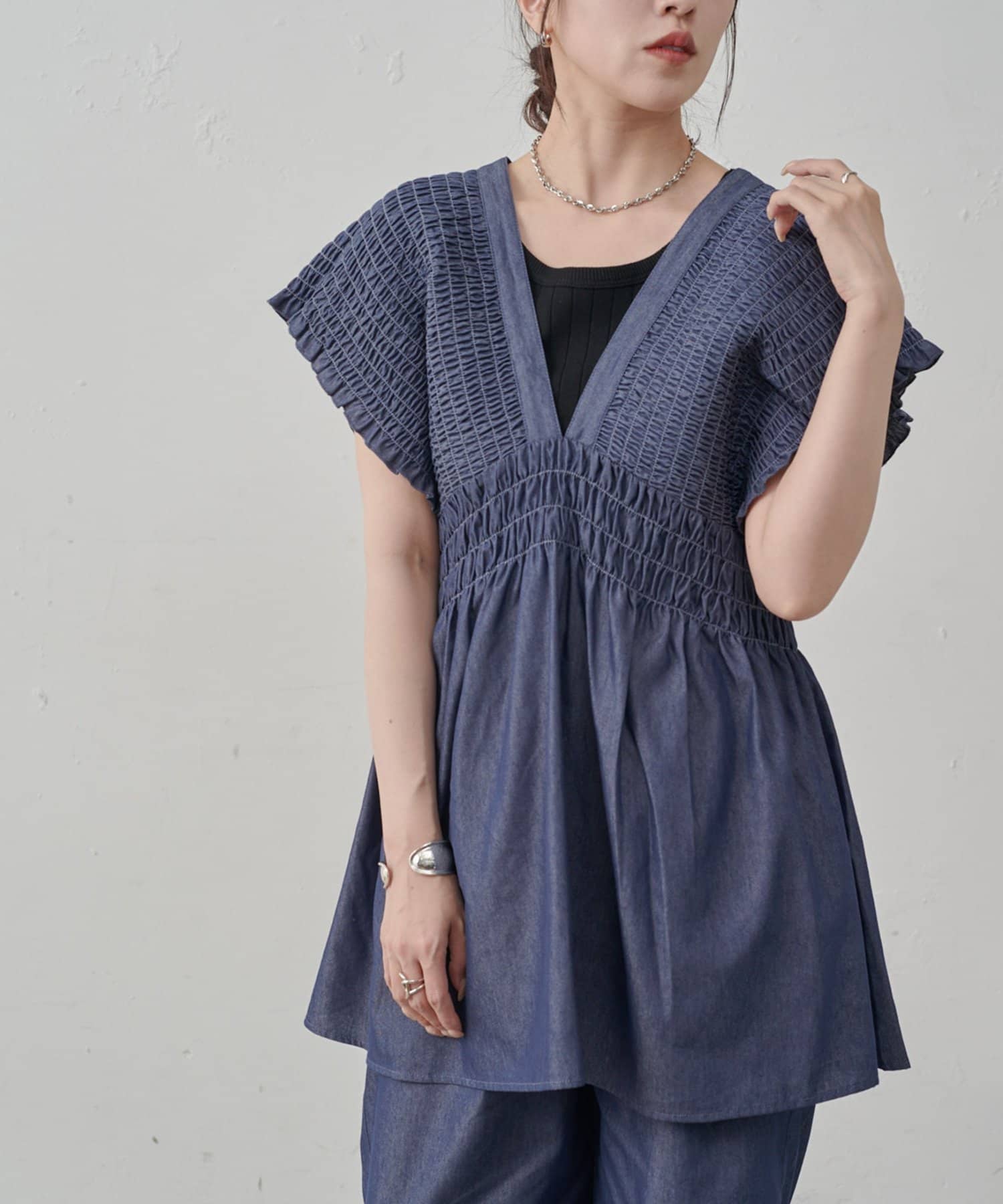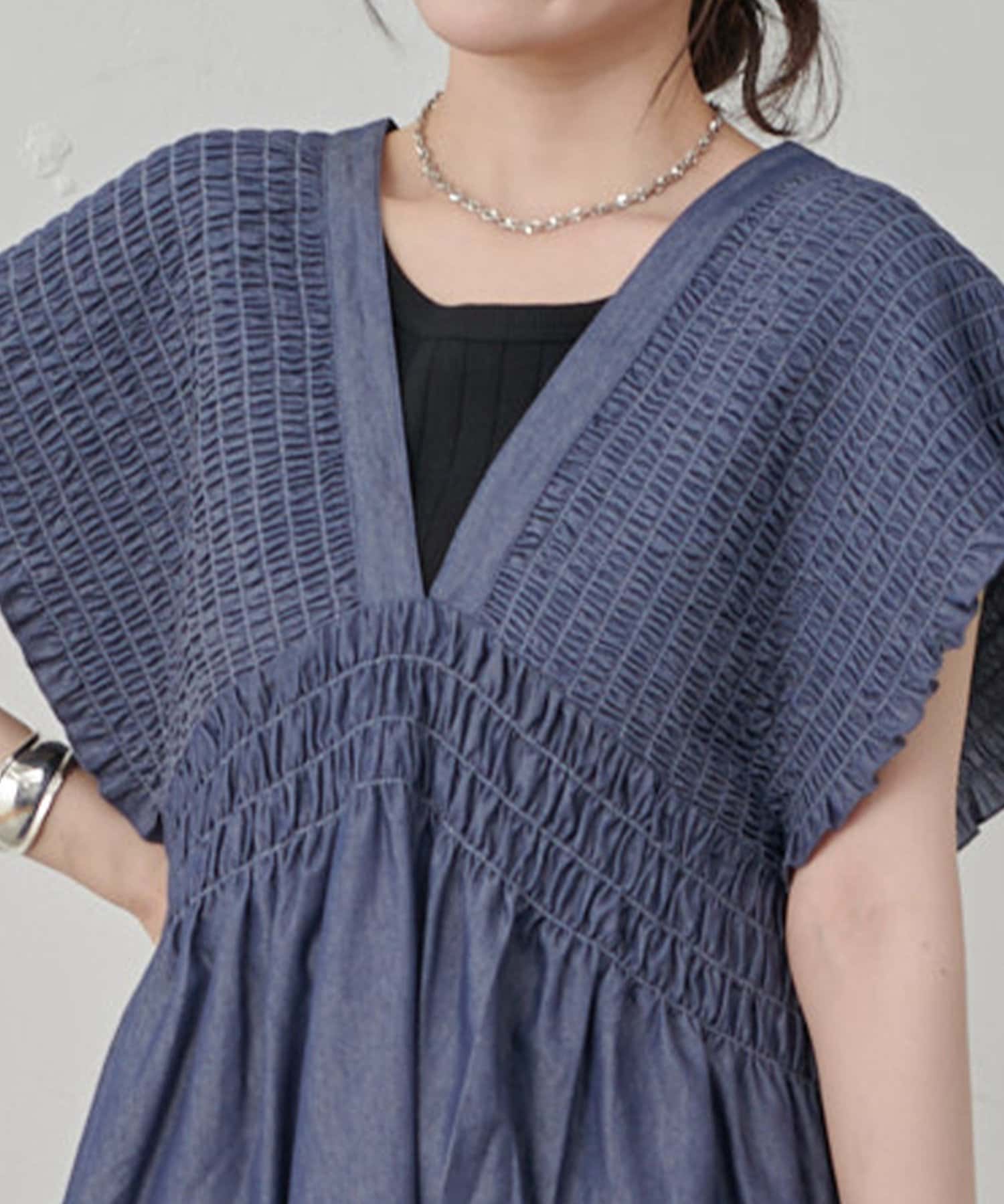肩のシャーリングで小顔効果抜群のデニムチュニックです。