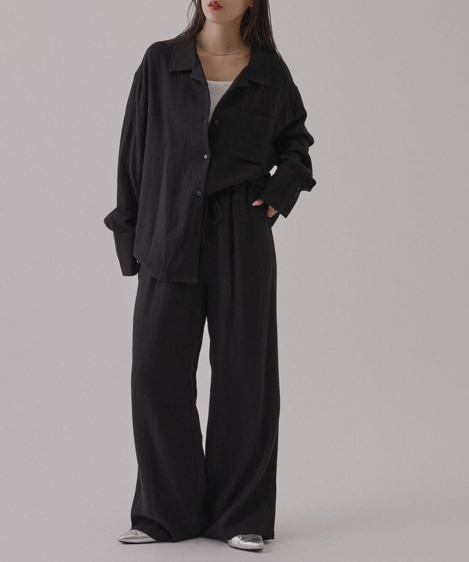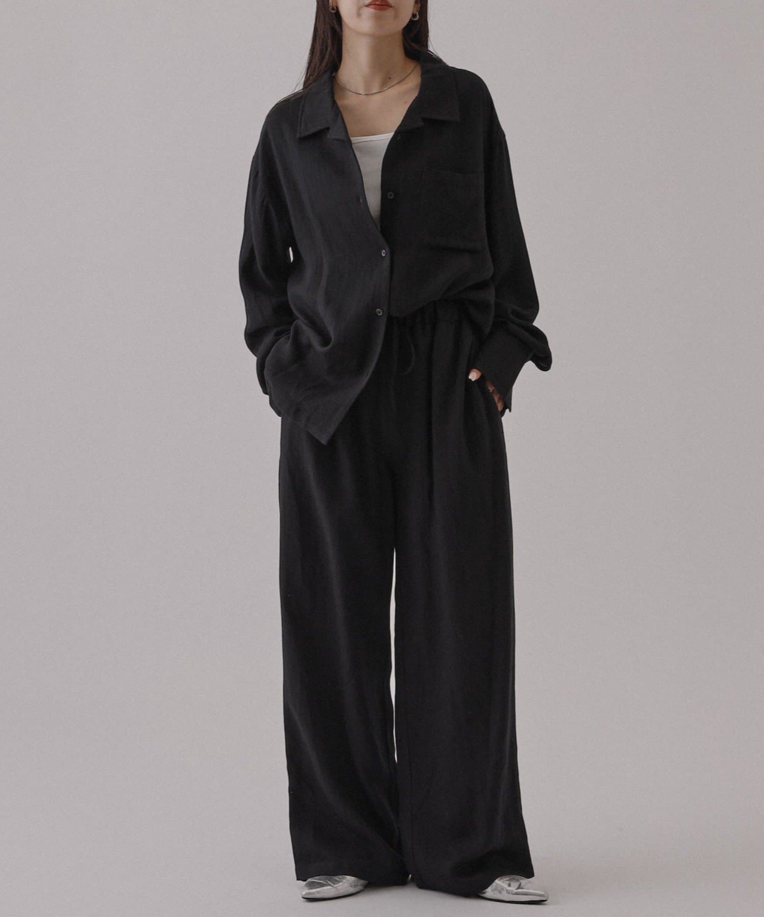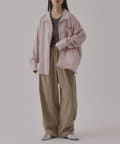 同素材のアイテムとセットアップスタイルもオススメですが、デニムやスヤックスなど様々なアイテムとも相性がいいので、着回しに困りにくい万能シャツです。