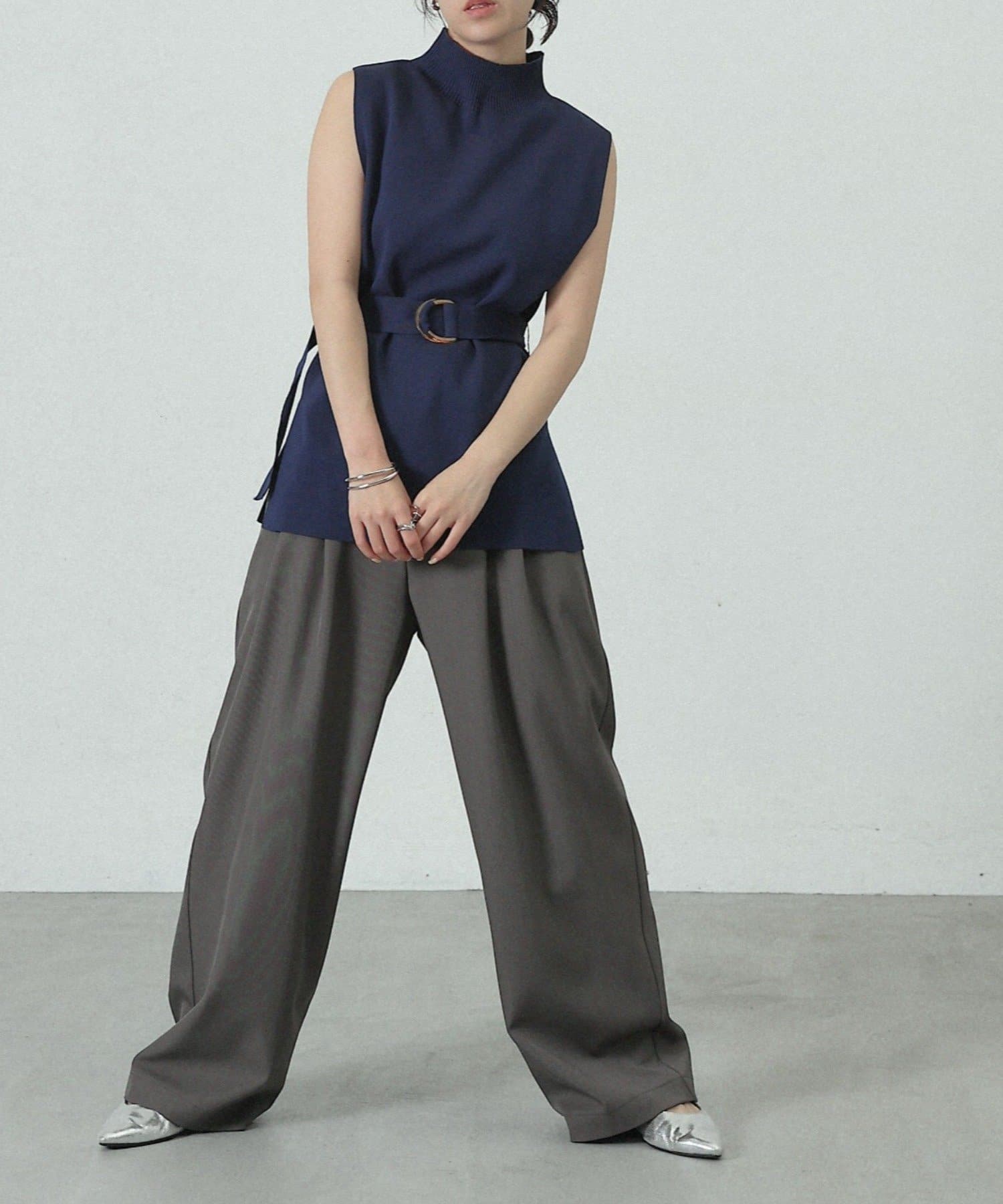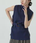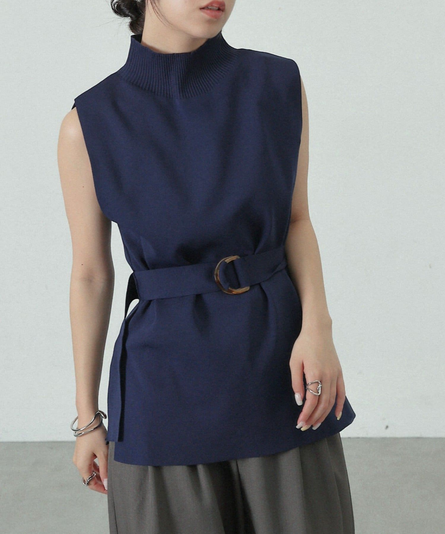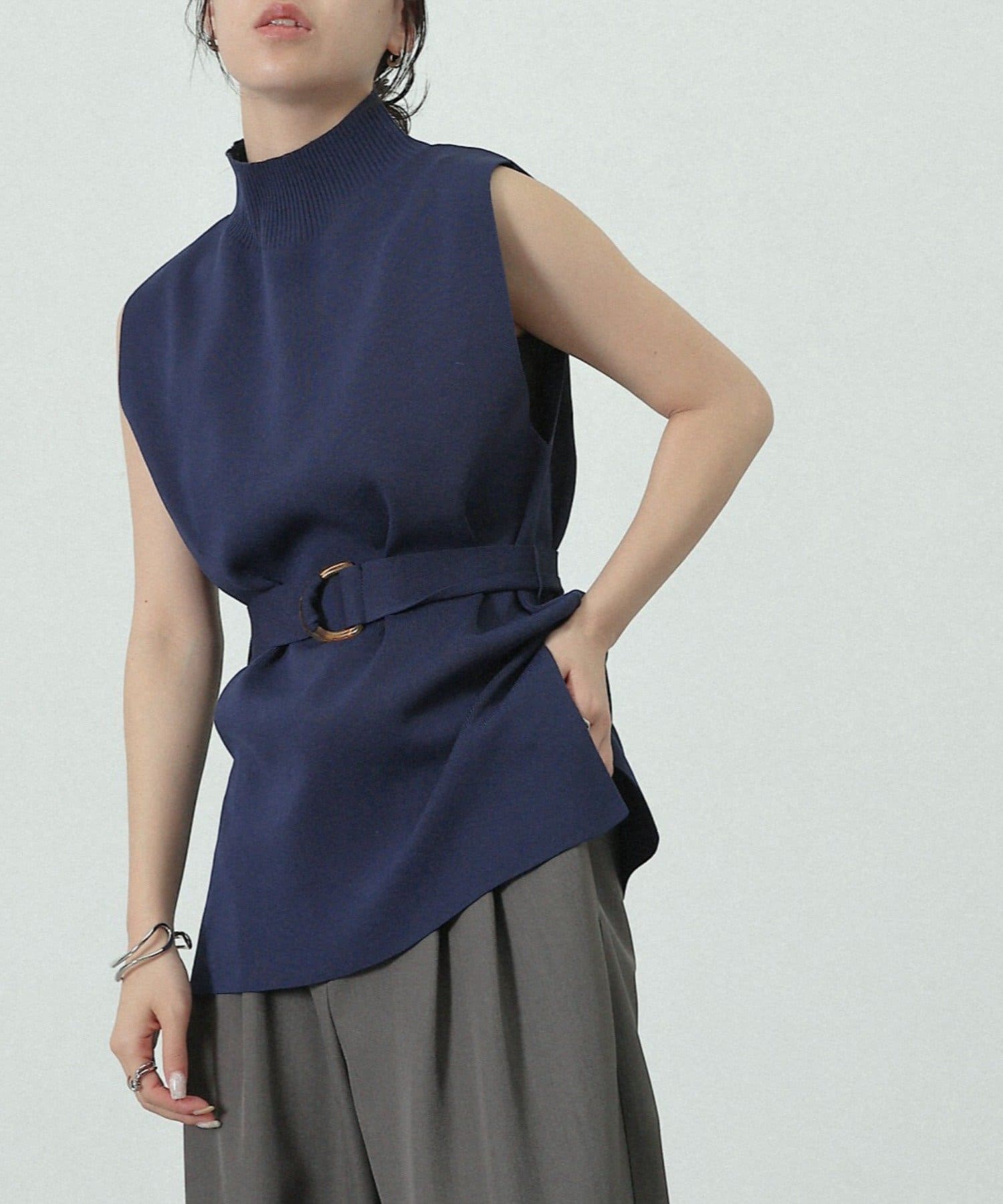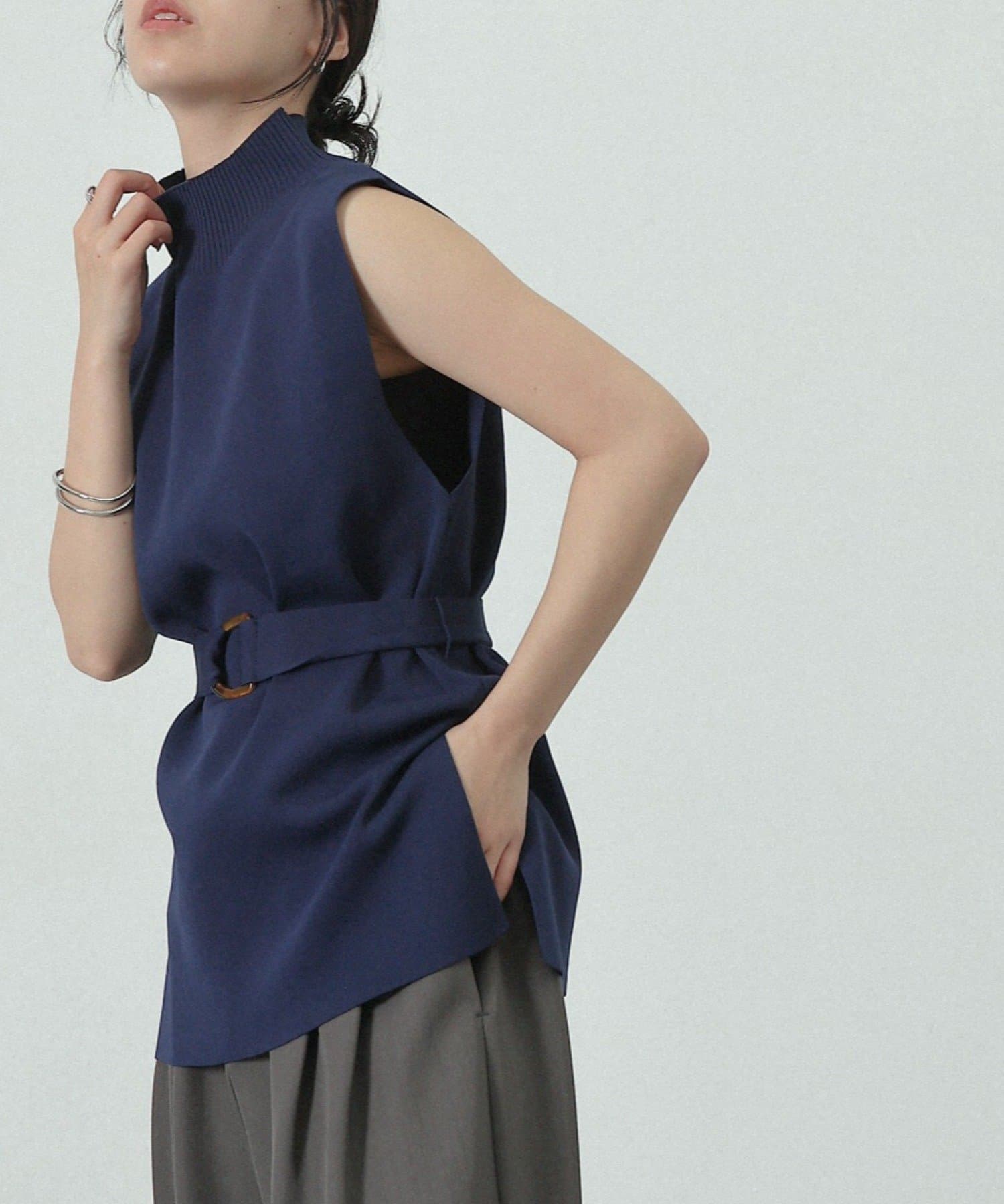 詰まりすぎないハイネックデザインとサイドにあるスリット、ウエストベルトがポイントのトップスです。