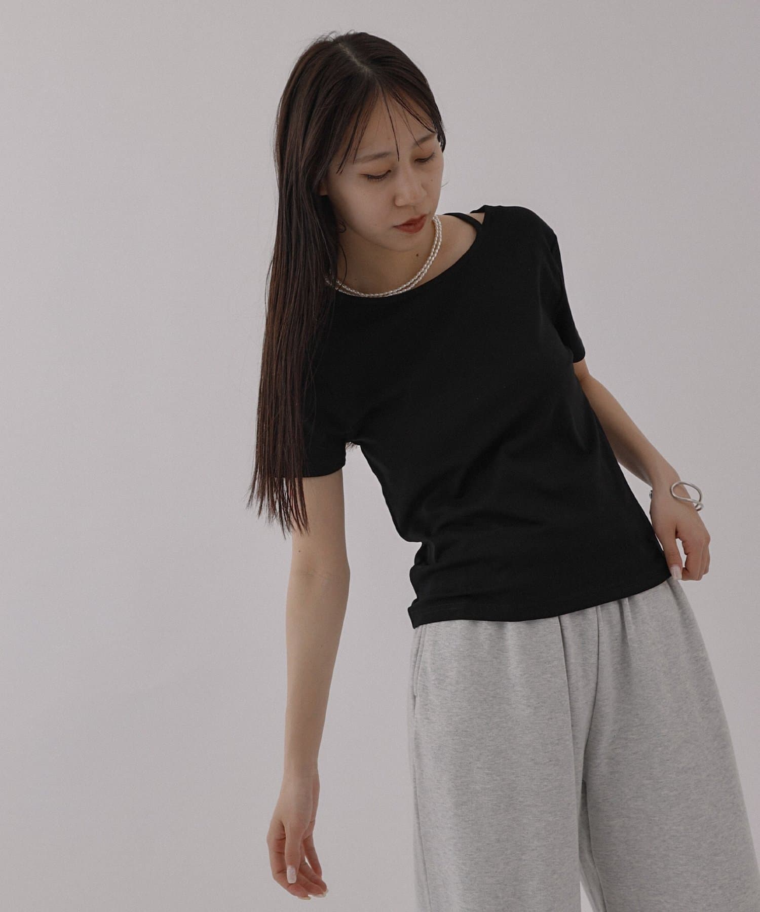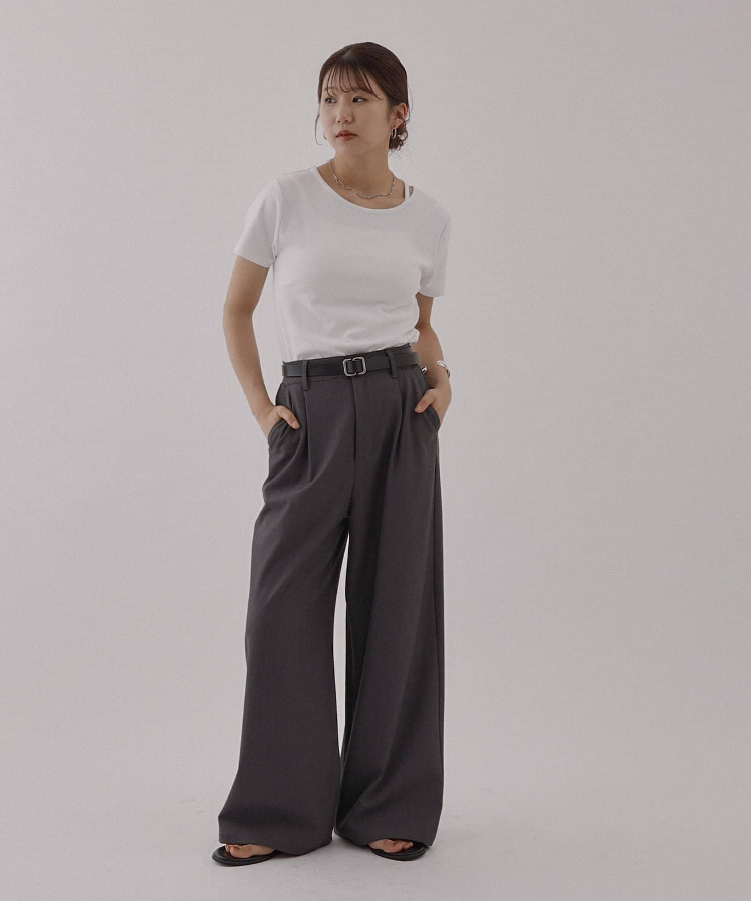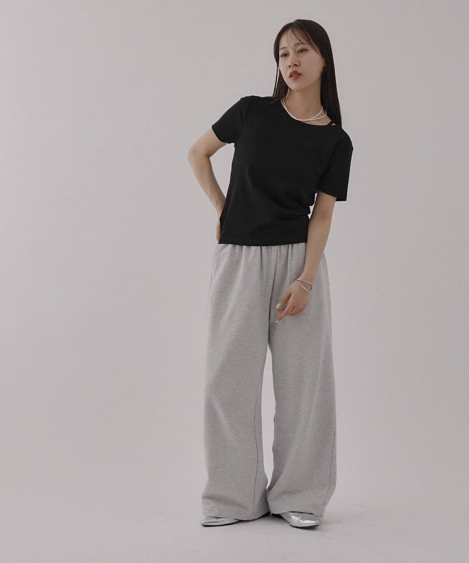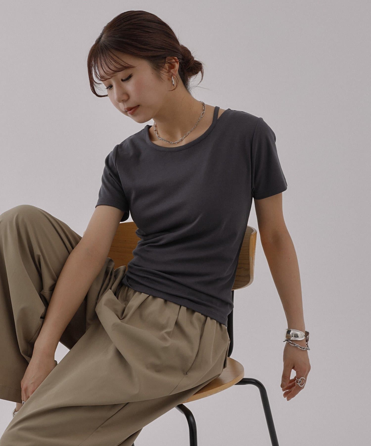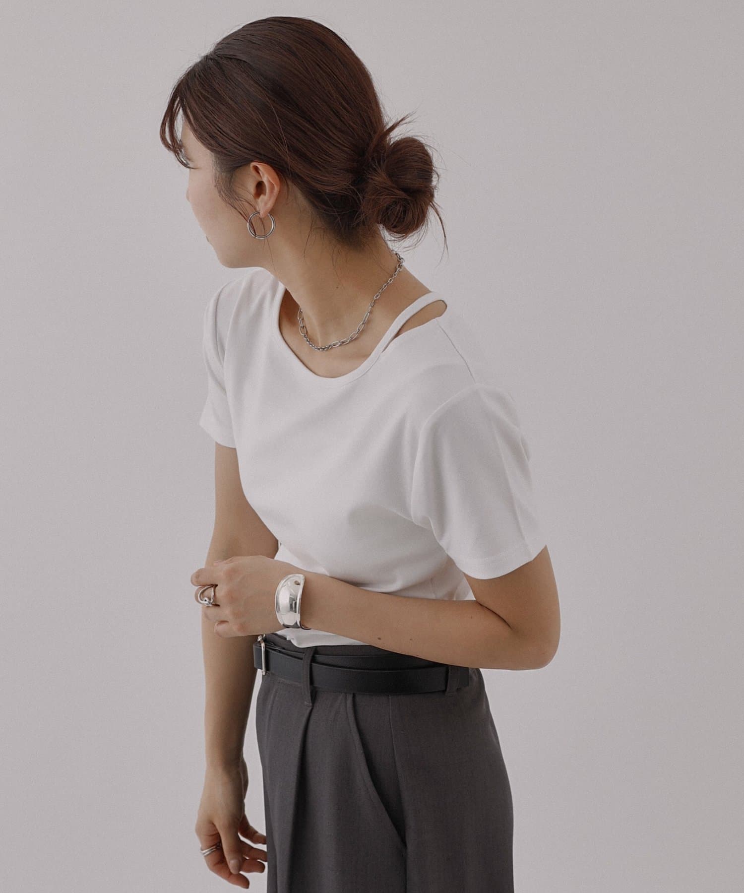 シンプルなシルエットですが首元にあるスリットデザインがアクセントになっていて、顔周りがすっきりとした印象になるアイテムです。