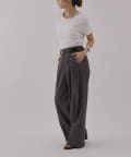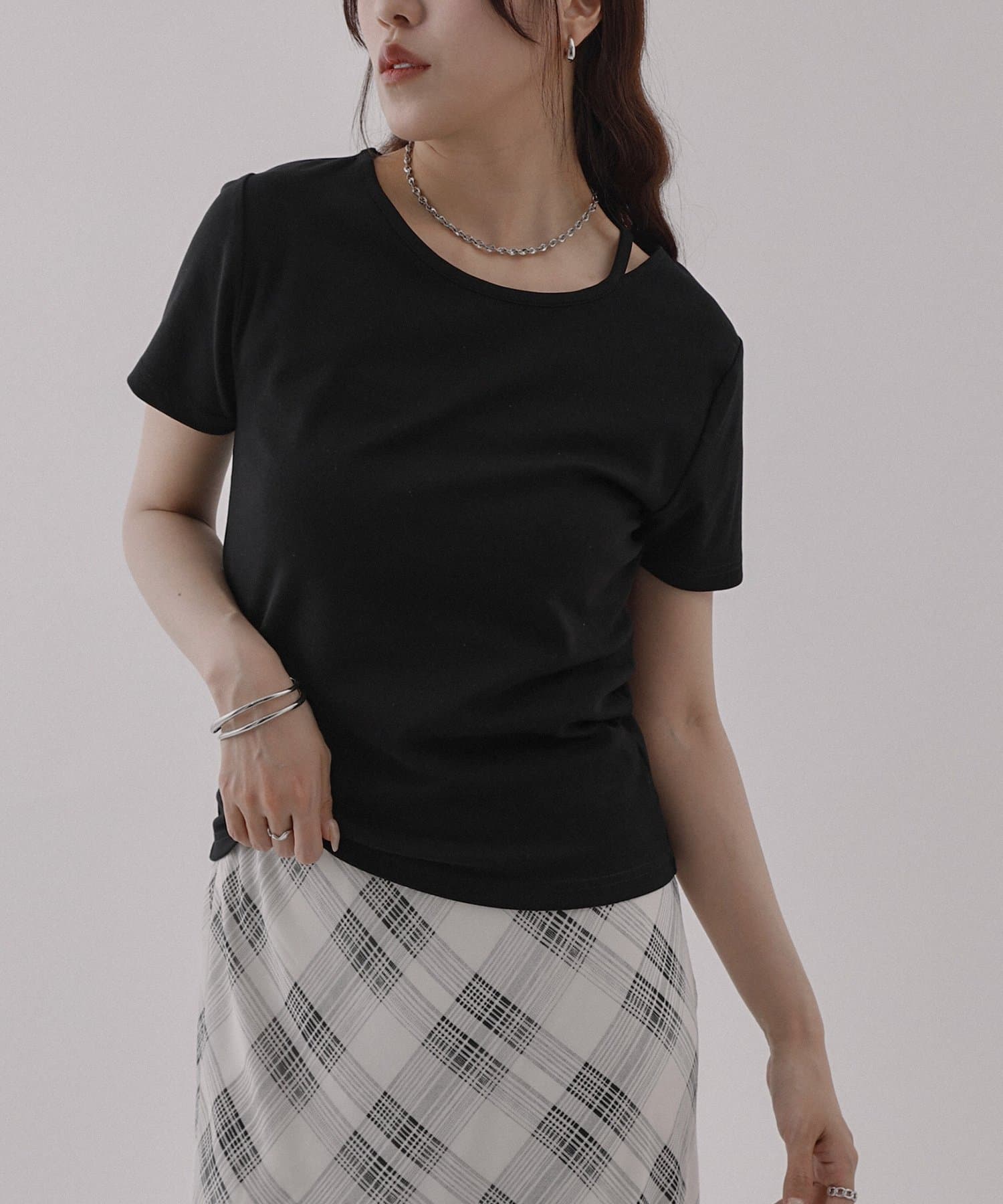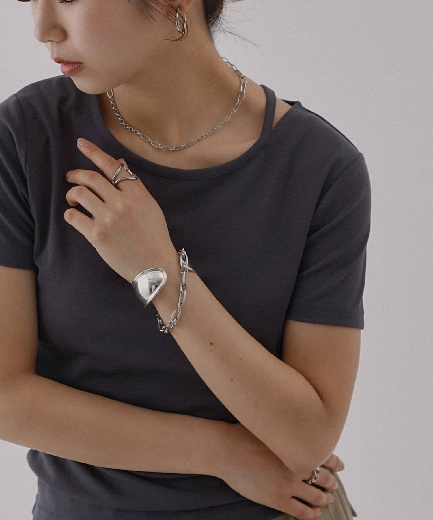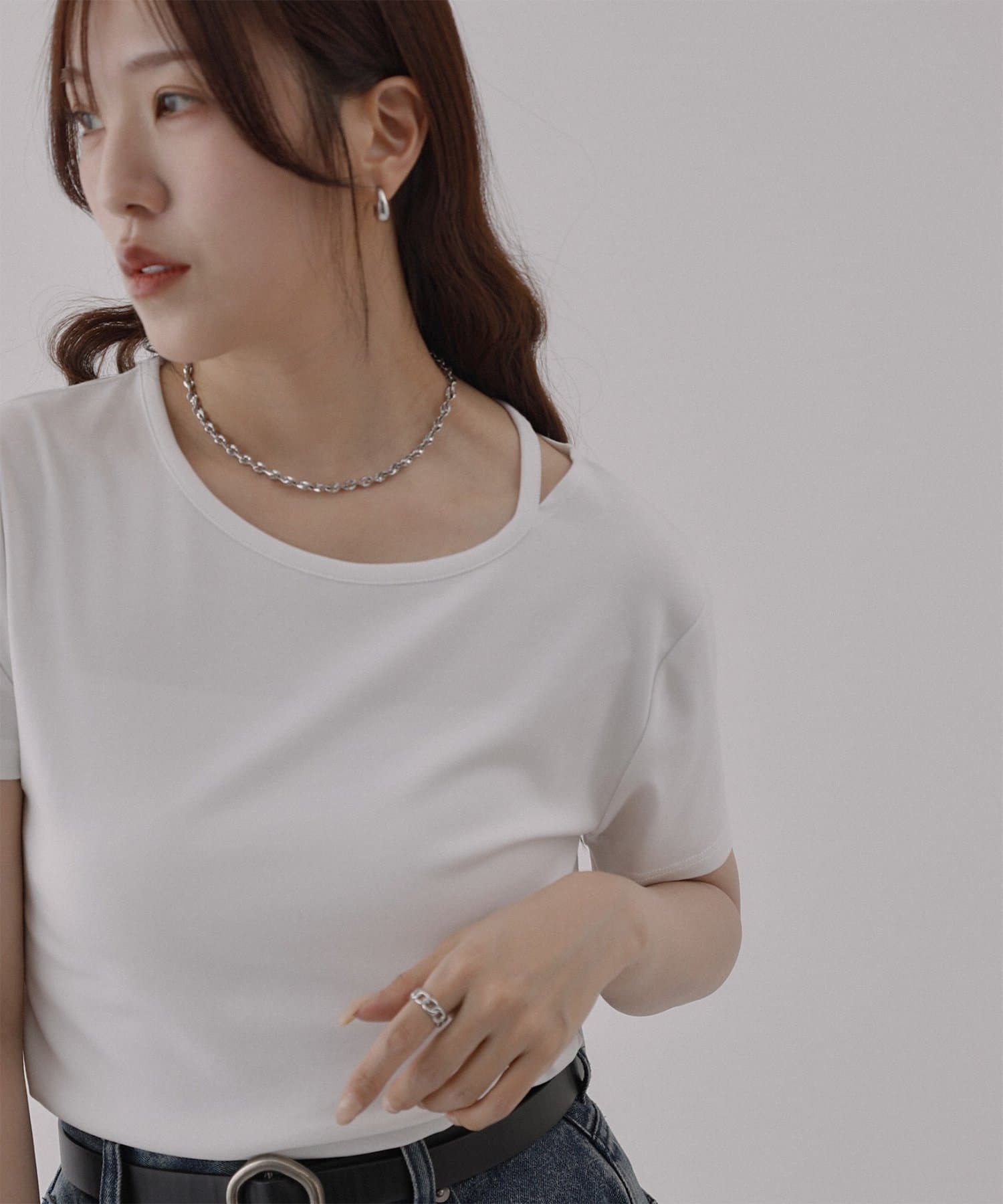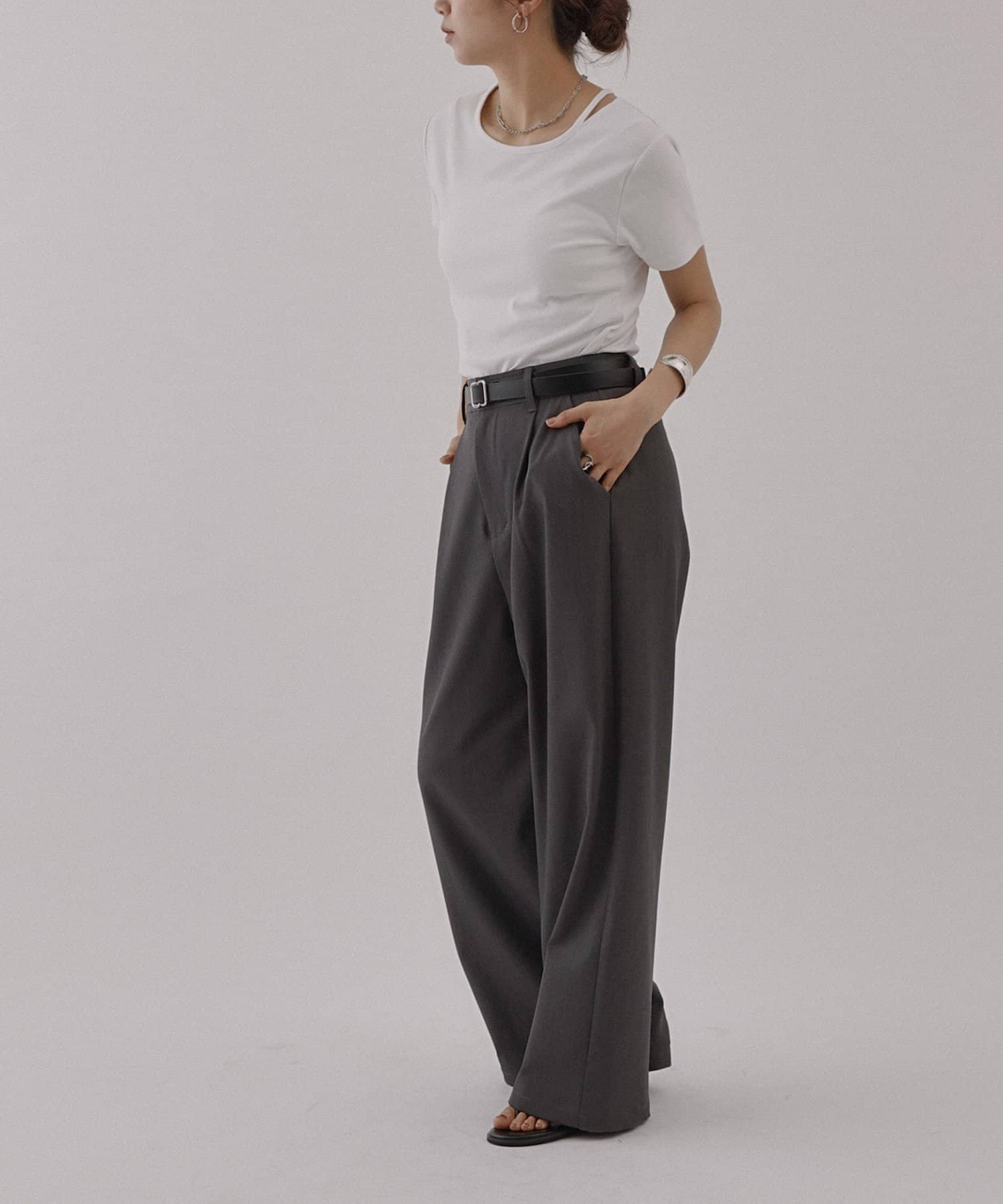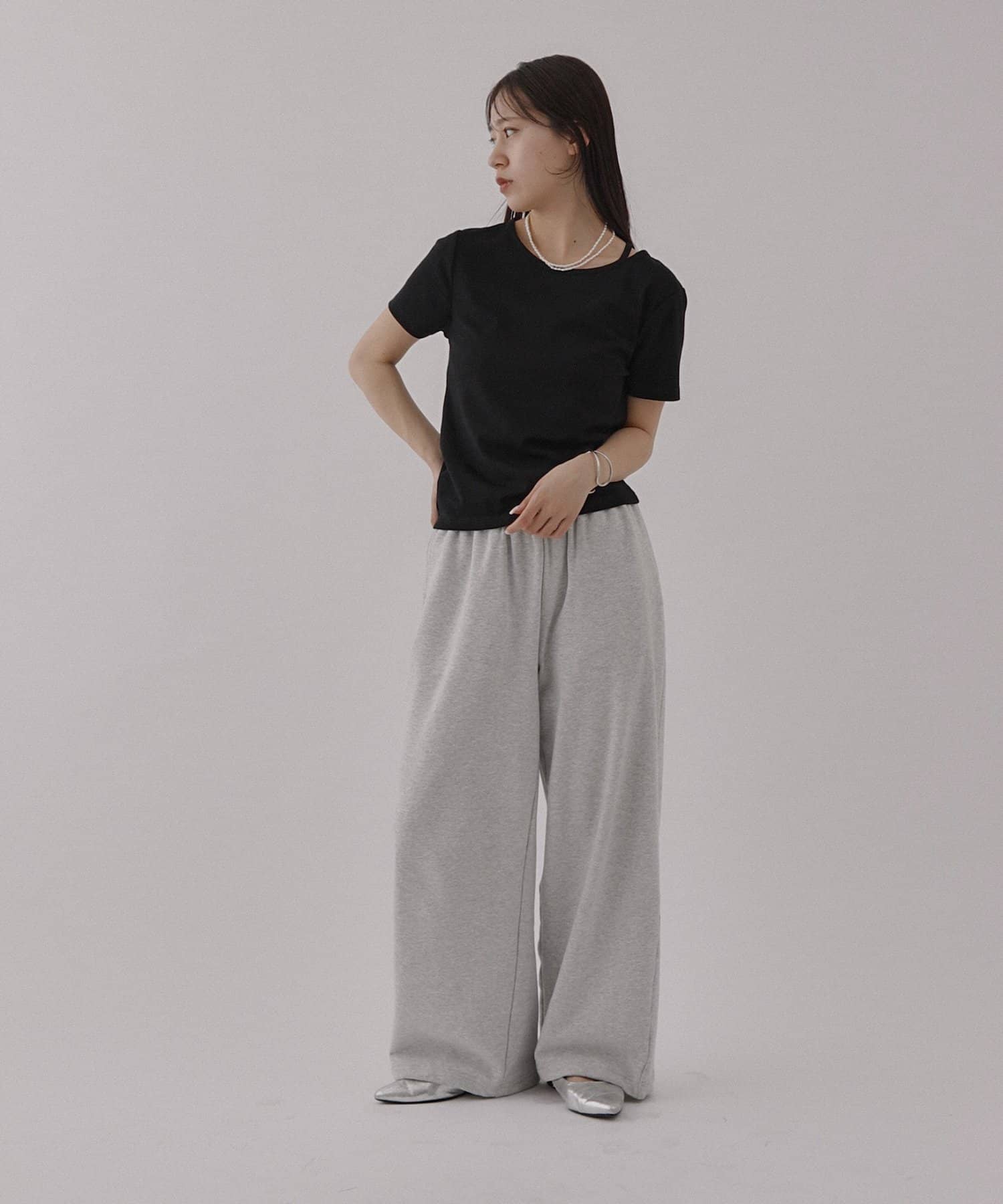 シンプルなシルエットですが首元にあるスリットデザインがアクセントになっていて、顔周りがすっきりとした印象になるアイテムです。