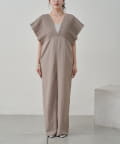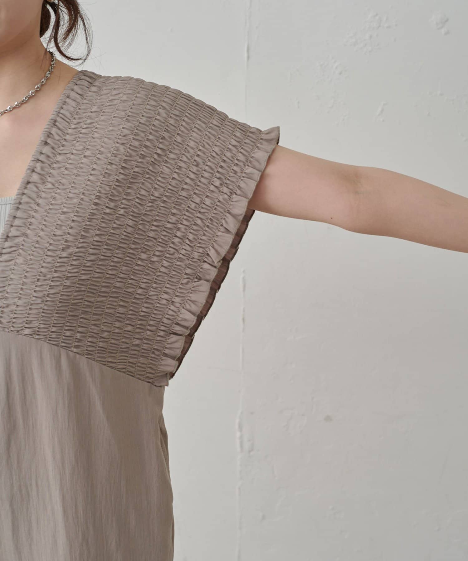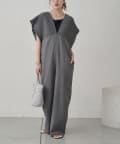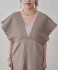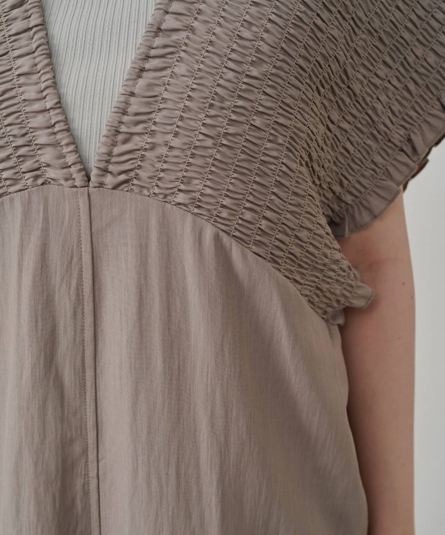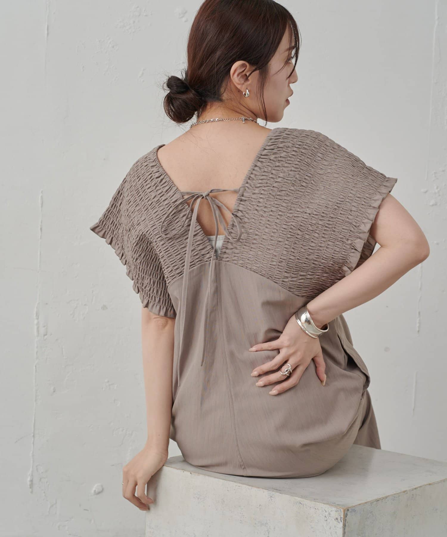 シャーリングとざっくりとした深めのVネックがデコルテを美しく見せ女性らしい印象に。