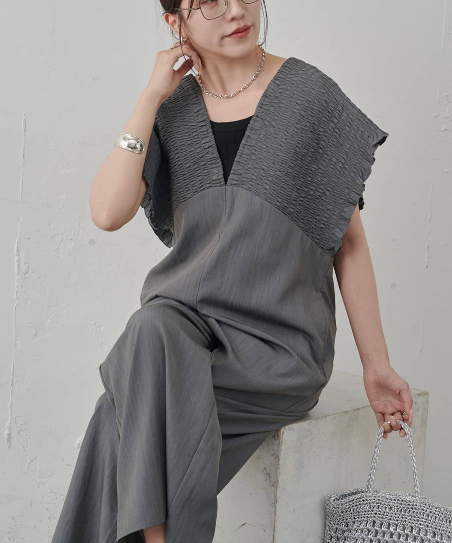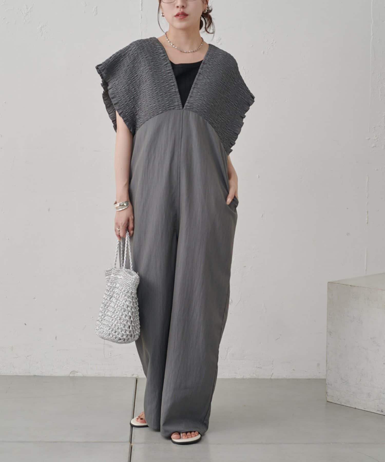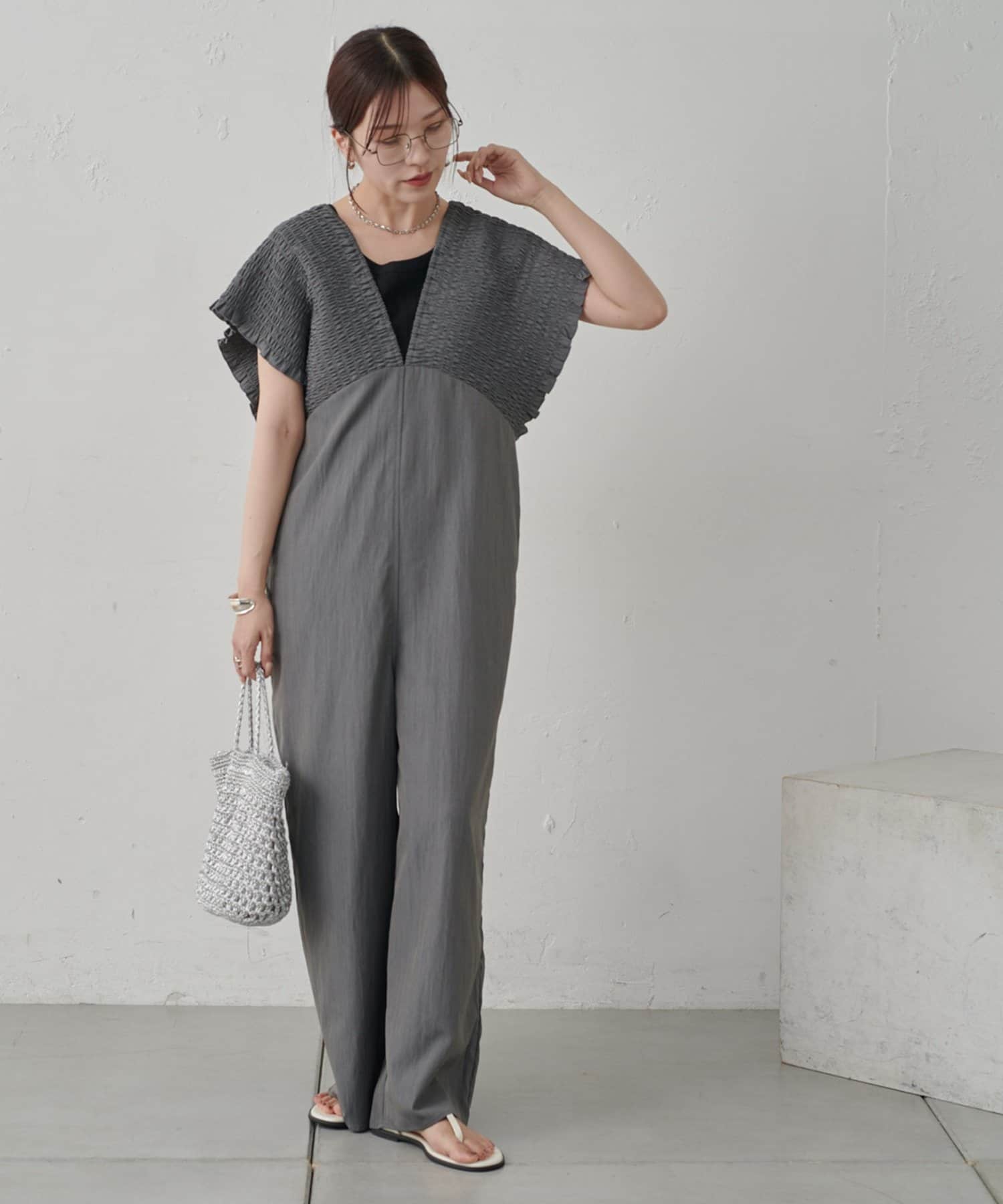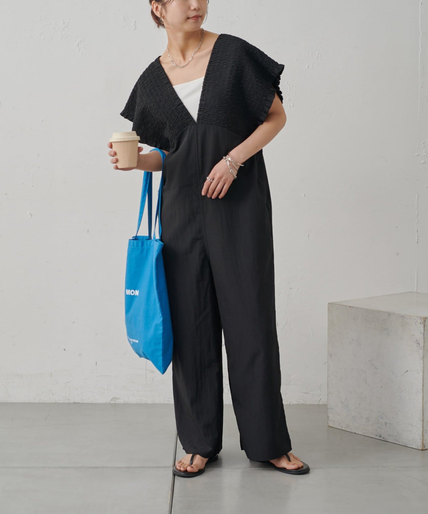 さっと着るだけでこなれ見えなオシャレコーデが完成する切り替えデザインが魅力のオールインワンです。