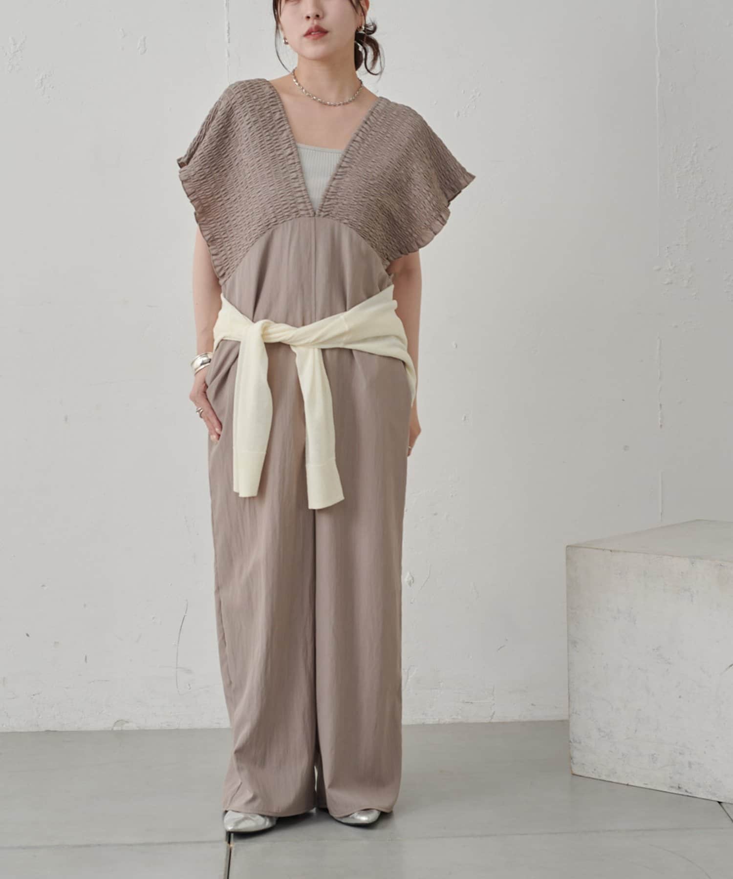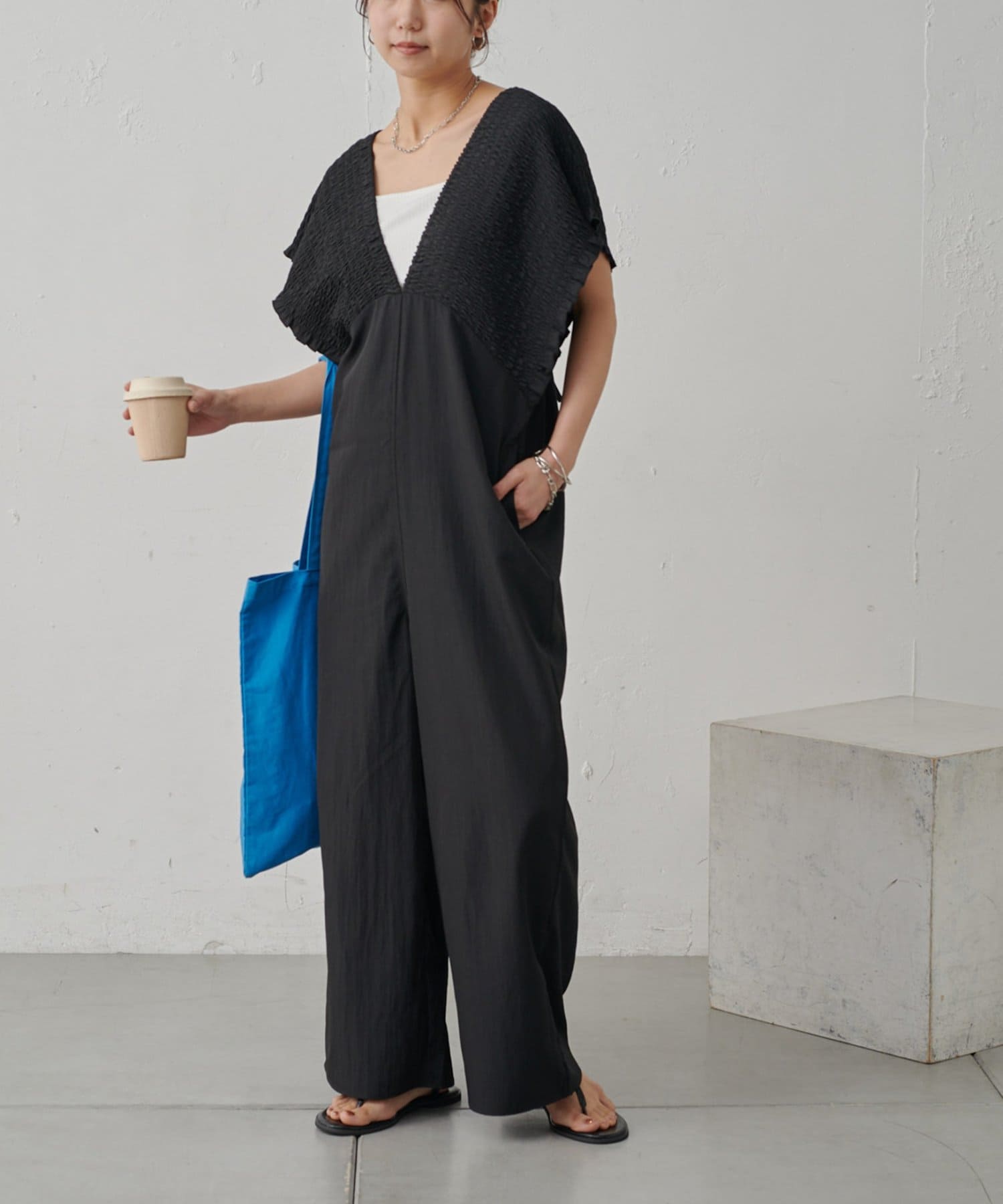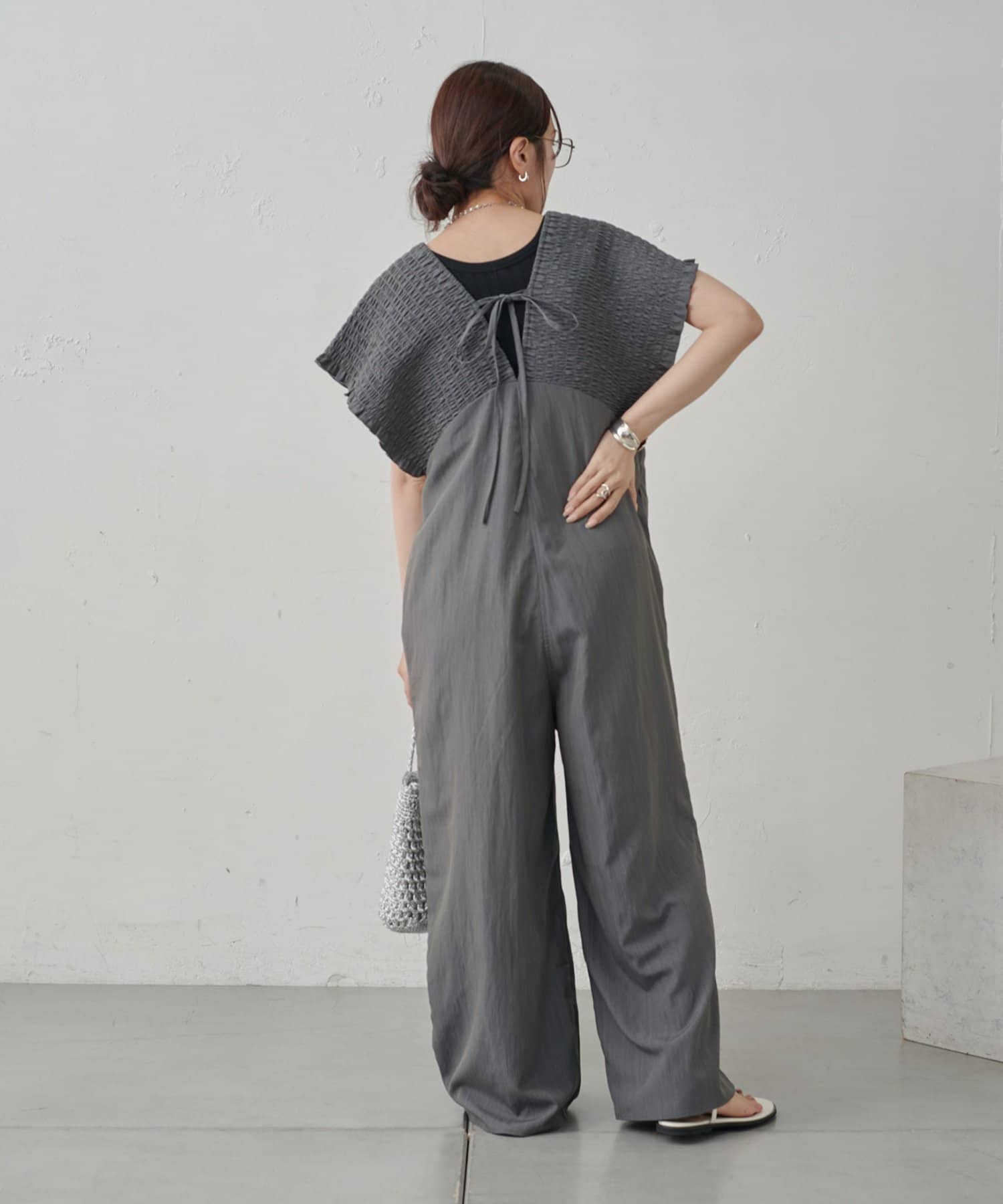 さっと着るだけでこなれ見えなオシャレコーデが完成する切り替えデザインが魅力のオールインワンです。