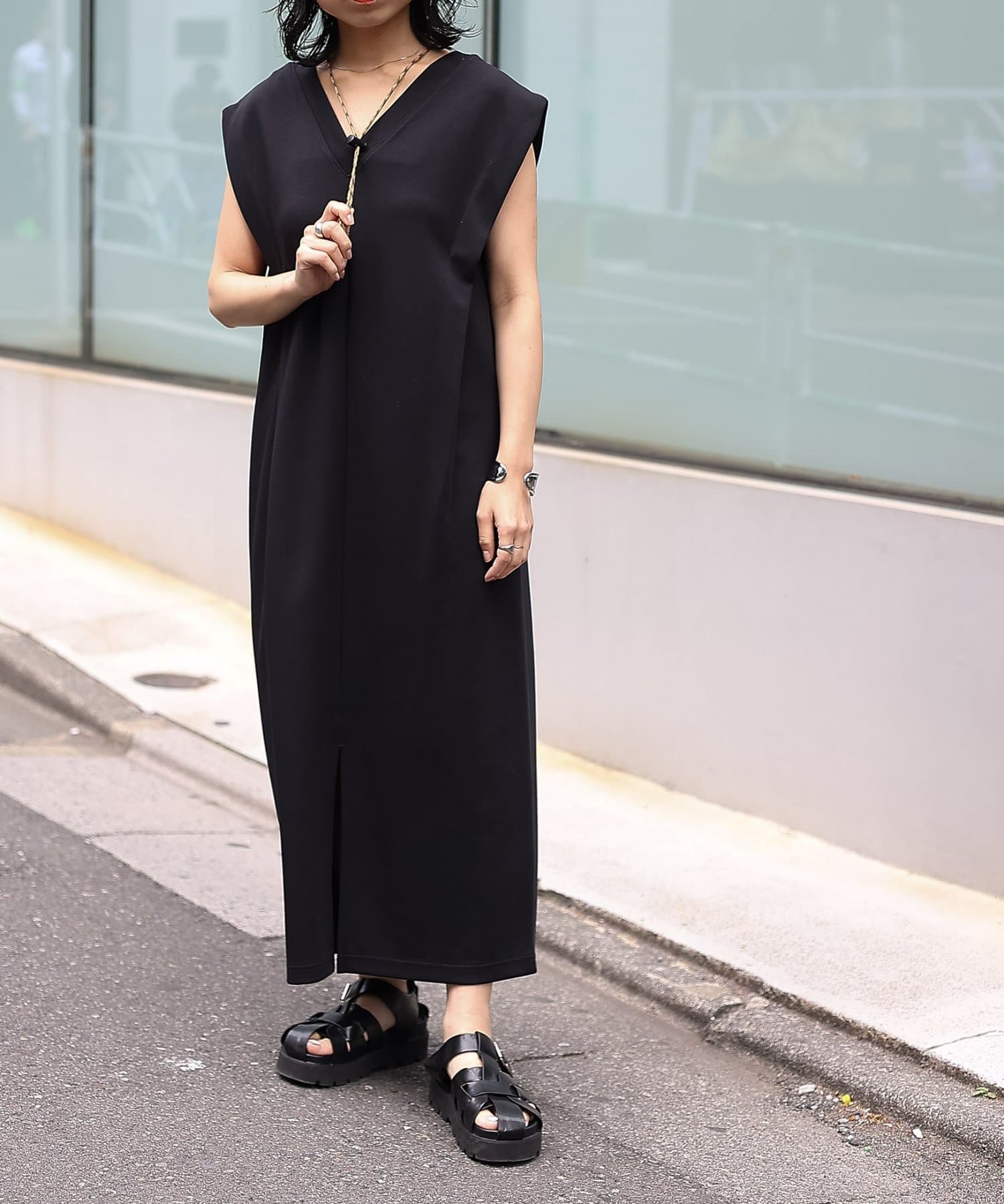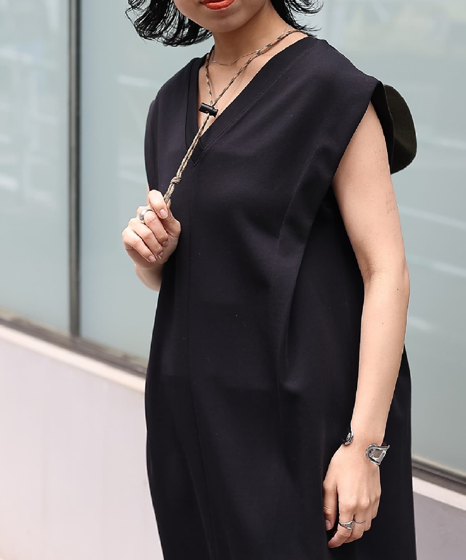 また、首元はVネックとクルーネックの前後2WAYデザインになっているので、雰囲気を変えて合わせることもできます。