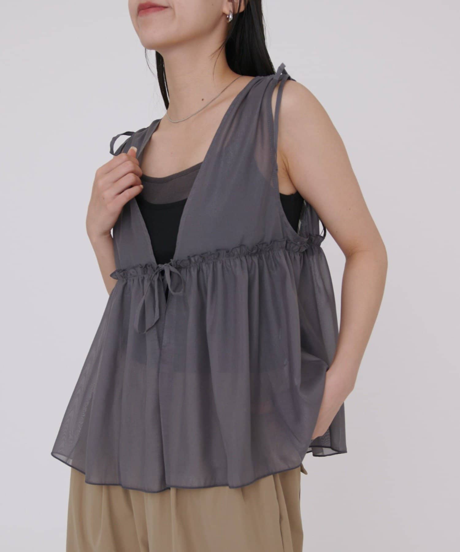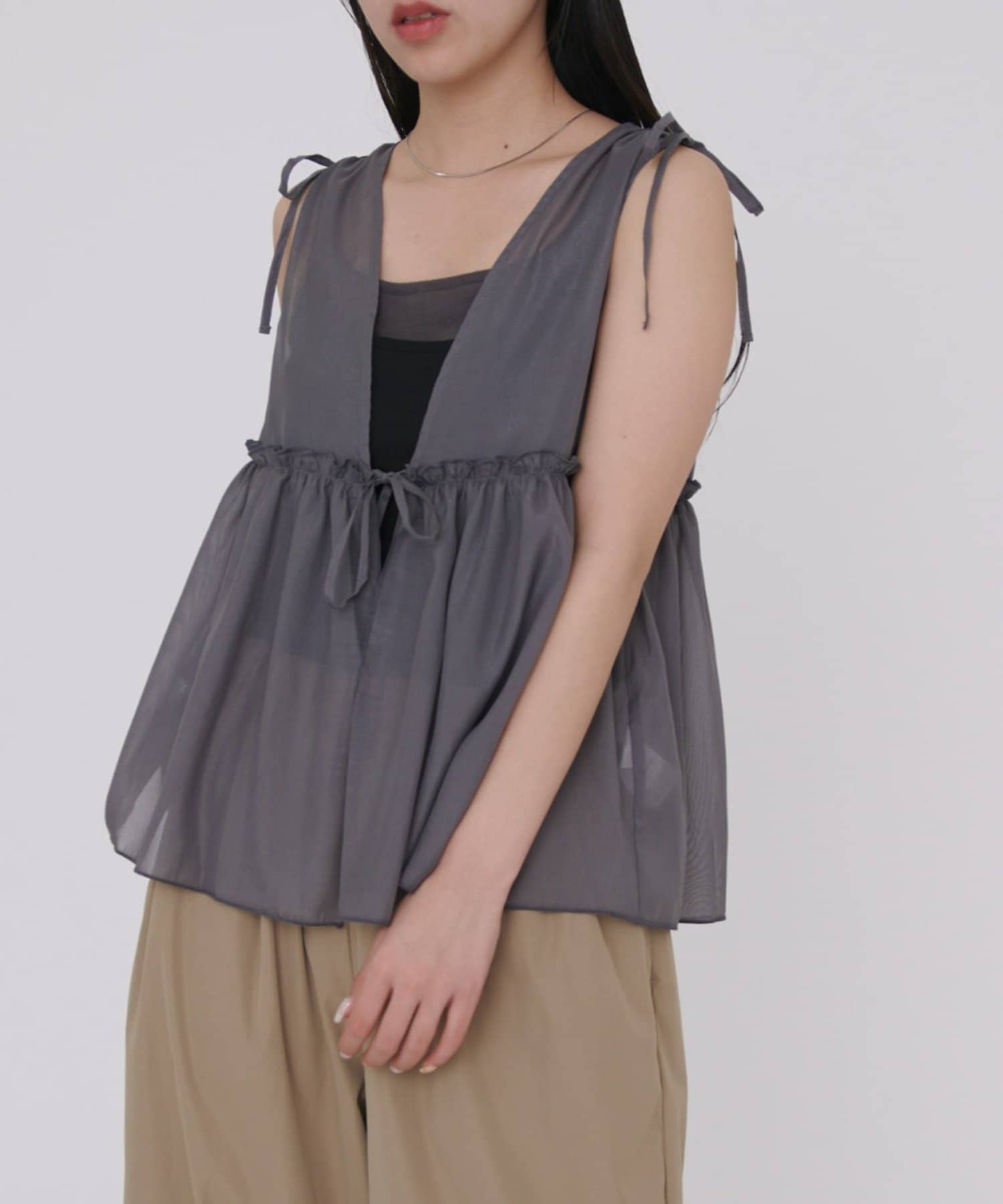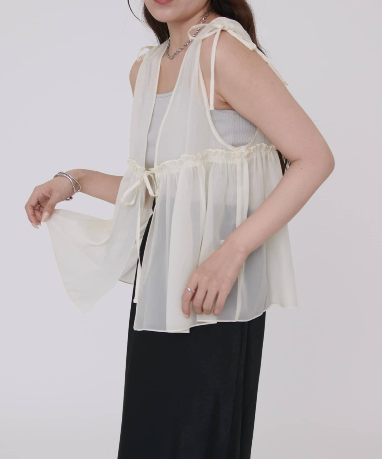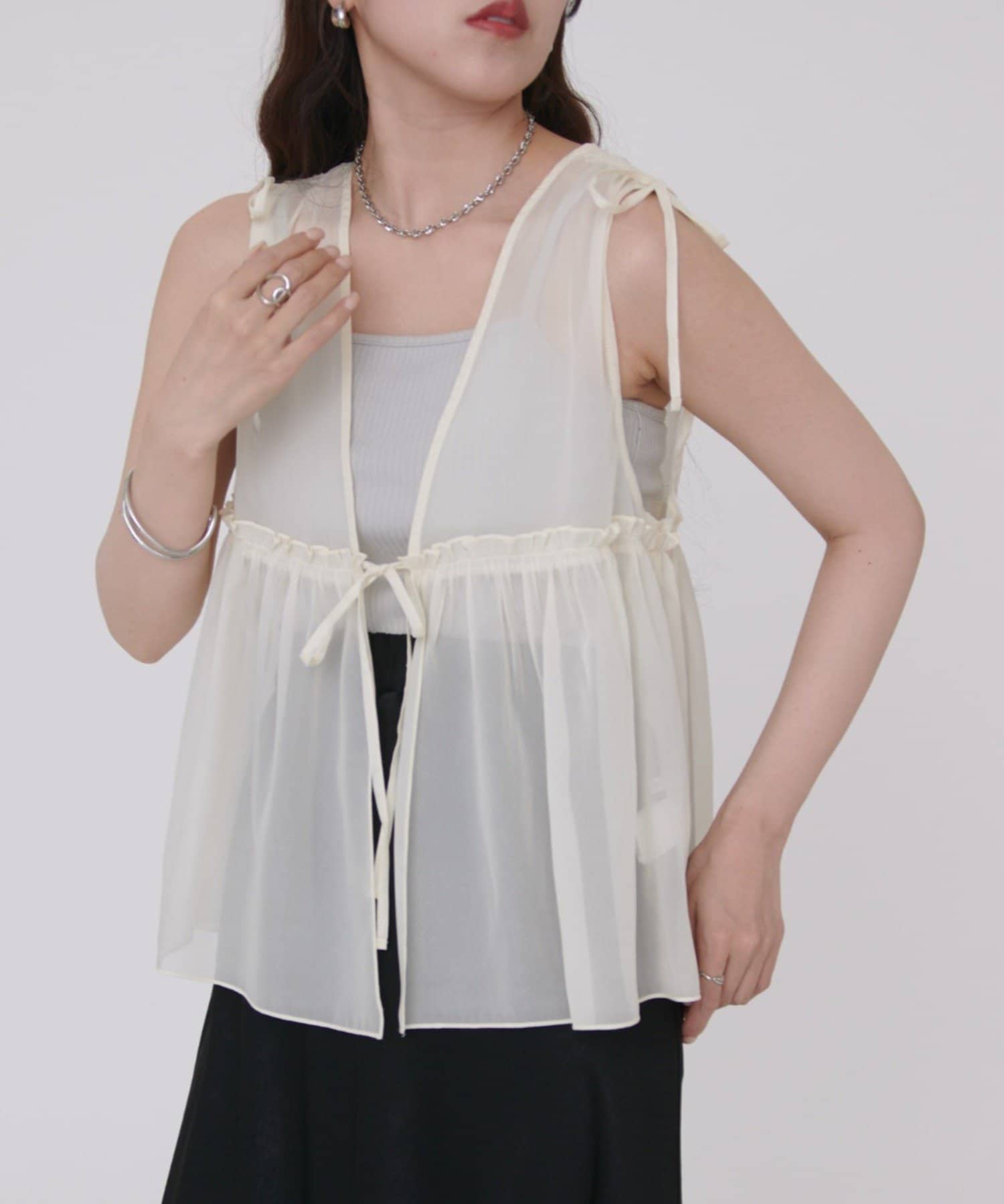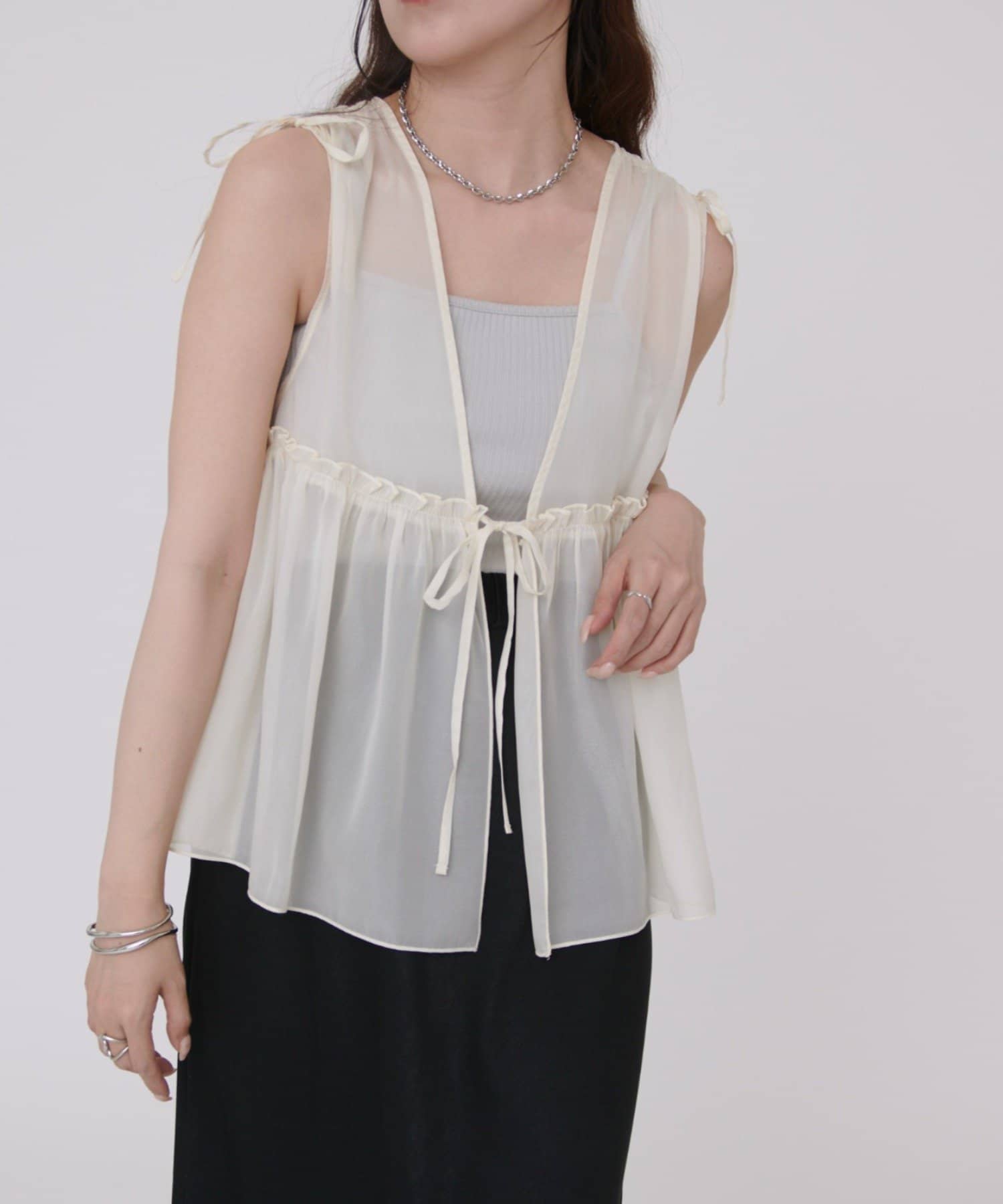 透け感がトレンドライクなシアーギャザーリボンベストです。