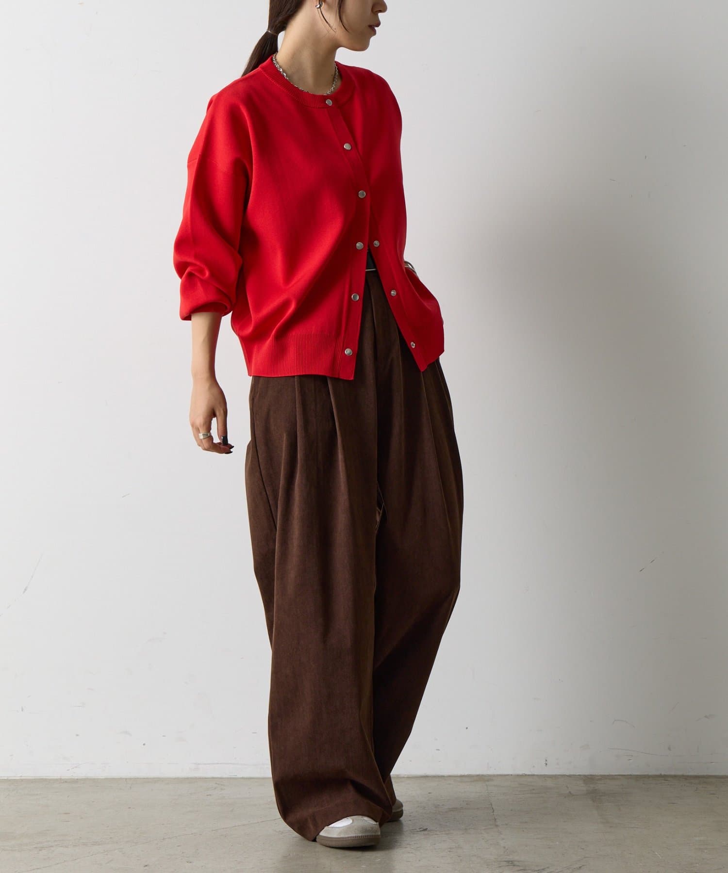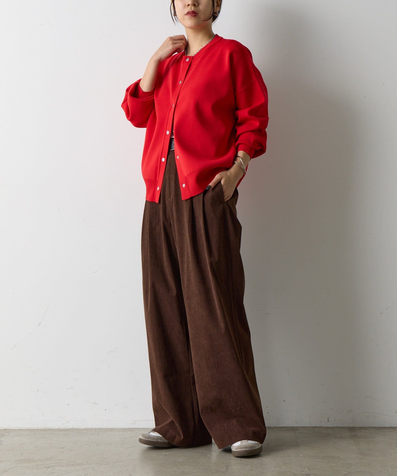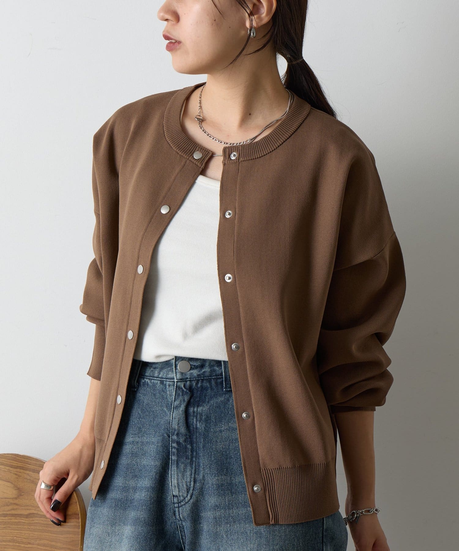 シンプルなデザインで、着回し力抜群のカーディガン。