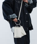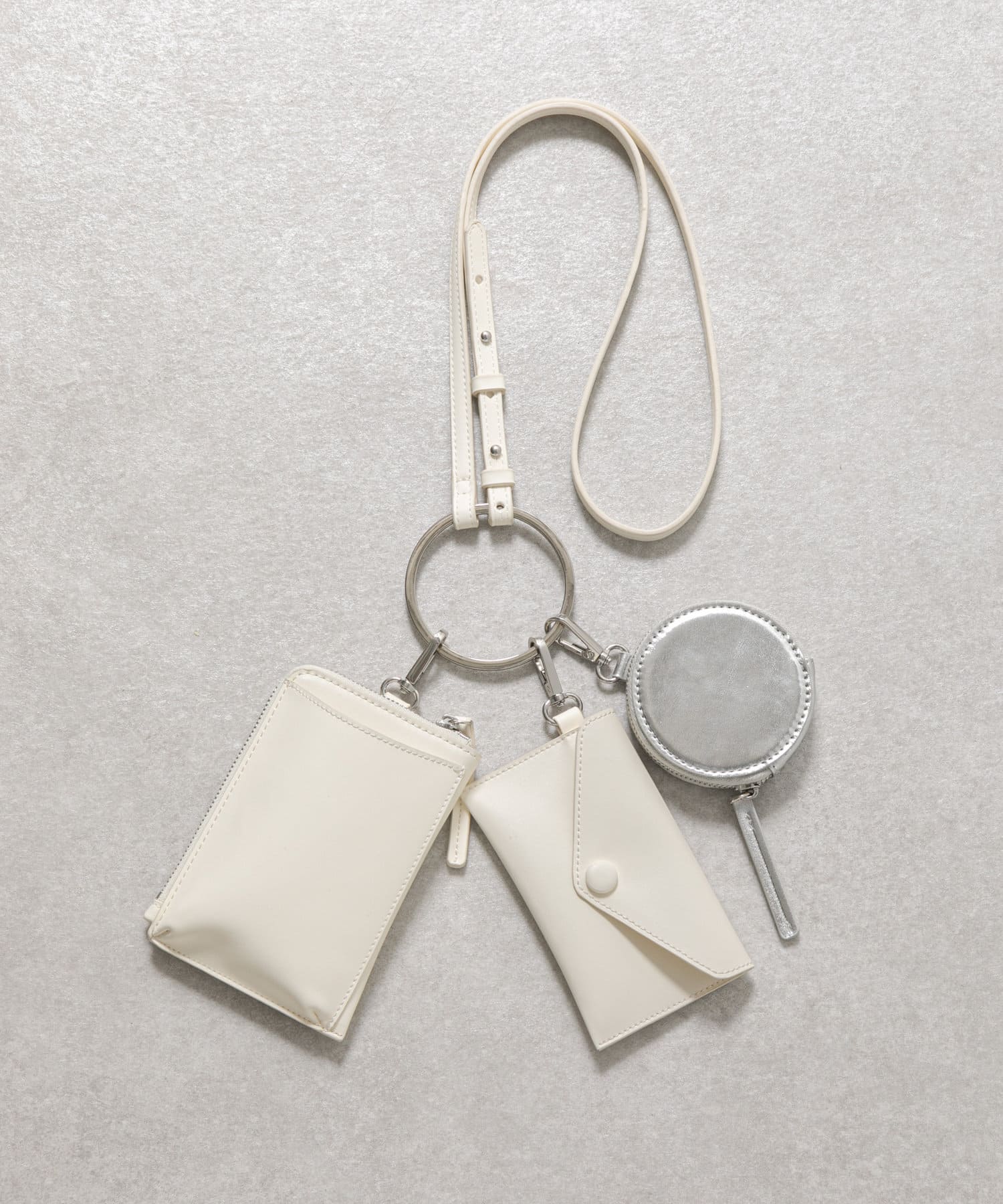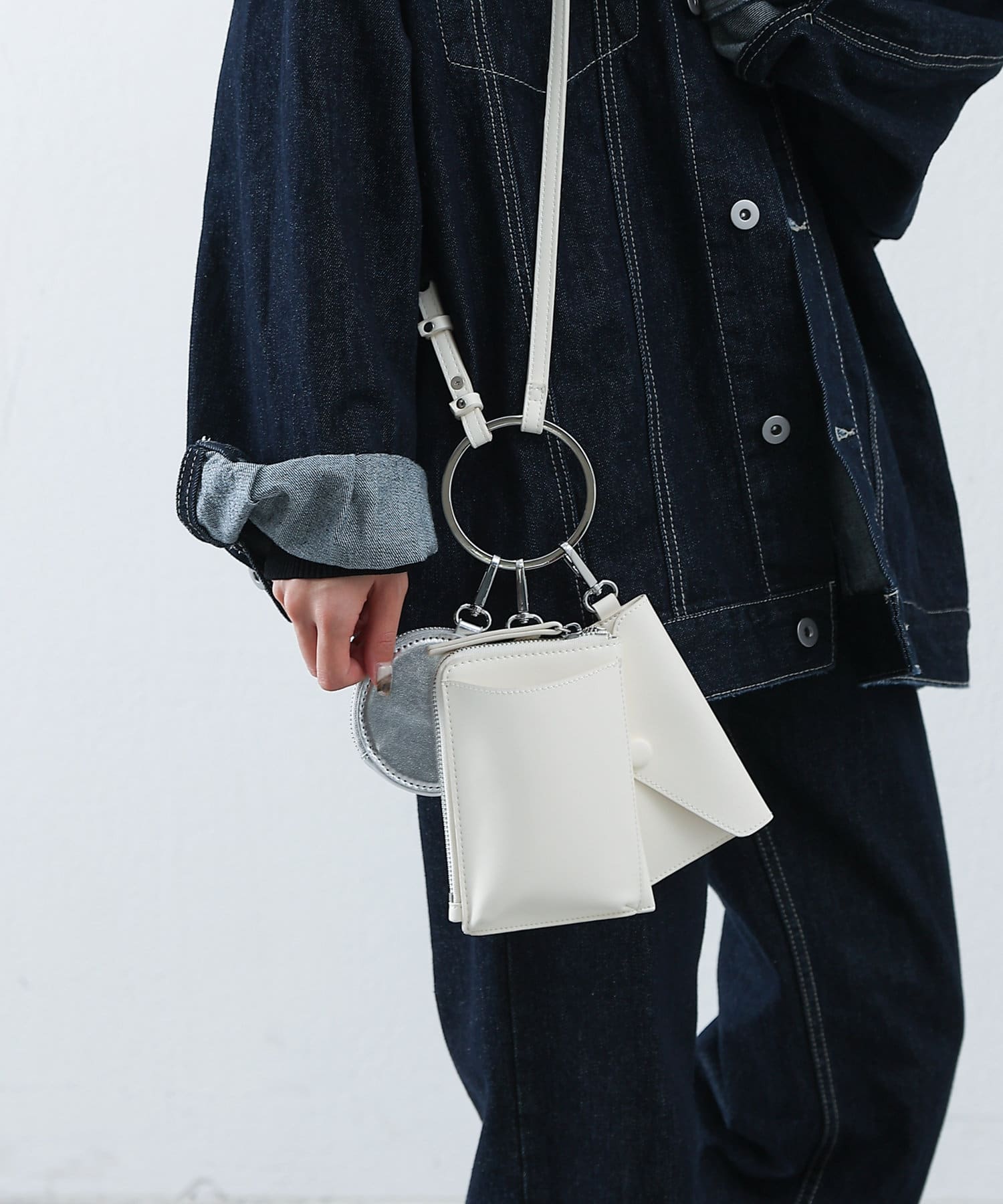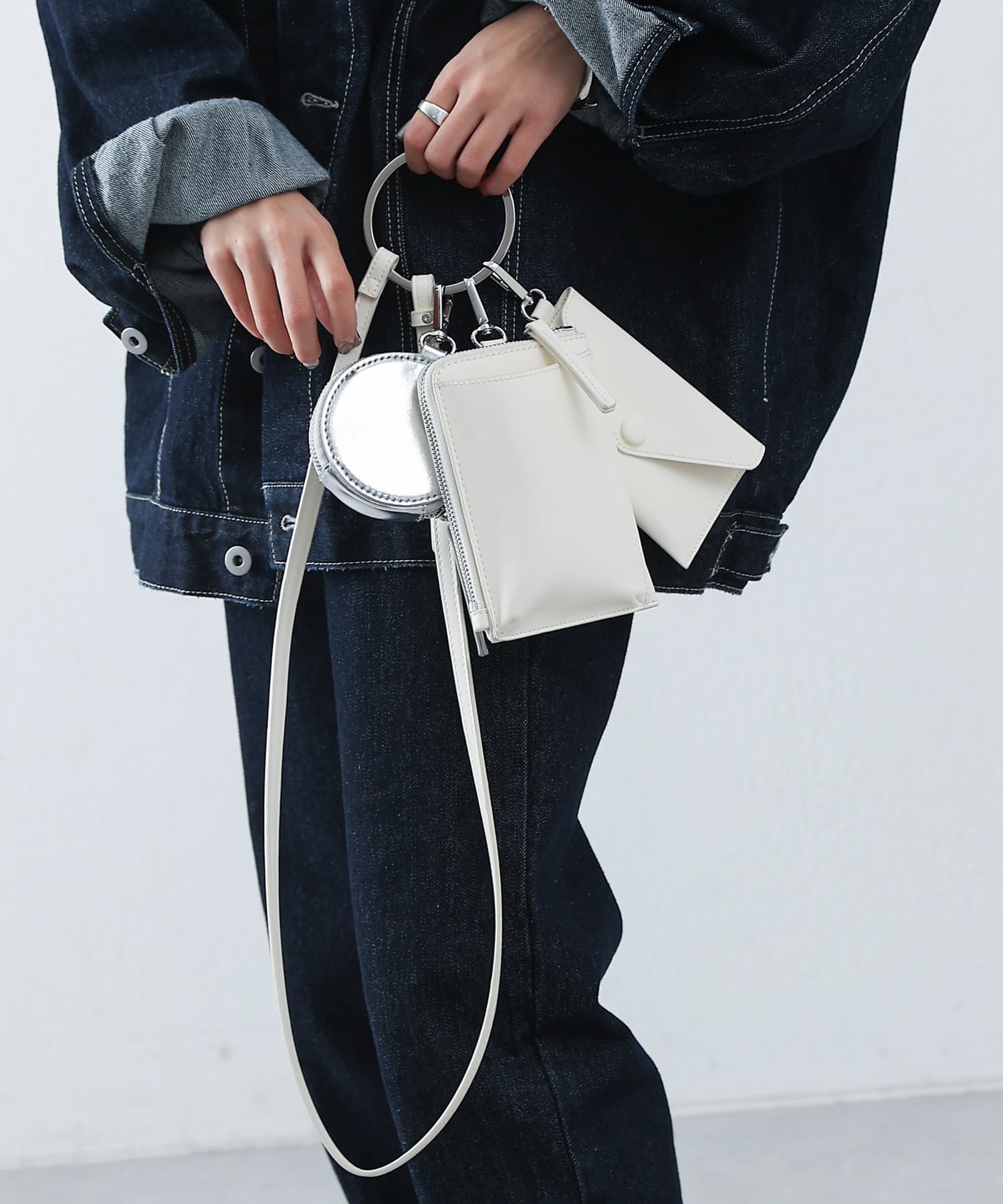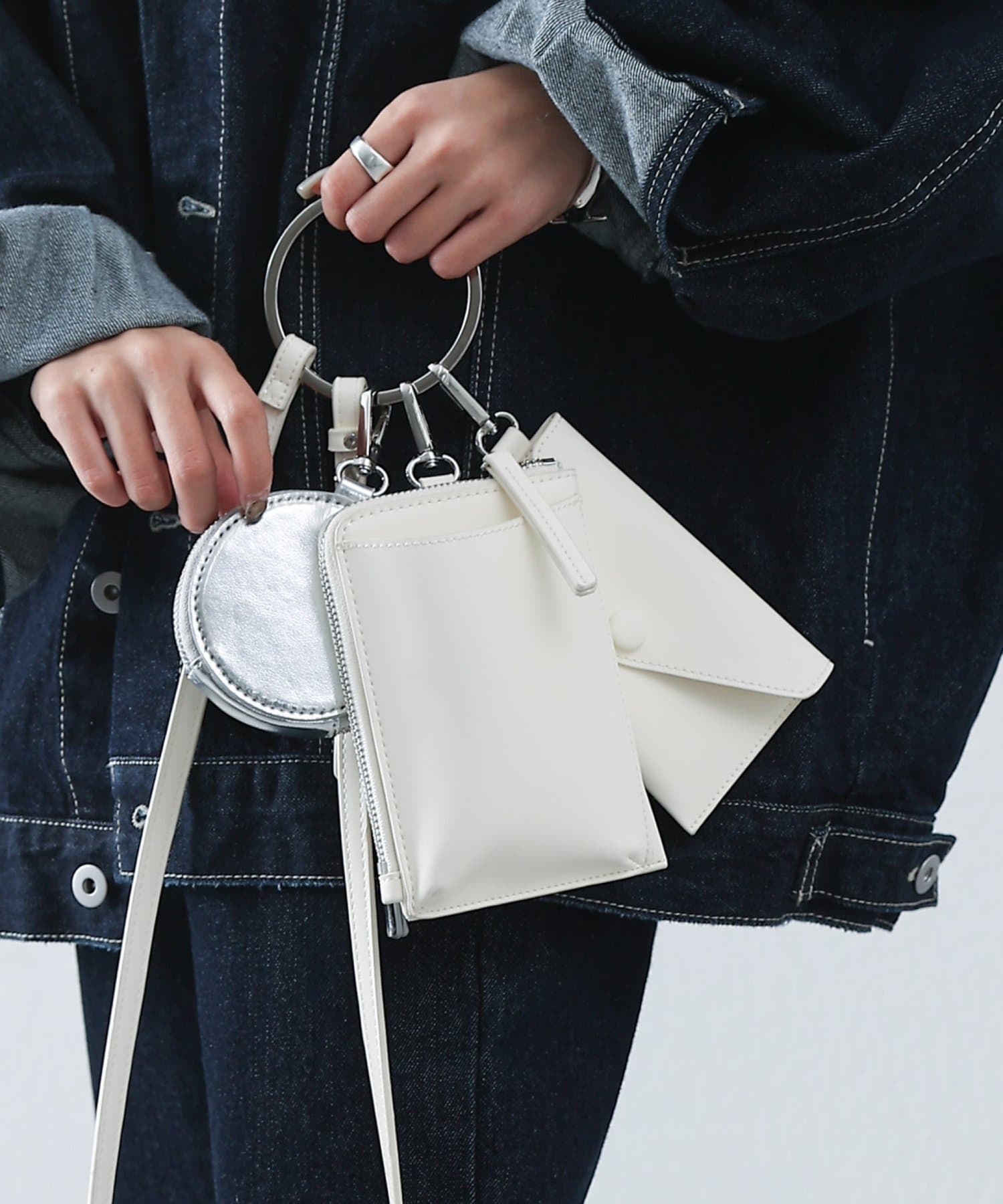 スマホカードケース、レター型ポーチ、丸型ミニポーチがリングに装着でき、ショルダーバッグとして使える3連バッグ。