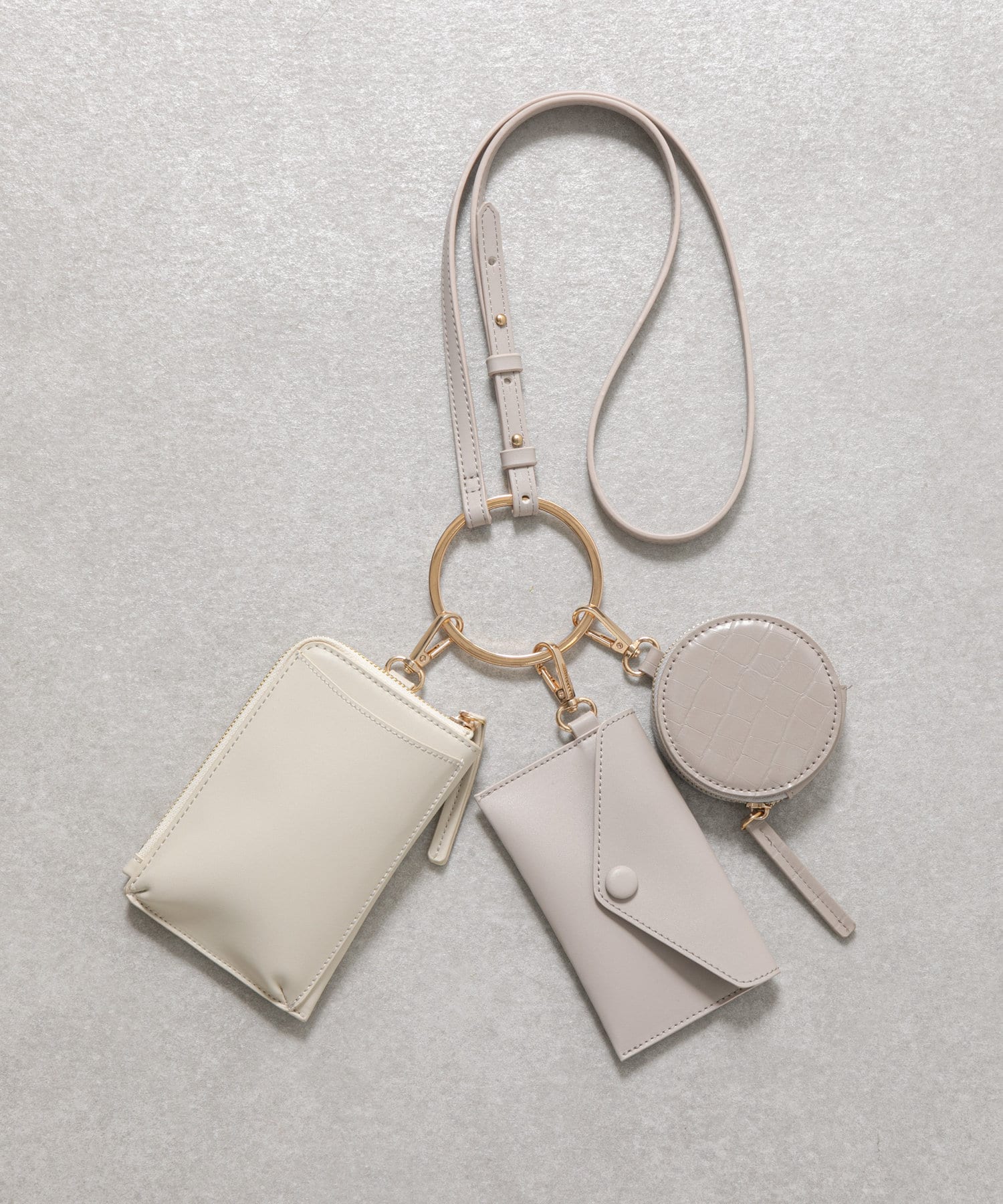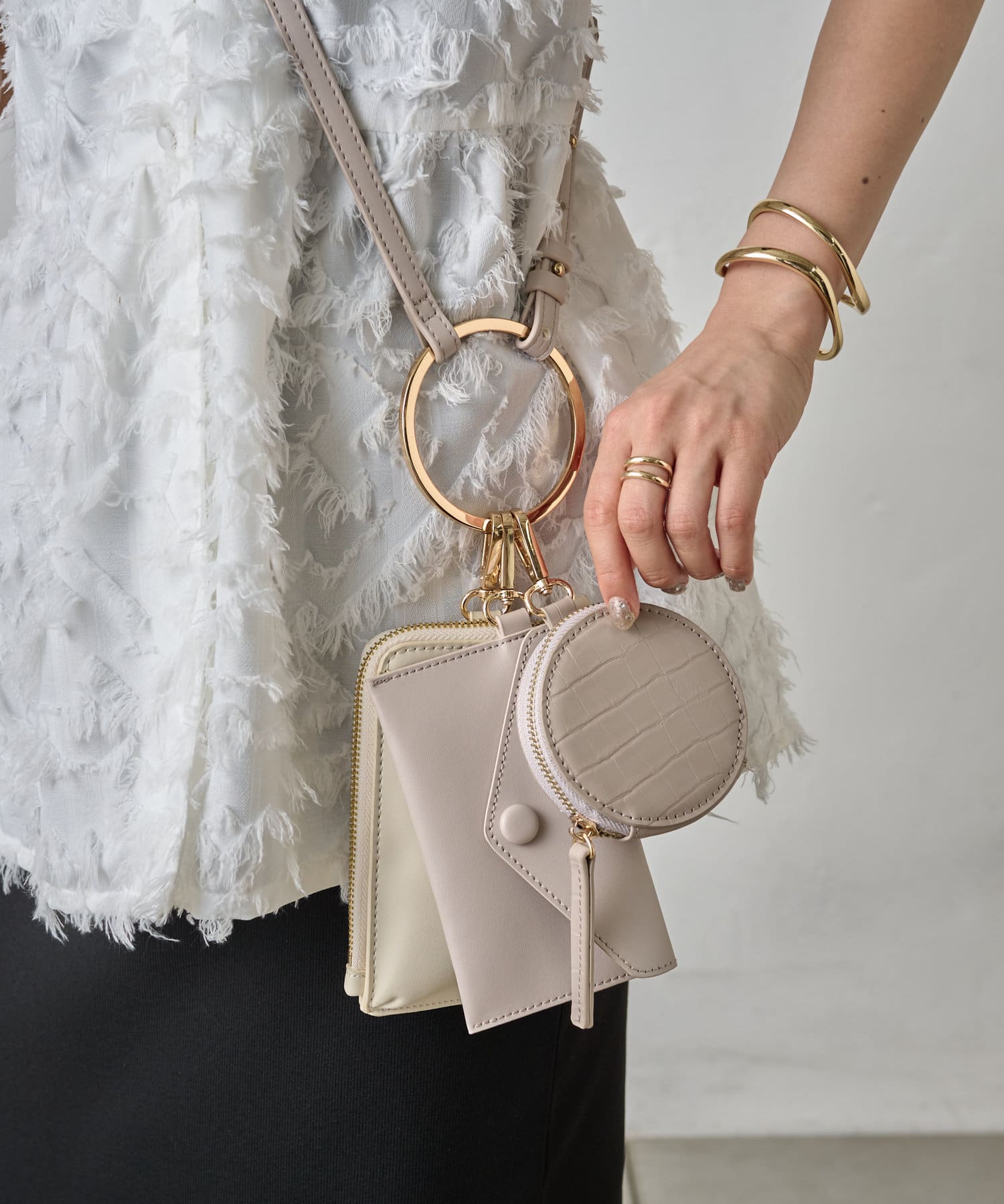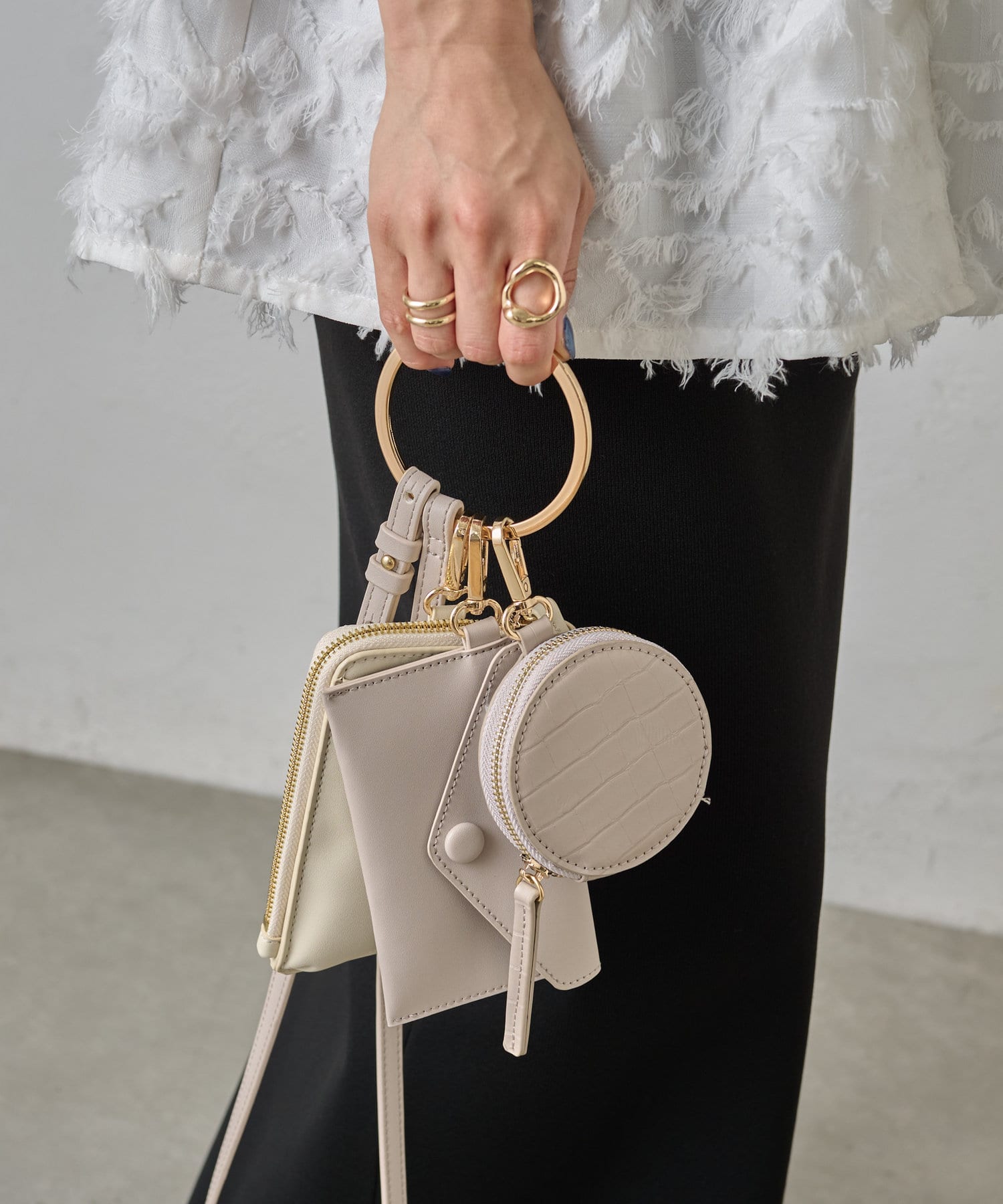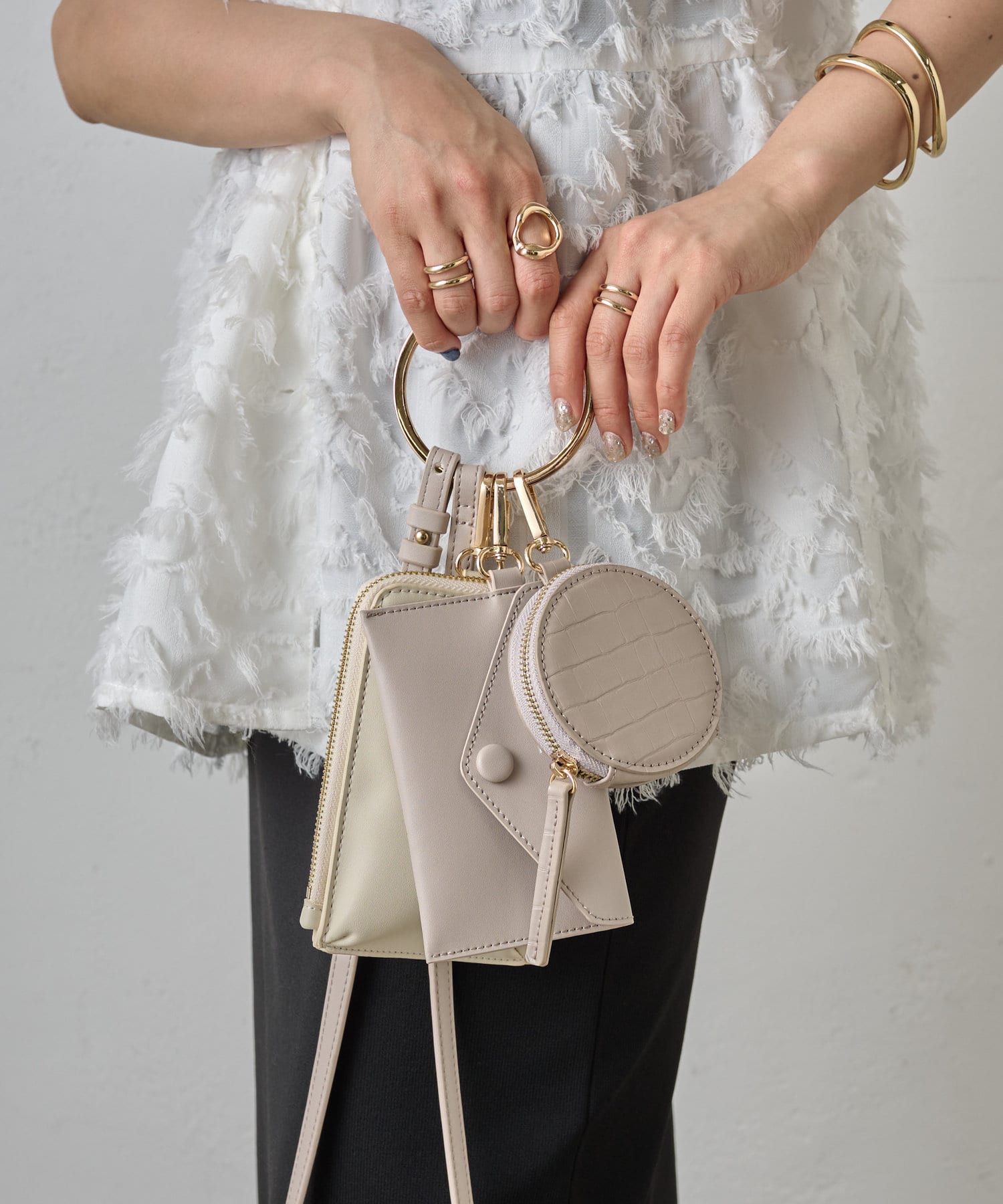 スマホカードケース、レター型ポーチ、丸型ミニポーチがリングに装着でき、ショルダーバッグとして使える3連バッグ。
