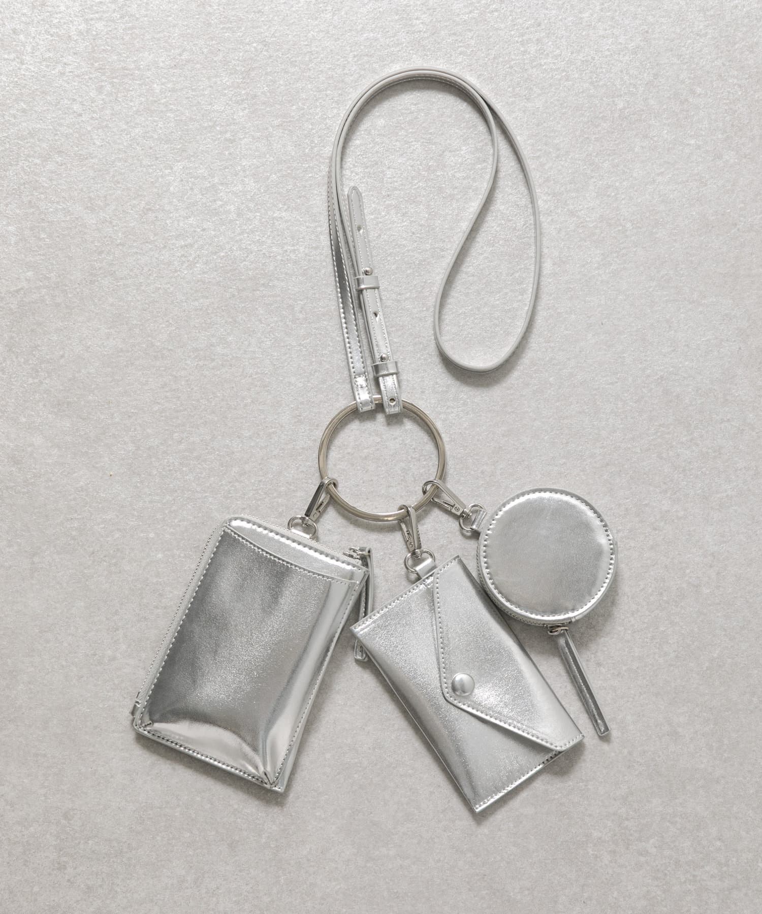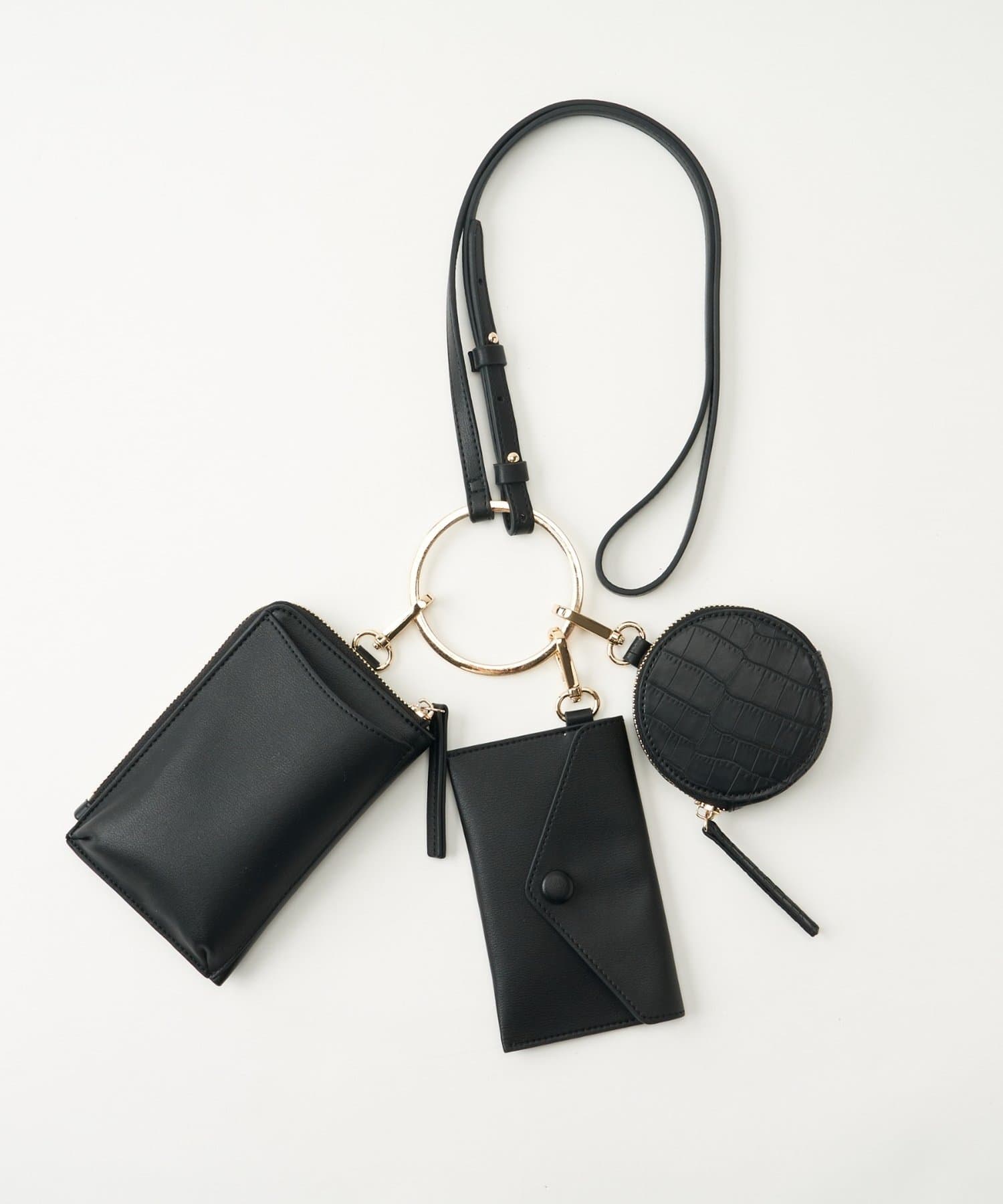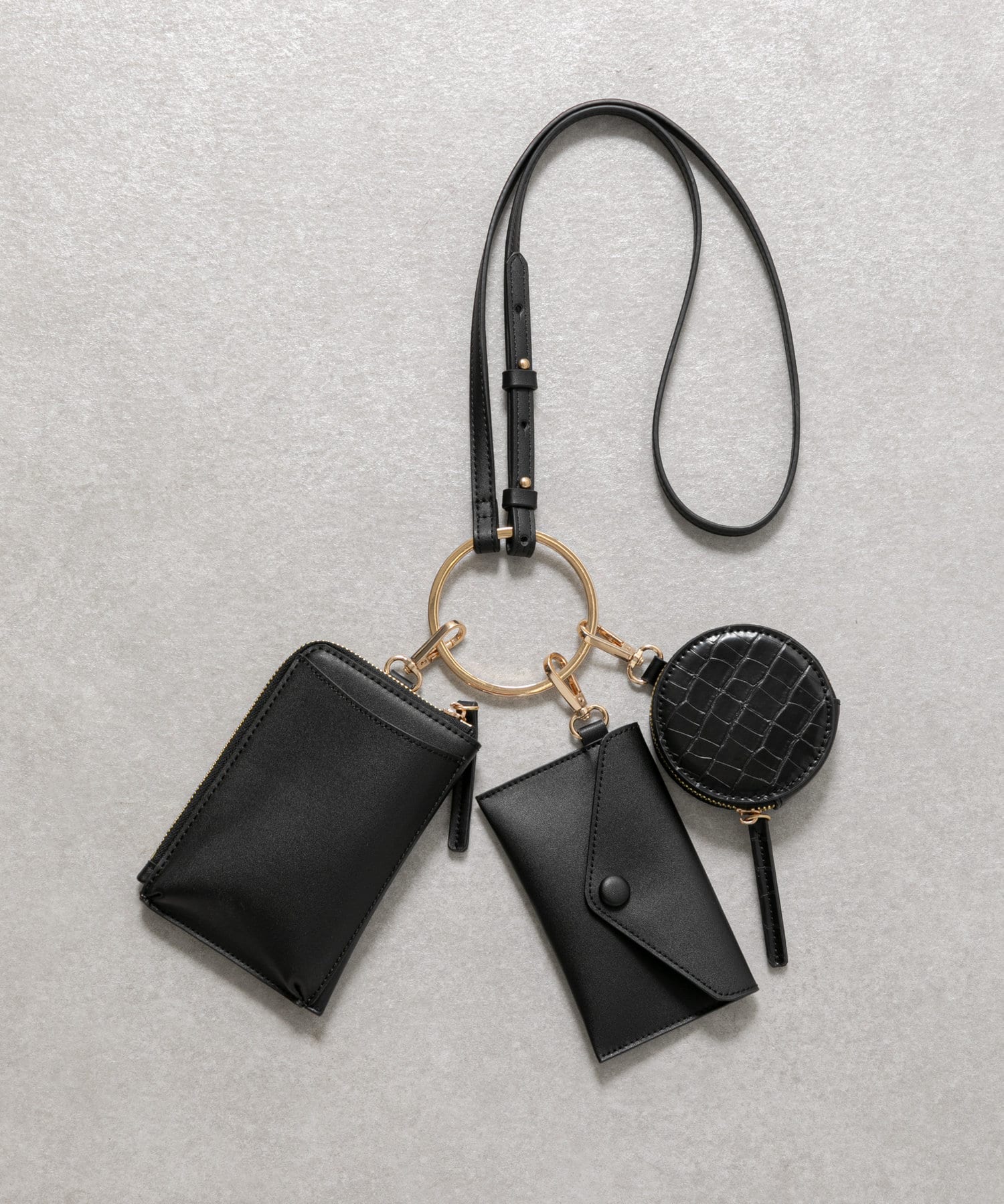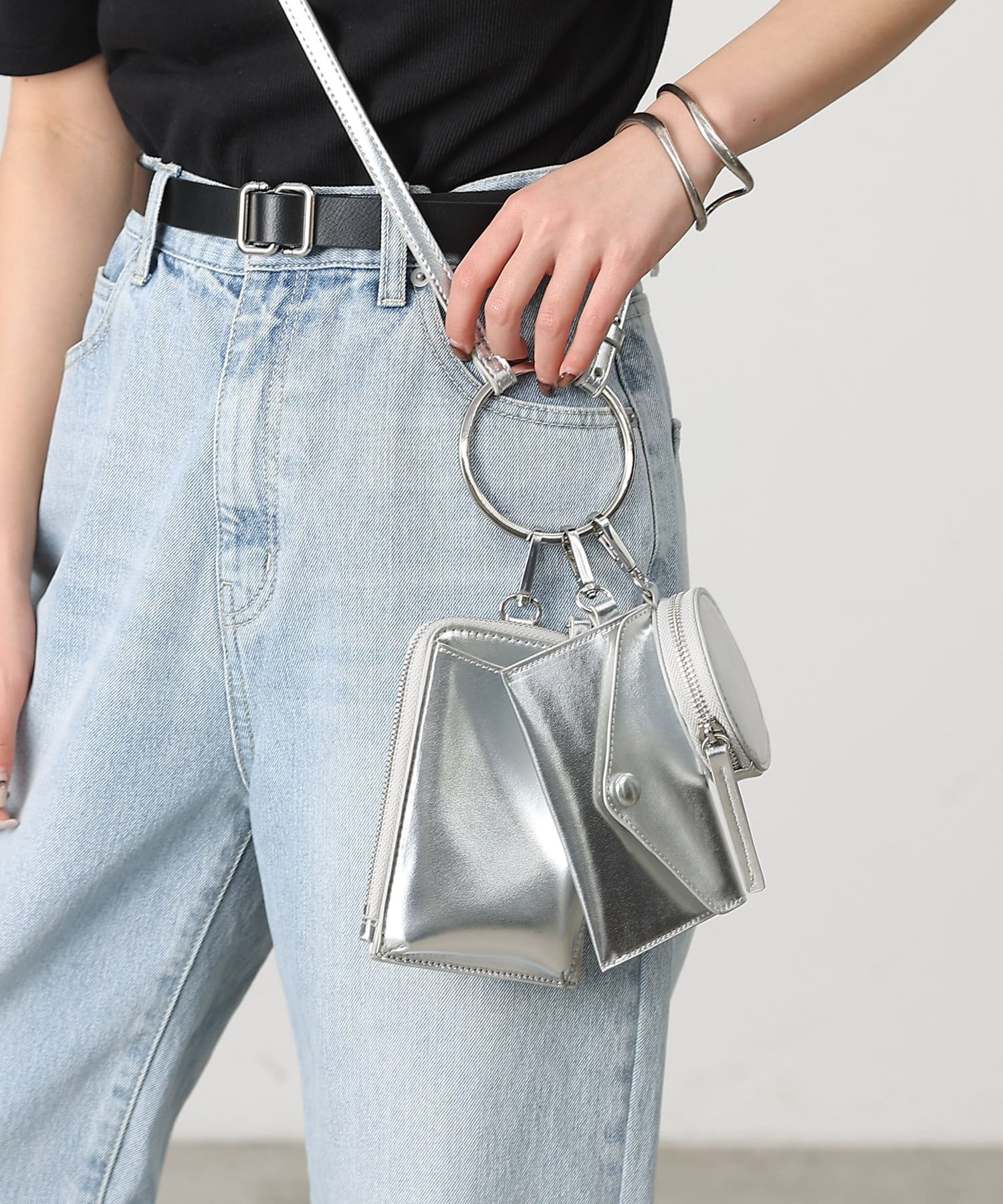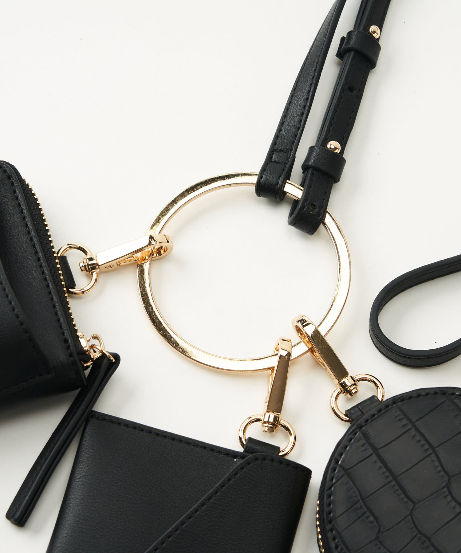 スマホカードケース、レター型ポーチ、丸型ミニポーチがリングに装着でき、ショルダーバッグとして使える3連バッグ。