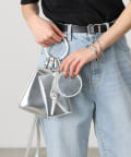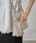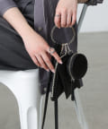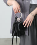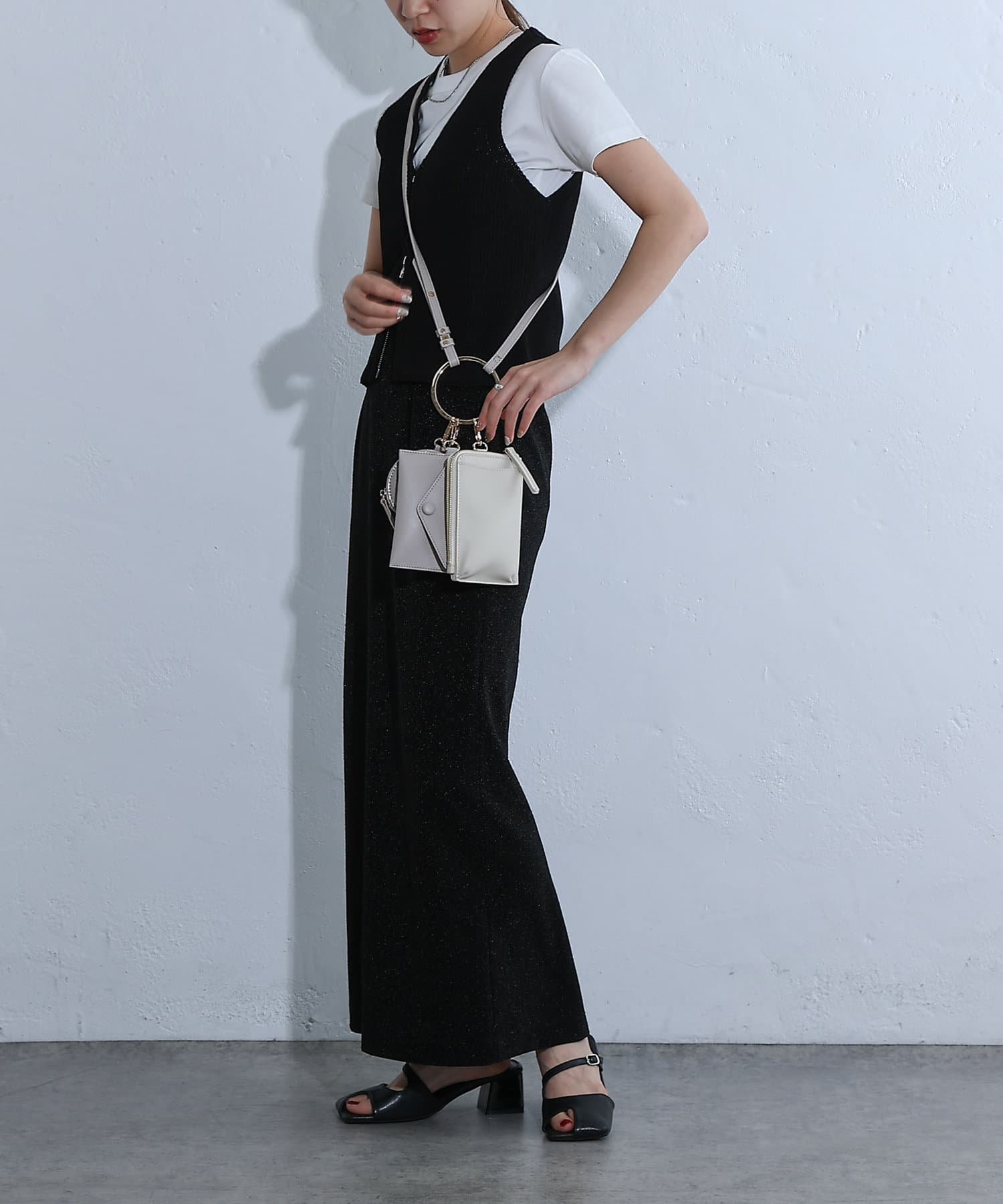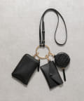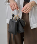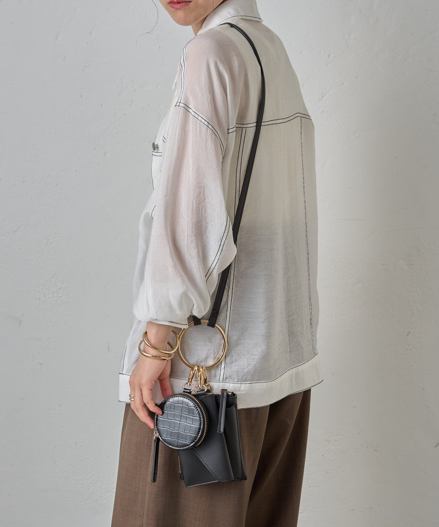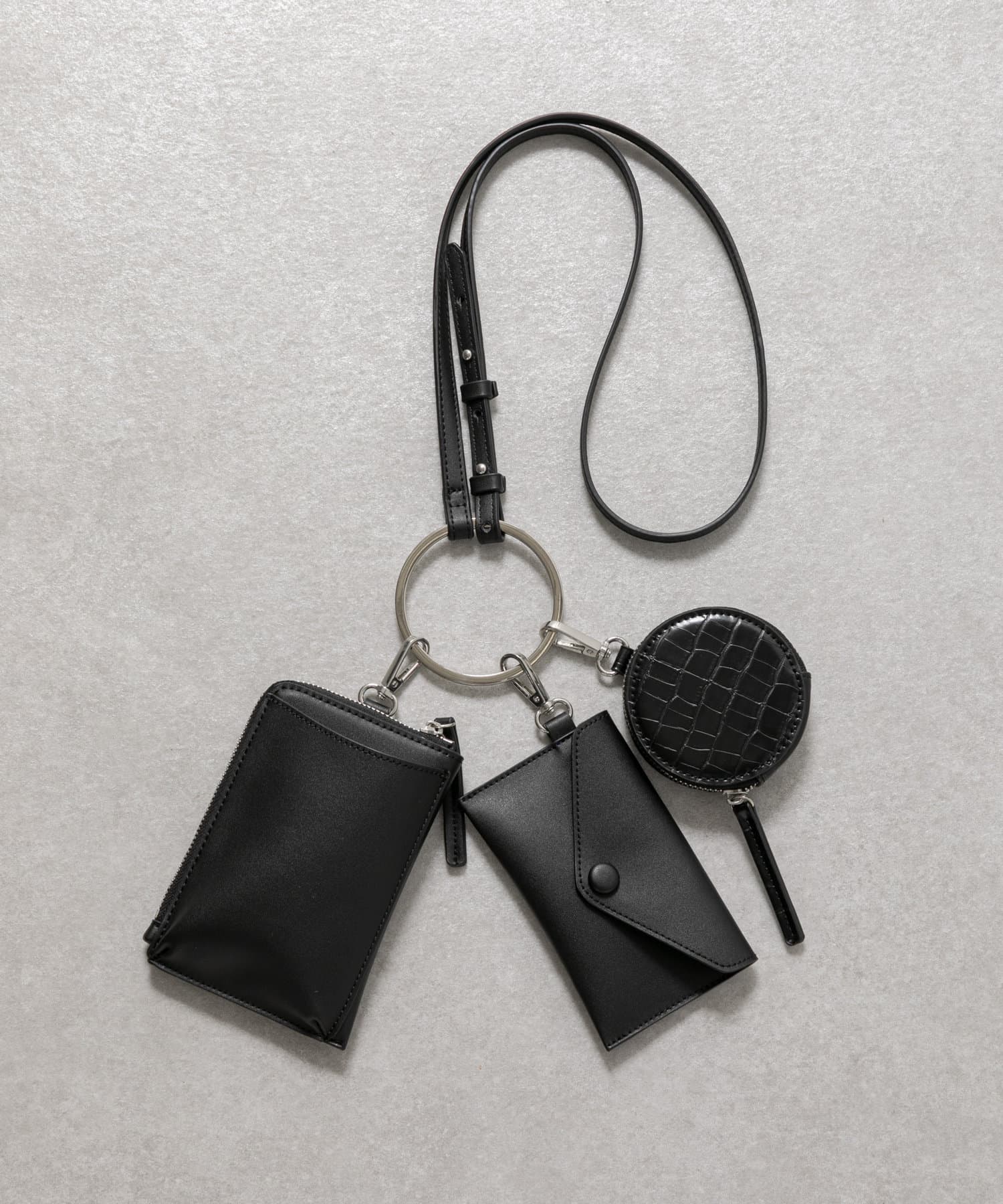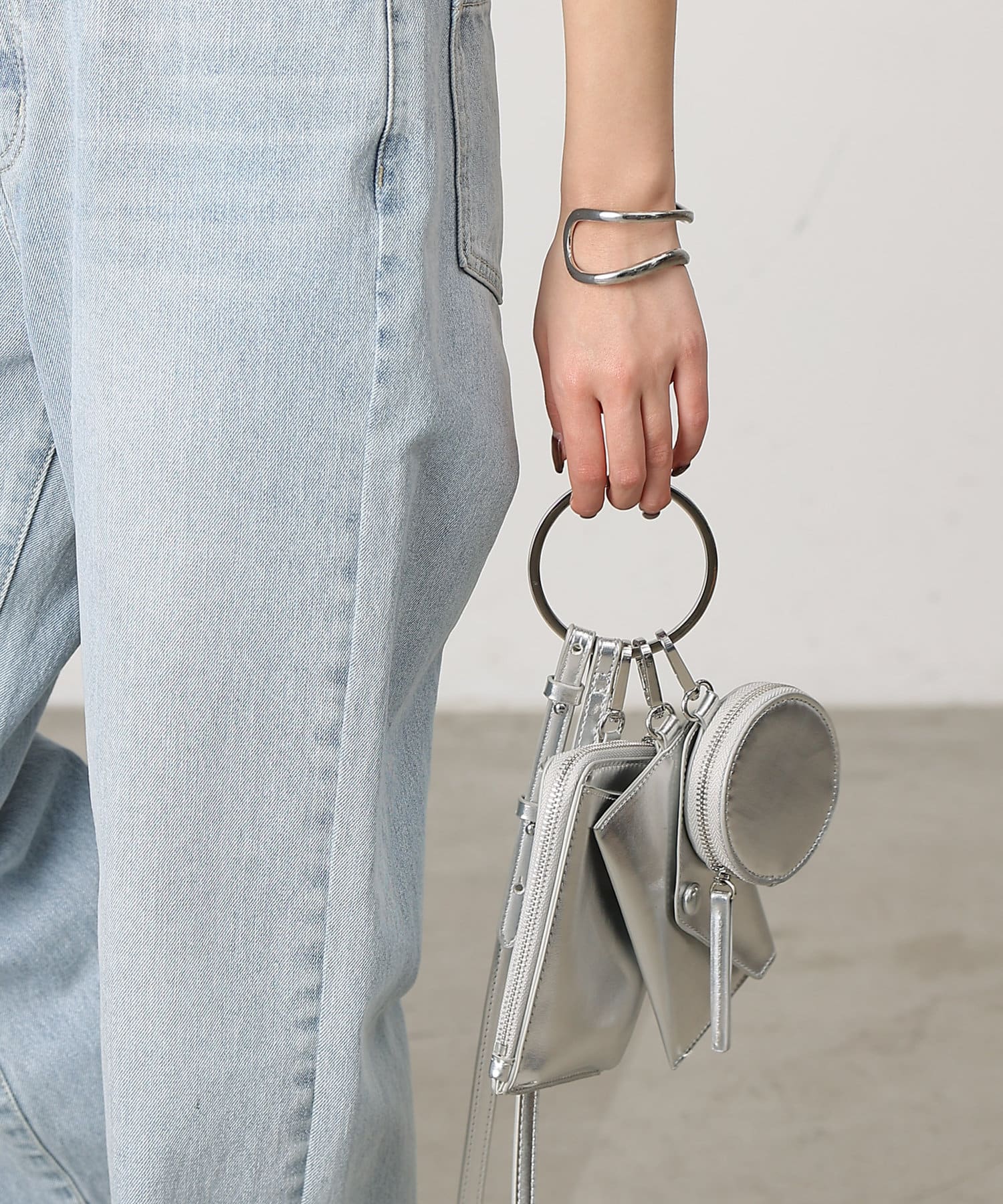 スマホカードケース、レター型ポーチ、丸型ミニポーチがリングに装着でき、ショルダーバッグとして使える3連バッグ。