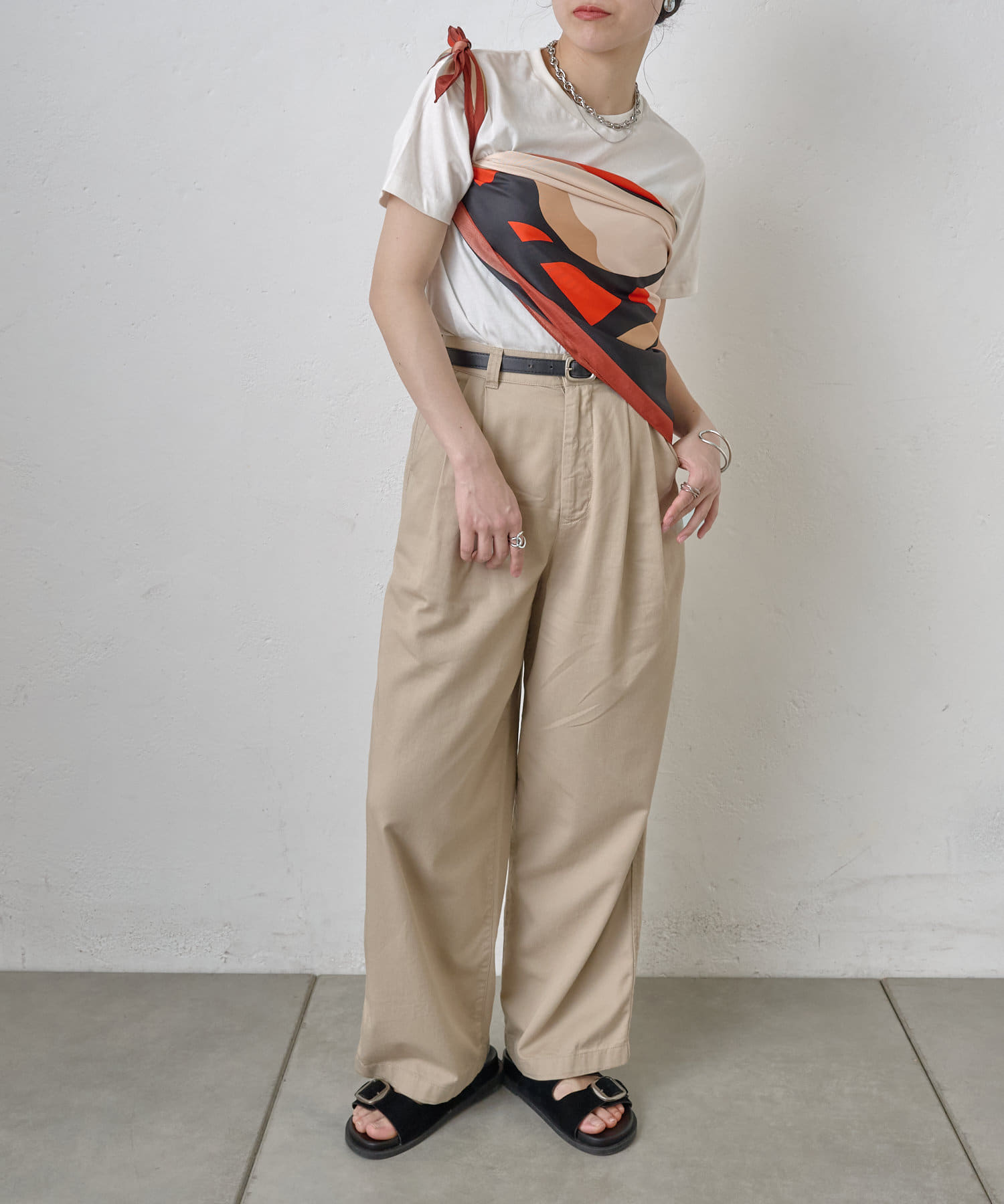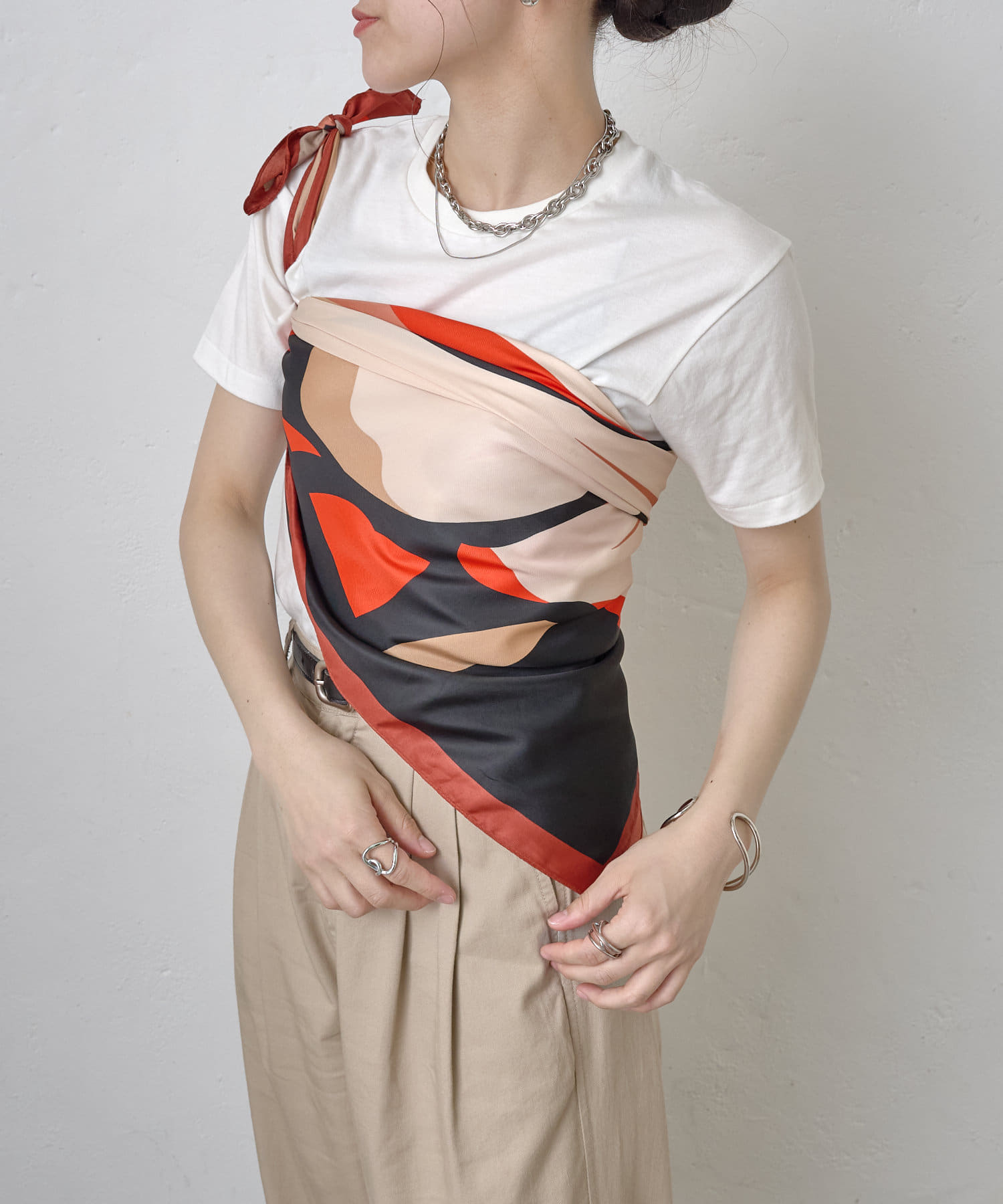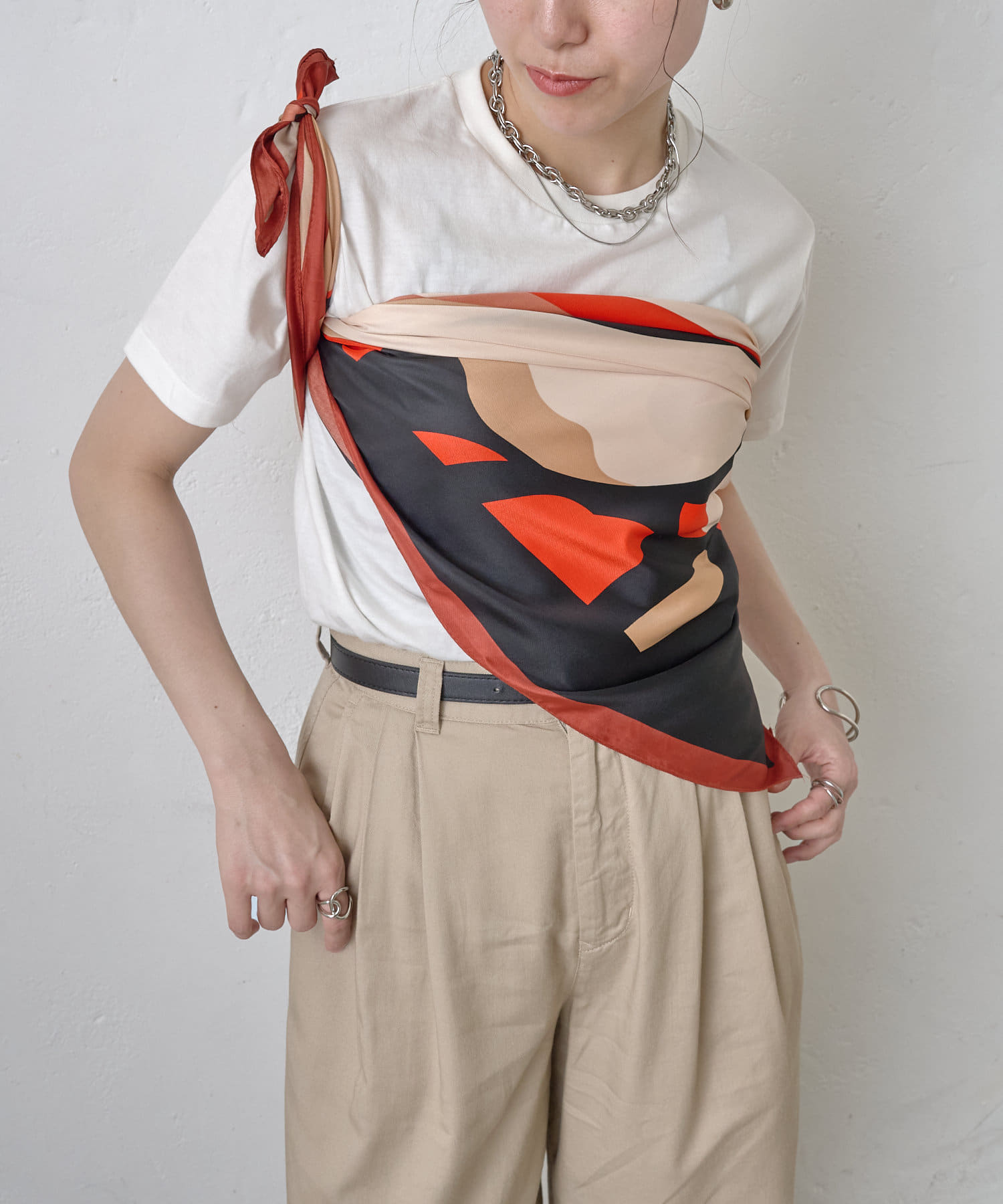 まるでアート作品のような、存在感あふれる大判スカーフ。