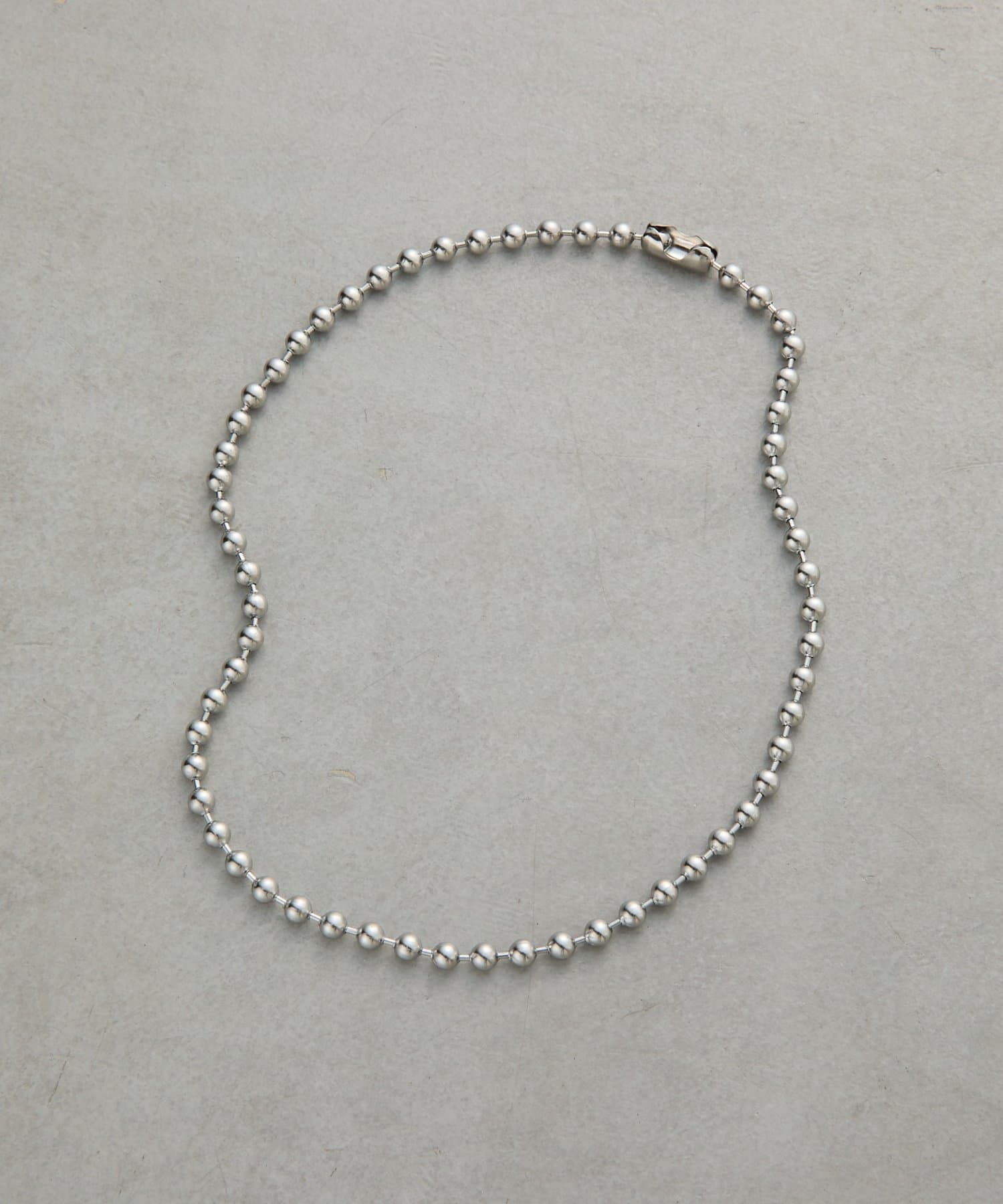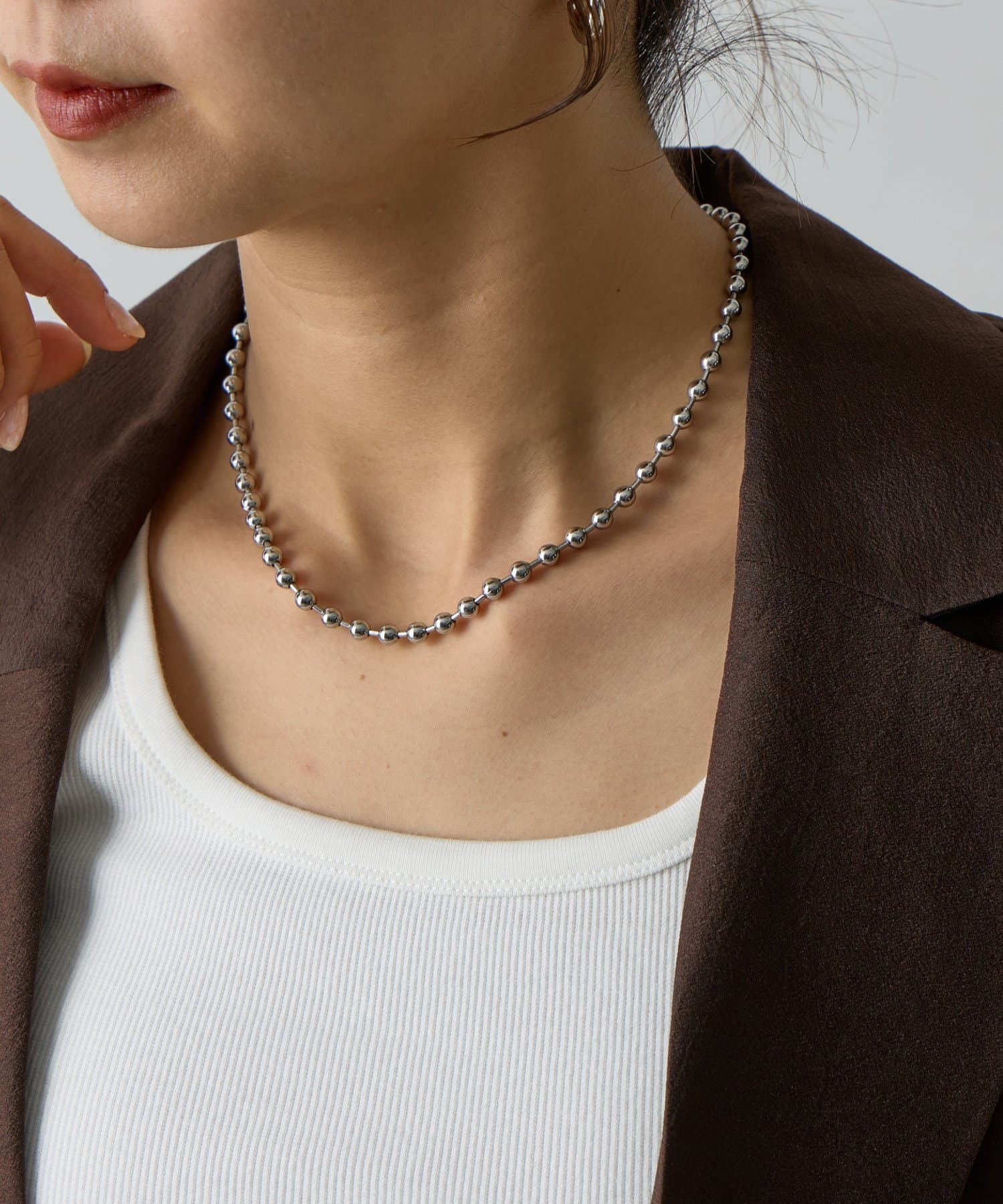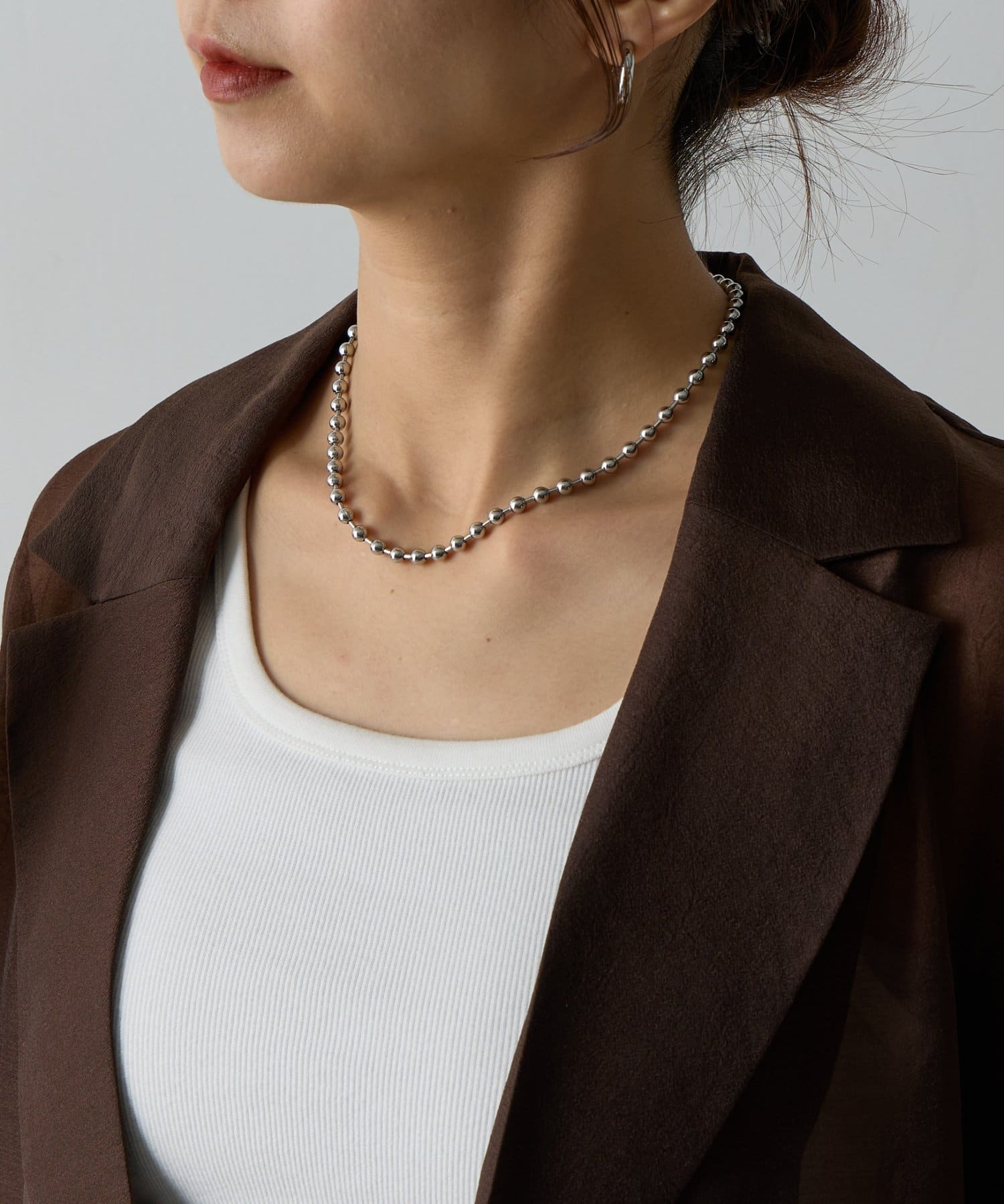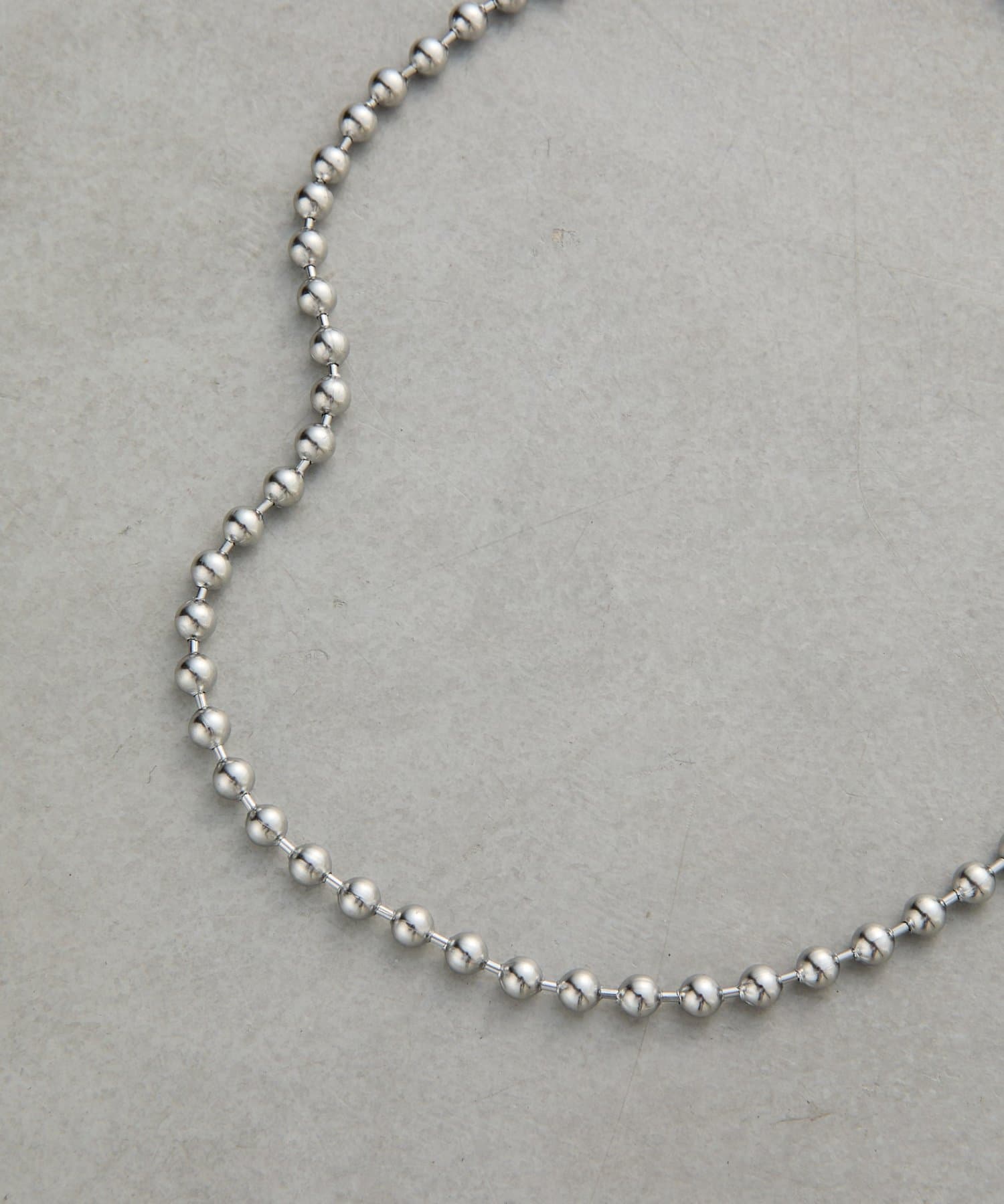 シンプルなボールチェーンのネックレスは、程よいボリューム感で首元のアクセントに。