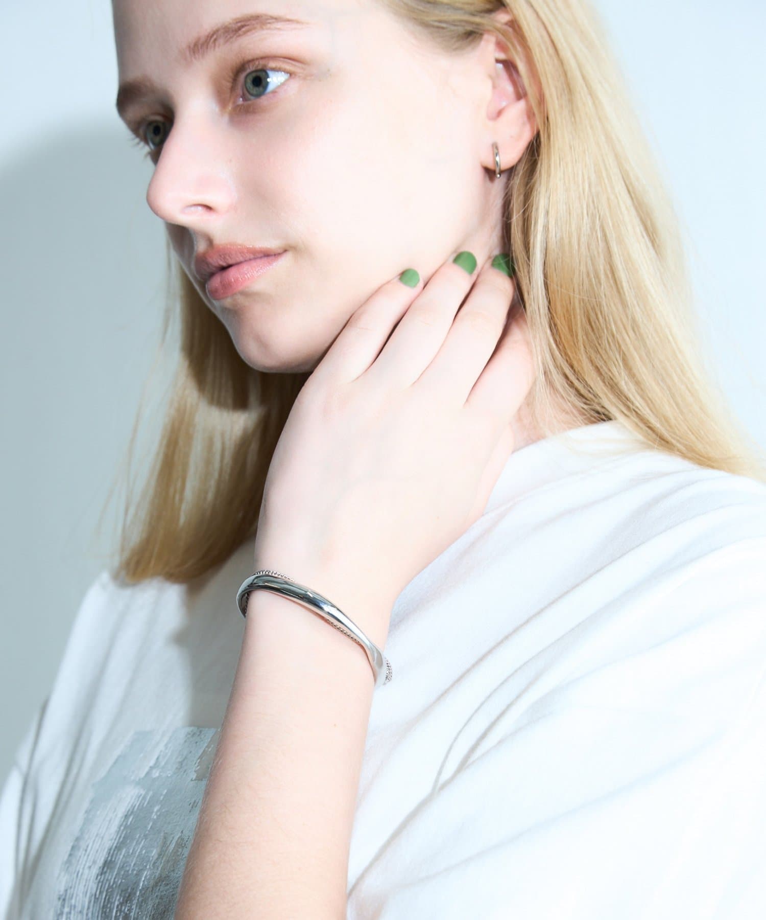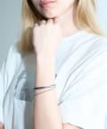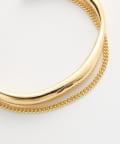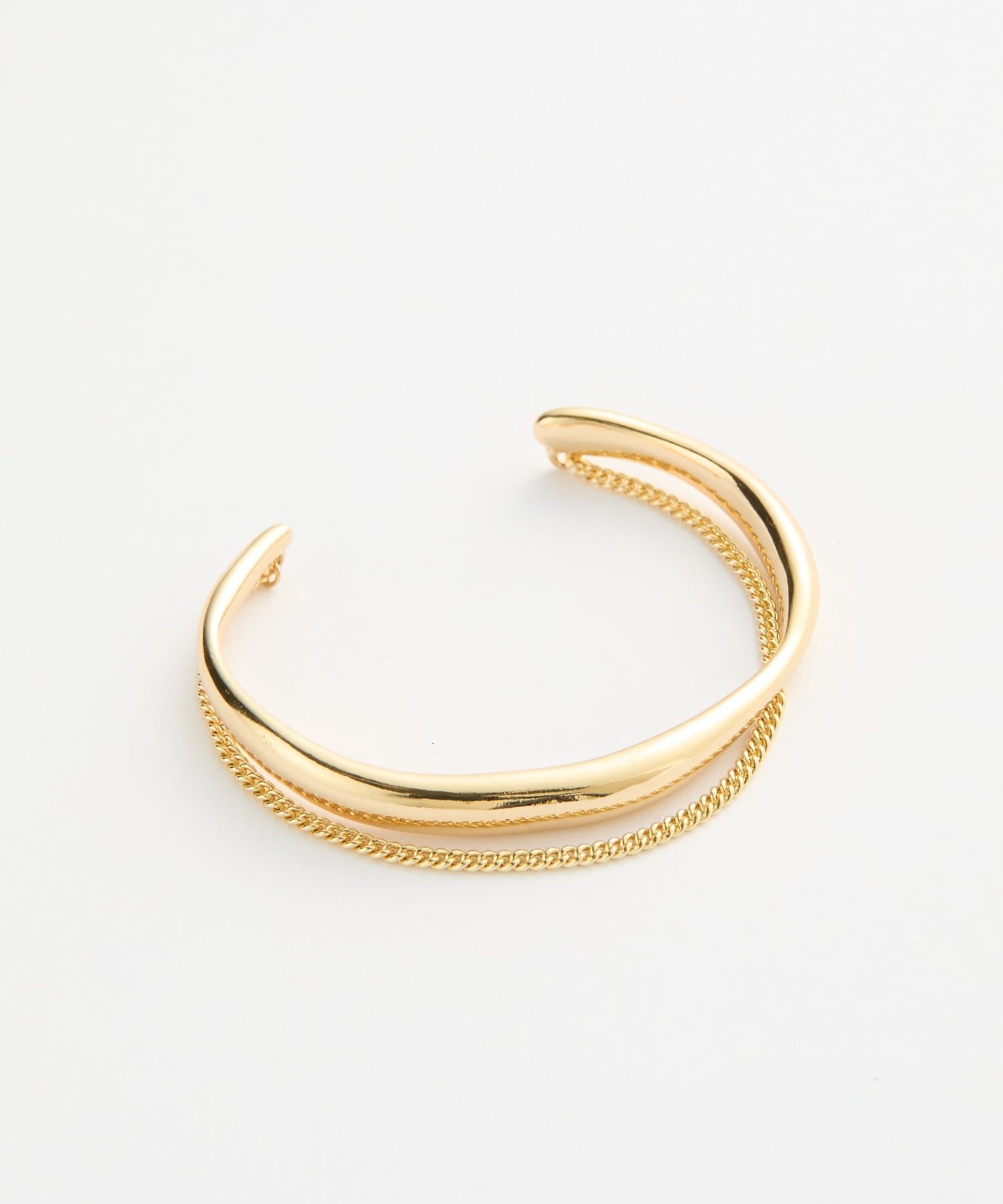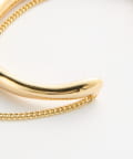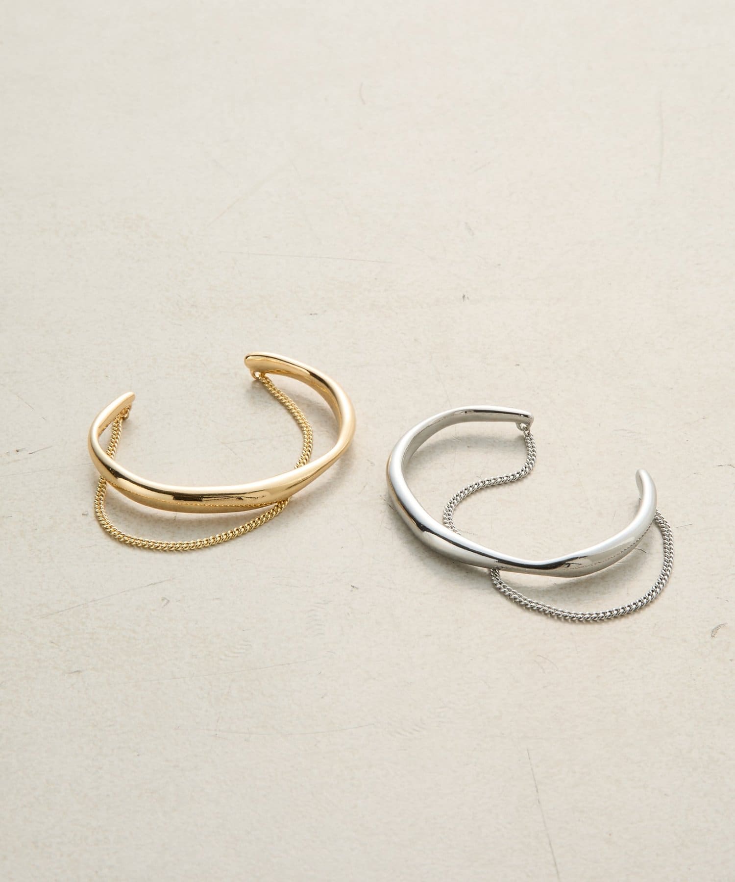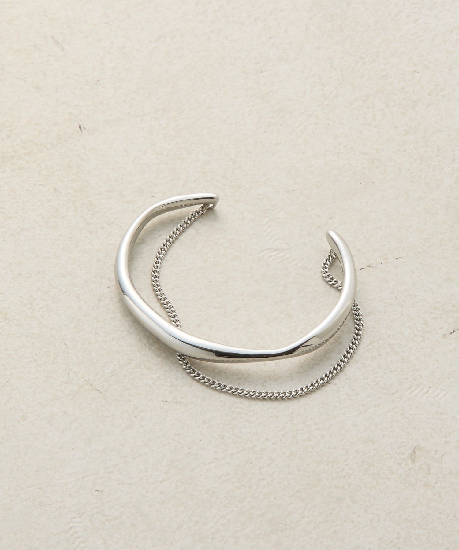 ニュアンスラインが美しいメタルバングルに、細く華奢なチェーンが付いたレイヤードデザインのバングル。お手持ちのブレスレットや時計との重ね付けもおすすめ。カジュアルな普段使いにはもちろんフォーマルなシーンまで幅広いシーンで活躍。