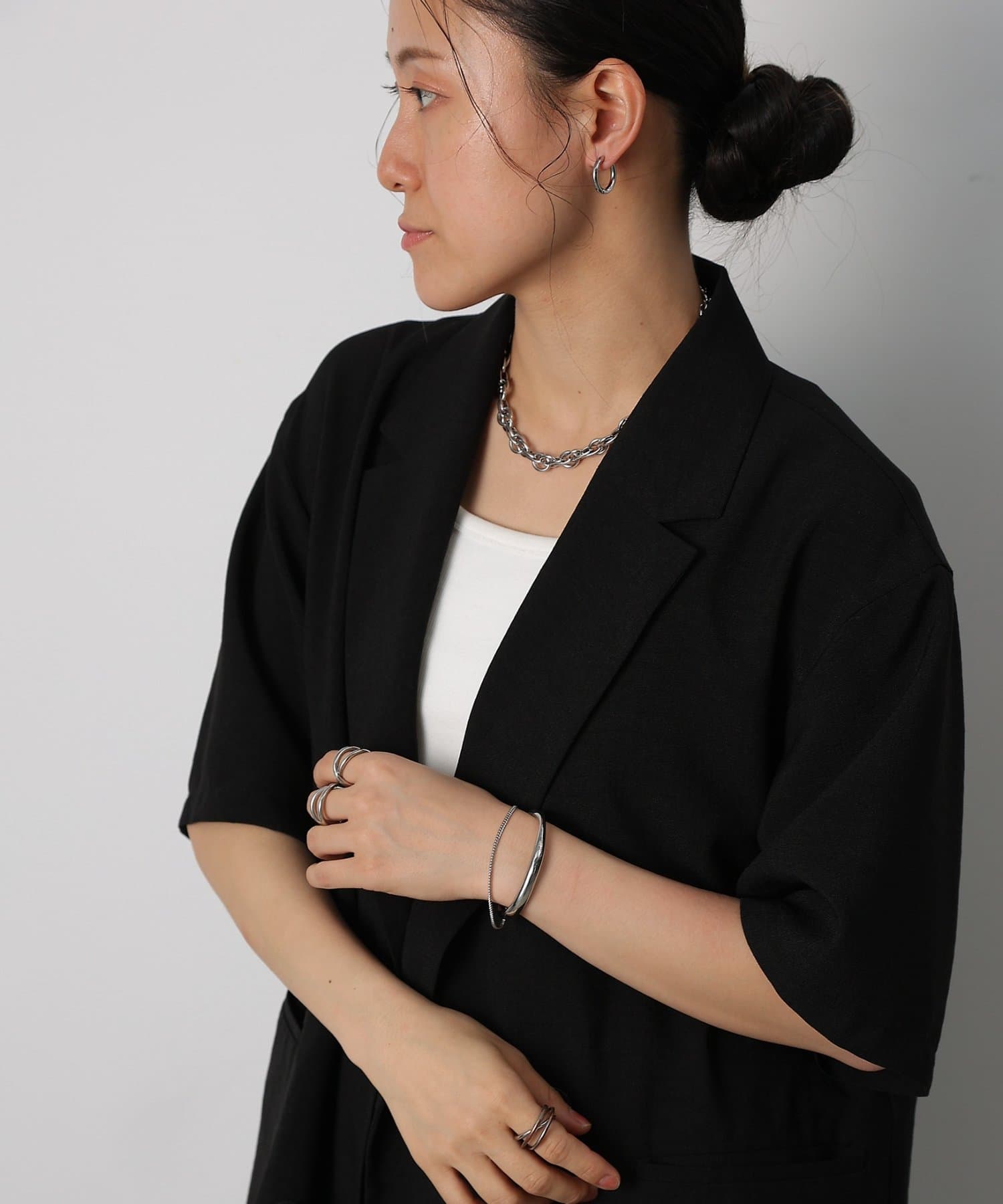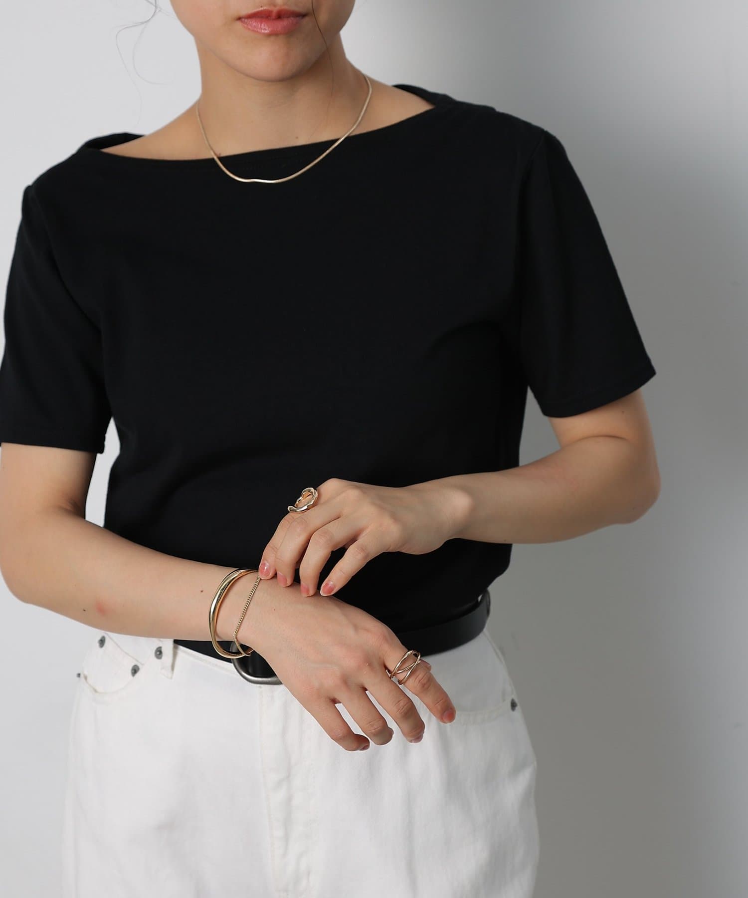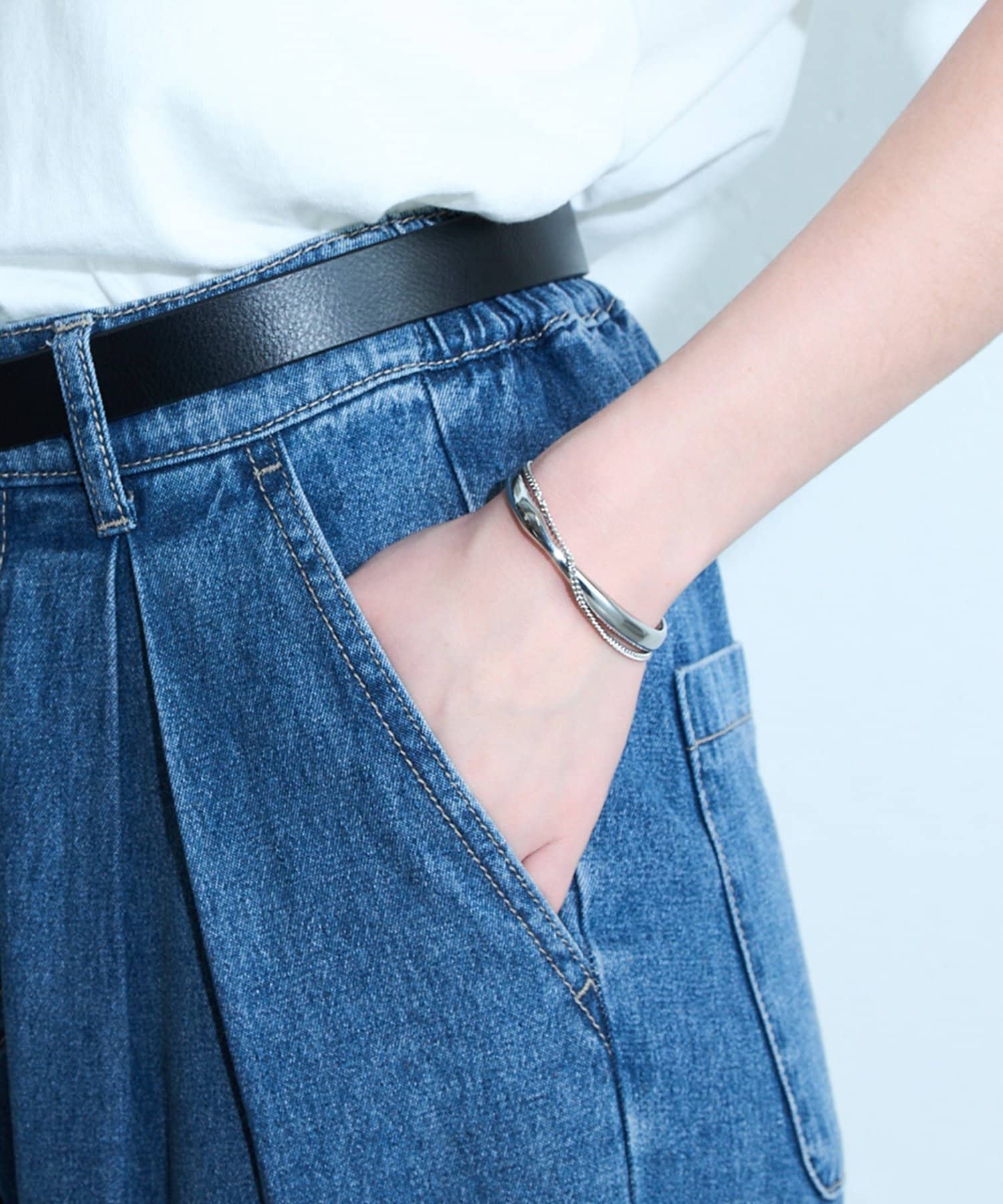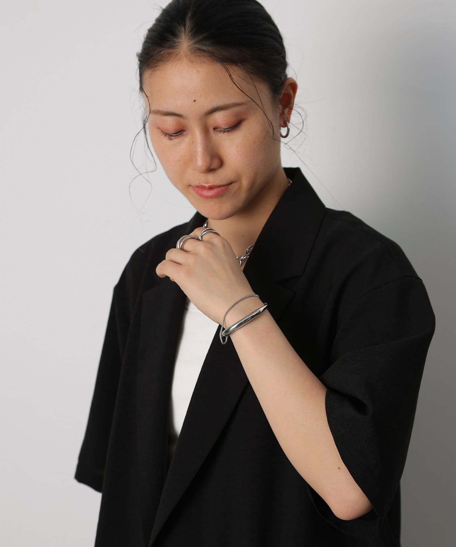 ニュアンスラインが美しいメタルバングルに、細く華奢なチェーンが付いたレイヤードデザインのバングル。お手持ちのブレスレットや時計との重ね付けもおすすめ。カジュアルな普段使いにはもちろんフォーマルなシーンまで幅広いシーンで活躍。