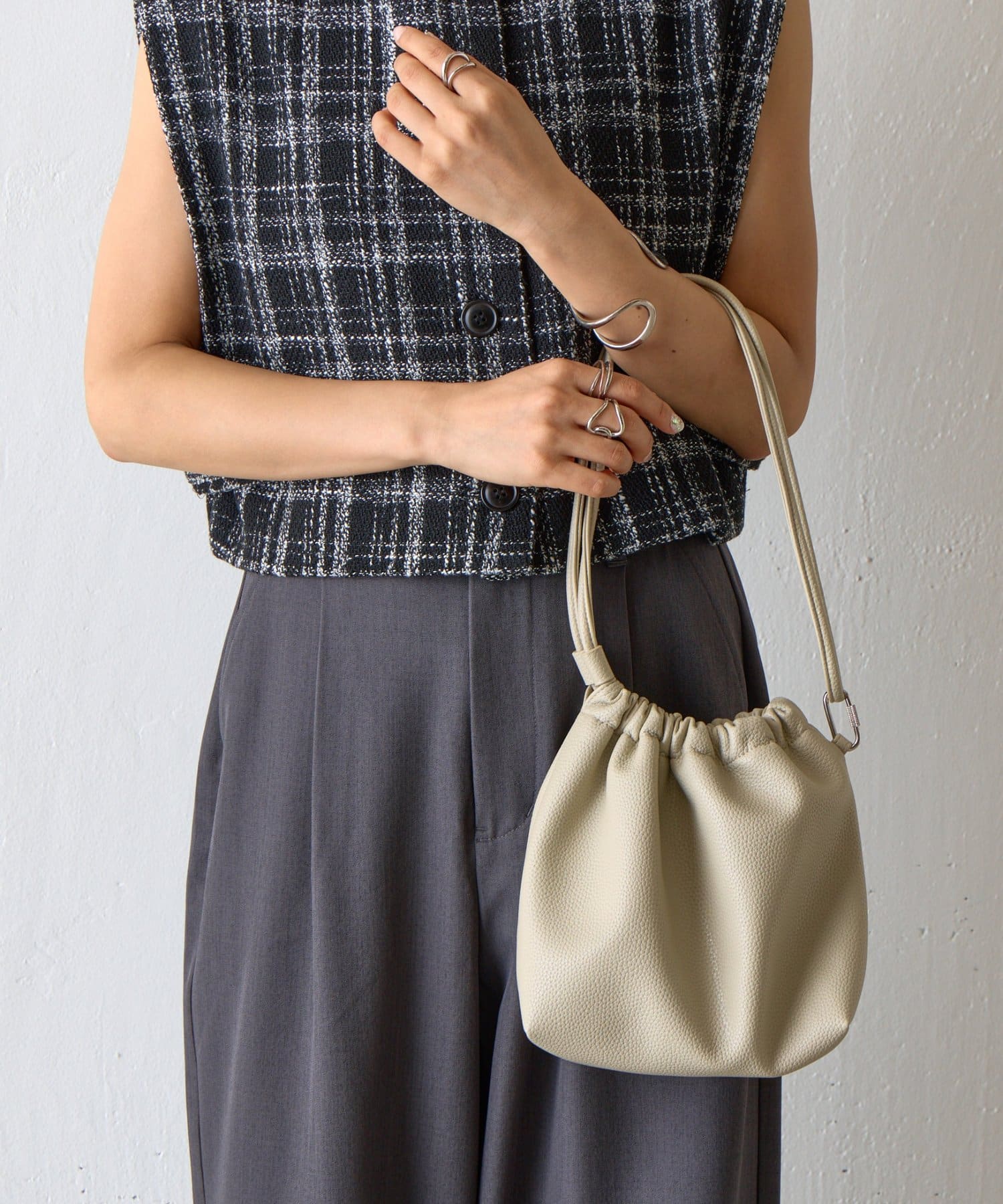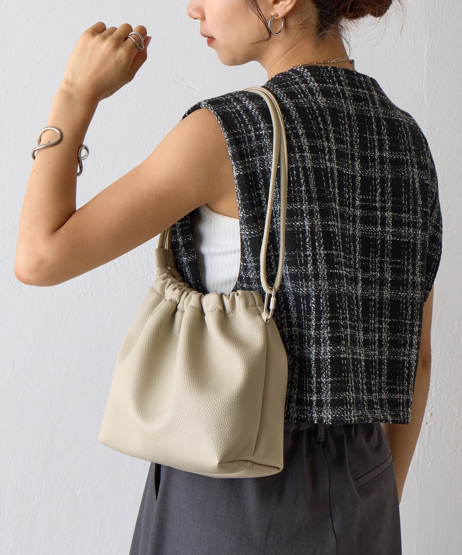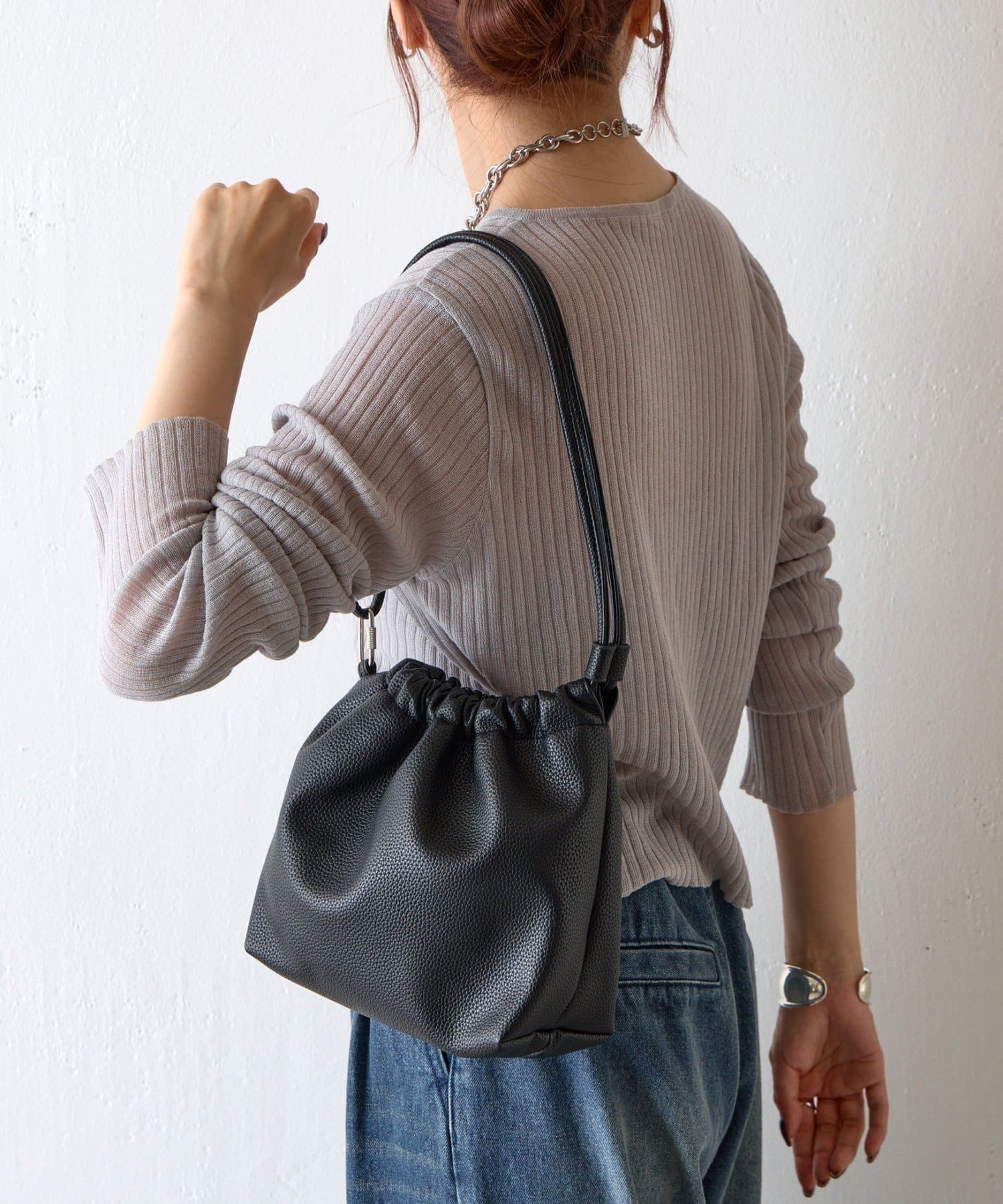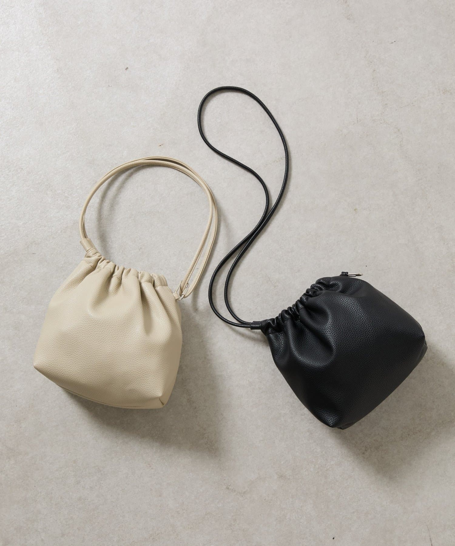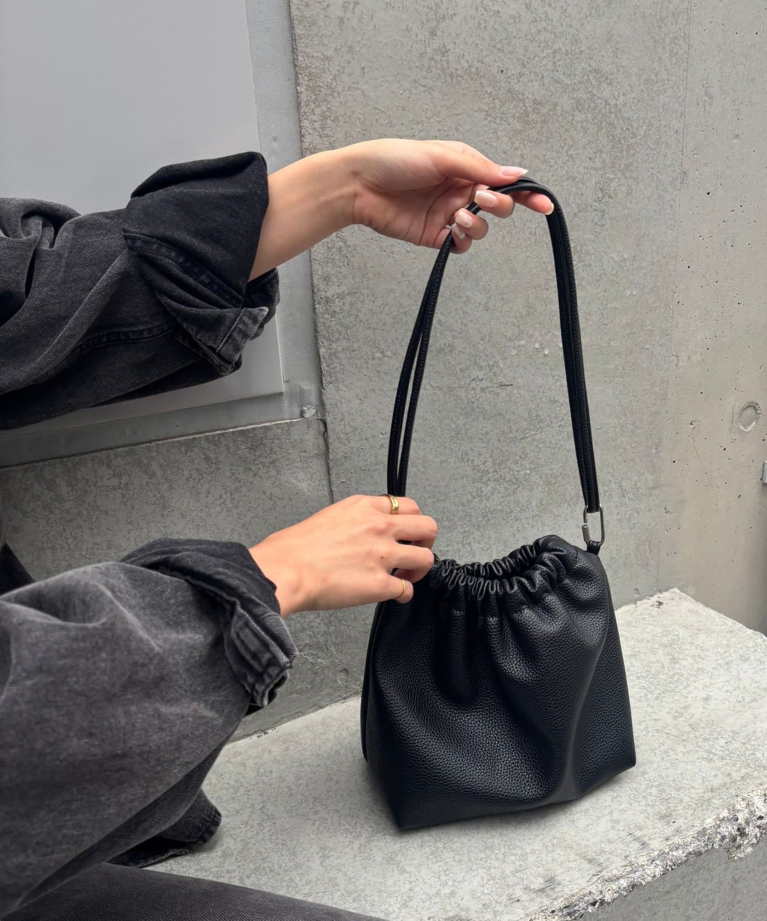 【くしゅっとしたフォルムが愛らしい、ドローストリングデザインのハンドバッグ】