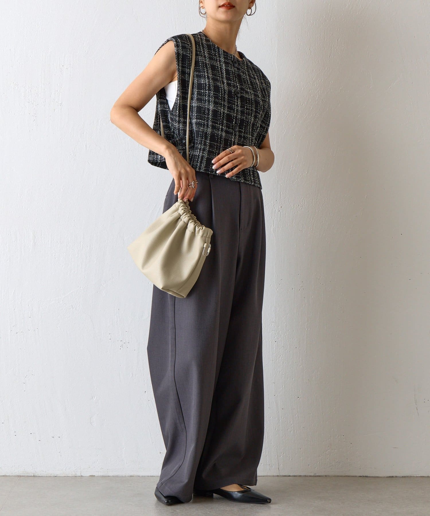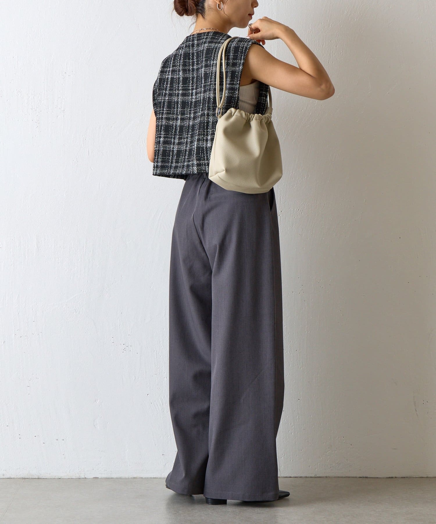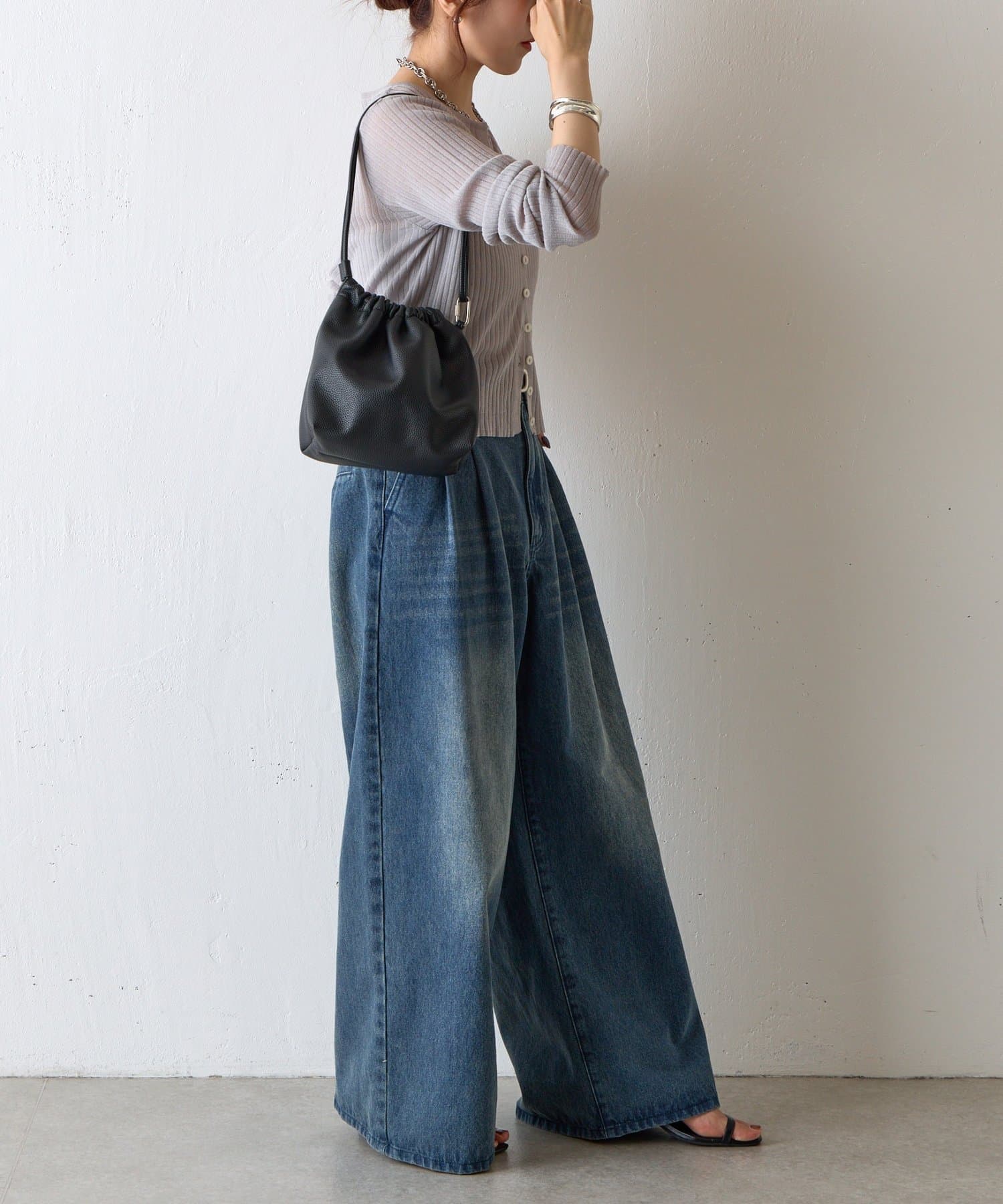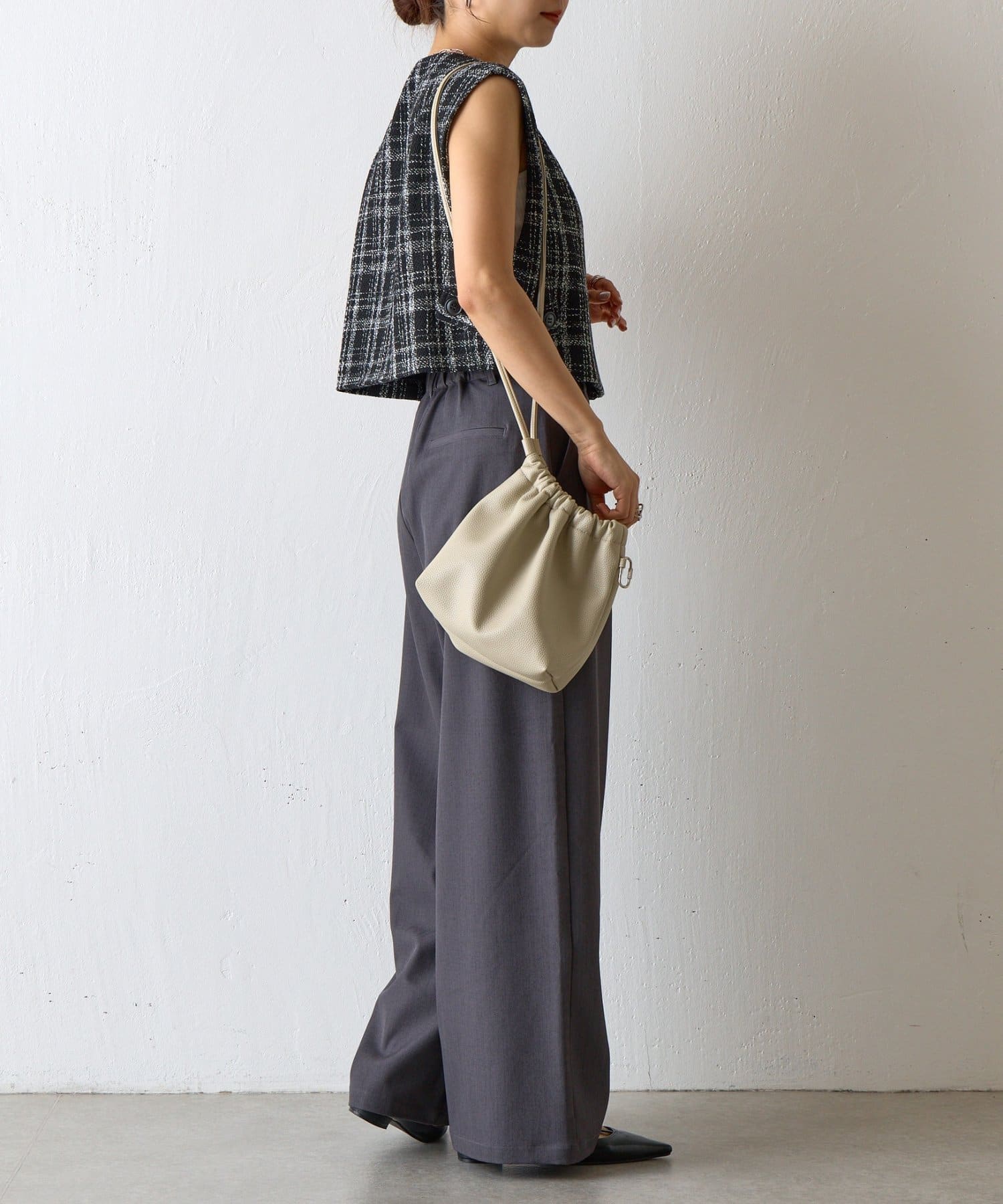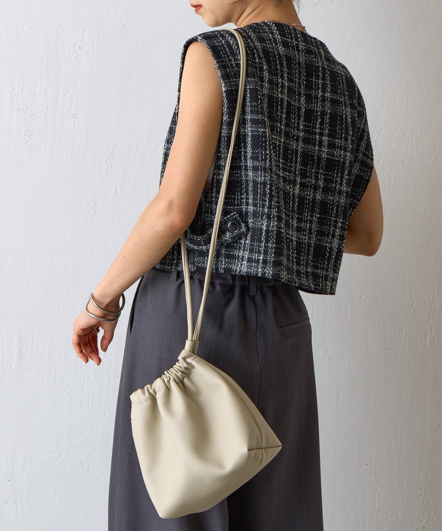 【くしゅっとしたフォルムが愛らしい、ドローストリングデザインのハンドバッグ】