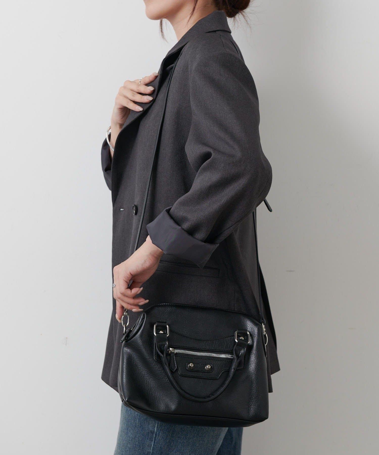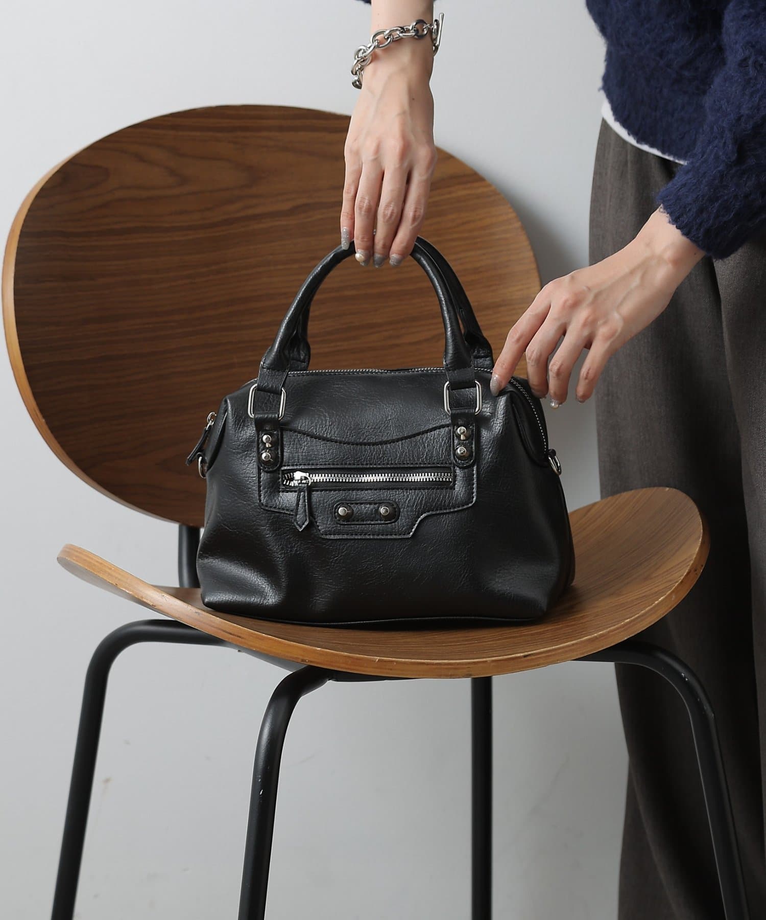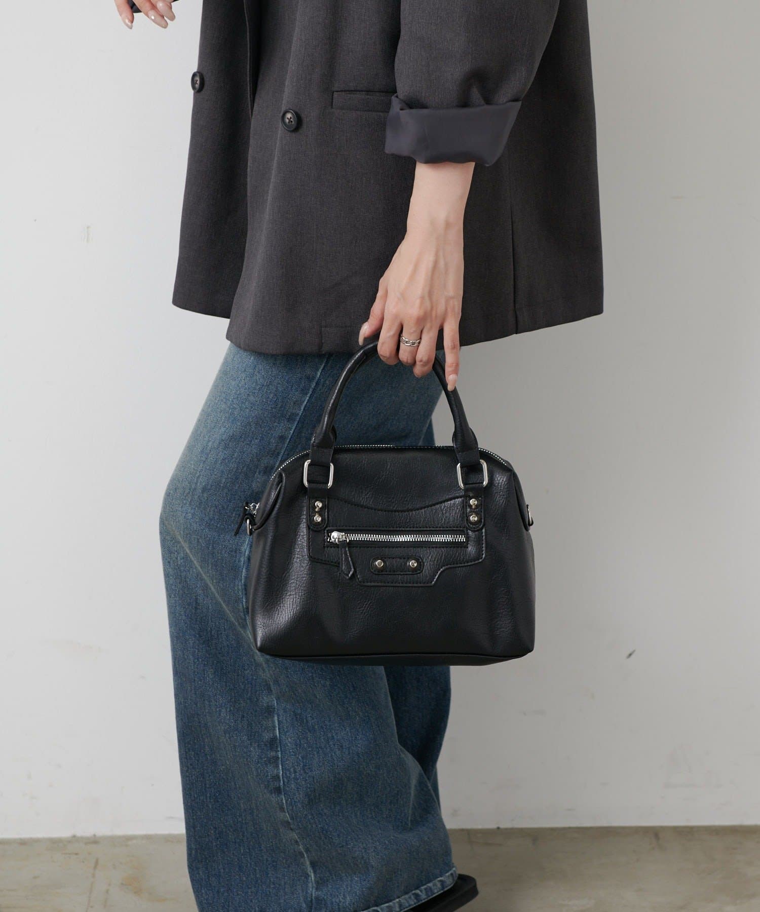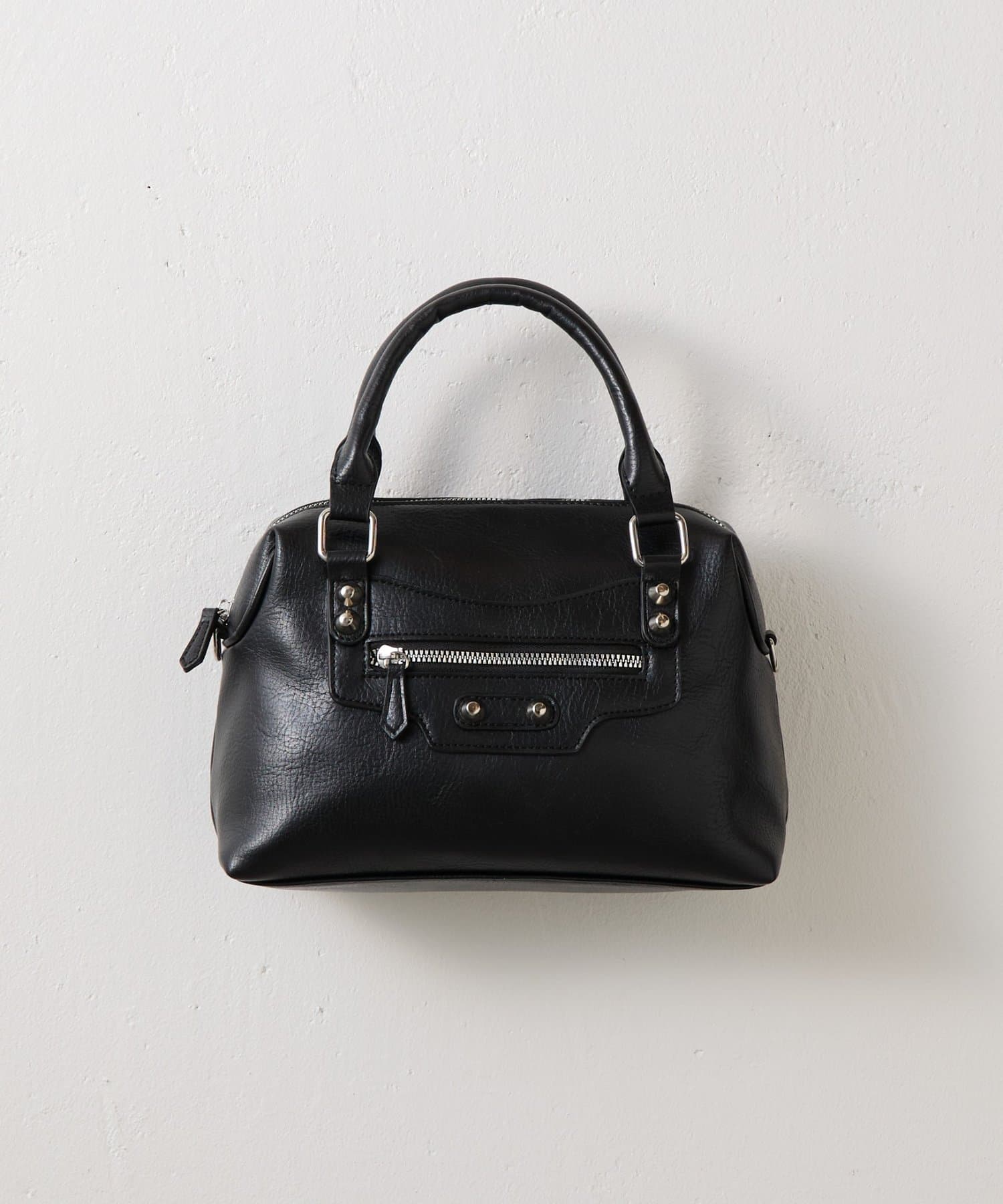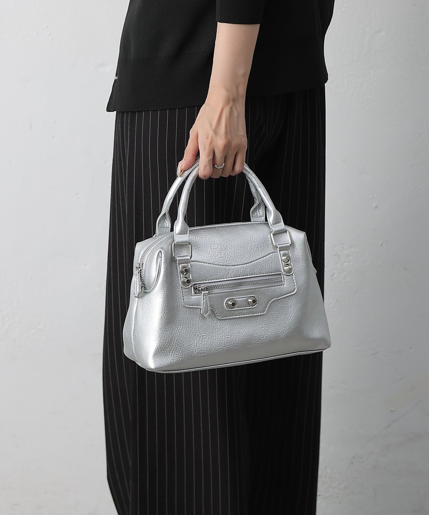 【エッジを効かせた上品シルエット、スタッズボストンバッグ】