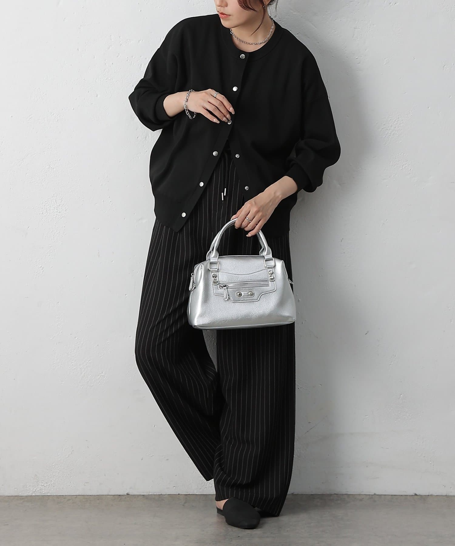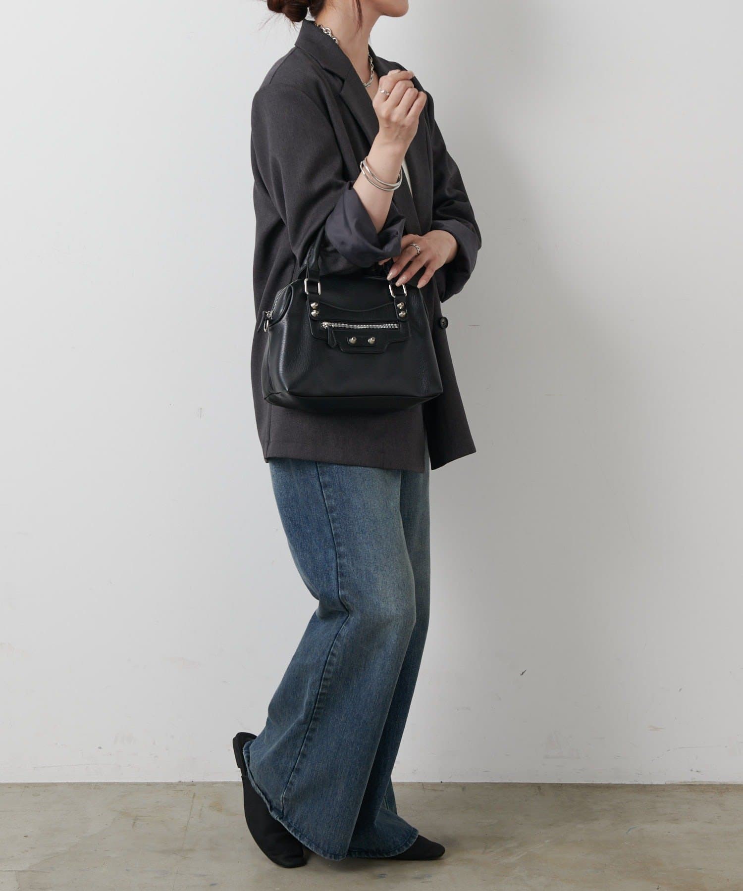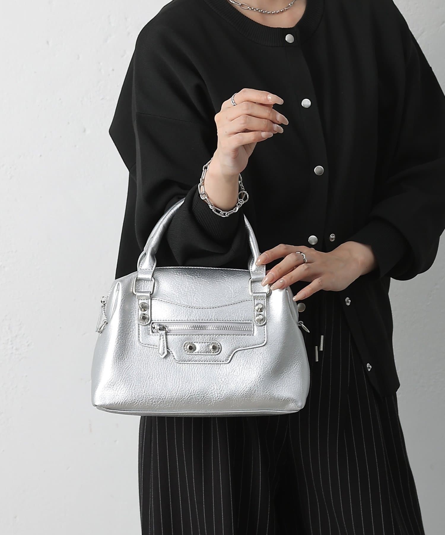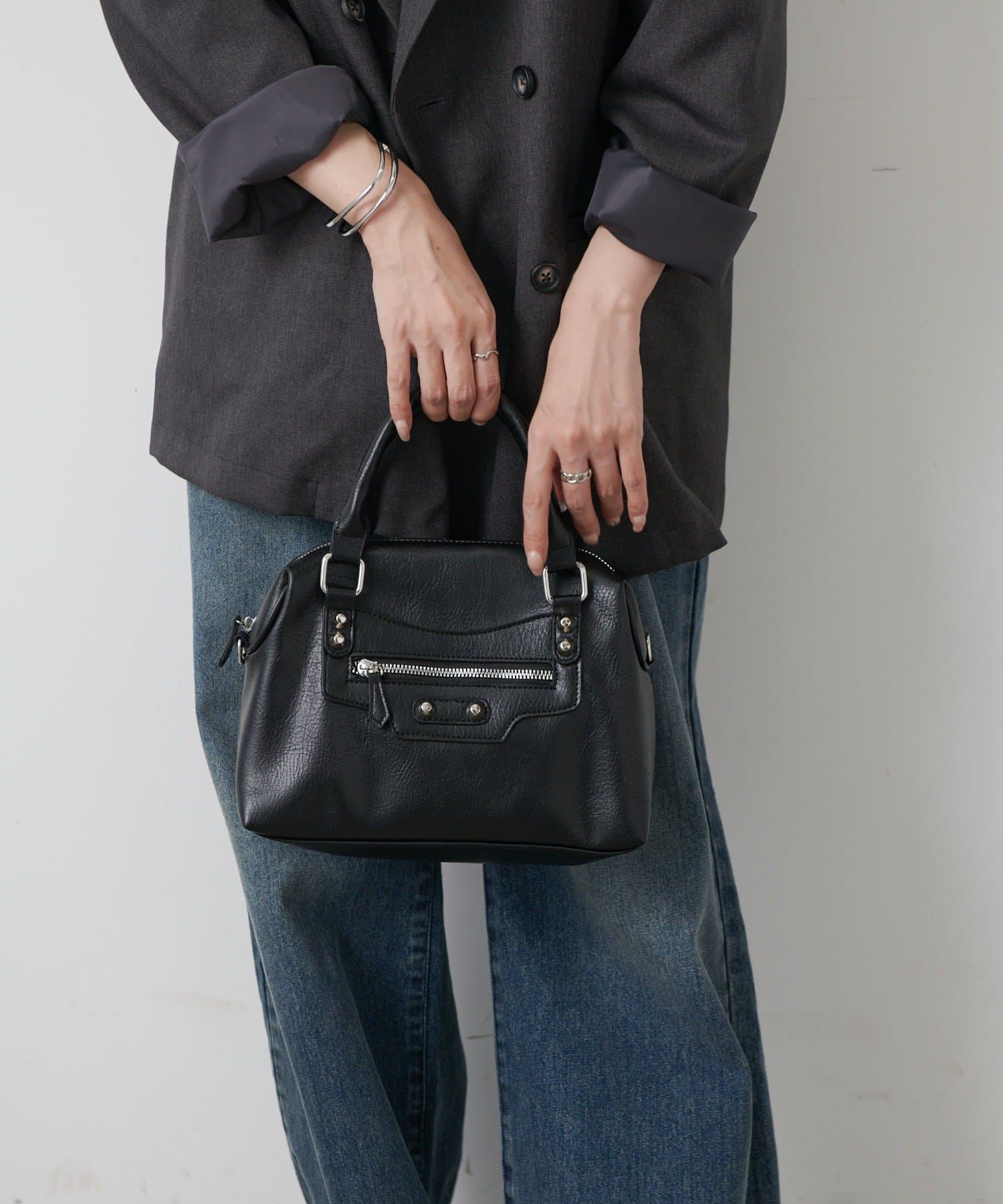【エッジを効かせた上品シルエット、スタッズボストンバッグ】