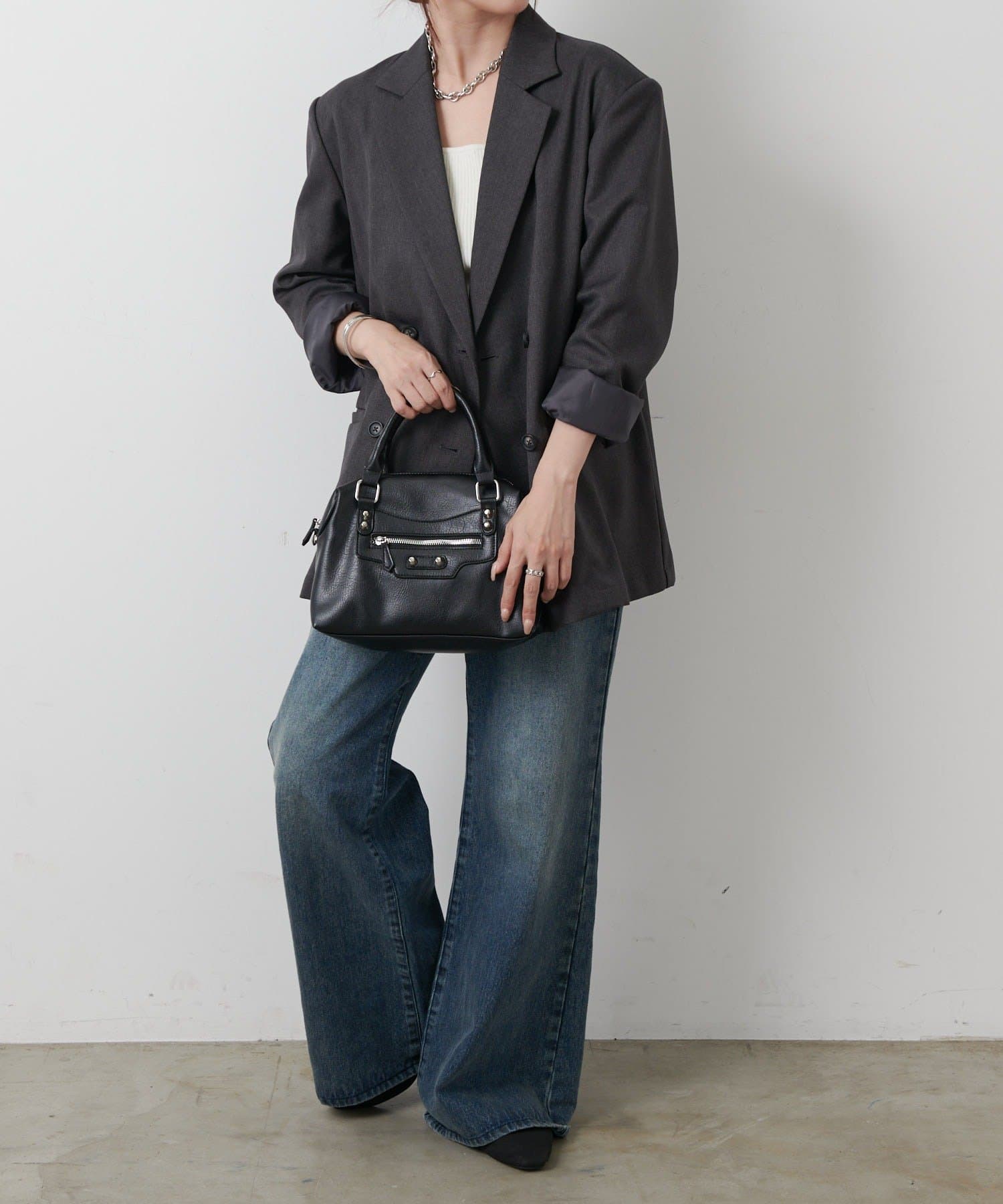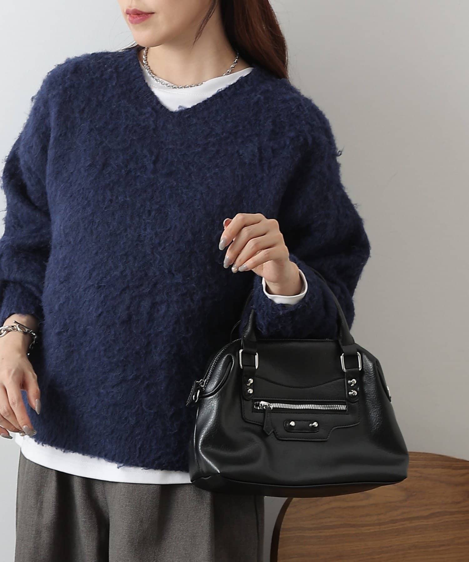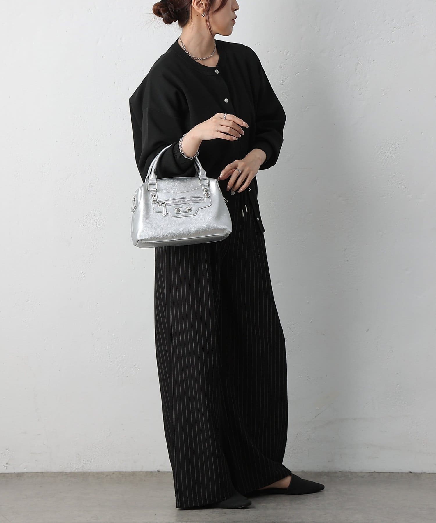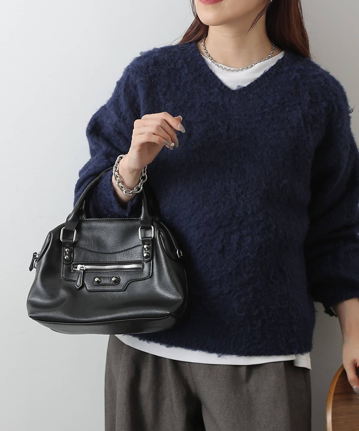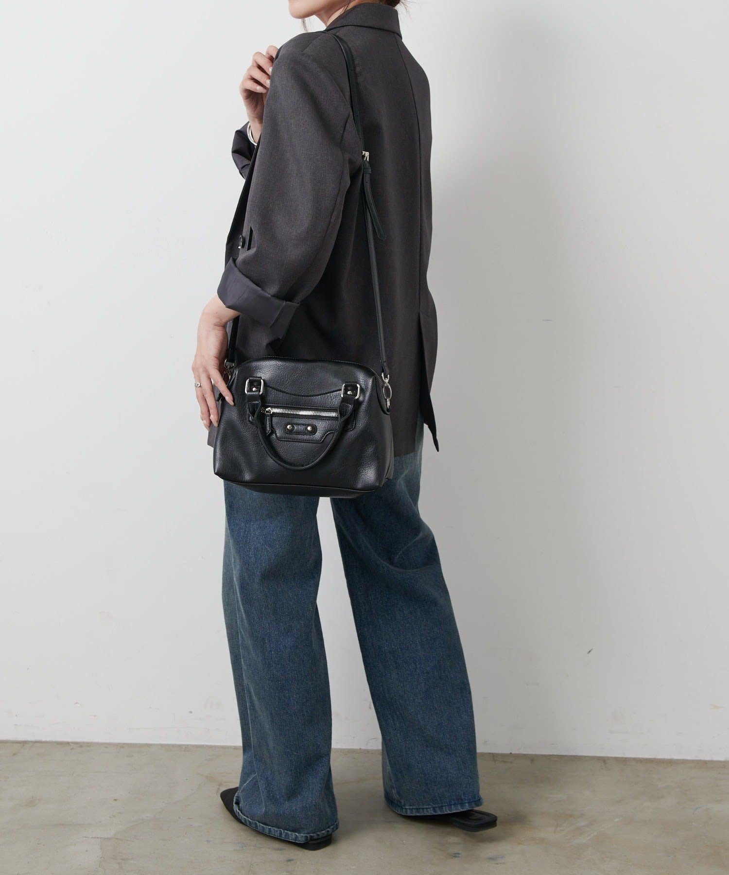 【エッジを効かせた上品シルエット、スタッズボストンバッグ】
