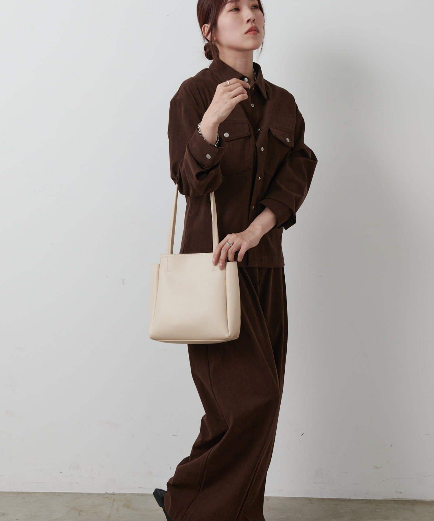 無駄のないミニマルなフォルムながら、ポーチ、お財布、スマホなどしっかり入るサイズ感です。