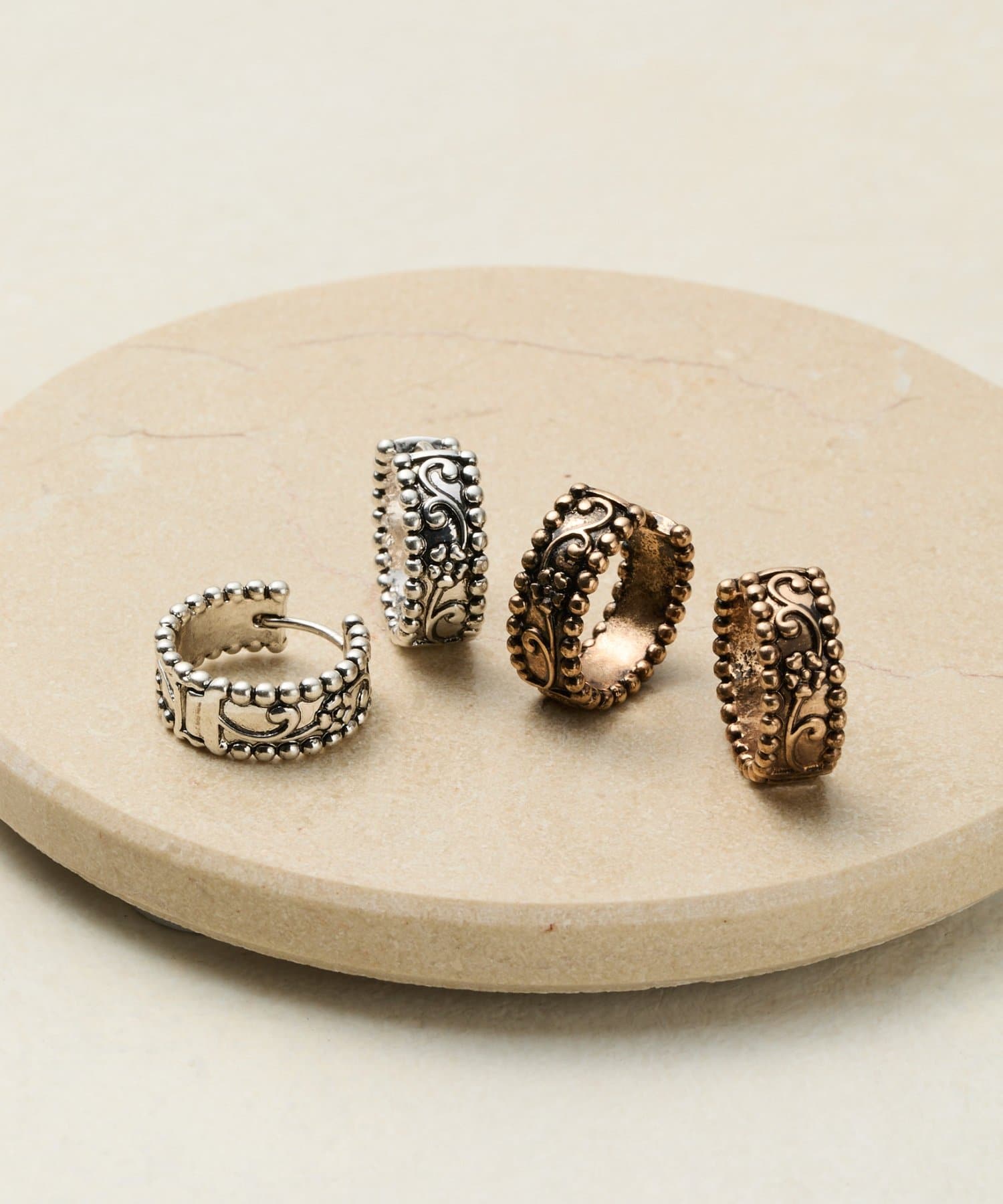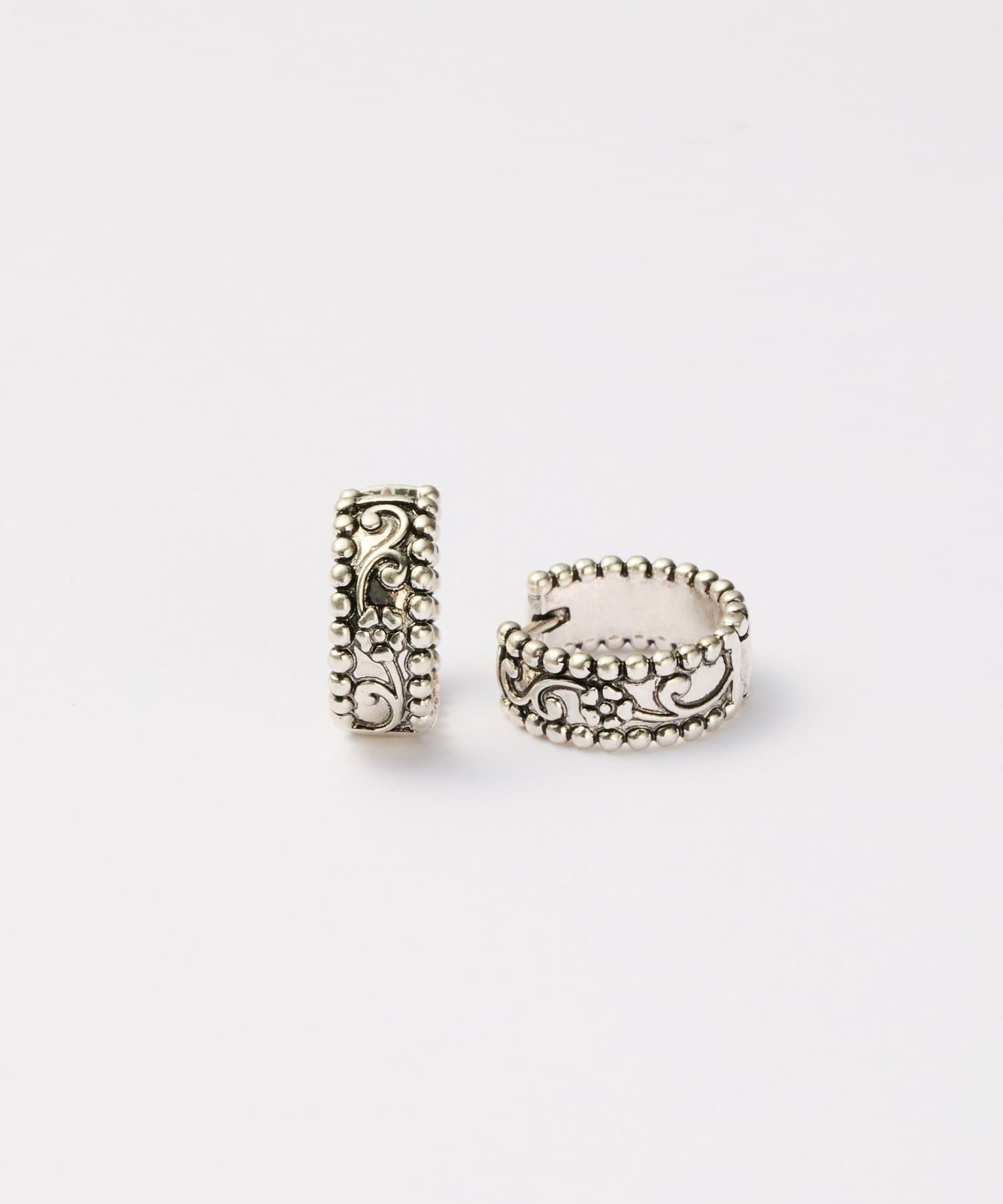ヴィンテージライクな模様がアクセントになった、使い勝手の良いフープデザインのイヤリング/ピアス。