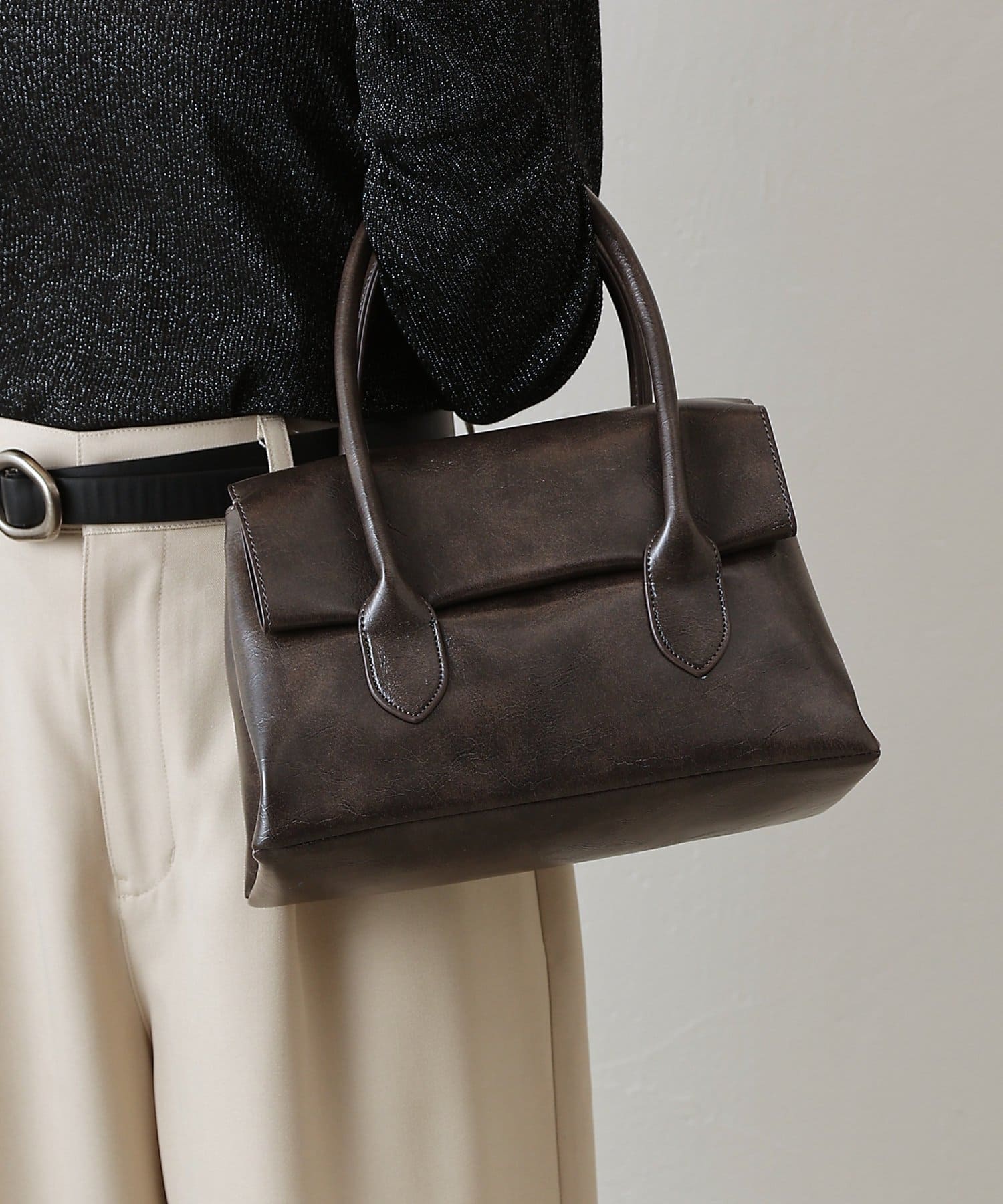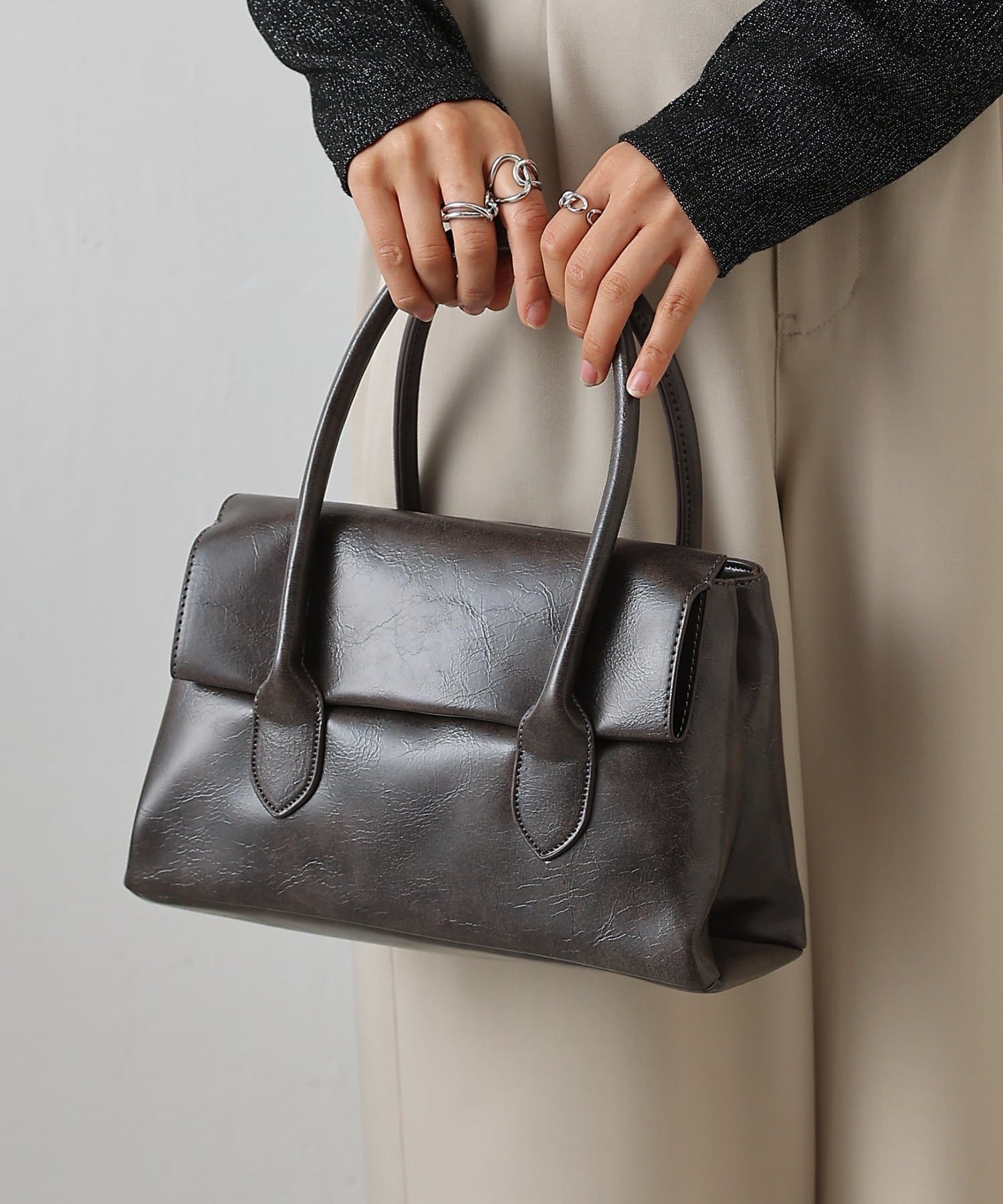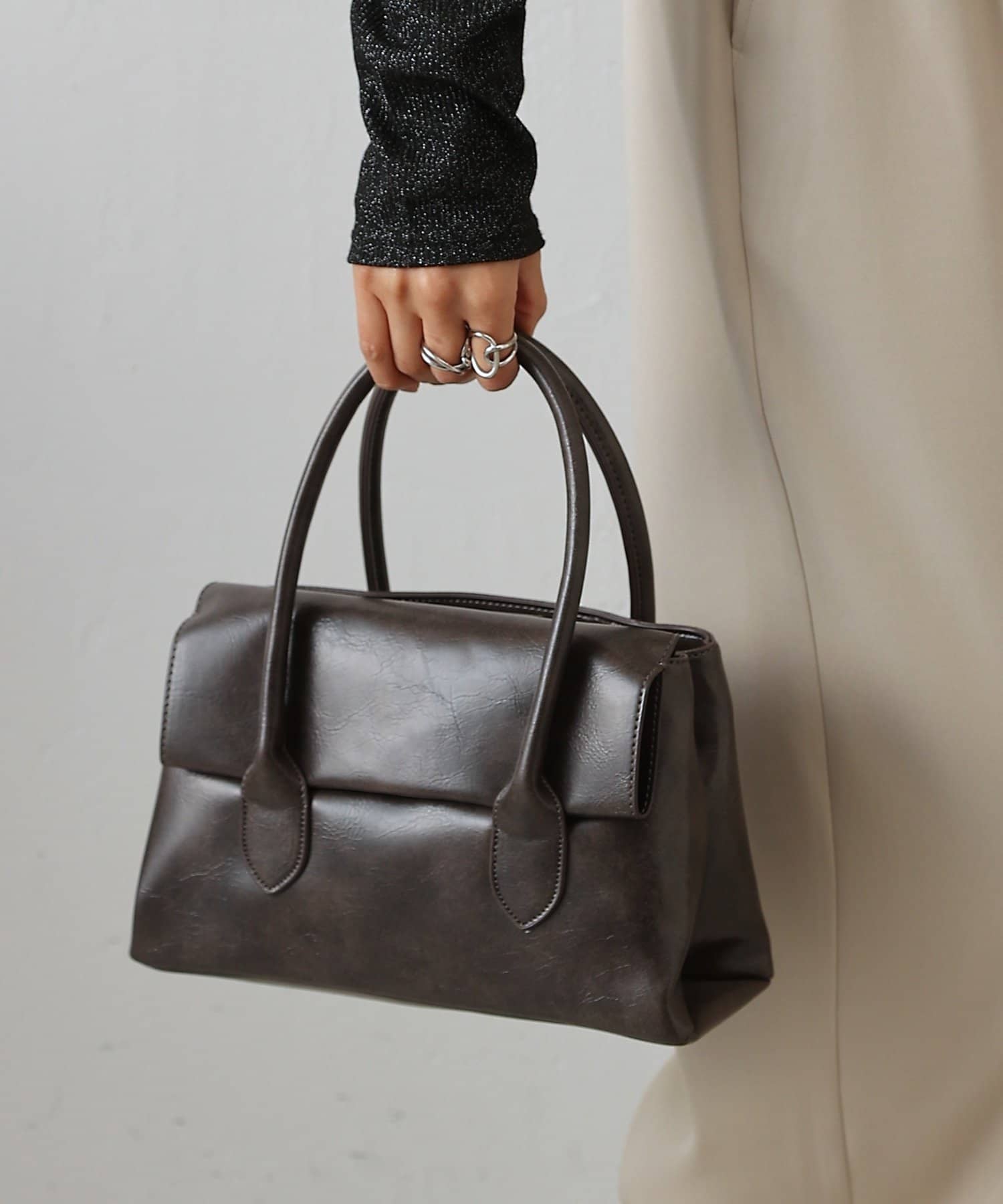 きちんと感のあるフラップデザインが印象的な、コンパクトサイズのハンドバッグ。