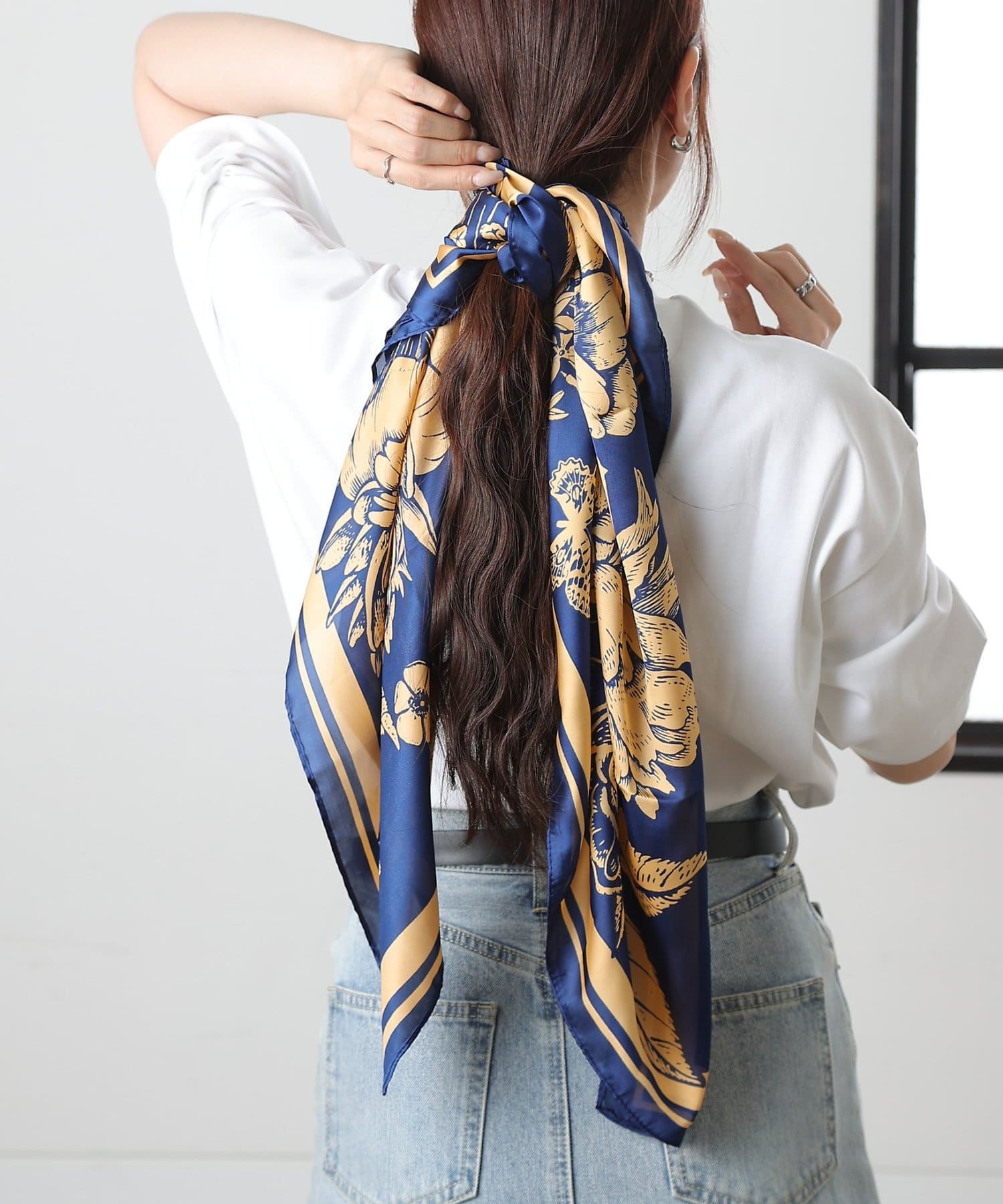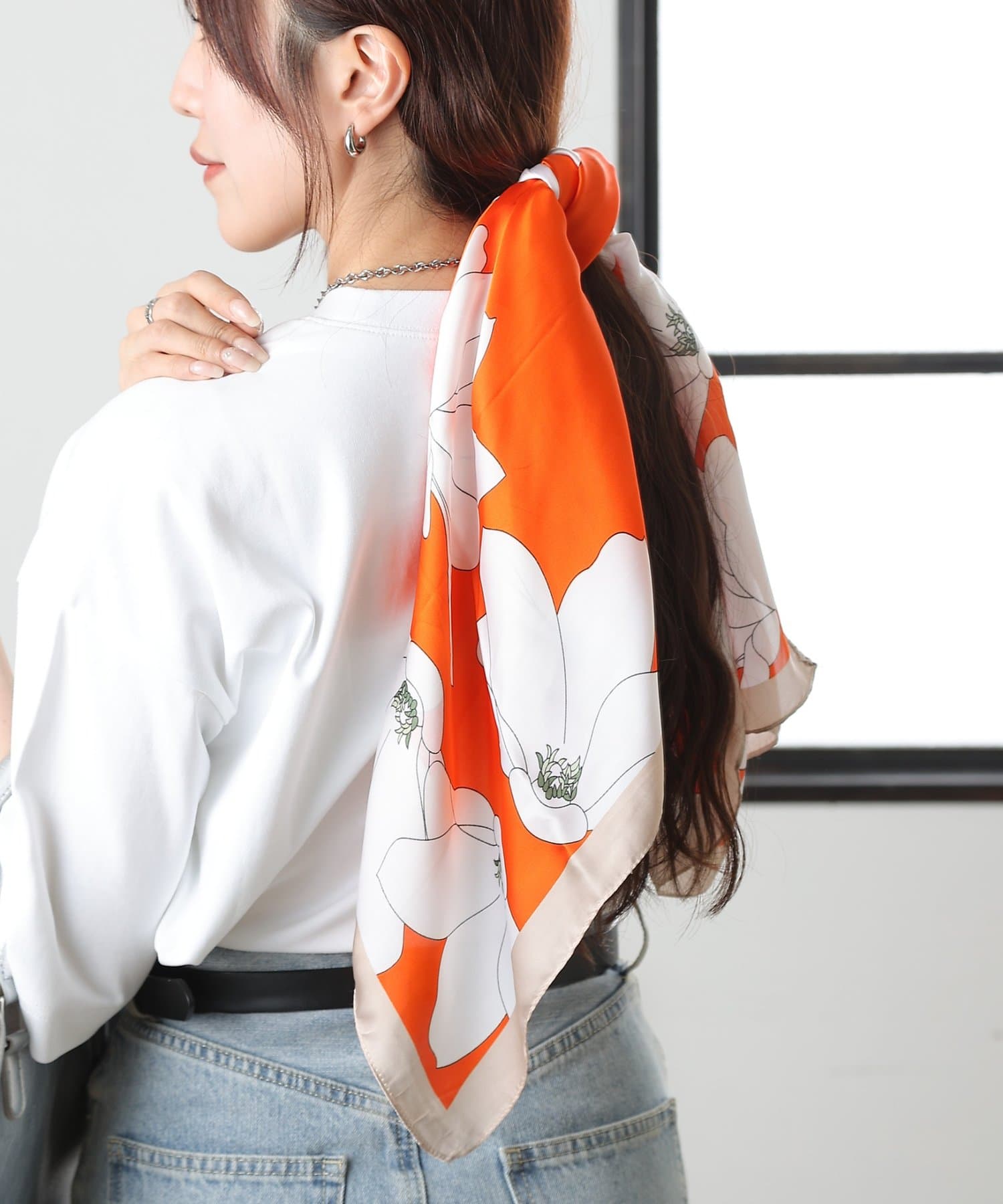 首元だけでなく、バッグに巻いてアクセントとして取り入れたり、ヘアアレンジとして頭に巻いたりと、幅広いアレンジを楽しめます。
