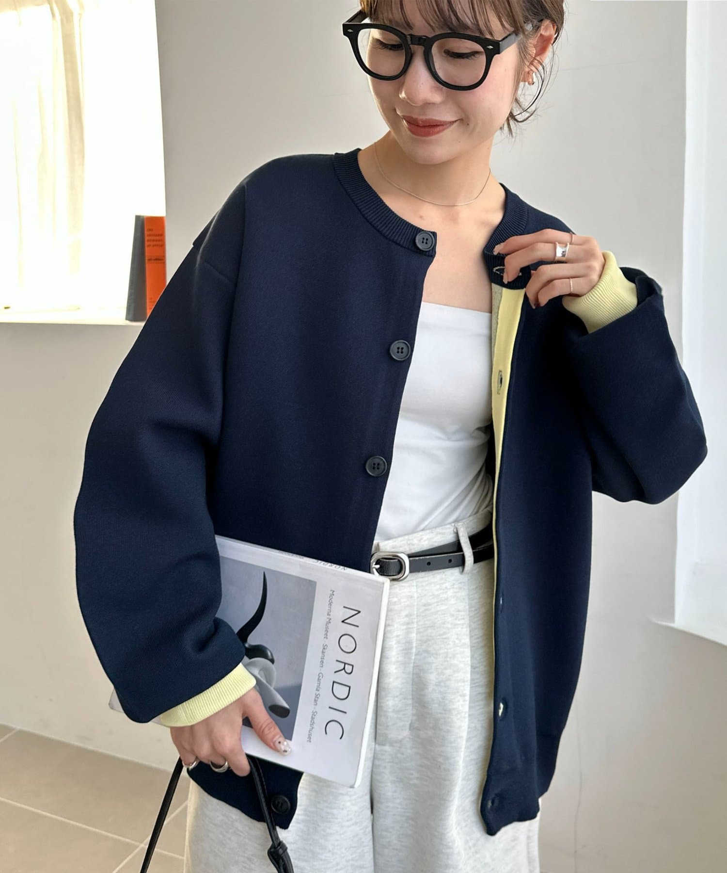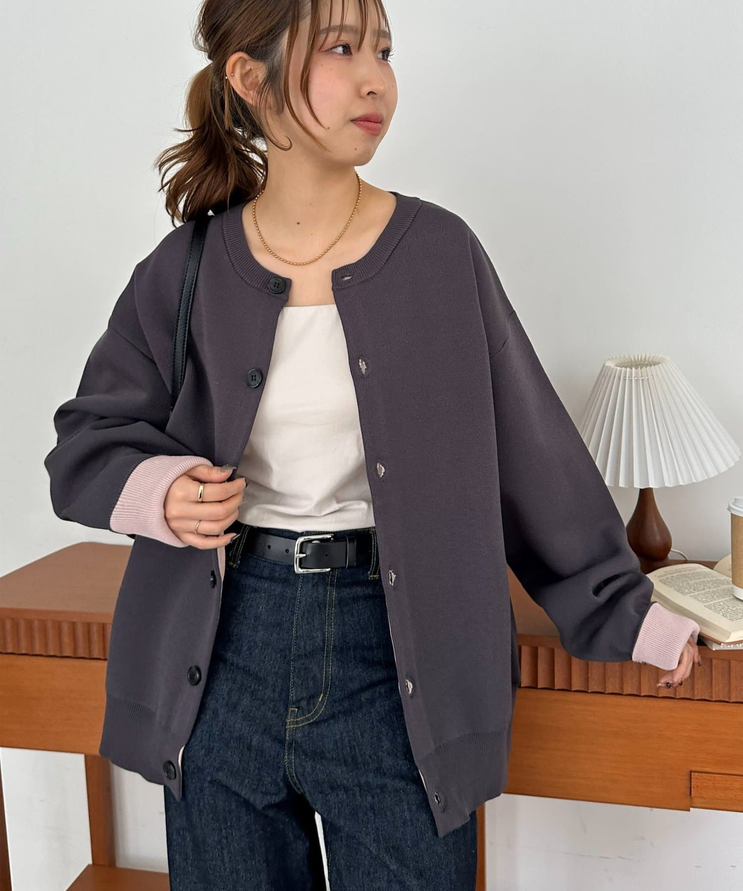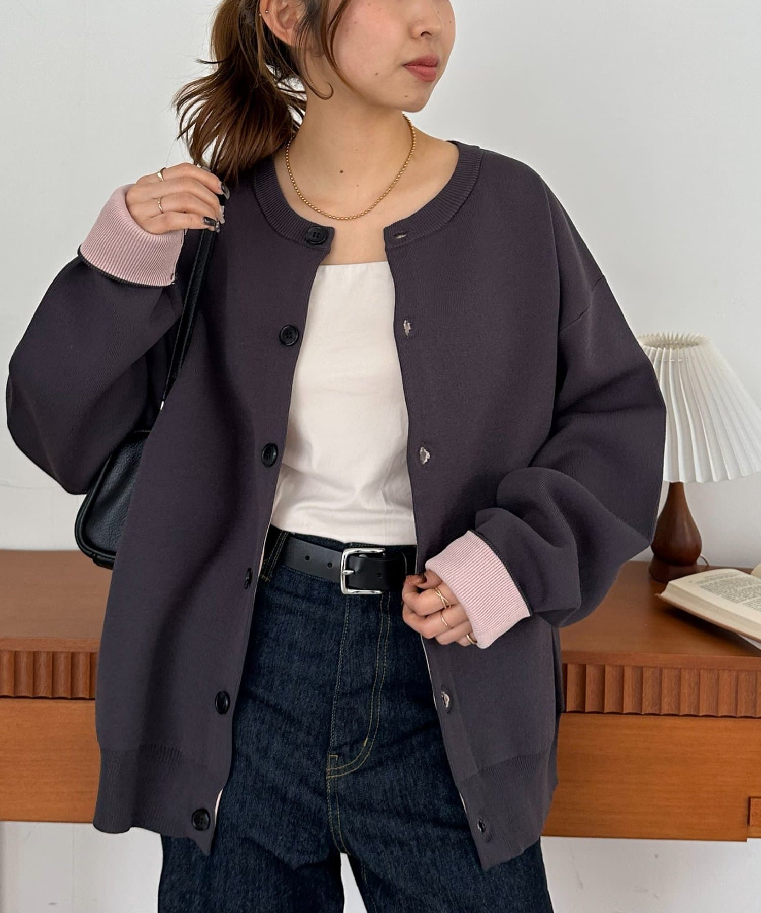 【ユニセックス】スウェットライク配色クルーカーディガン