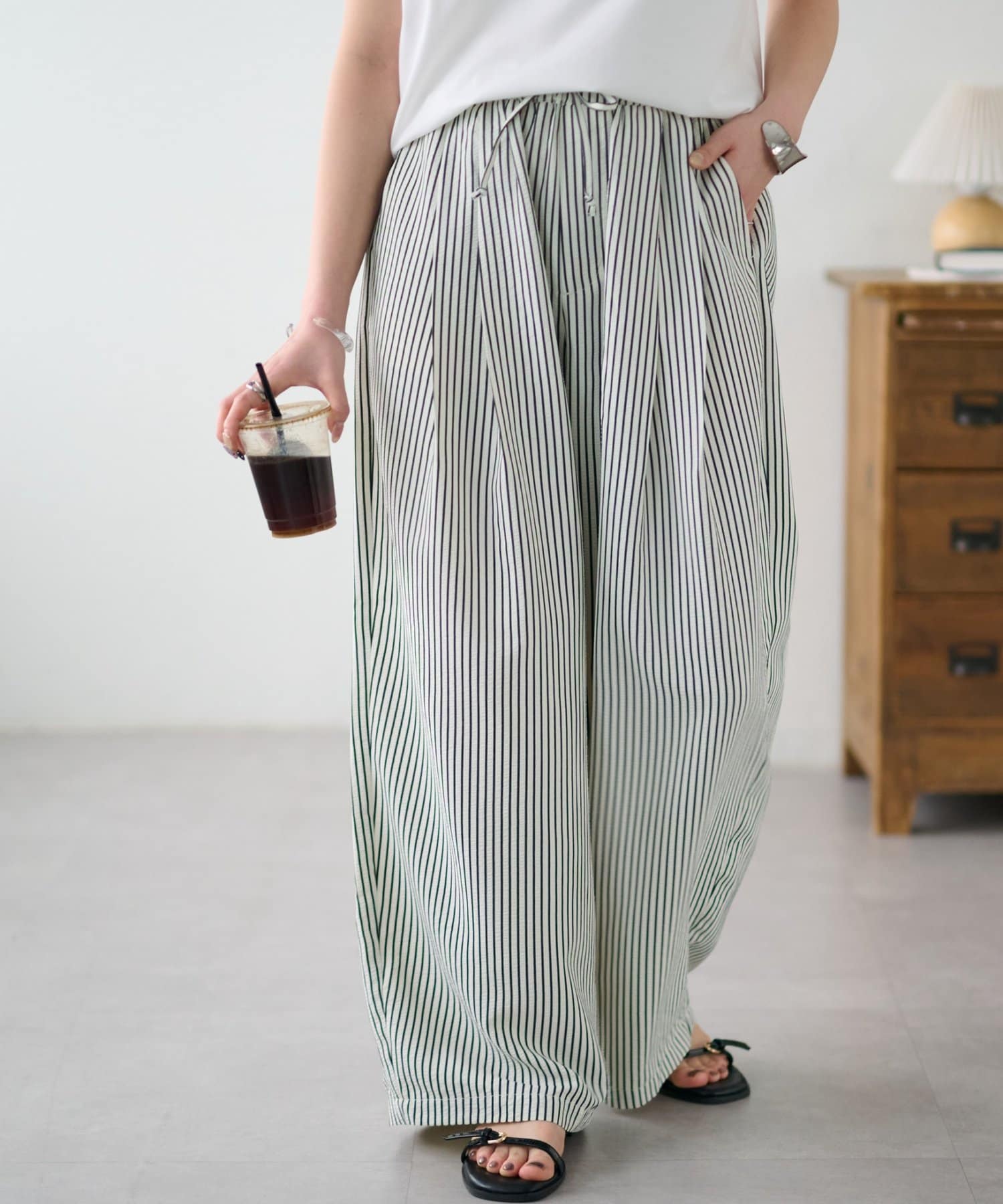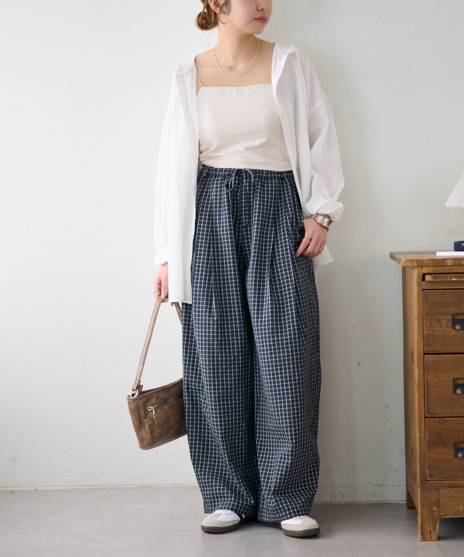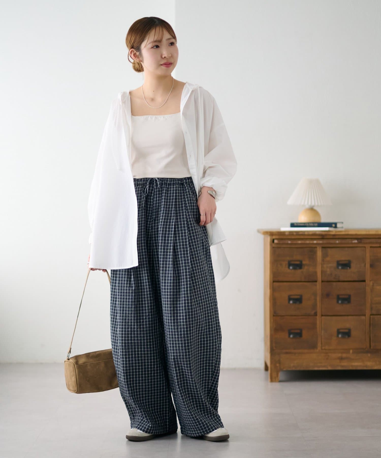 155cmレディーススタッフ:ウエストは紐でしっかり絞れるので、小柄な方でも安心して着用いただけます。裏地付きのため、安心感のある穿き心地です!軽くて動きやすく、デイリーからお出かけまで幅広く使えそうです♪