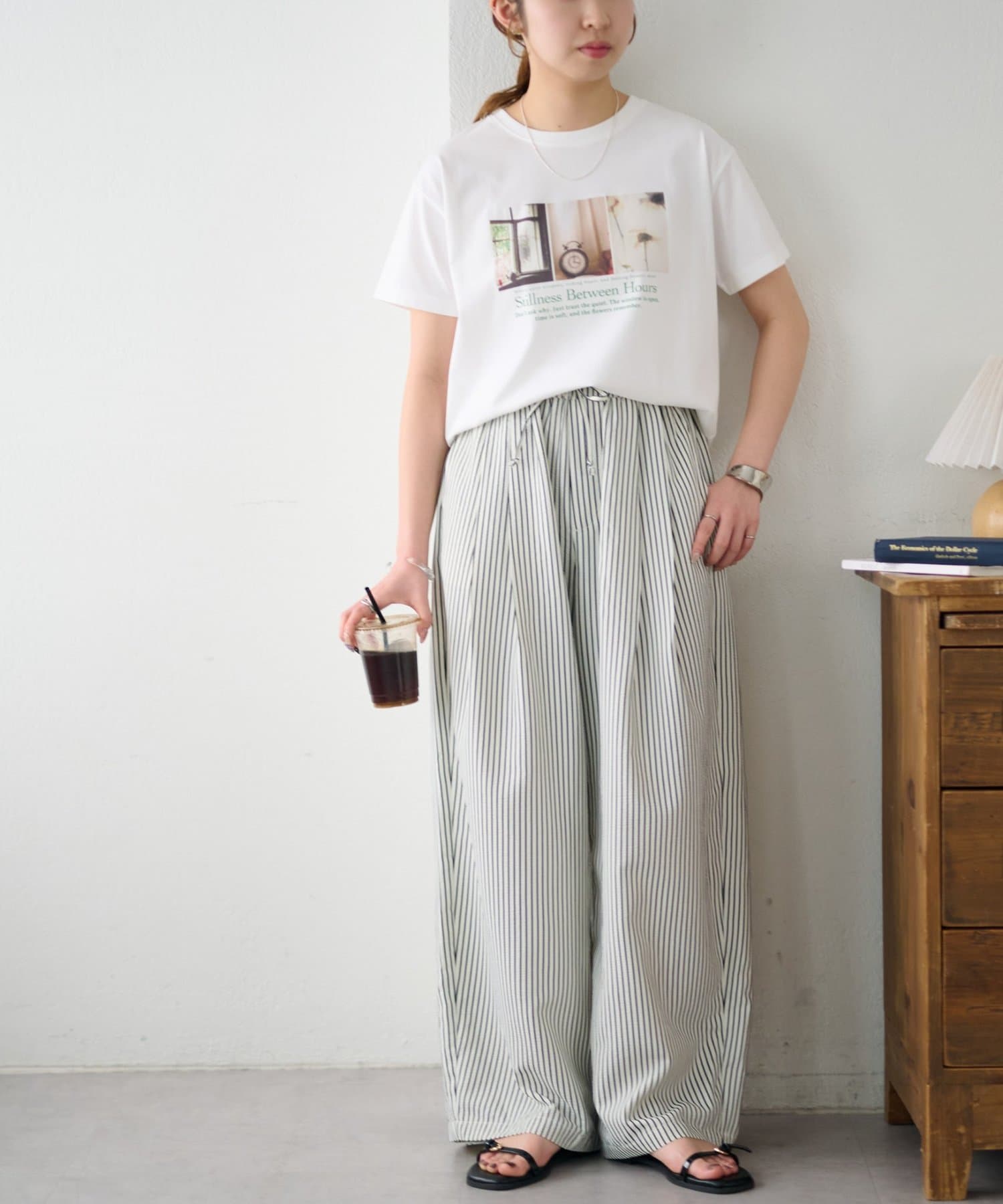 ・シンプルなTシャツやカットソーを合わせ、パンツの柄を主役にしたカジュアルな着こなし。