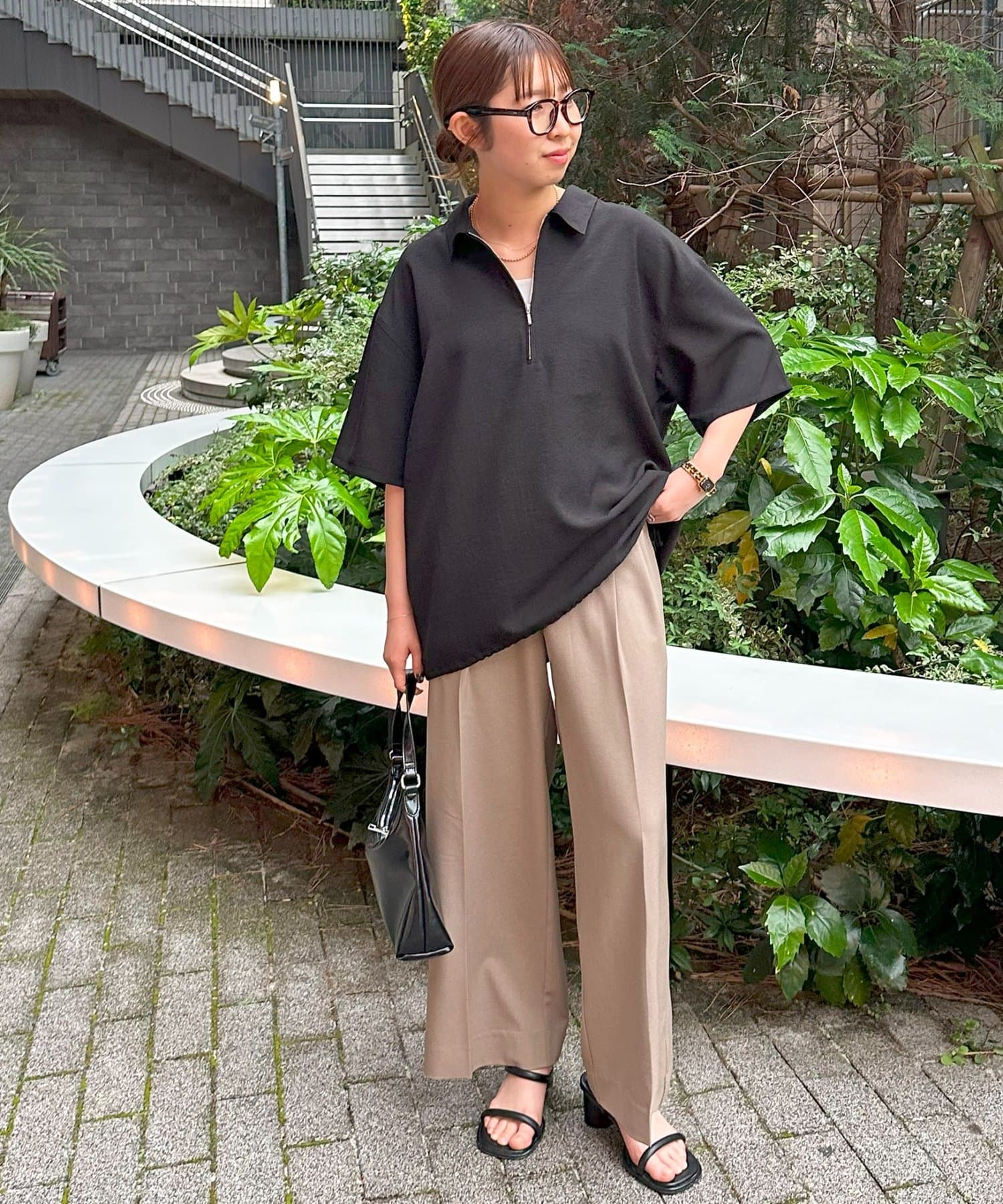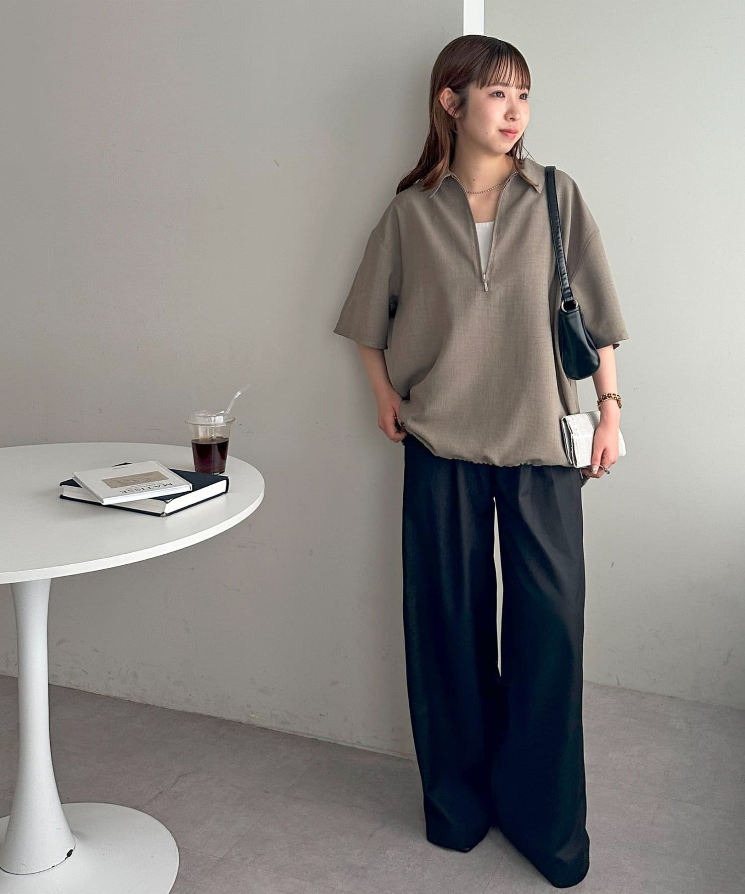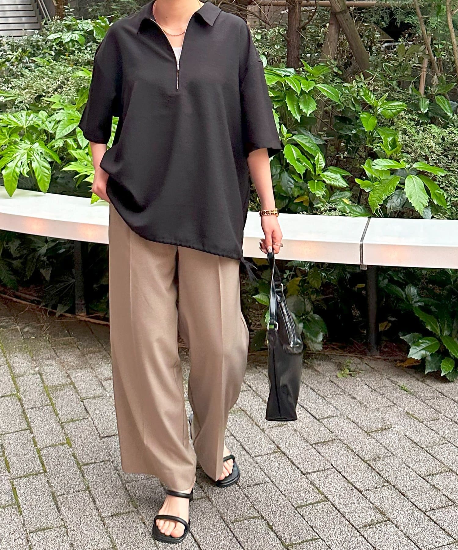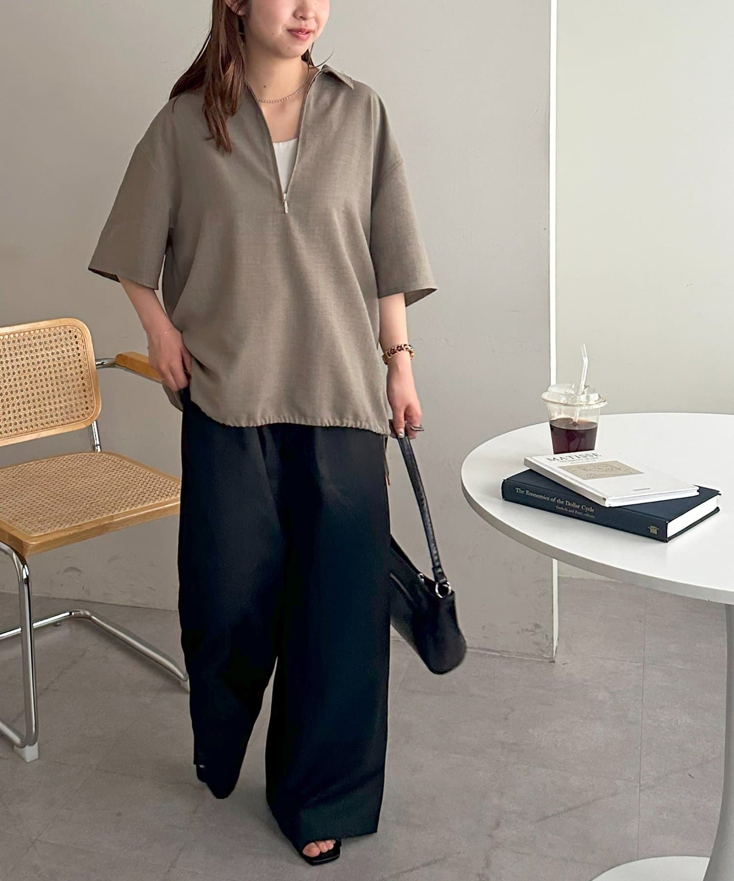 程よいハリ感があり、カジュアルになりすぎず、きちんと感を演出してくれます。シンプルなデザインながら、ハーフジップ仕様がさりげないアクセントに。春夏にぴったりの軽やかな着心地で、暑い日も快適に過ごせます。裾に紐が施されており、絞り具合でシルエットを変えることもできます!