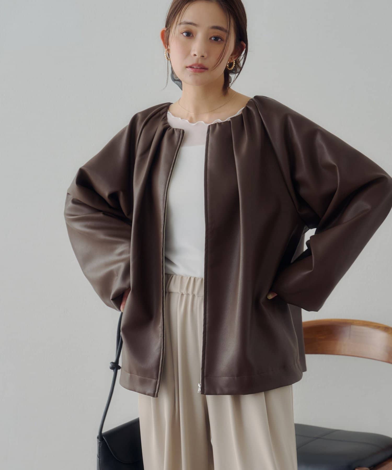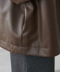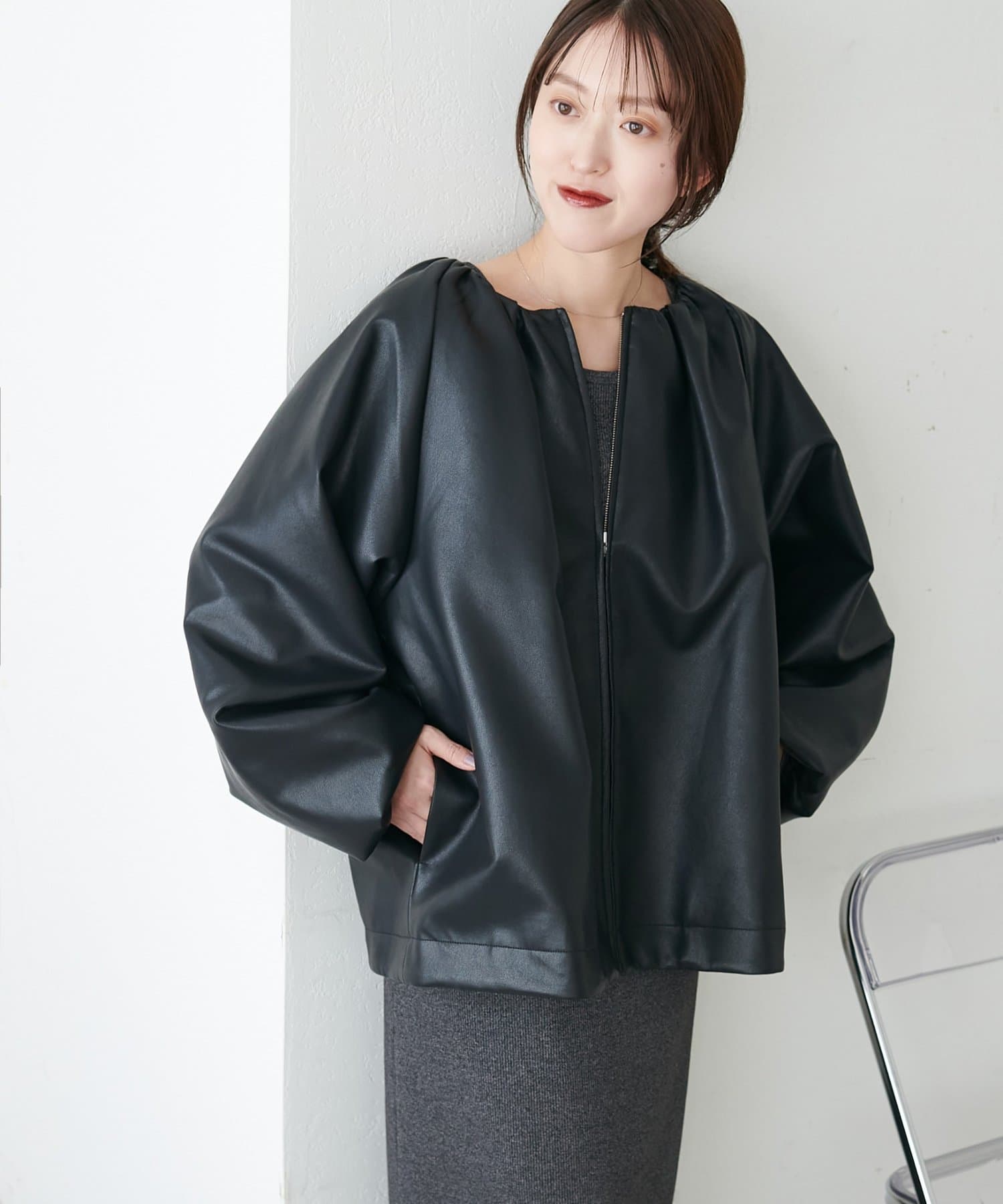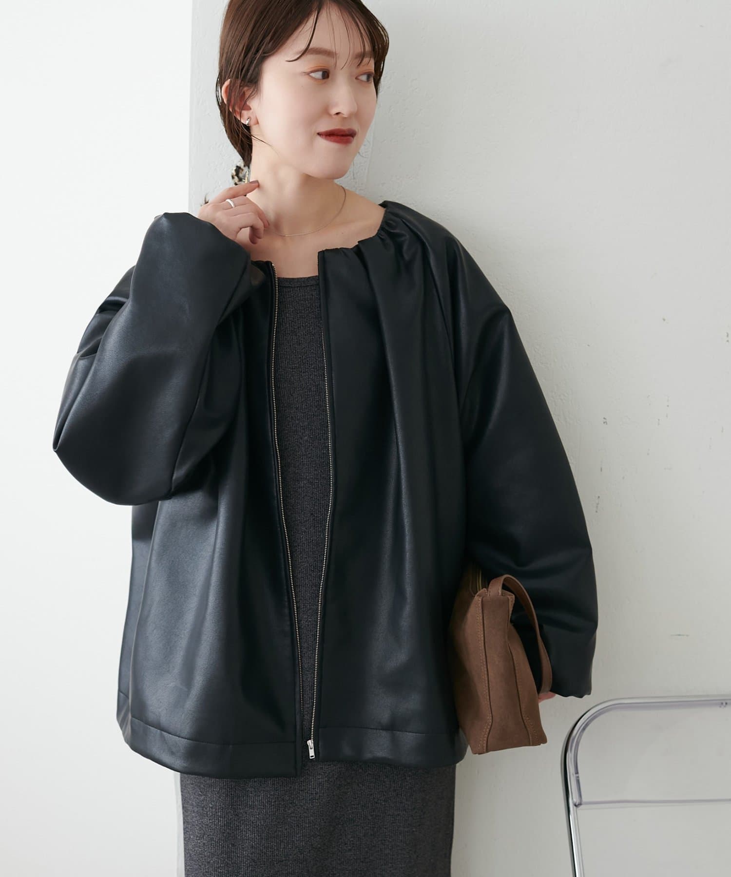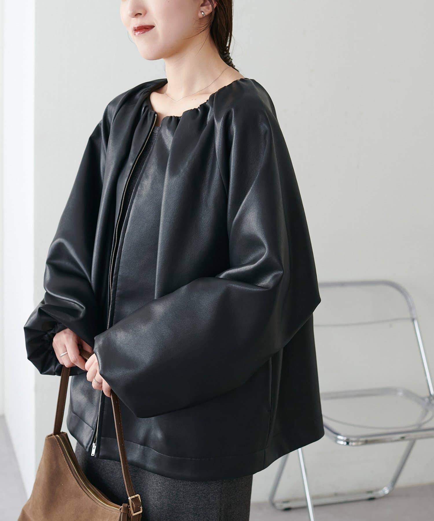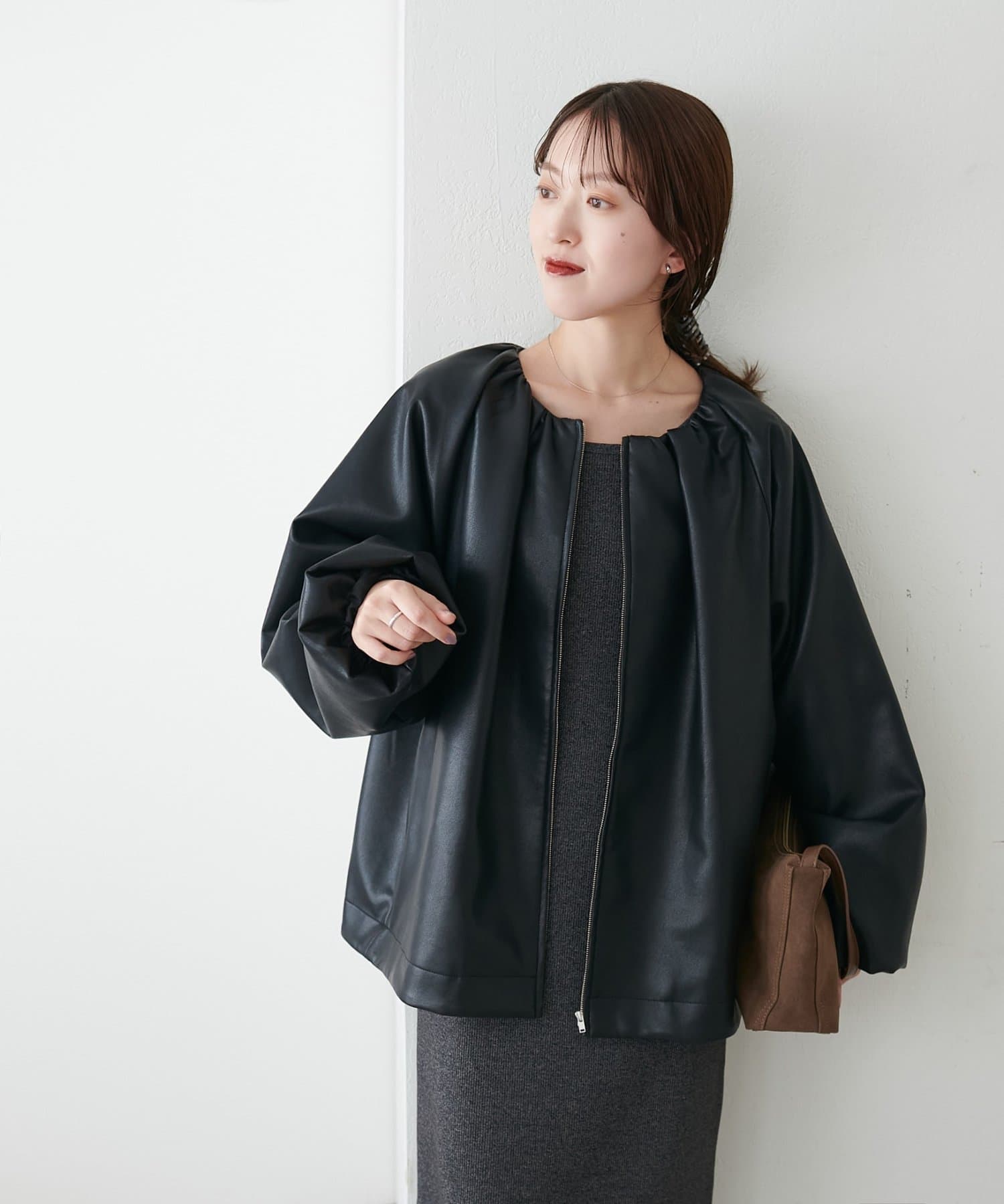 【Noka】ノーカラーギャザーレザーブルゾン
