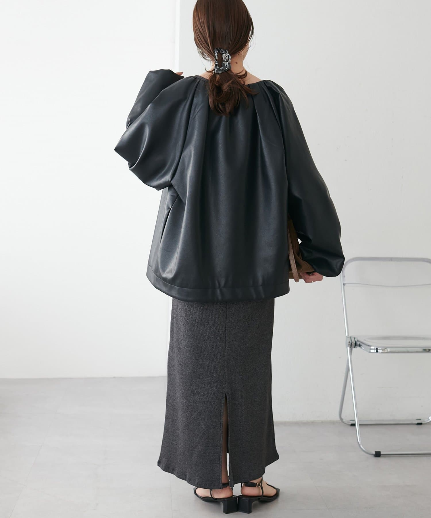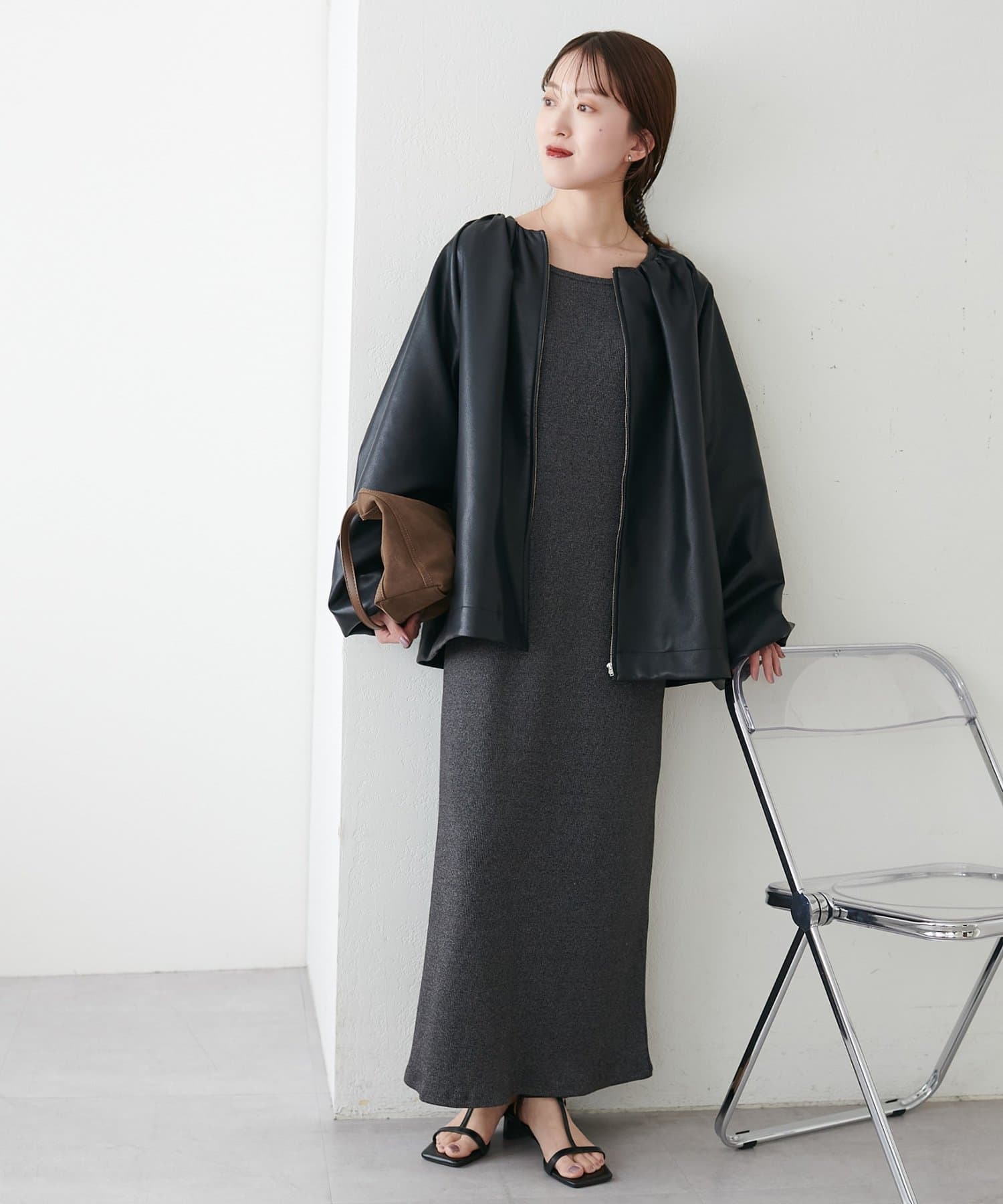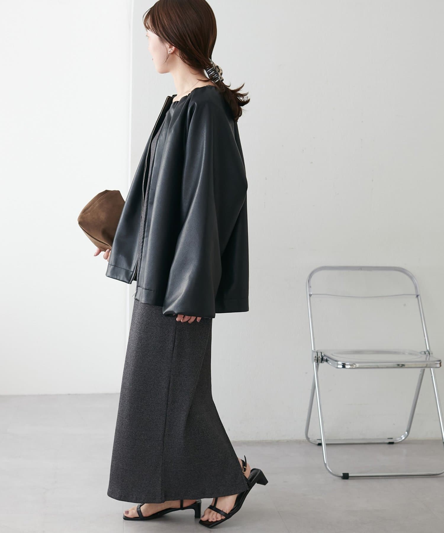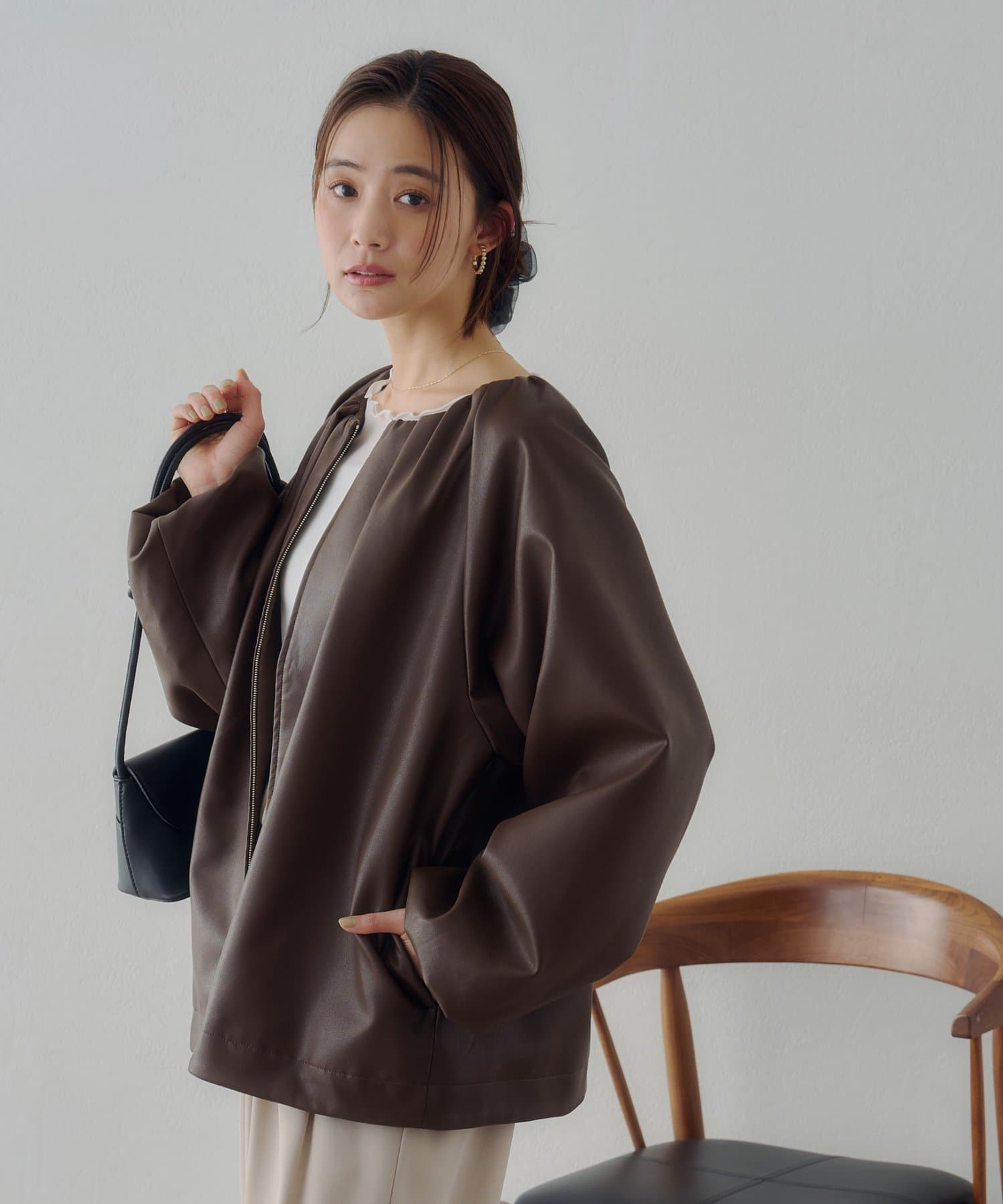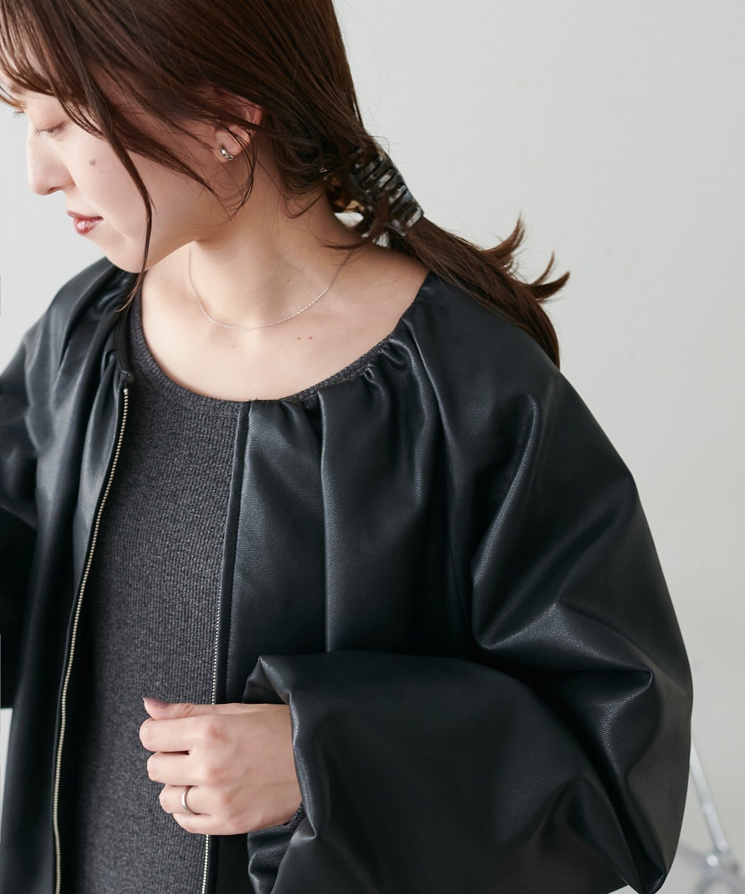 【Noka】ノーカラーギャザーレザーブルゾン