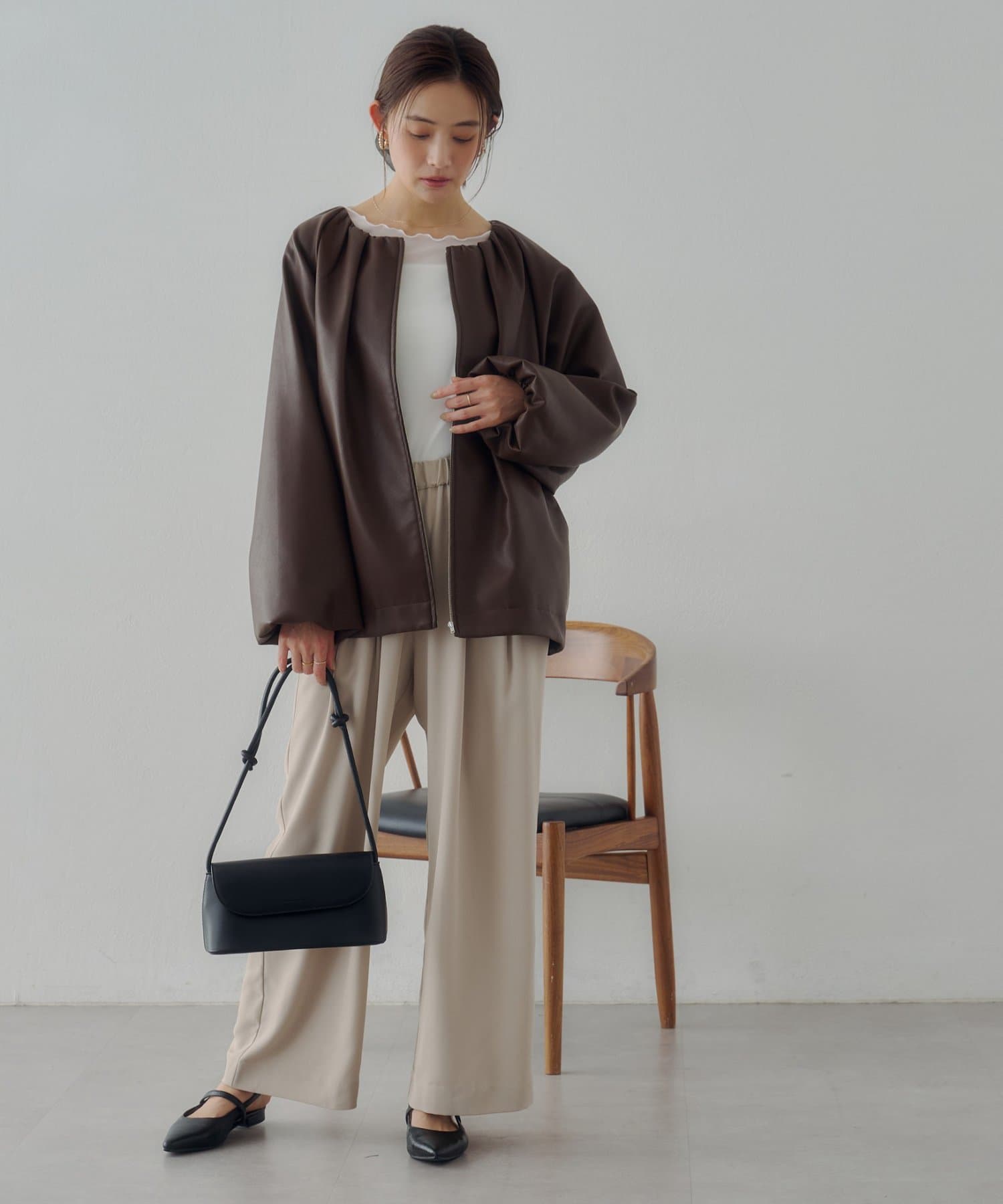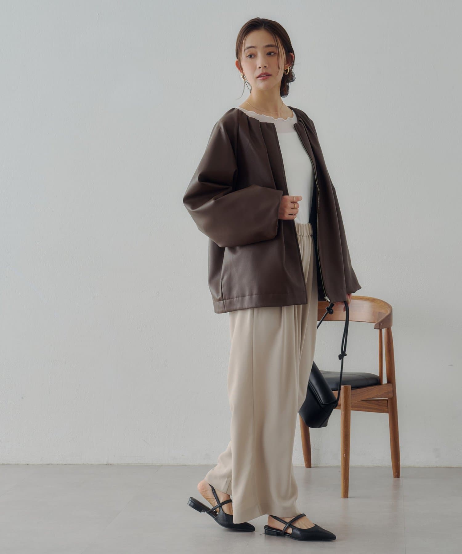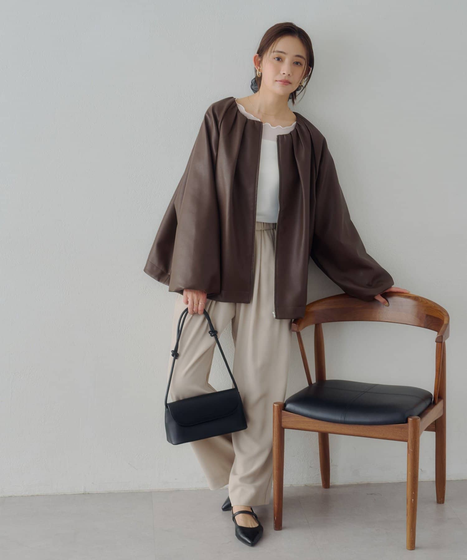・ノーカラーにしたことで、顔回りはすっきり見えが叶います。