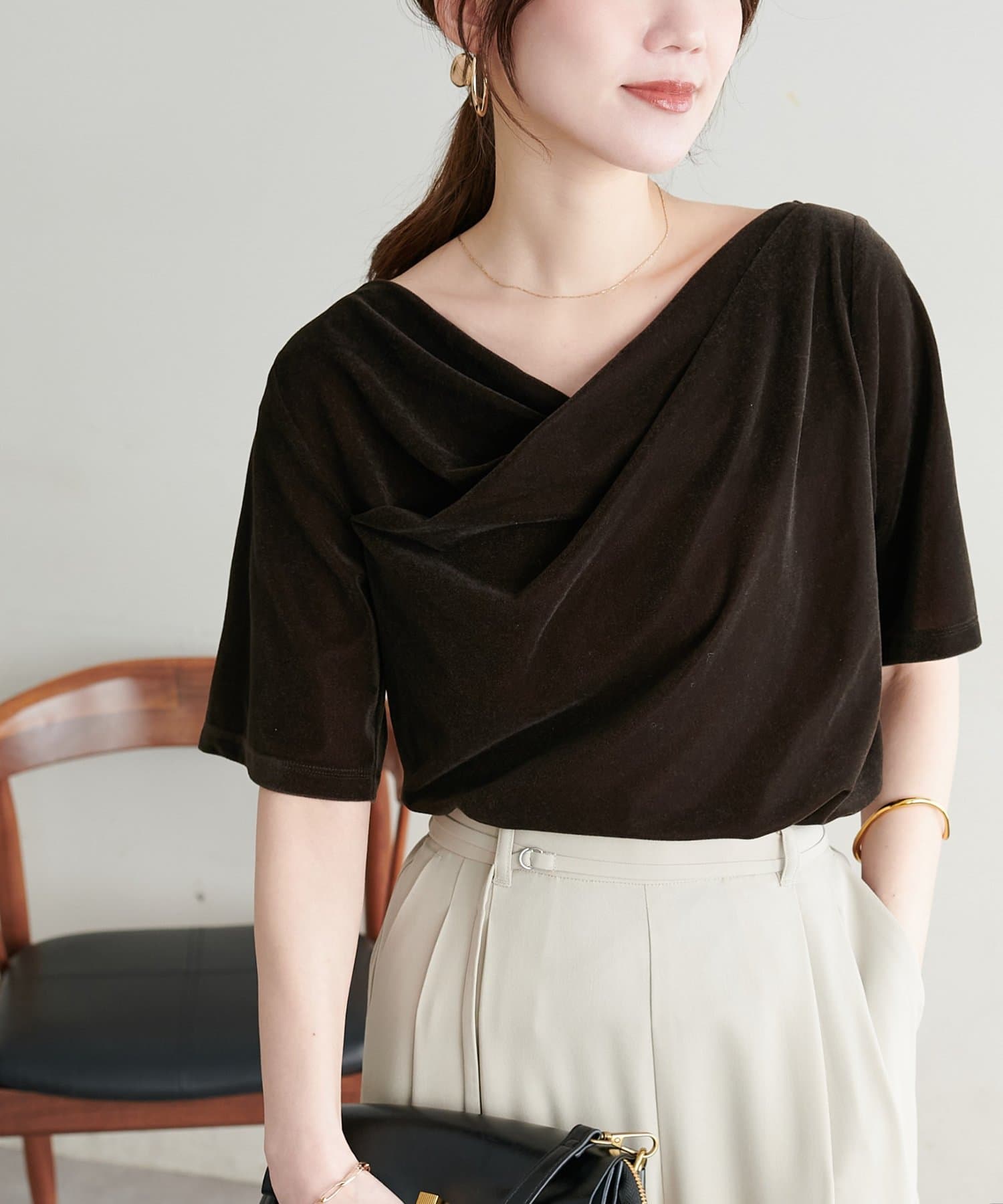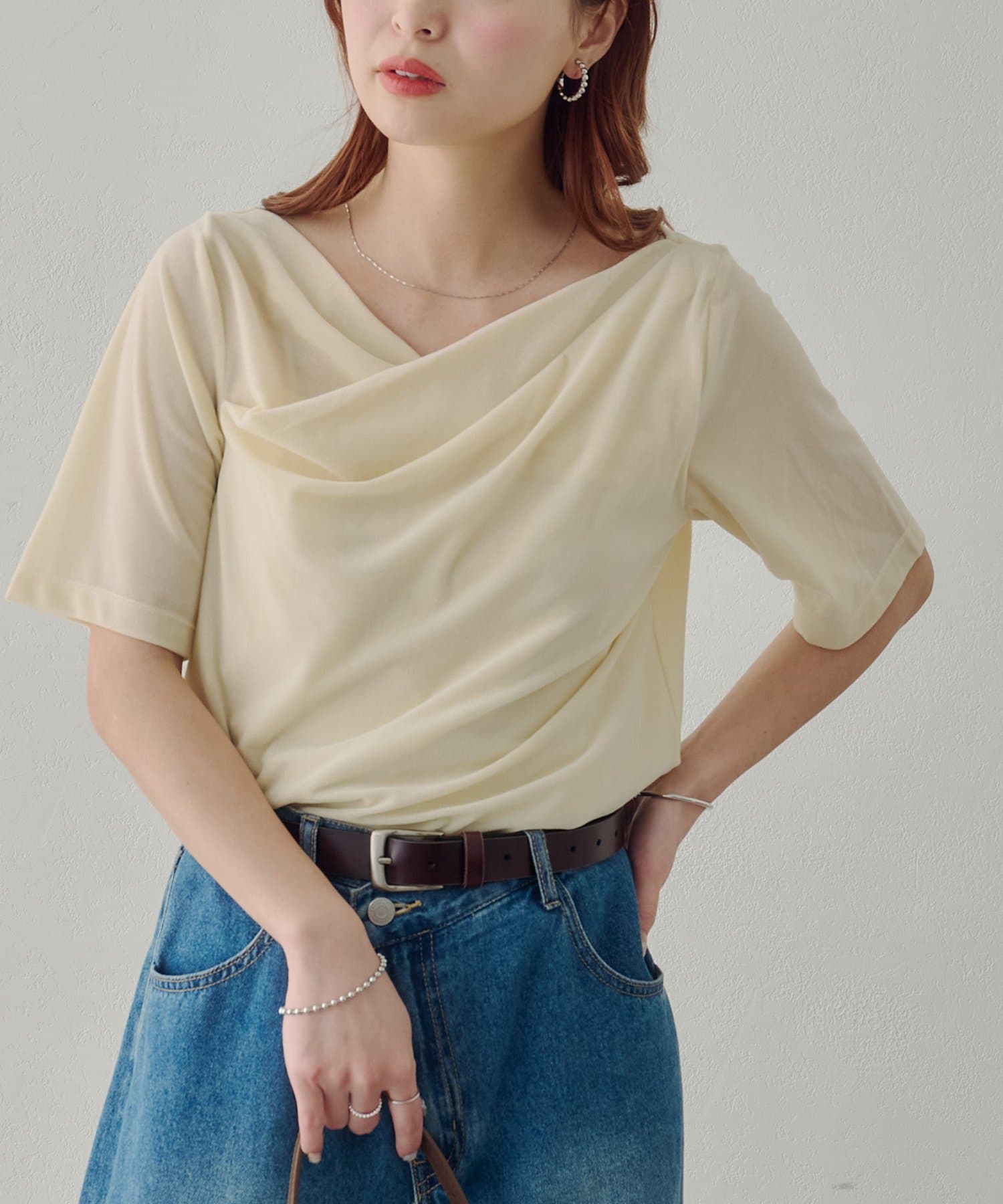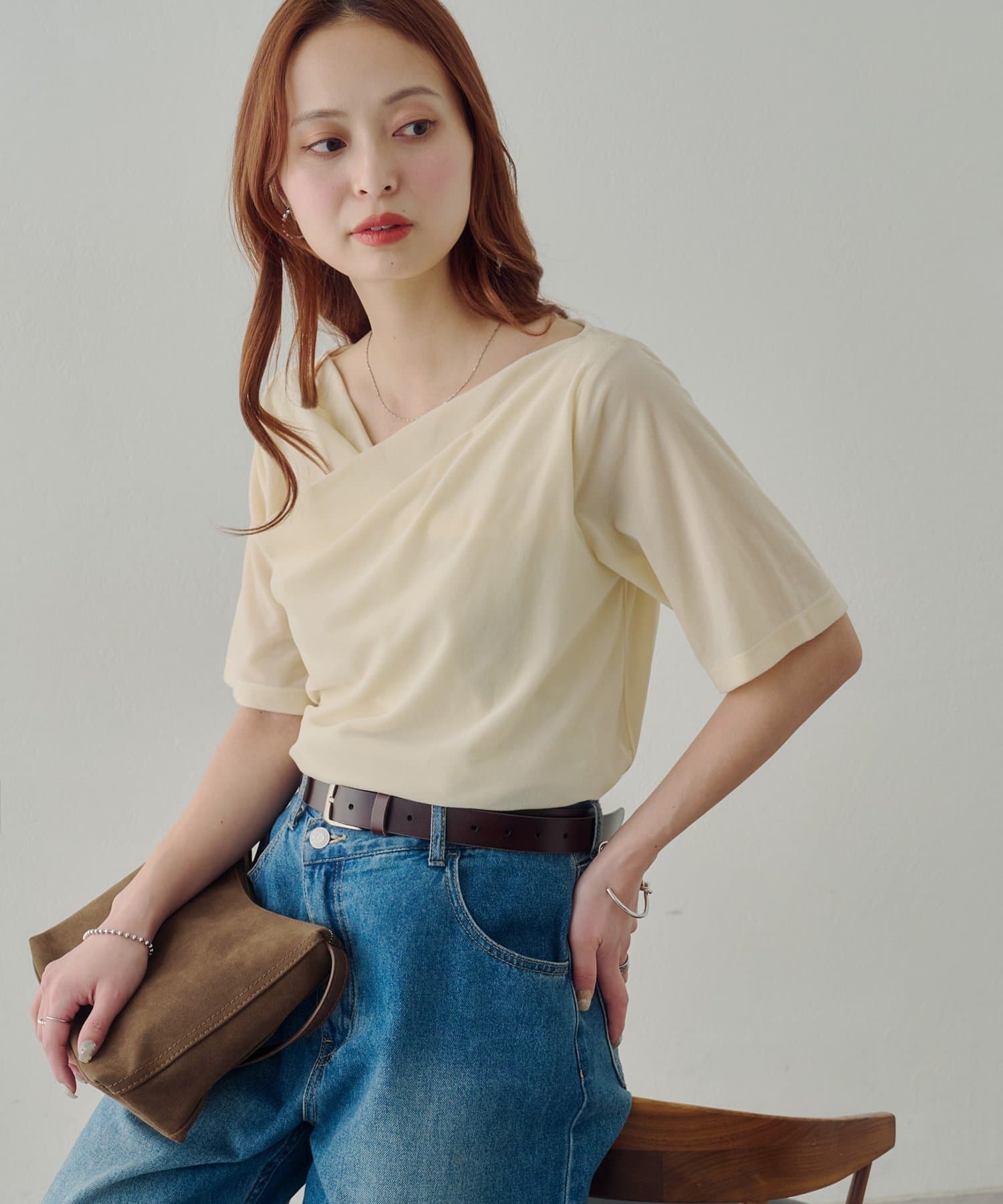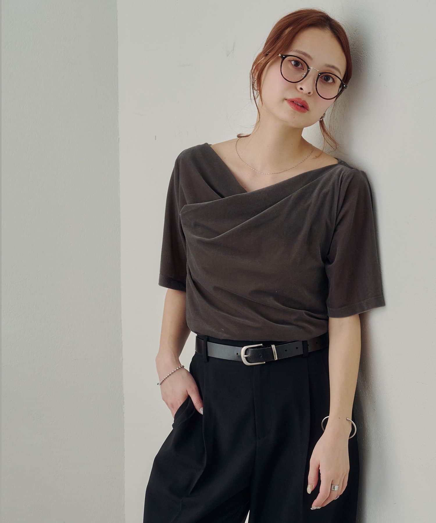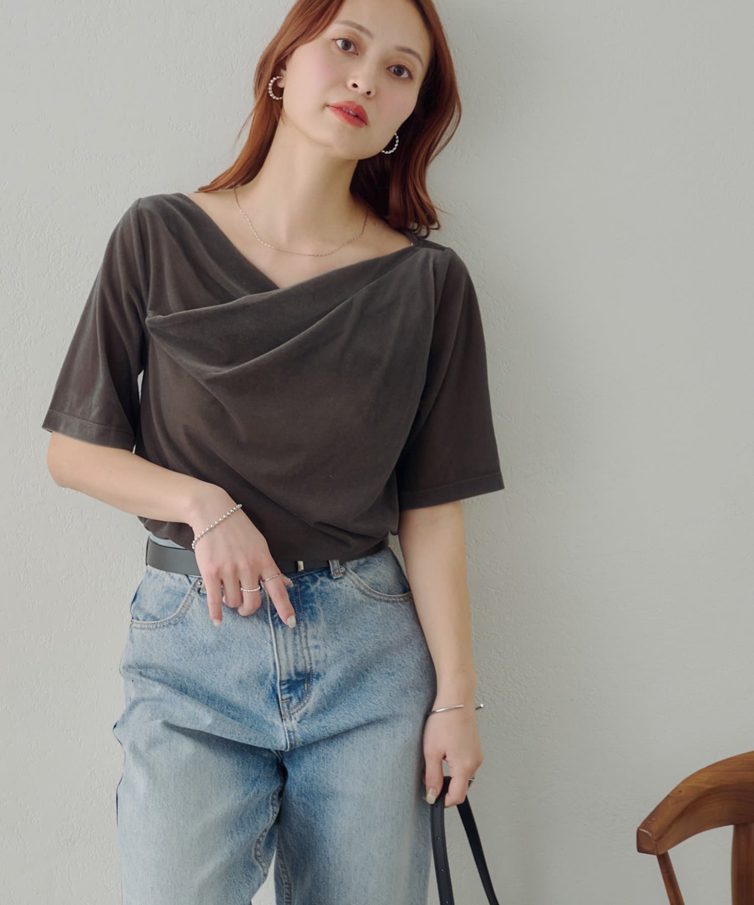 ・デコルテを美しく見せるアシンメトリーなドレープネック