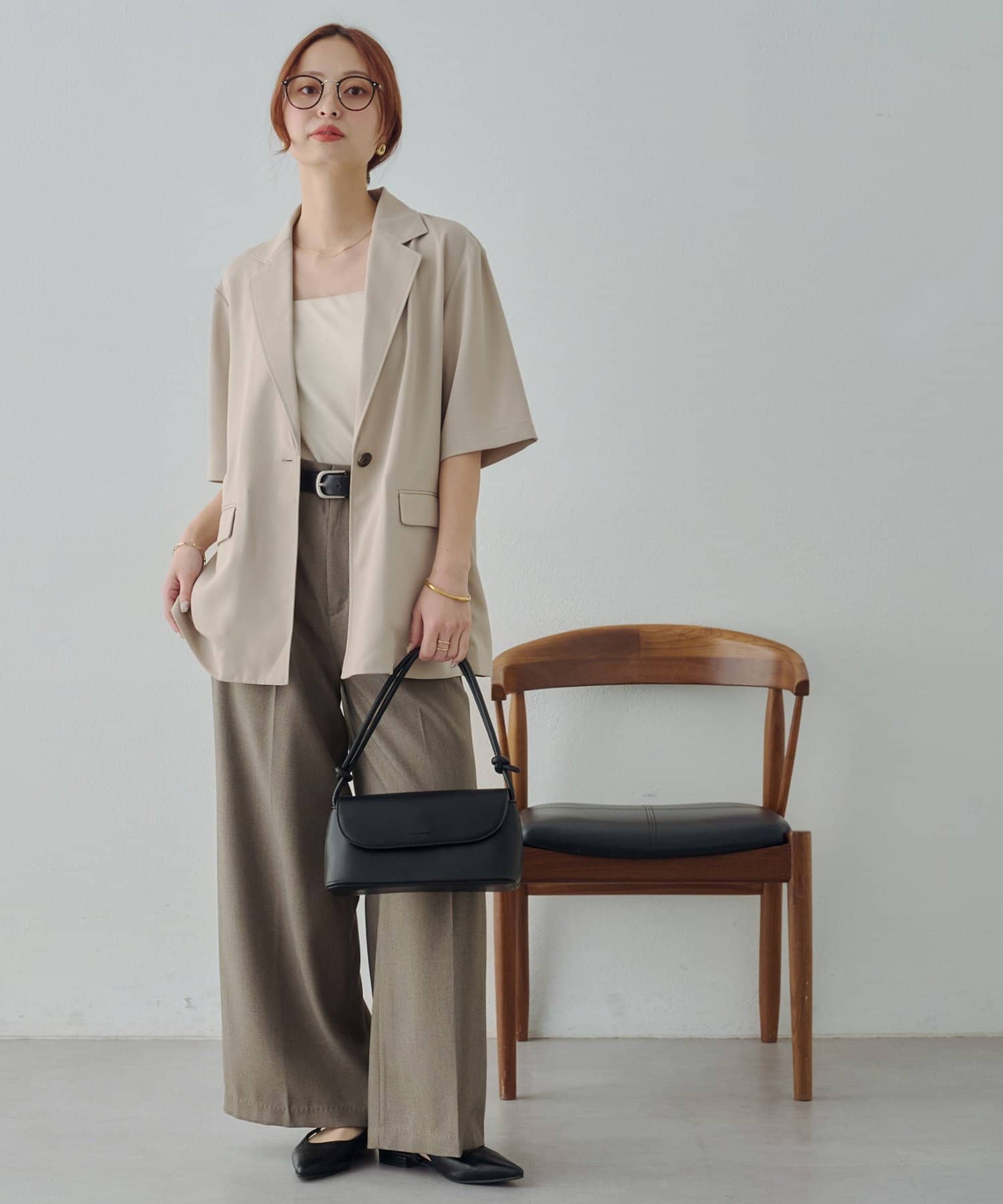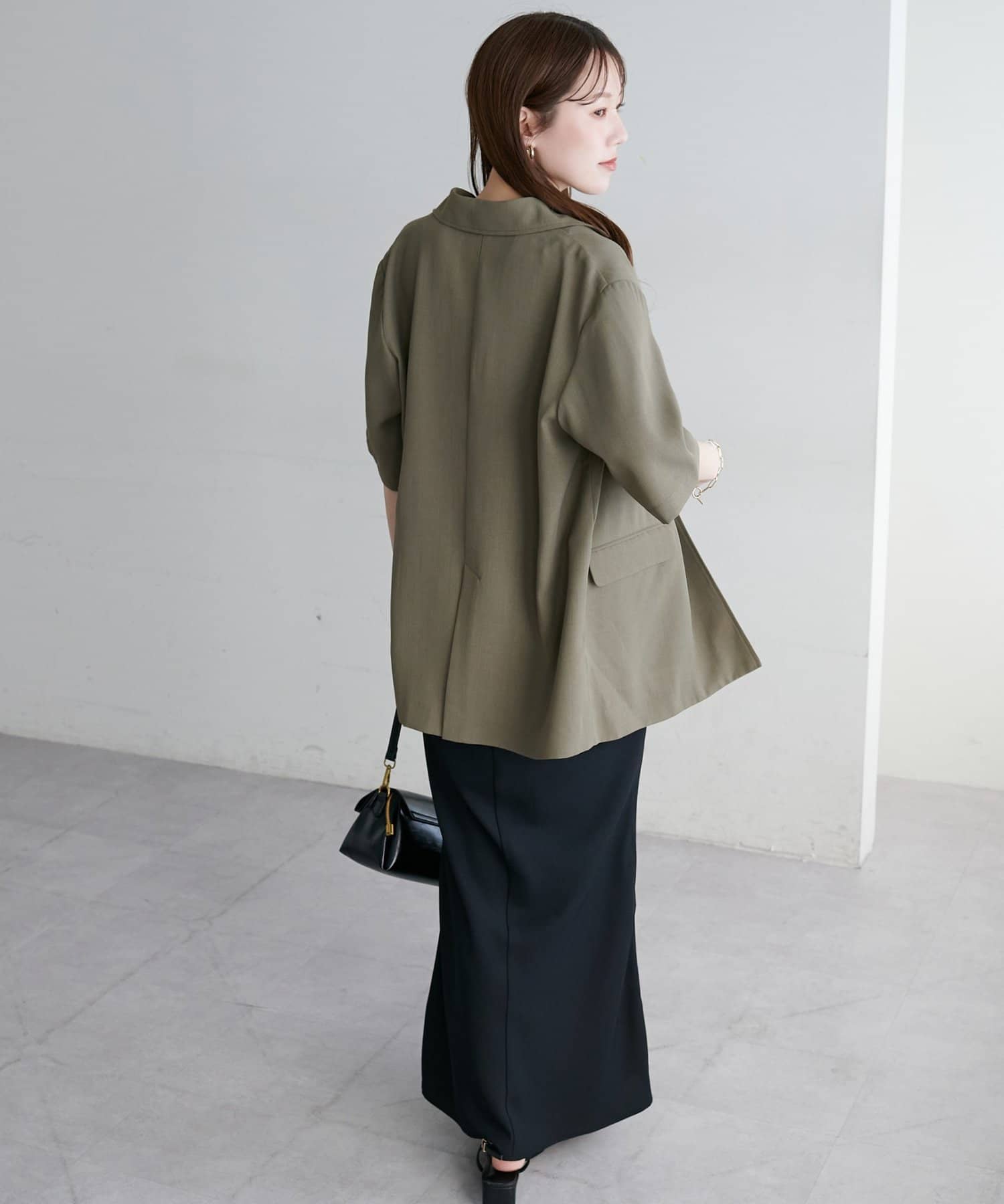 155cmスタッフ:裏地もなく、軽量なのでFサイズの1サイズ展開ですが着られている感なく合わせることができます◎生地もしわになりにくい生地なので、オンオフ問わずどちらでも合わせやすいです!