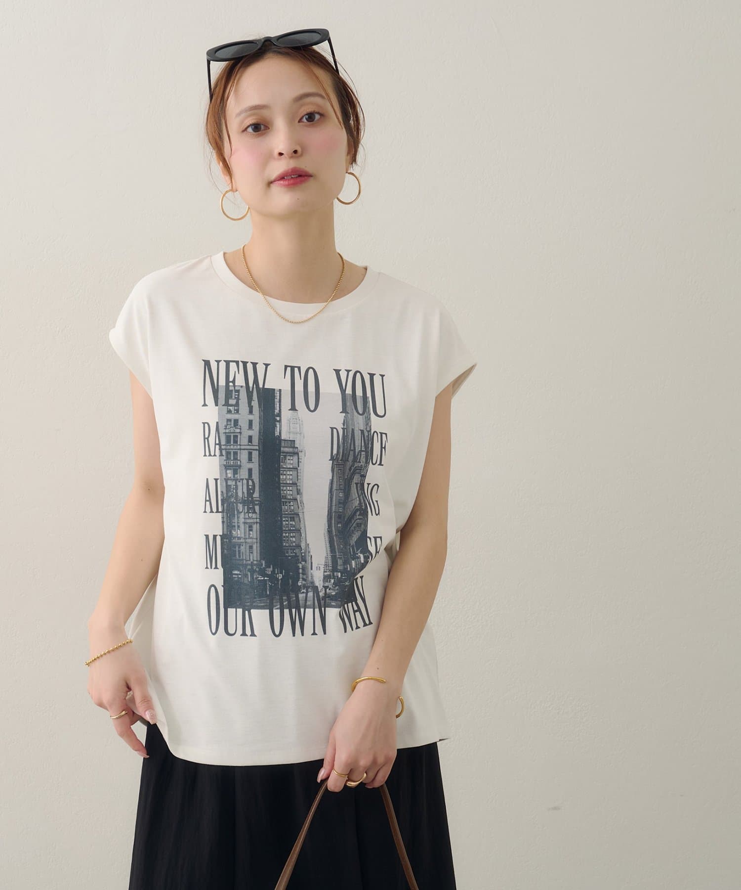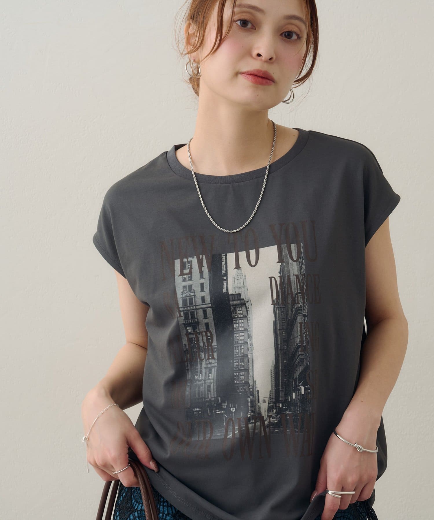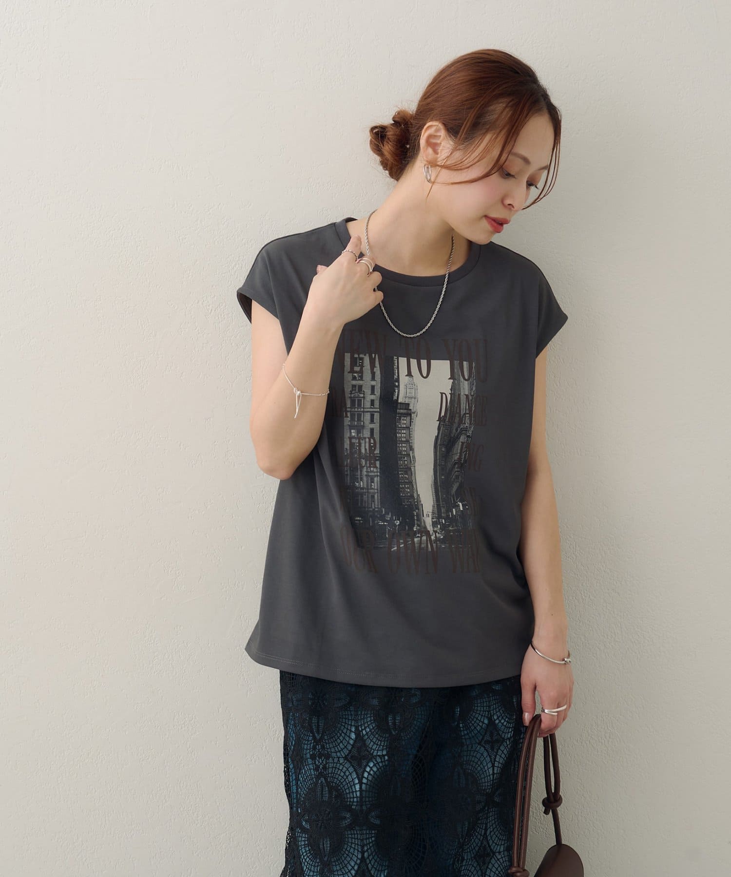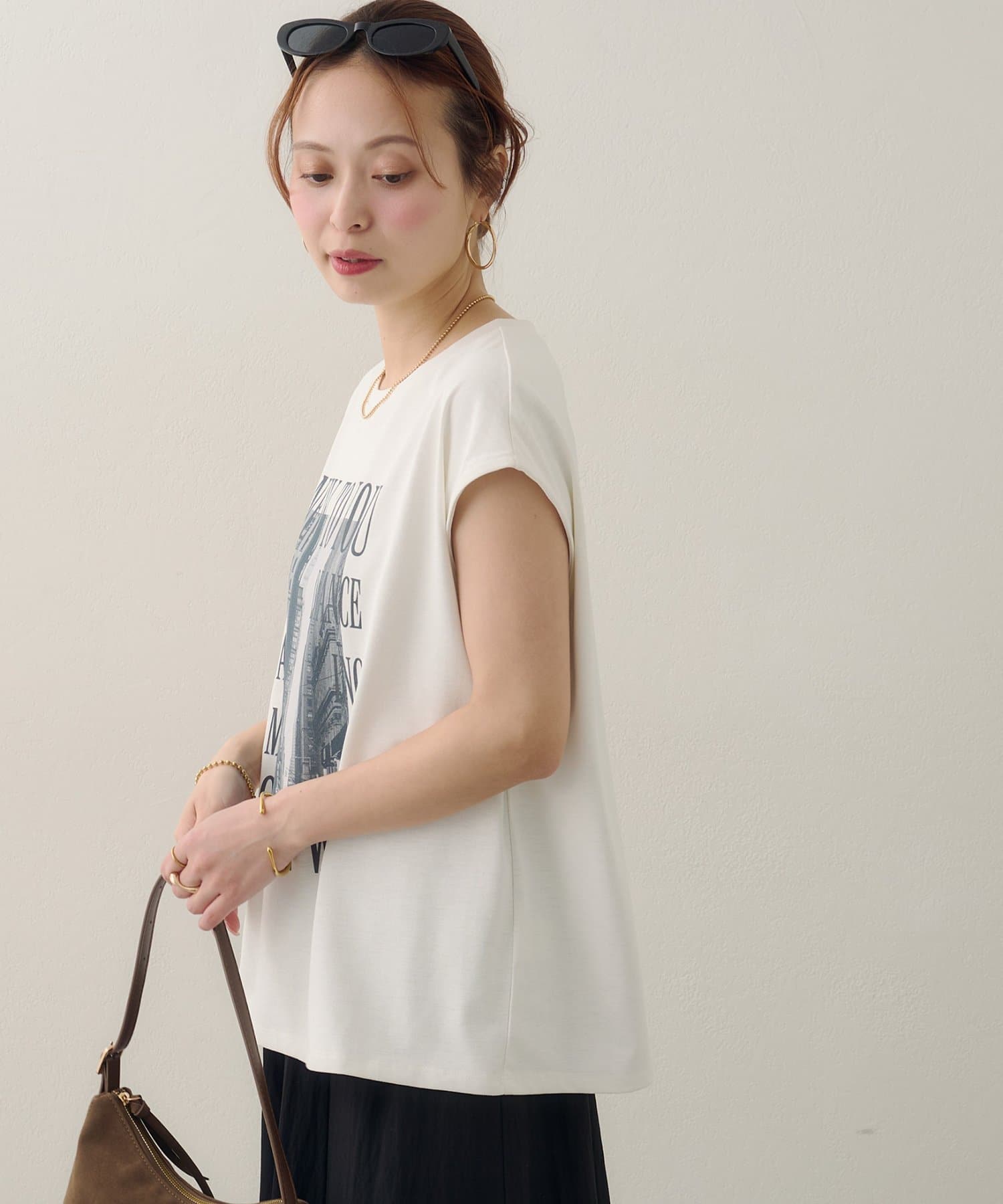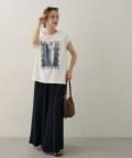 157cmスタッフ:ちょうどよい丈感で、パンツにもスカートにも合わせやすい万能な一枚です。ニュアンスのあるモノトーンのフォトプリントがお洒落で、
