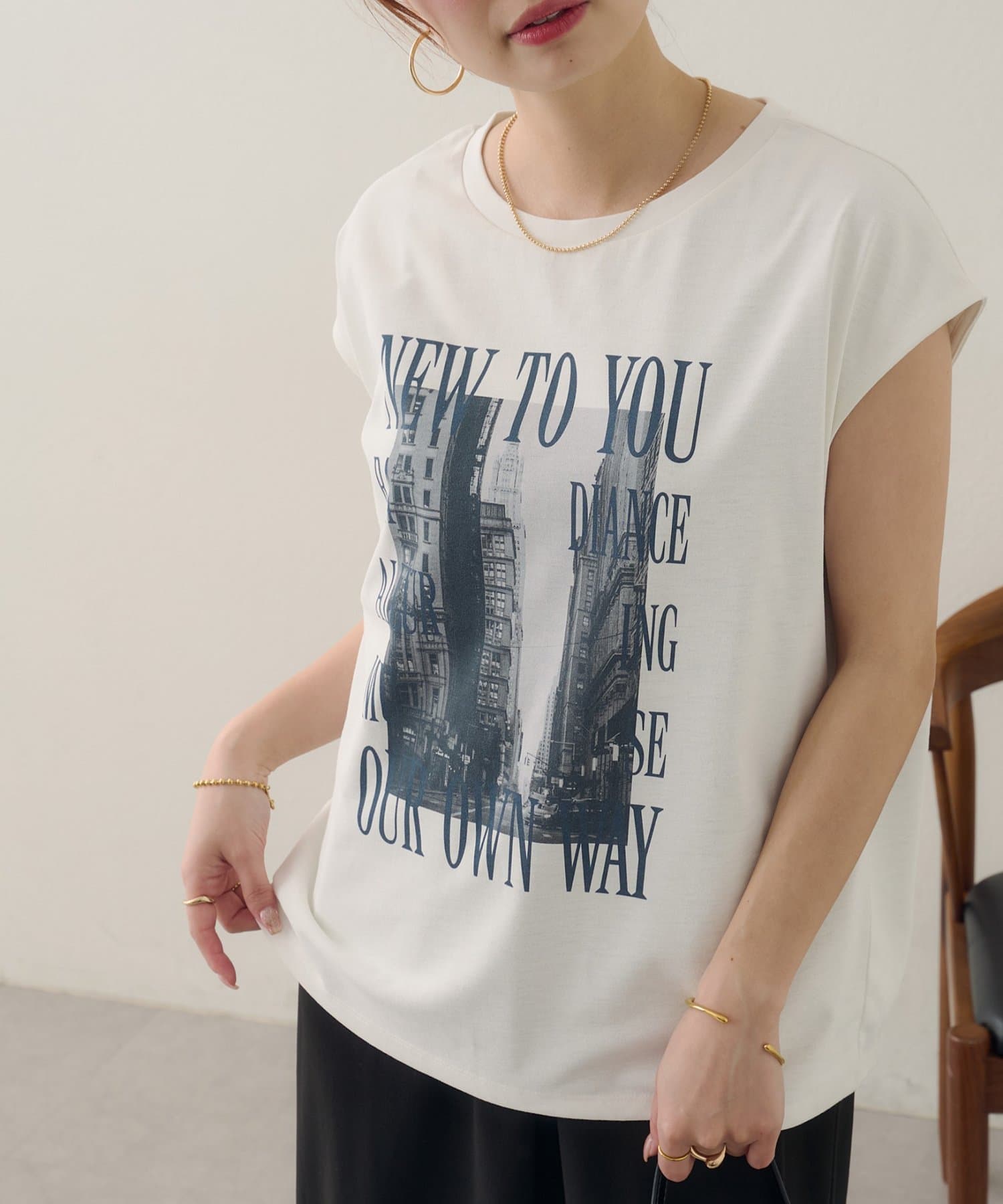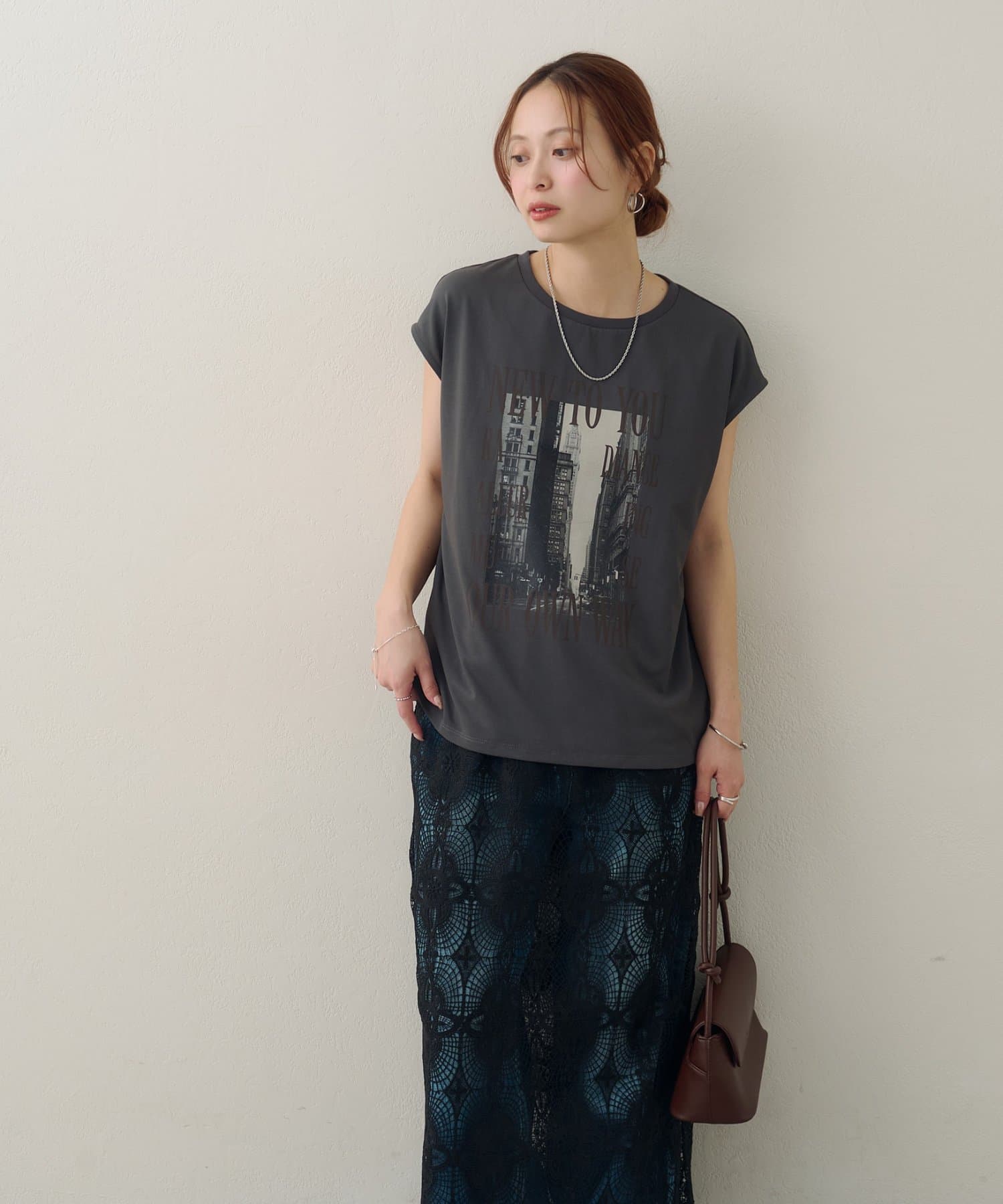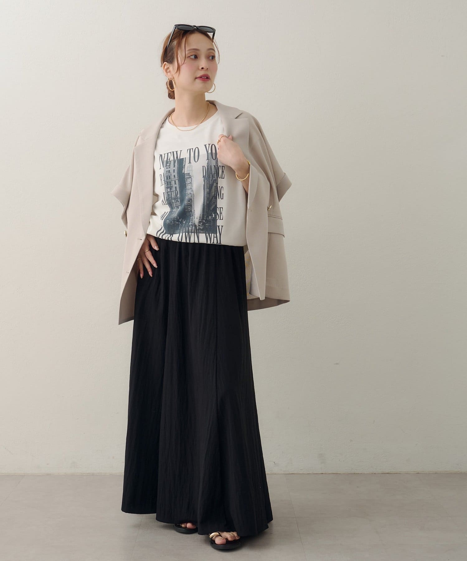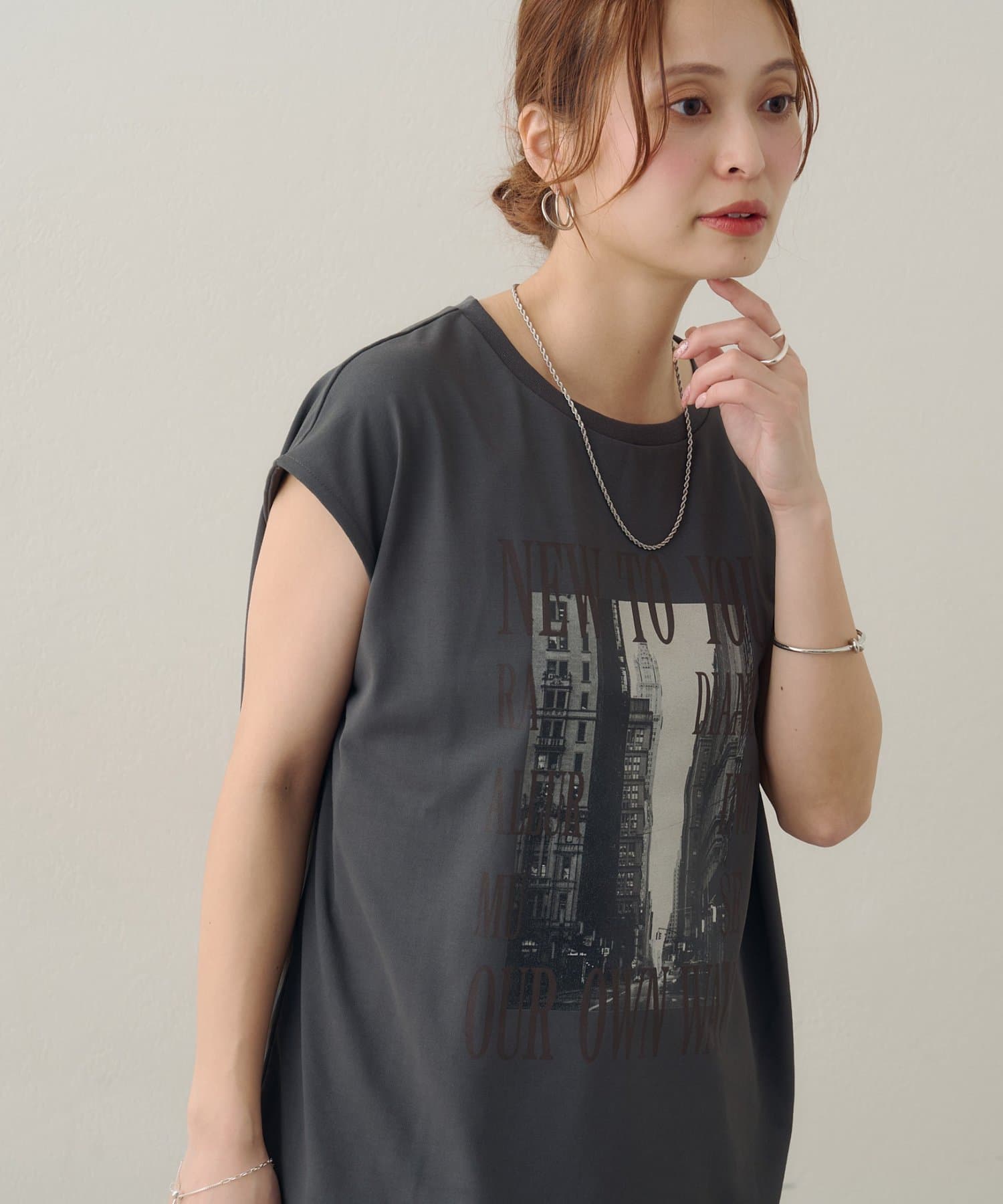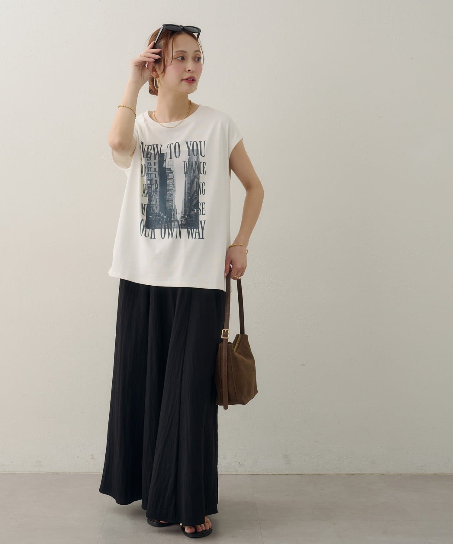 157cmスタッフ:ちょうどよい丈感で、パンツにもスカートにも合わせやすい万能な一枚です。ニュアンスのあるモノトーンのフォトプリントがお洒落で、