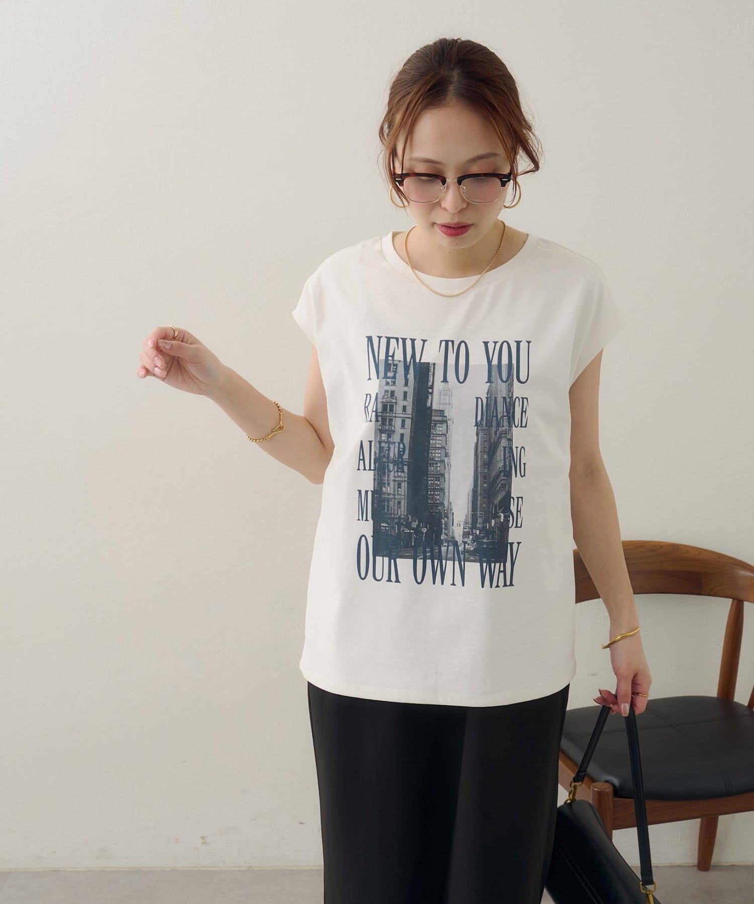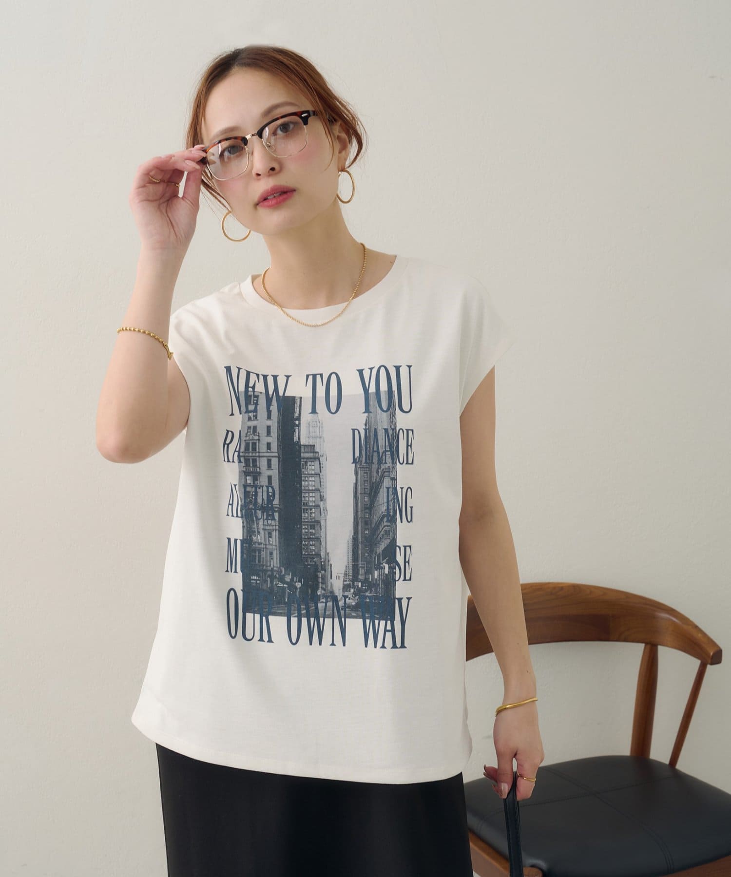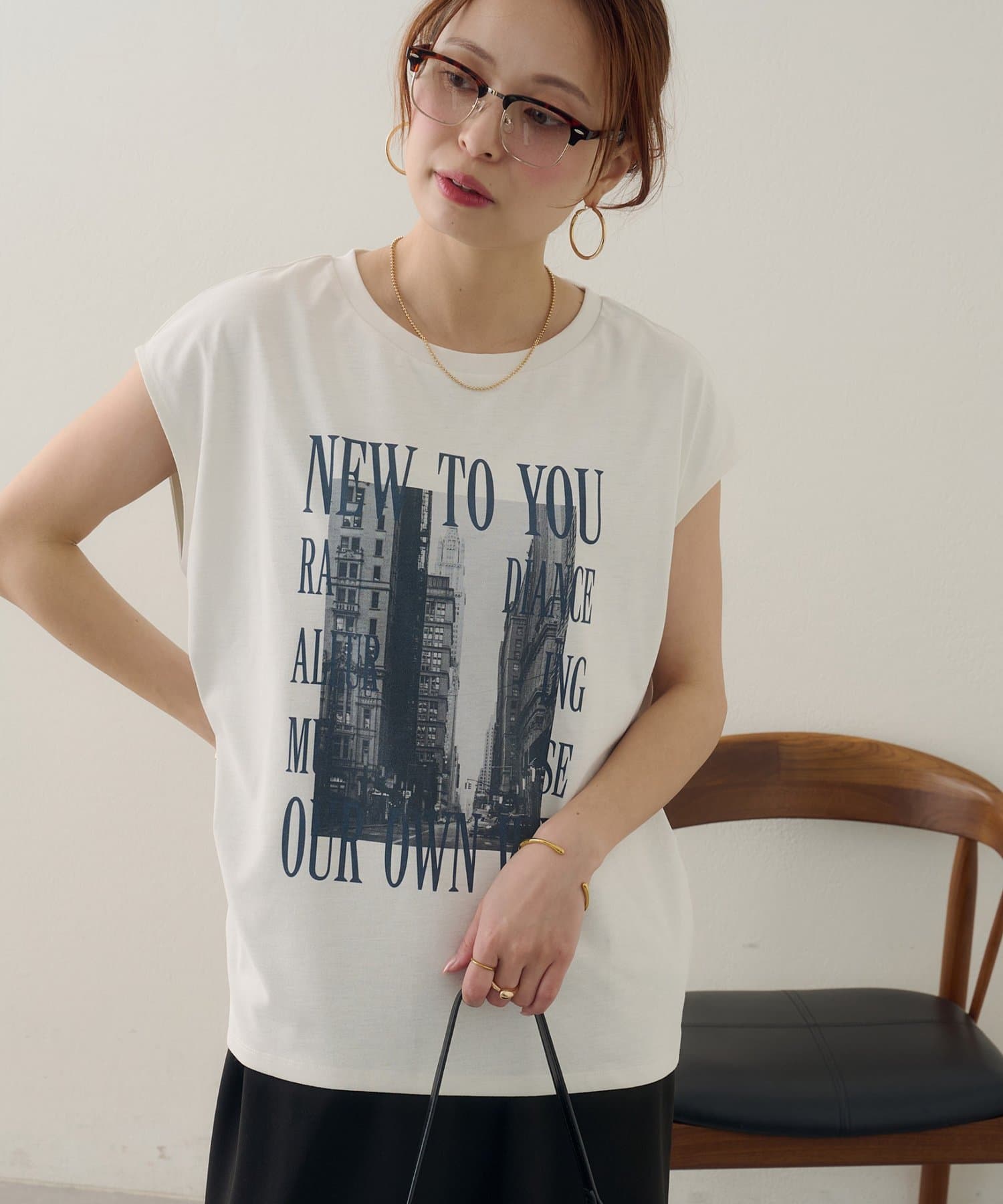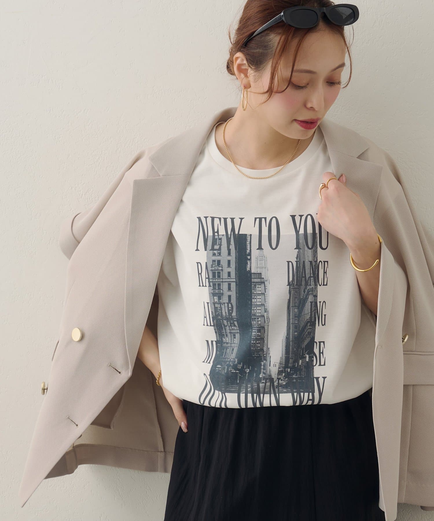 157cmスタッフ:ちょうどよい丈感で、パンツにもスカートにも合わせやすい万能な一枚です。ニュアンスのあるモノトーンのフォトプリントがお洒落で、