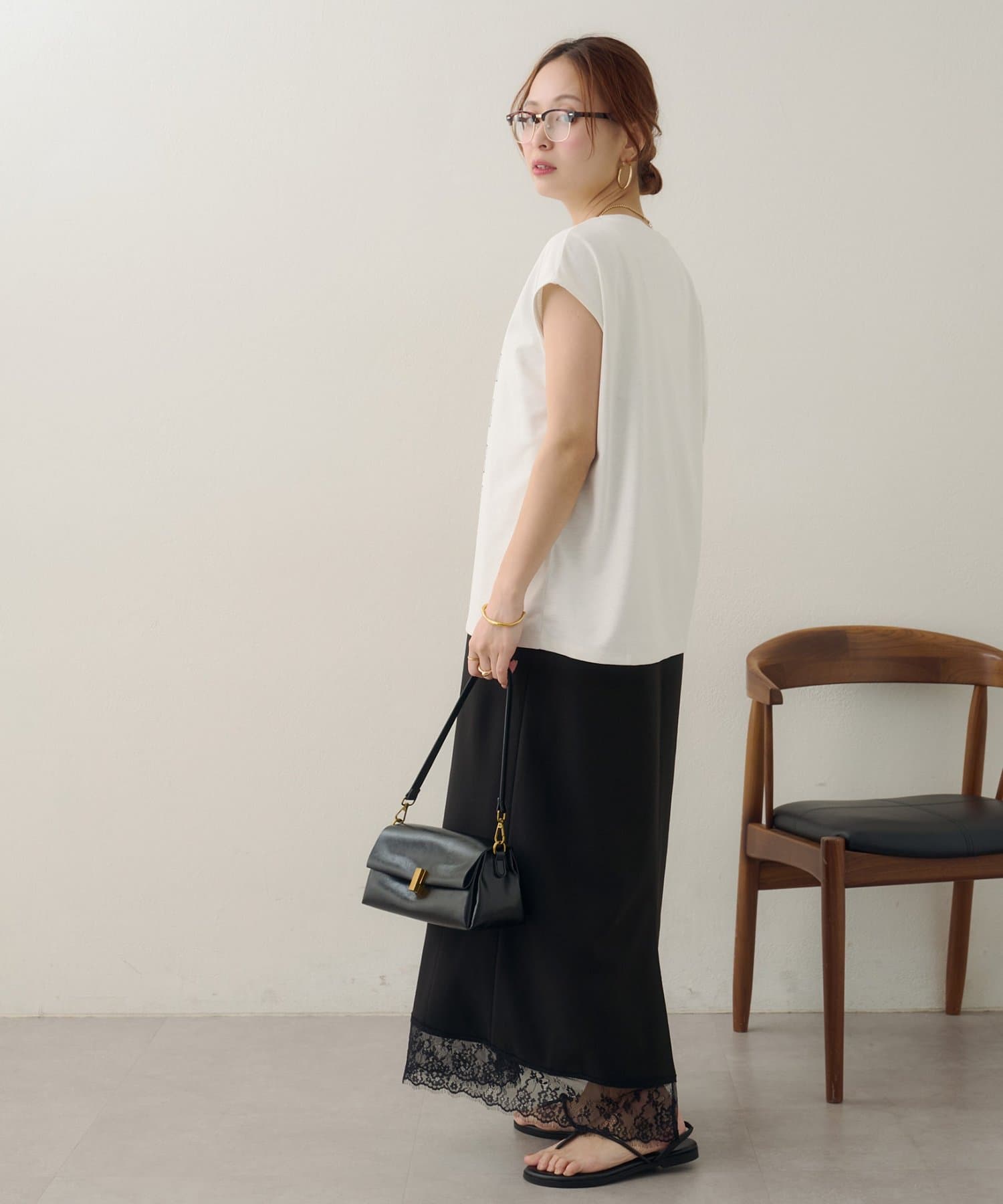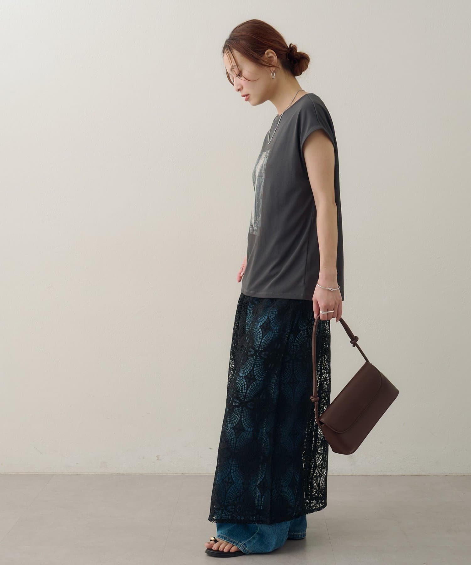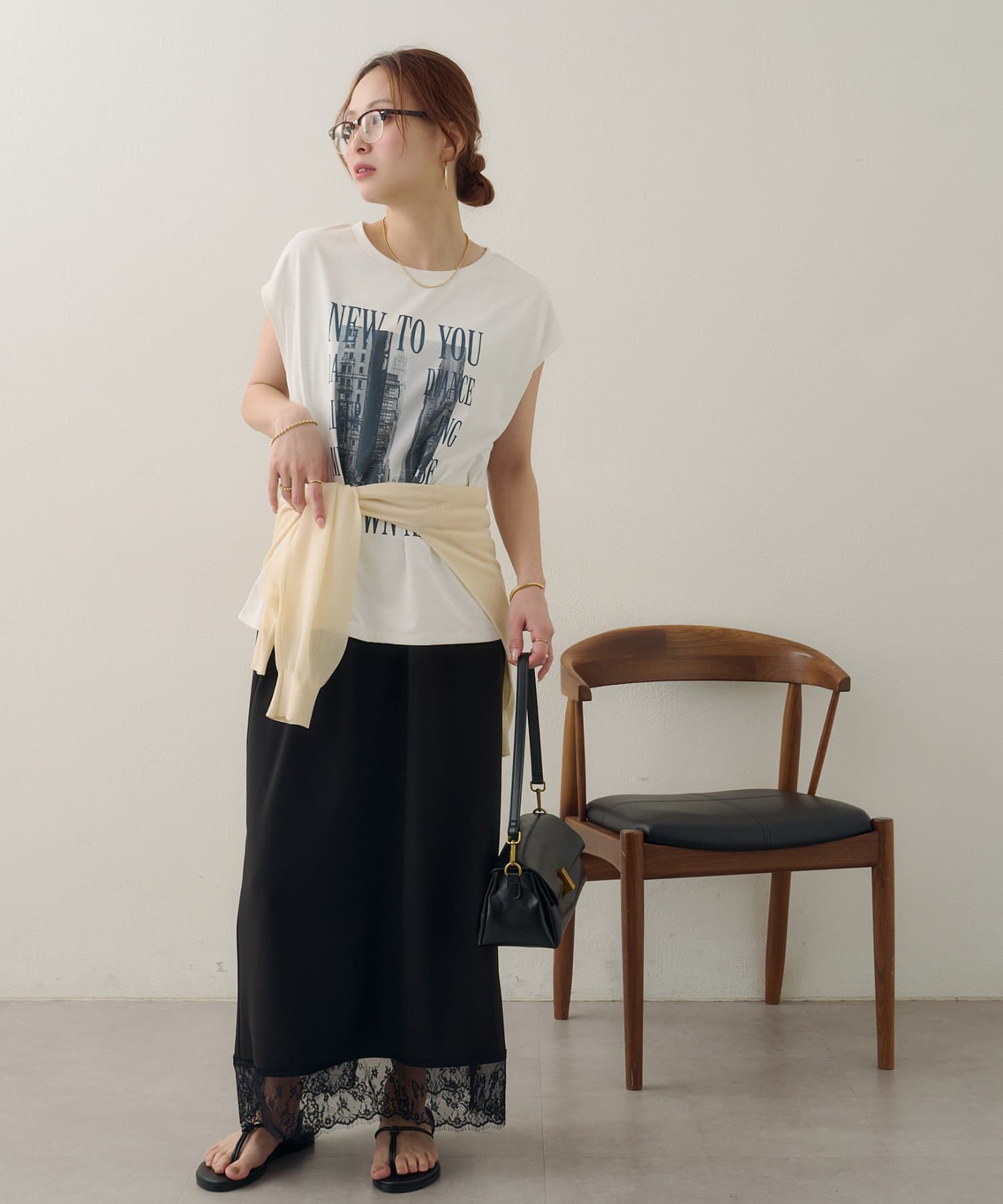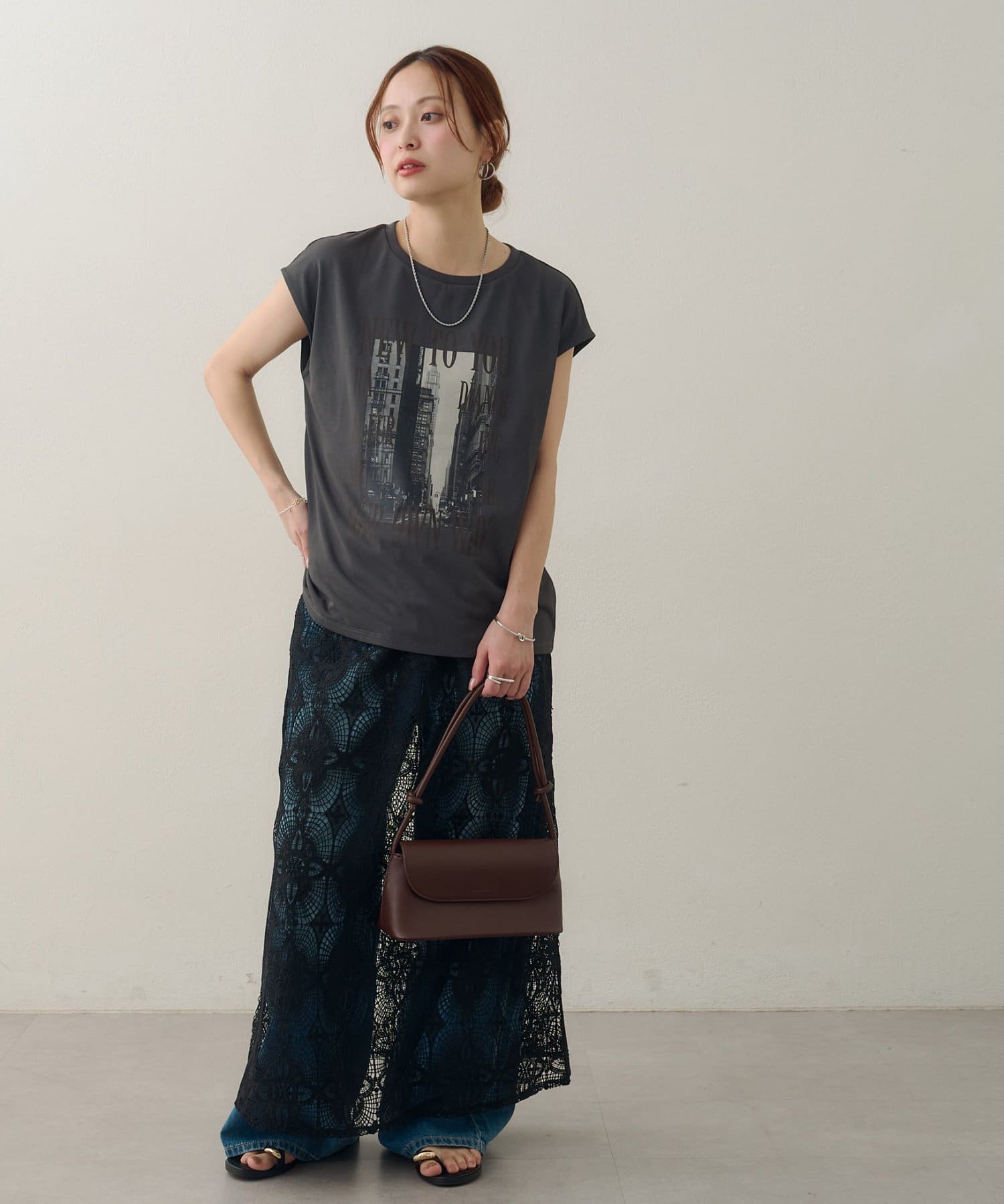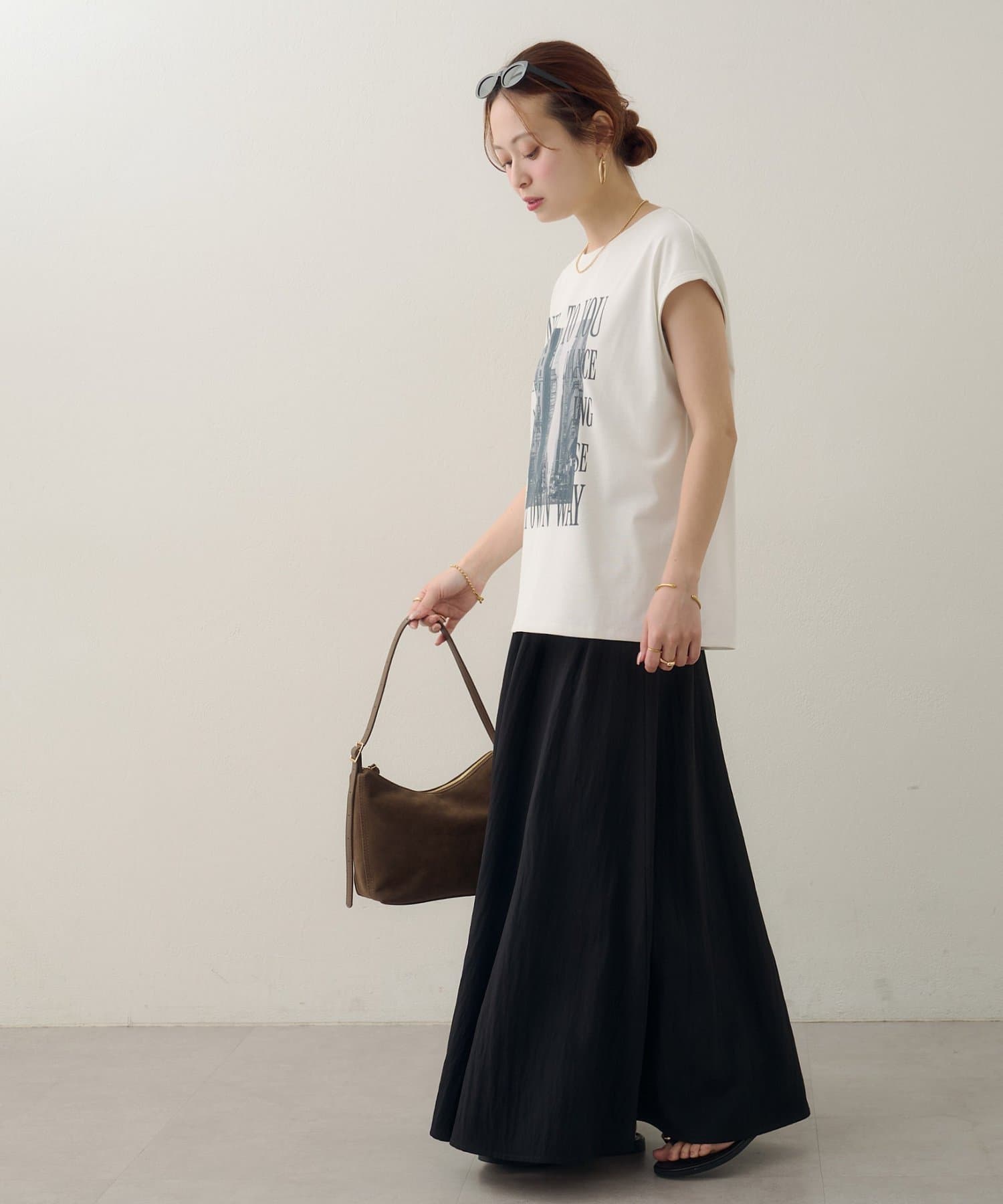 157cmスタッフ:ちょうどよい丈感で、パンツにもスカートにも合わせやすい万能な一枚です。ニュアンスのあるモノトーンのフォトプリントがお洒落で、