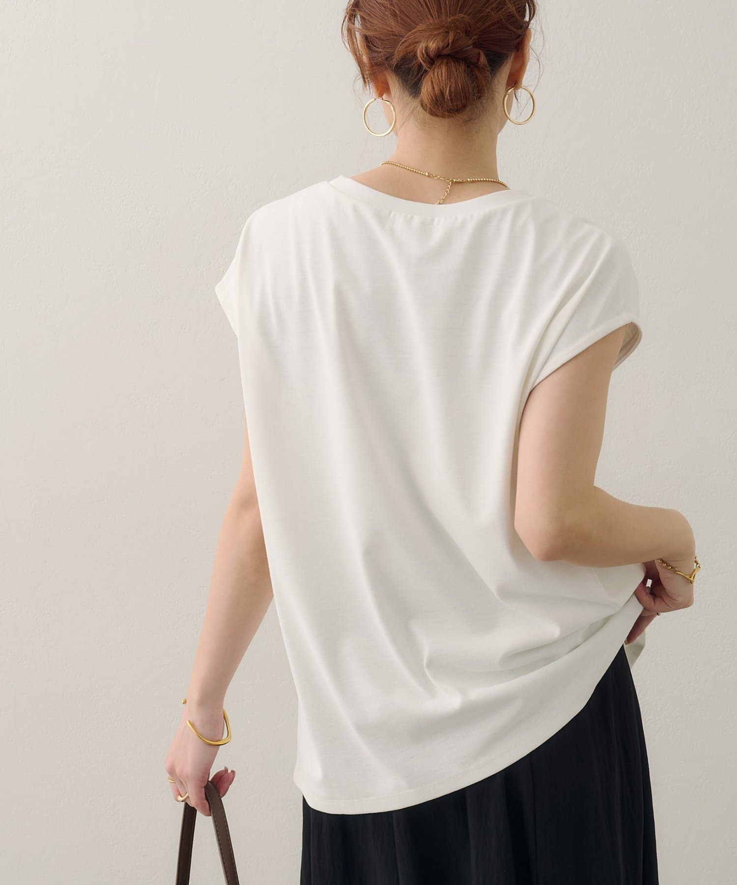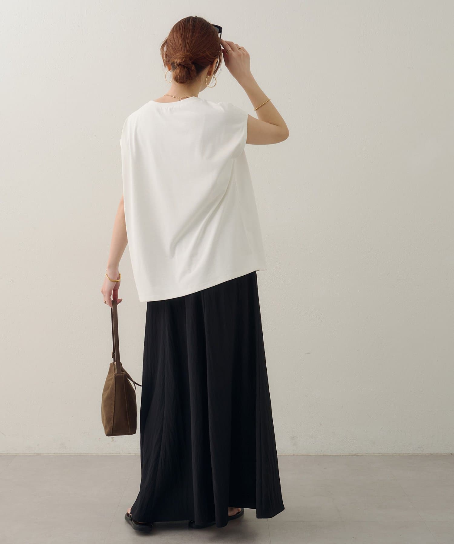 ゆとりのあるサイズ感ですが、落ち感のある素材なので大きく見えず、きれいなシルエットで着用できます!