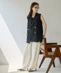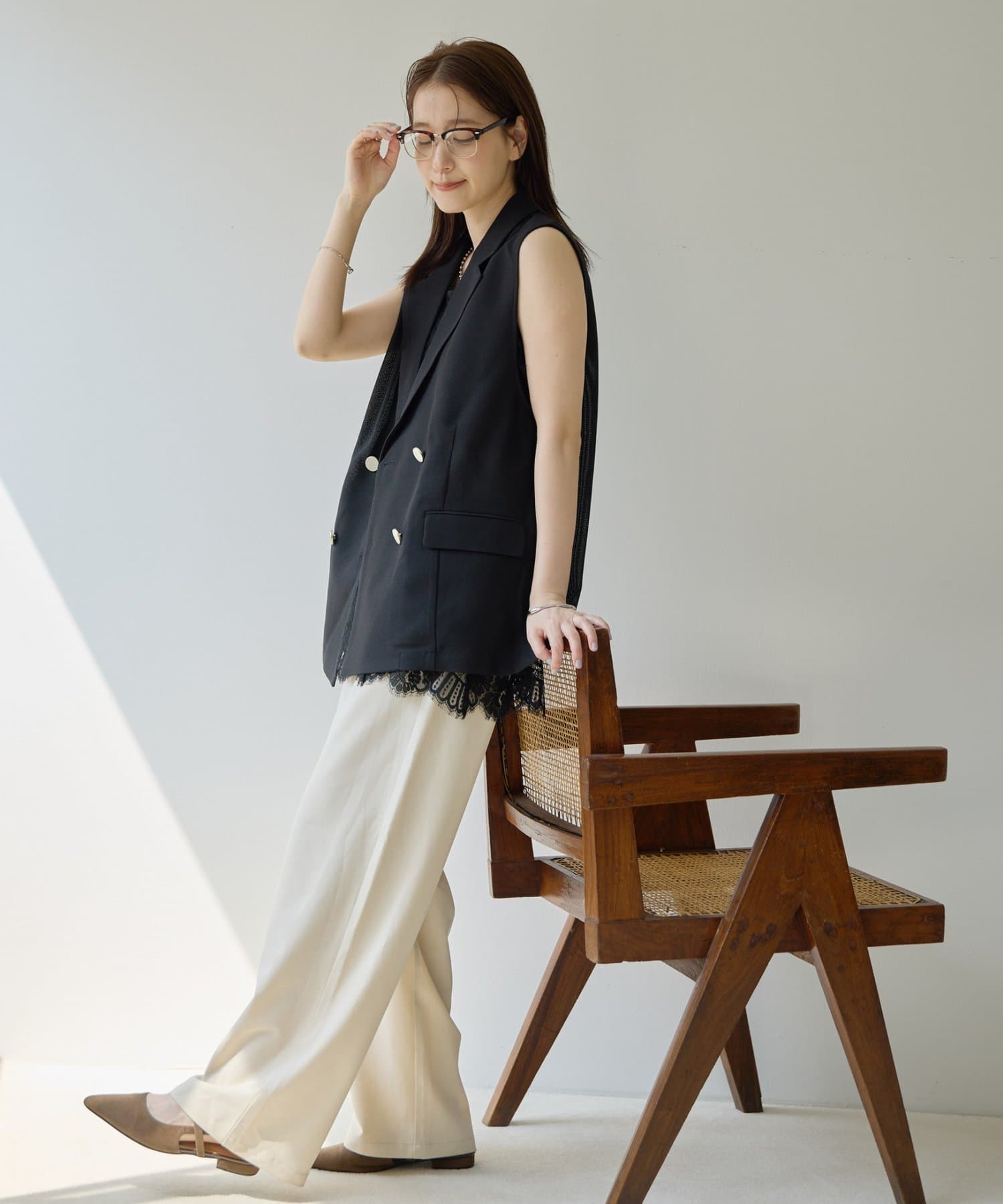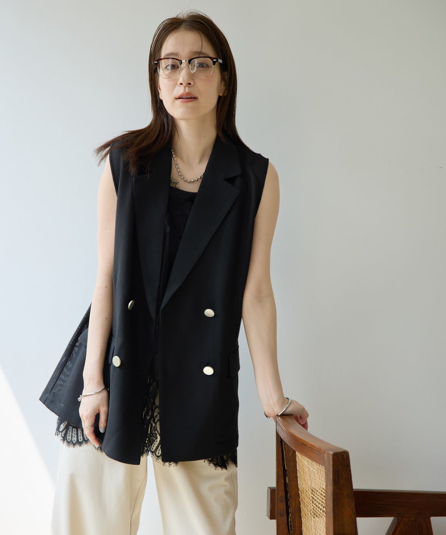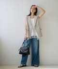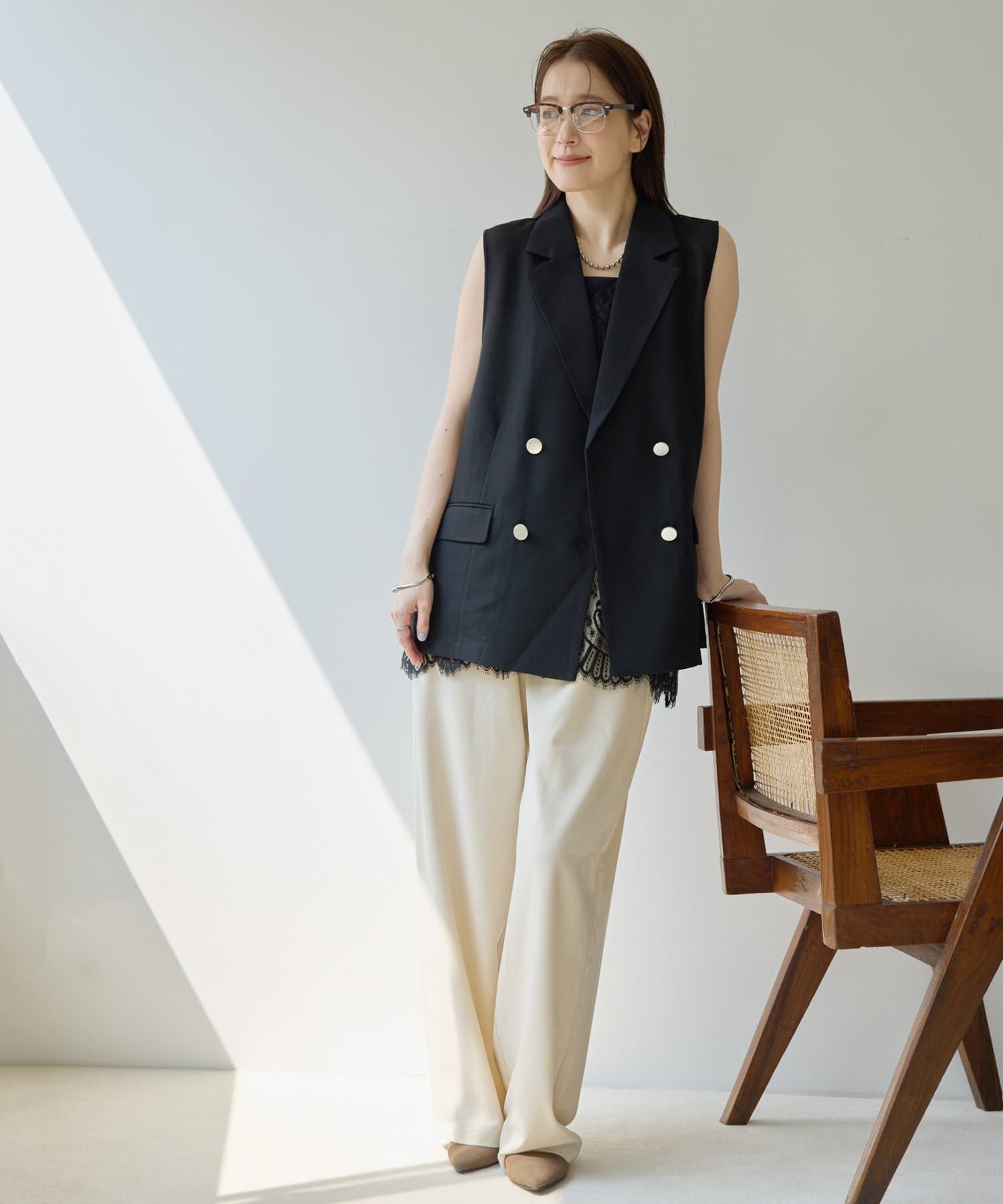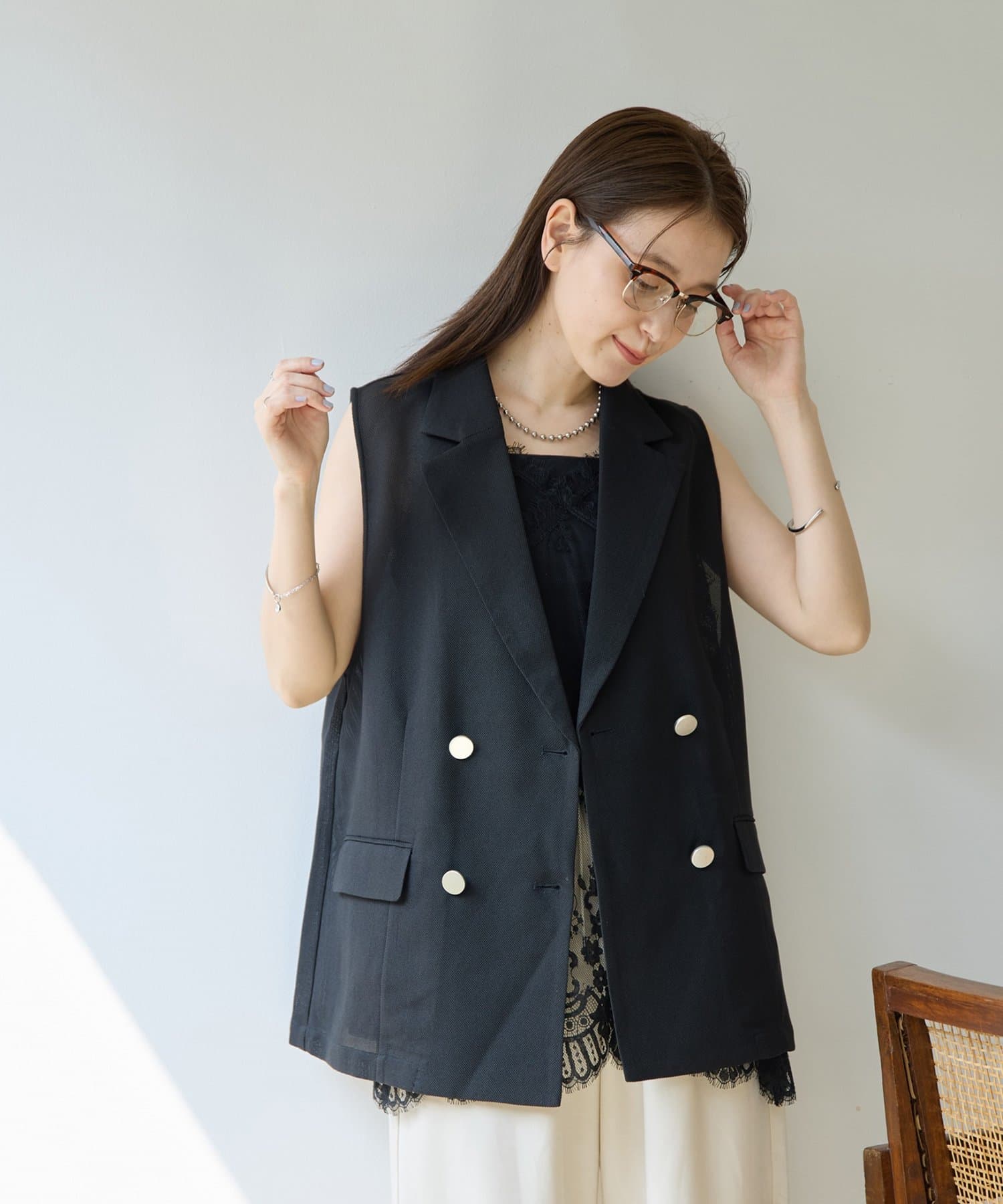 157cmスタッフ:パンツともスカートともバランスが取りやすい丁度良い丈感でした。アームホールにゆとりがあるので、少しボリュームのある袖のトップスの上からでもスムーズに着用できました!!オールブラックコーデにした時も、透け感のあるジレのおかげでコーデ全体が重く見えないのも◎