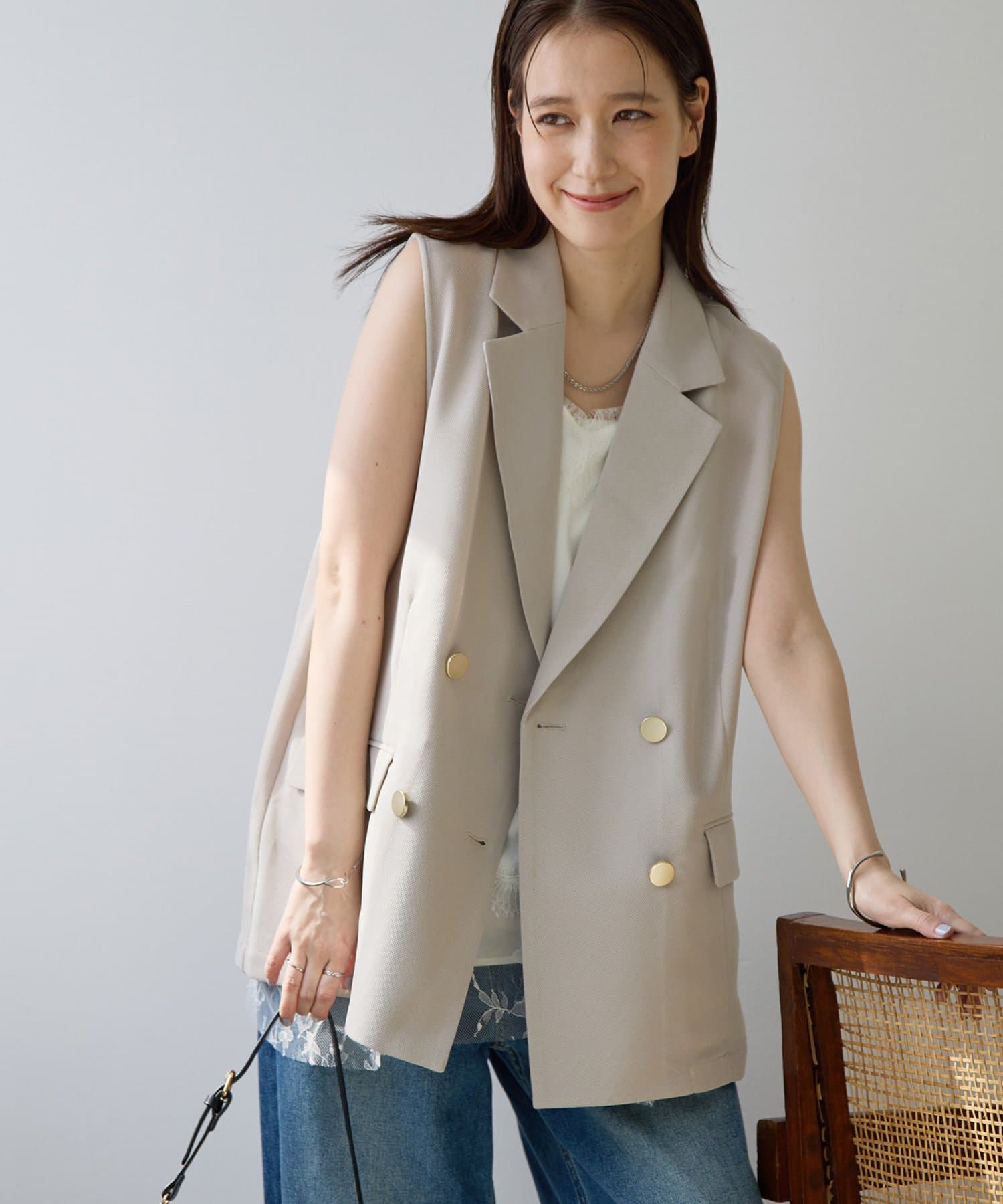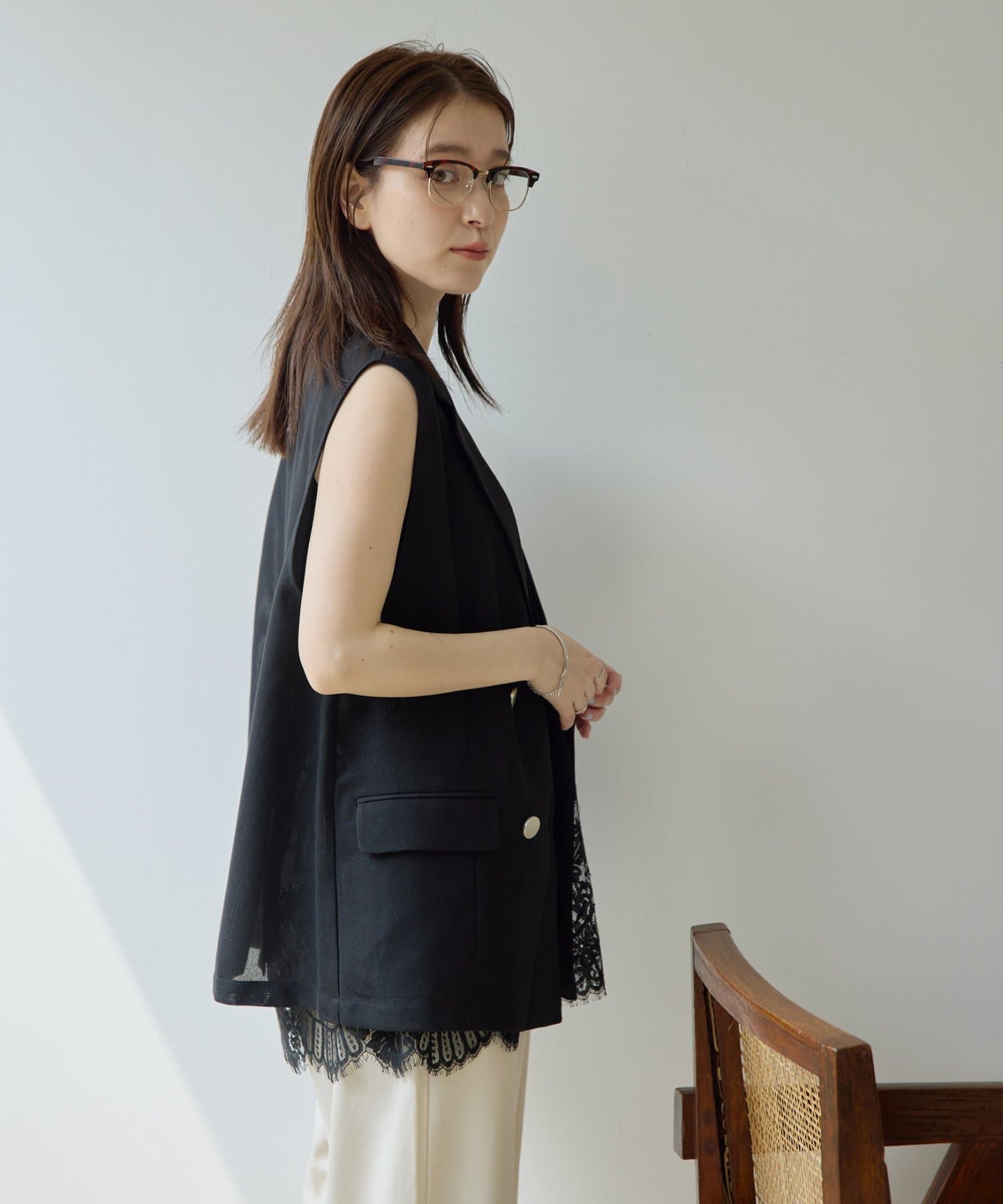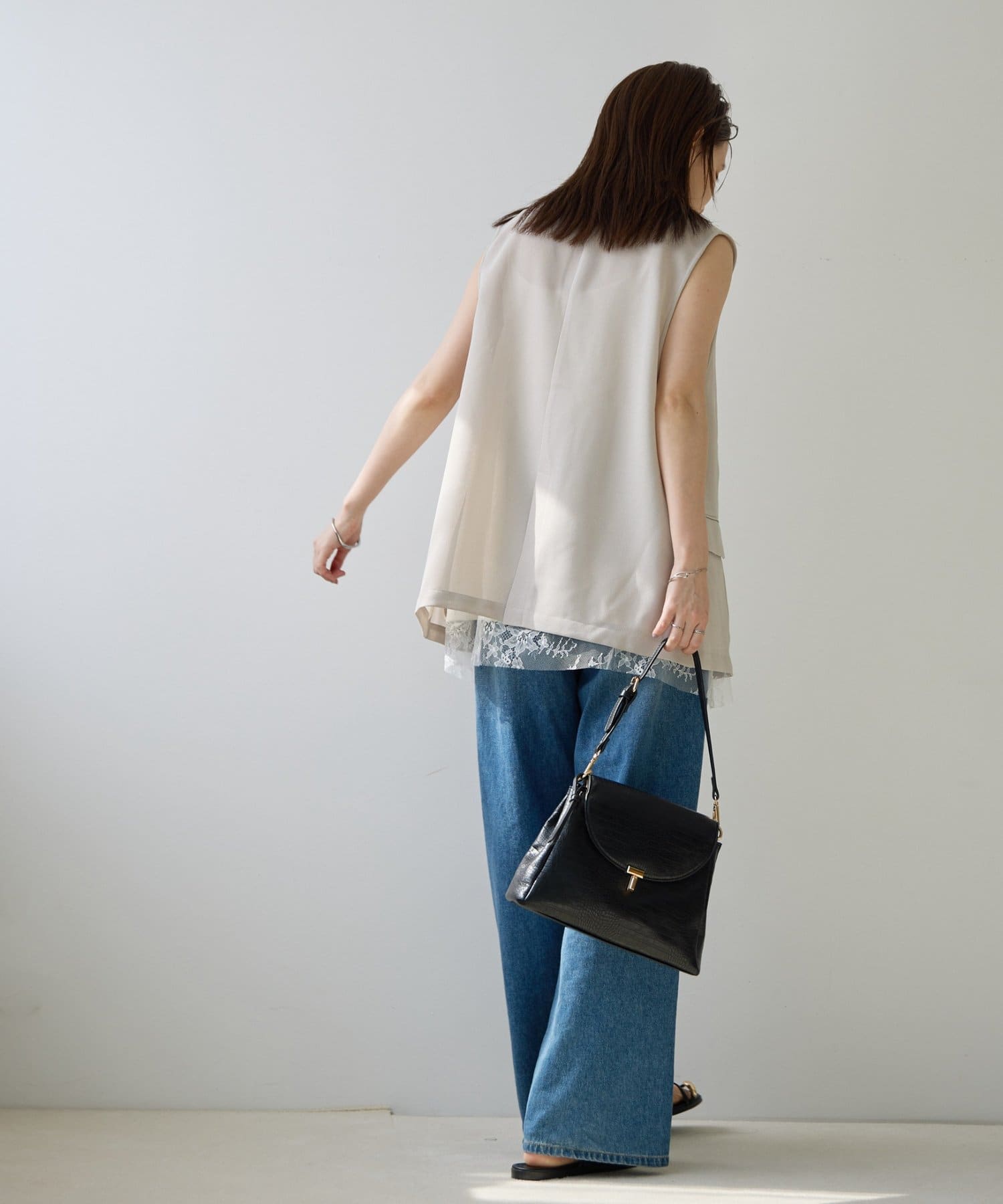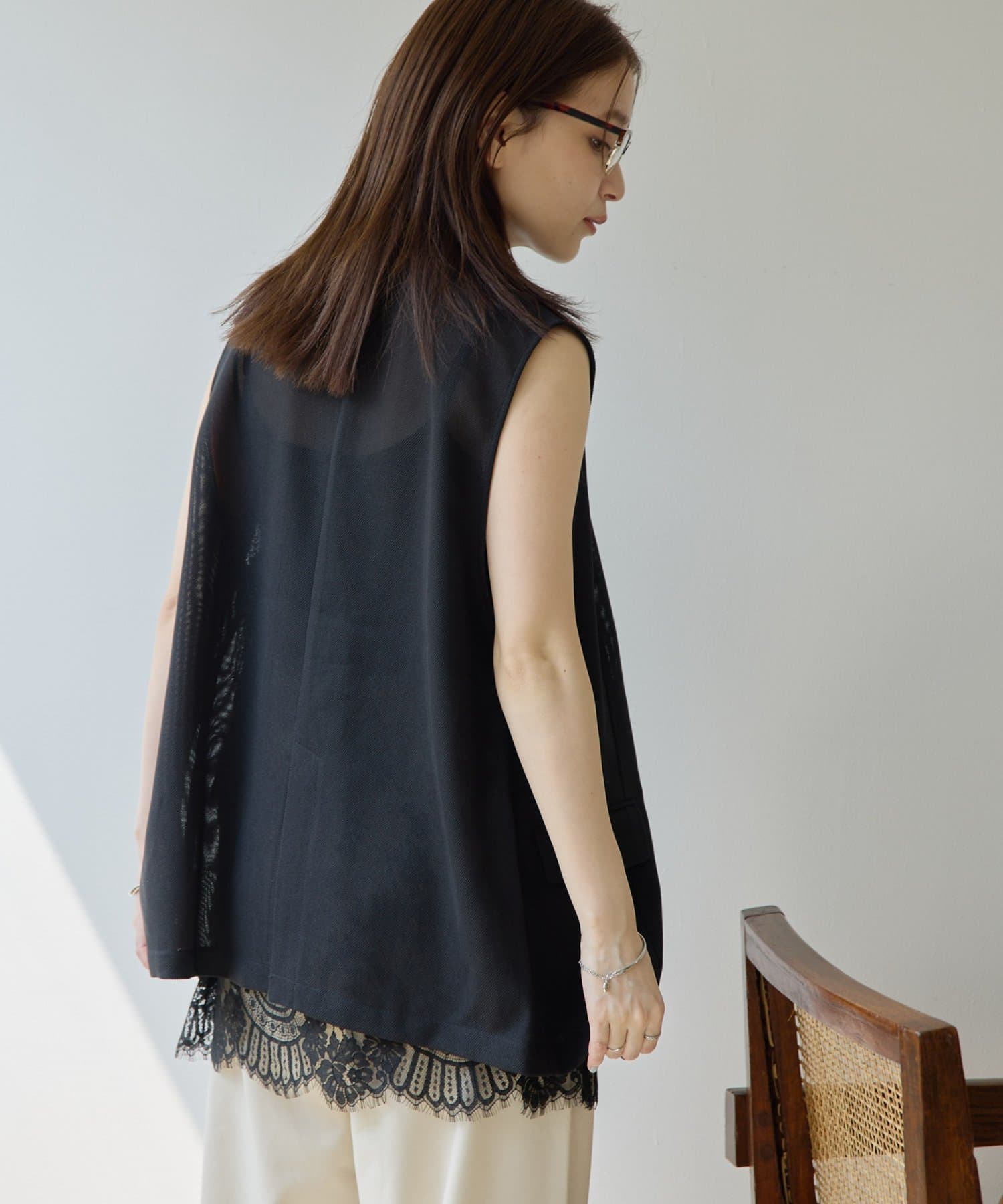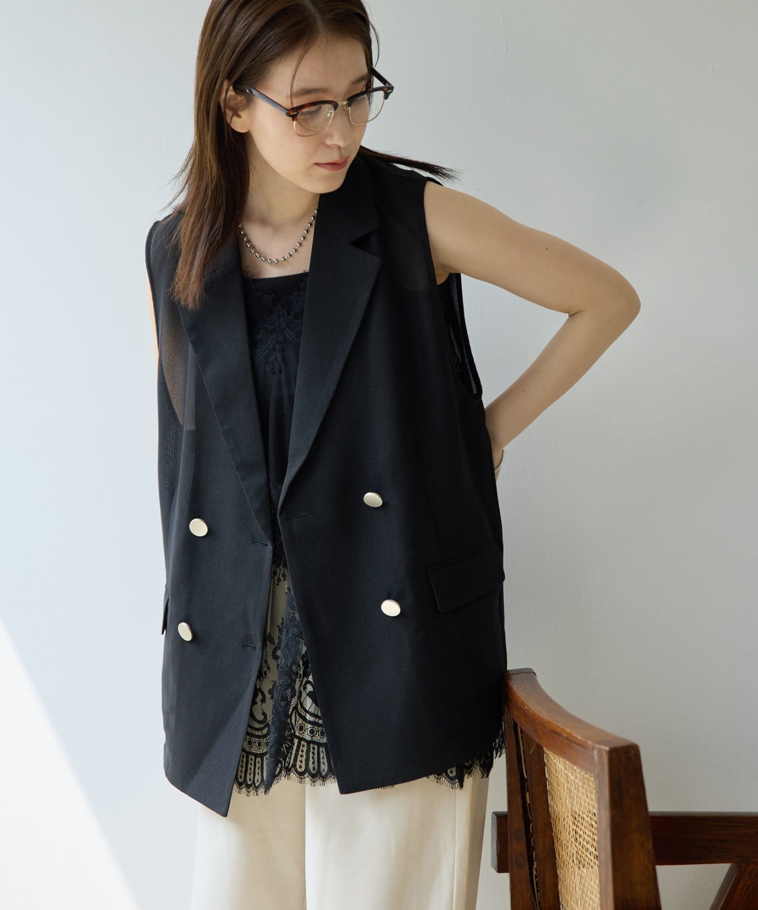 157cmスタッフ:パンツともスカートともバランスが取りやすい丁度良い丈感でした。アームホールにゆとりがあるので、少しボリュームのある袖のトップスの上からでもスムーズに着用できました!!オールブラックコーデにした時も、透け感のあるジレのおかげでコーデ全体が重く見えないのも◎