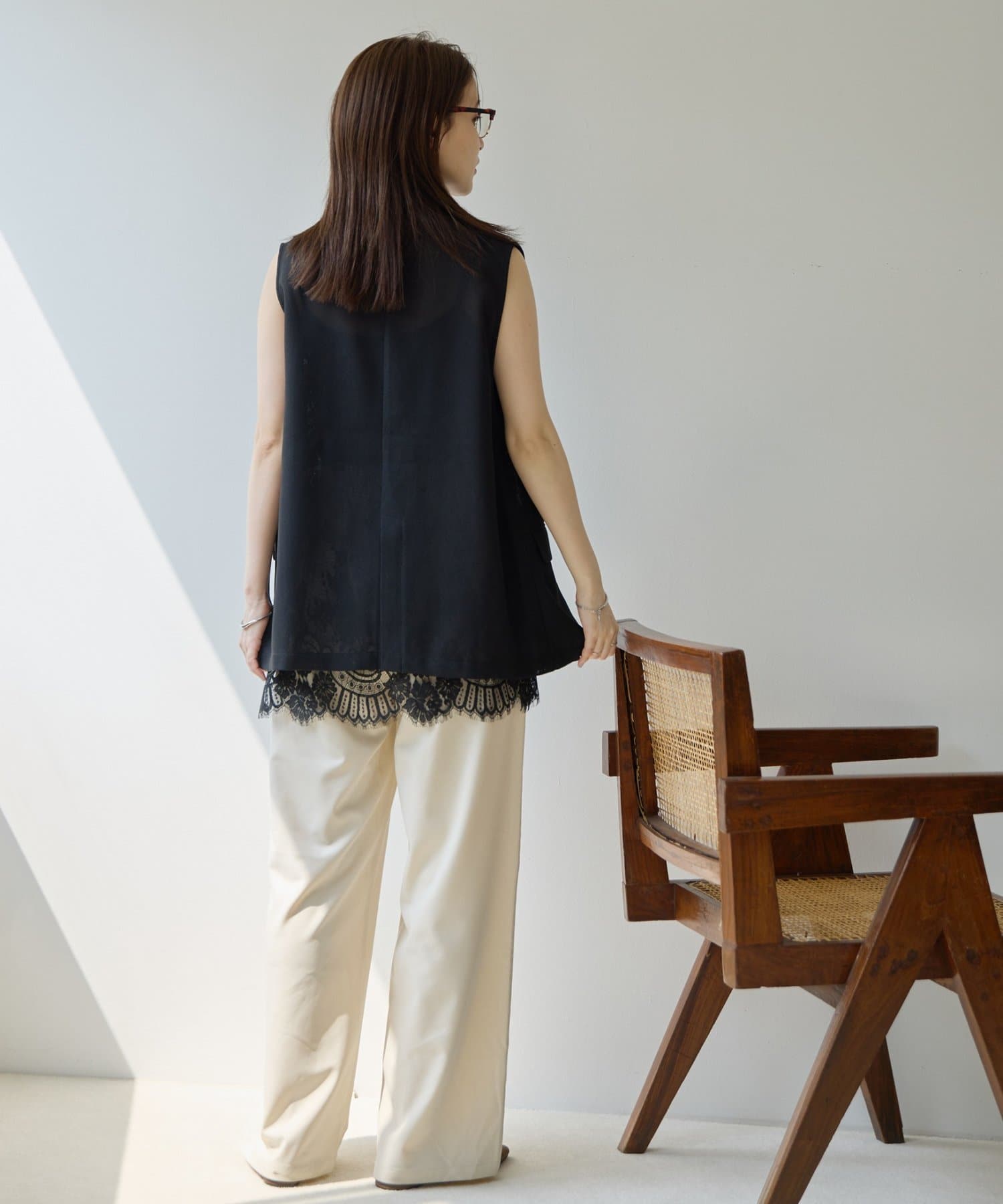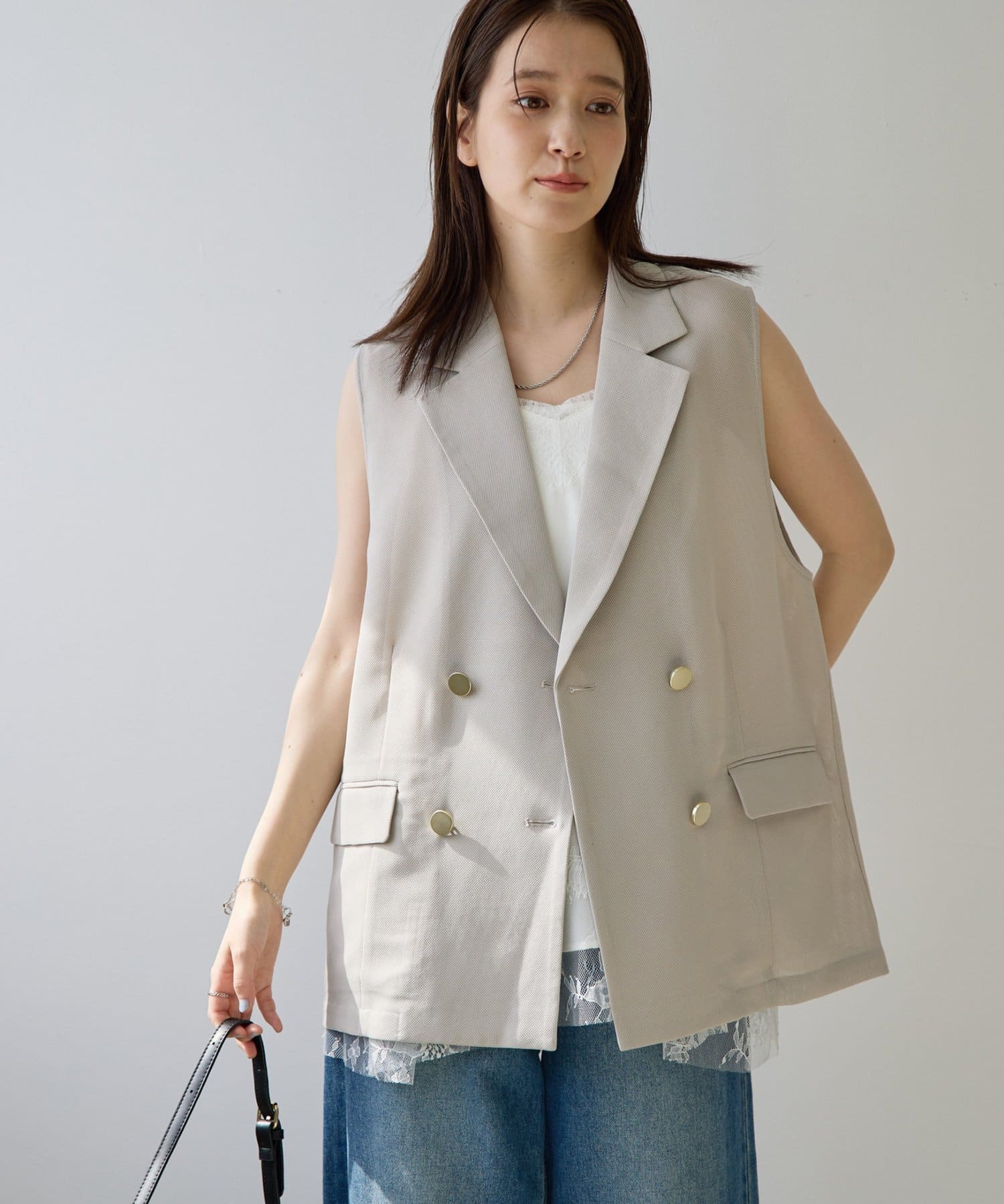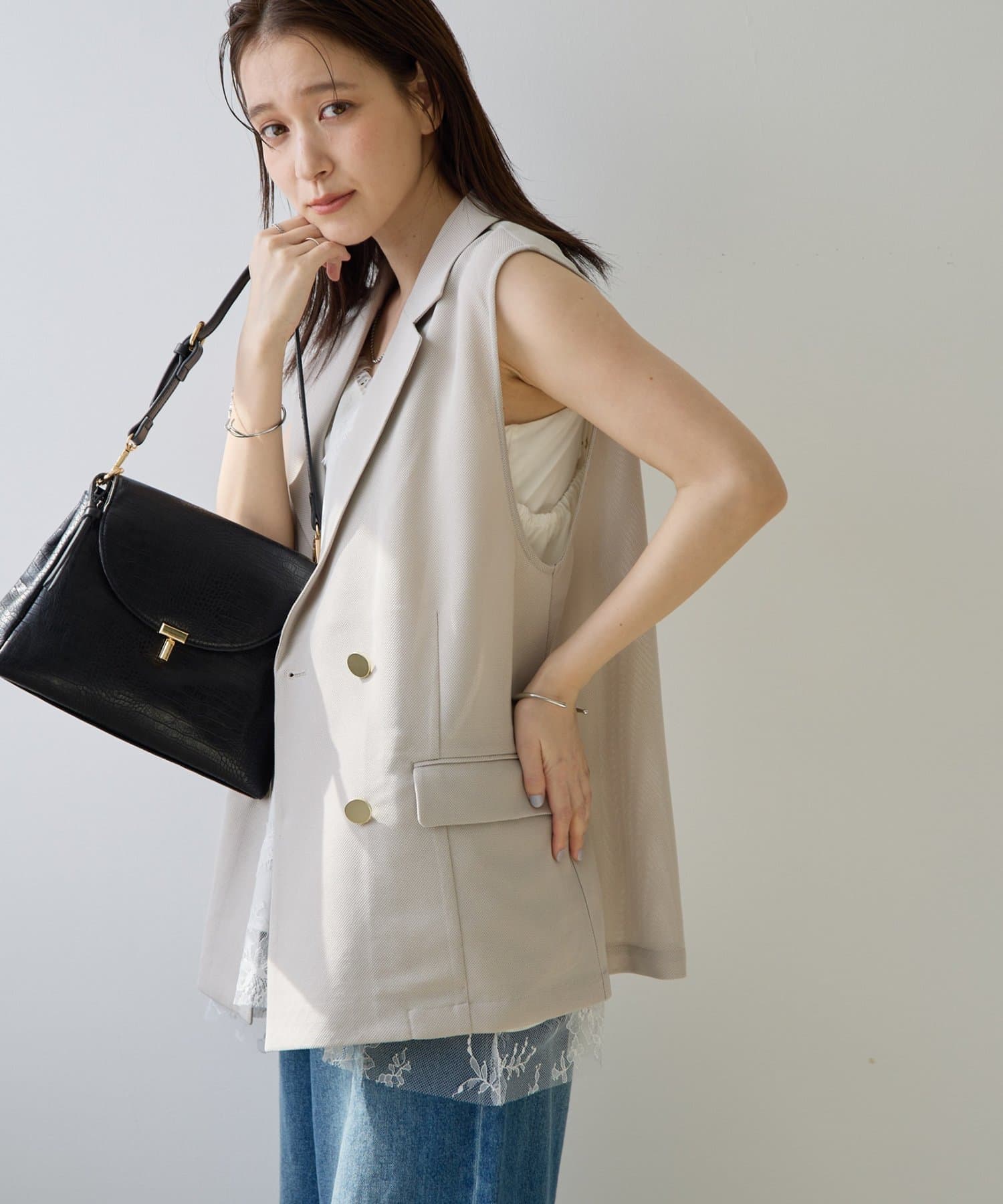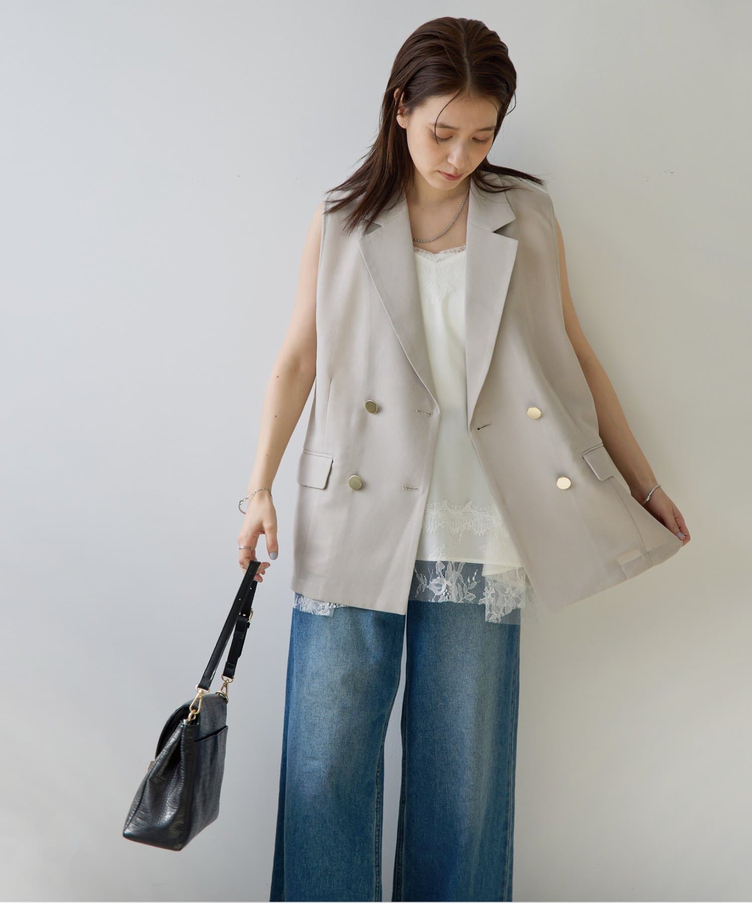 157cmスタッフ:パンツともスカートともバランスが取りやすい丁度良い丈感でした。アームホールにゆとりがあるので、少しボリュームのある袖のトップスの上からでもスムーズに着用できました!!オールブラックコーデにした時も、透け感のあるジレのおかげでコーデ全体が重く見えないのも◎