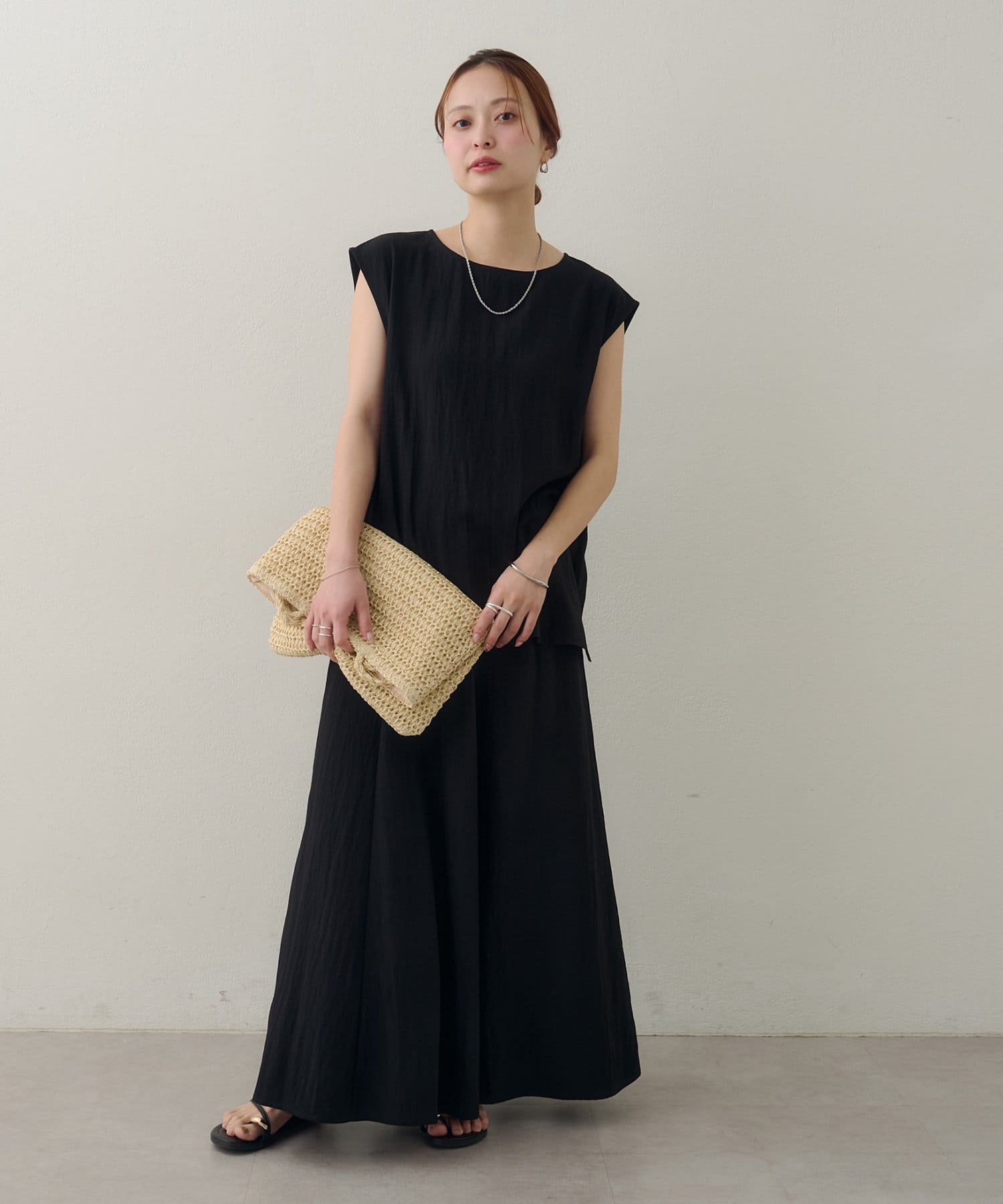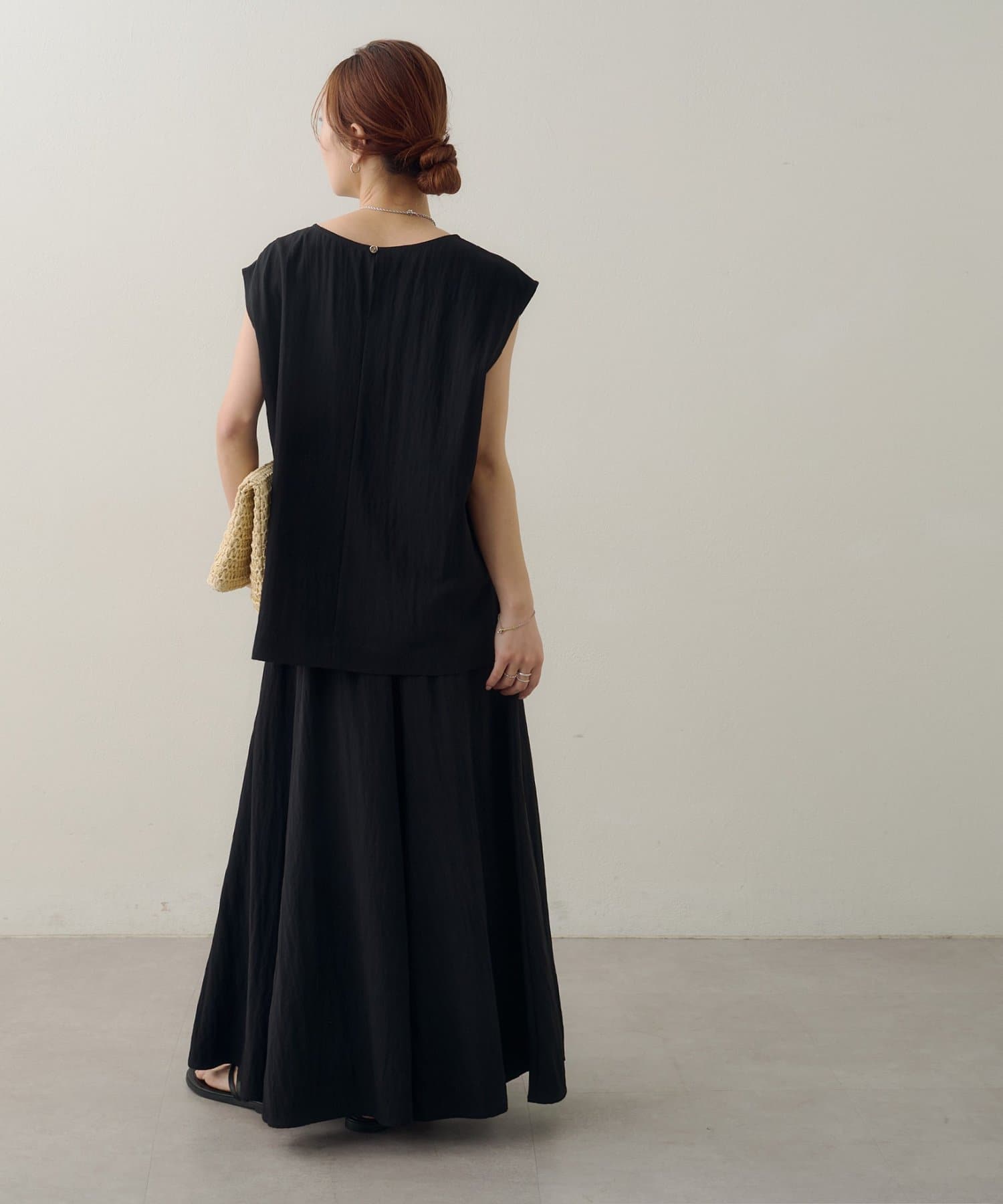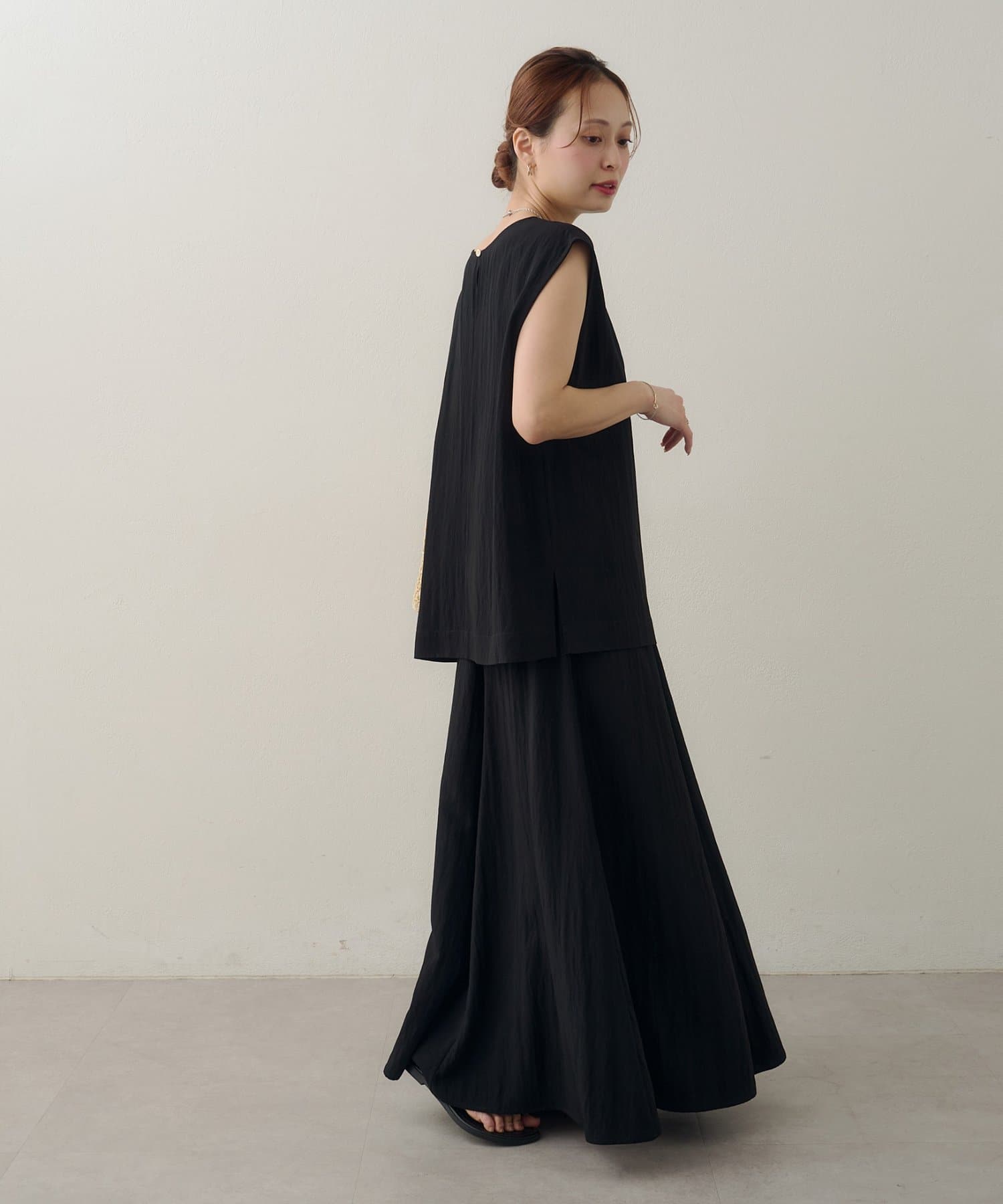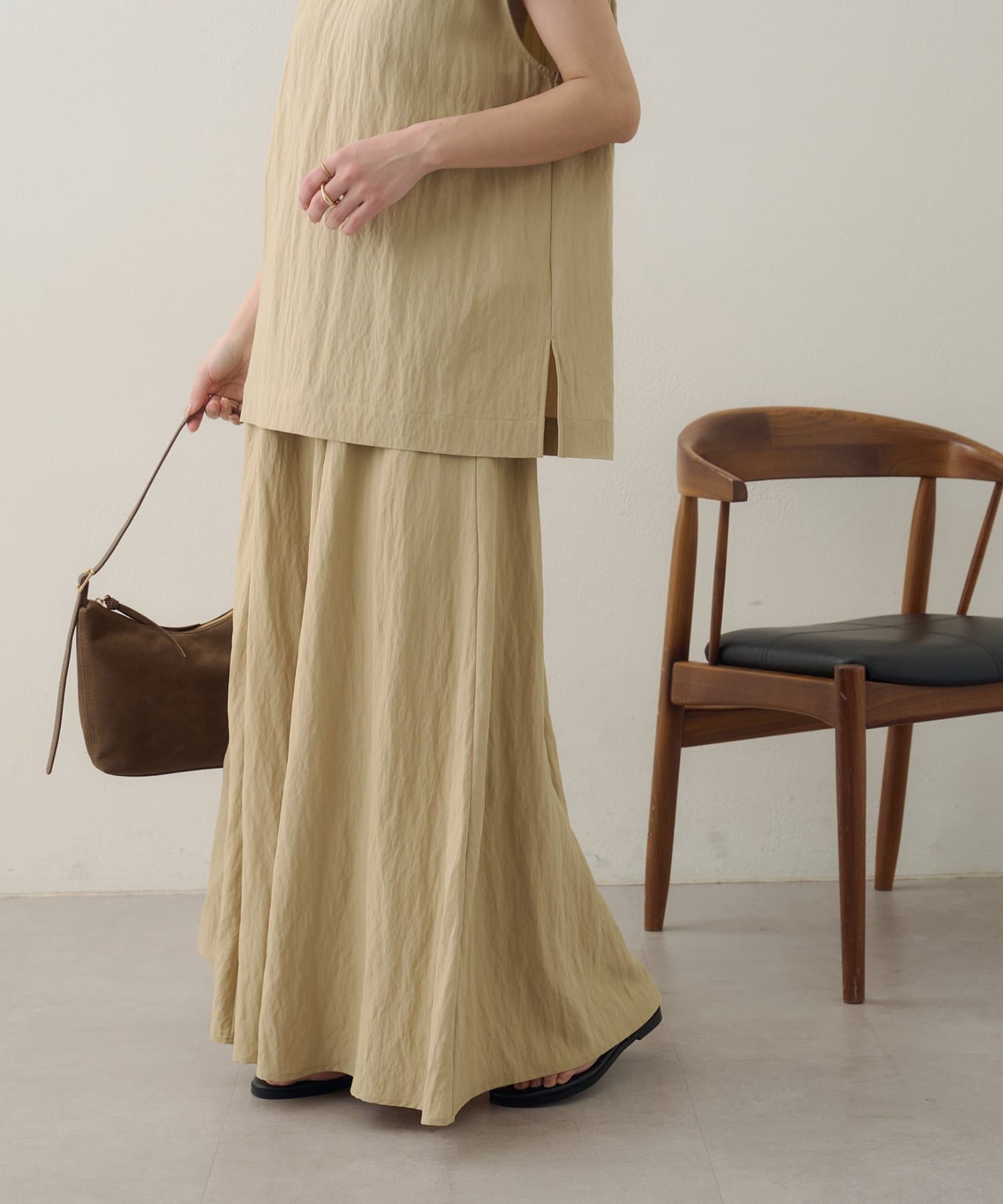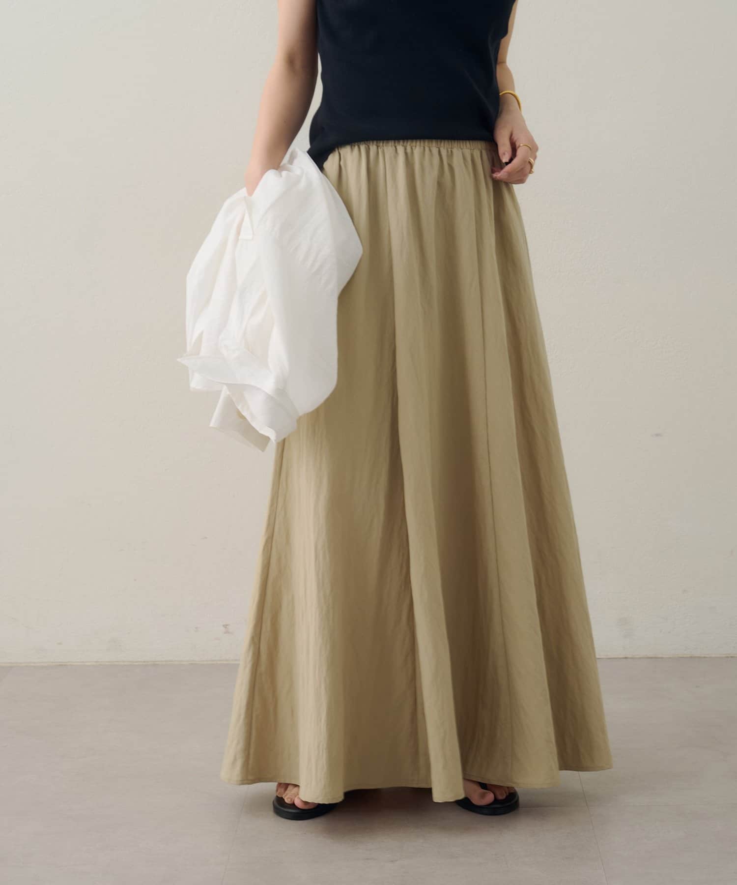152cmスタッフ:素肌にさらりと心地よく着られる素材感で、暑い日にもストレスフリーで着られそう♪ロングスカートなので、ハイウエストで履いて、ヒール合わせにすると小柄な私でも着こなせました!!ウエストゴムなので着心地もとても楽ちんでした。