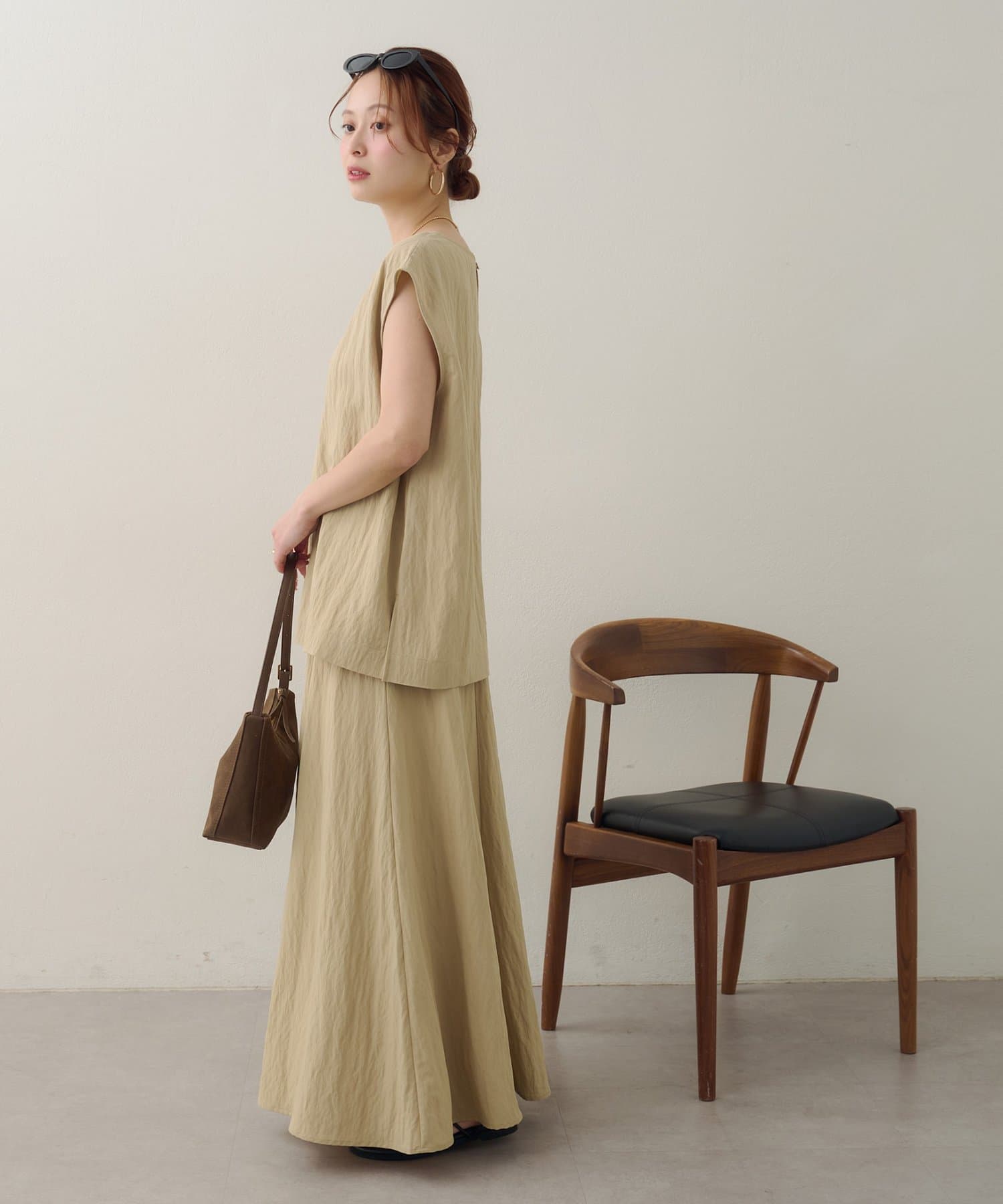 162cmスタッフ:ブラウスは程よいゆとりがあり、気になる体のラインを拾わないのが嬉しいです。スカートの丈感もちょうどよく、歩くたびにしなやかに揺れる様が上品で高見えします!合わせる小物をパールやパンプスにすると、お食事会やセミフォーマルなシーンにもぴったりな雰囲気に♪