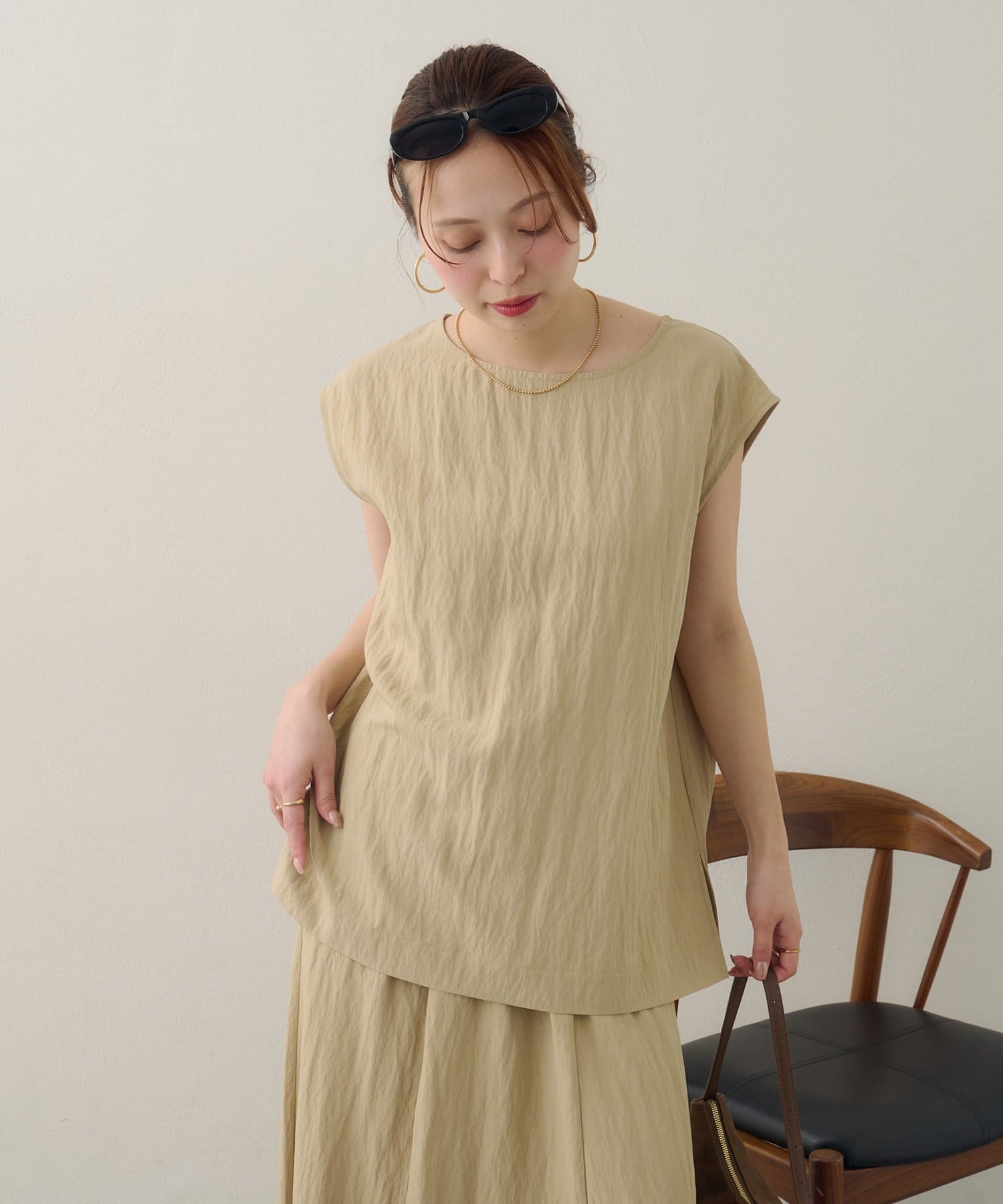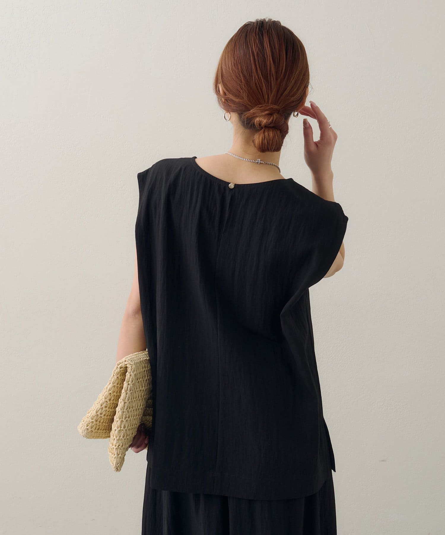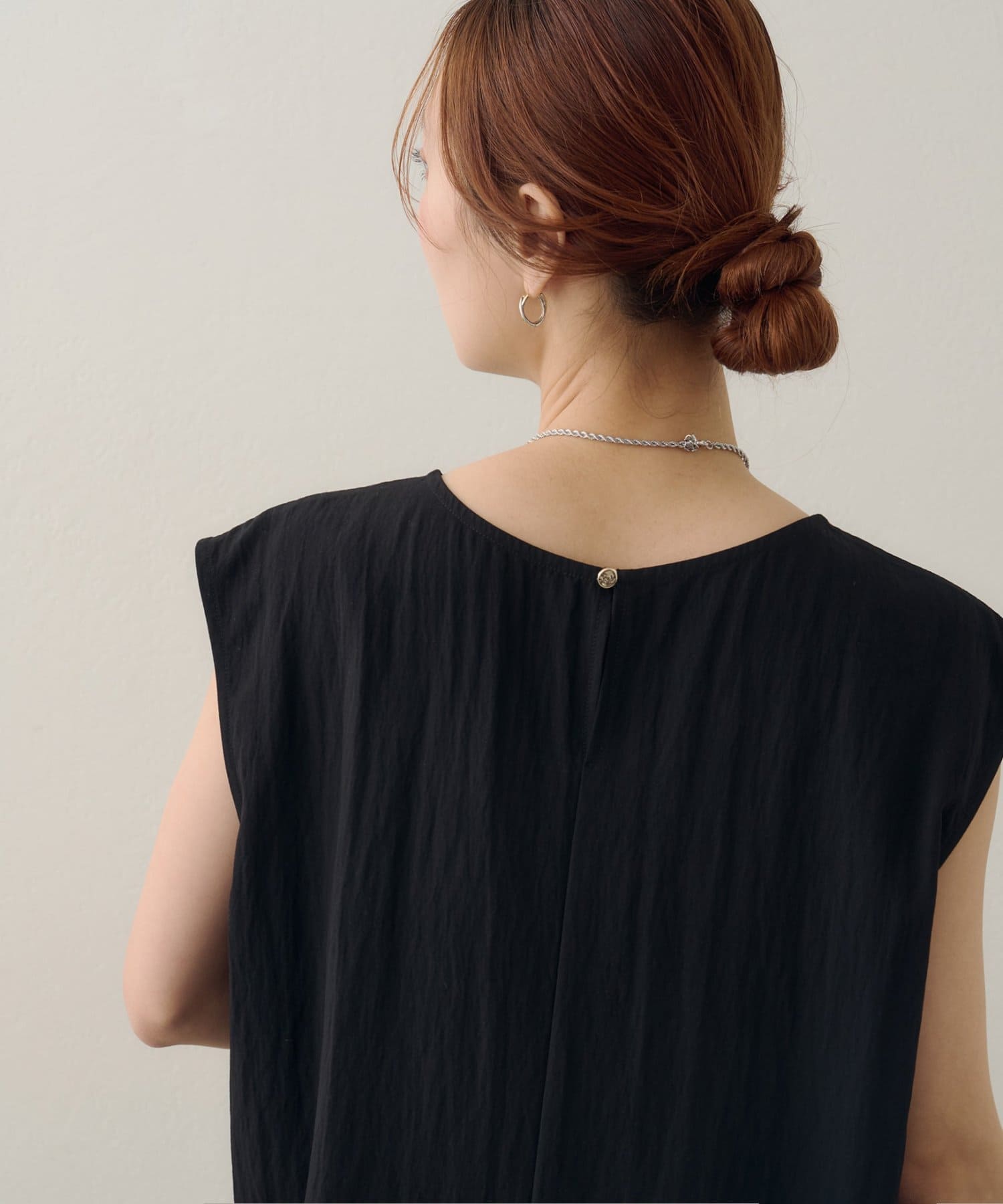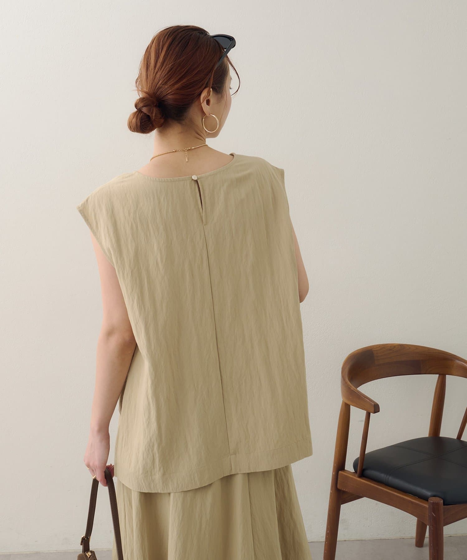 168cmスタッフ:ブラウスは大きすぎずジャストなサイズ感で、上からジャケットを羽織ってももたつかずに着用できます◎裏地なしですが、透け感は気にならず、涼しく着られるのも魅力的♪後ろは一つボタンなので着脱もスムーズ。コーディネートが即完成するので、忙しい朝にもつい頼りたくなりそう!