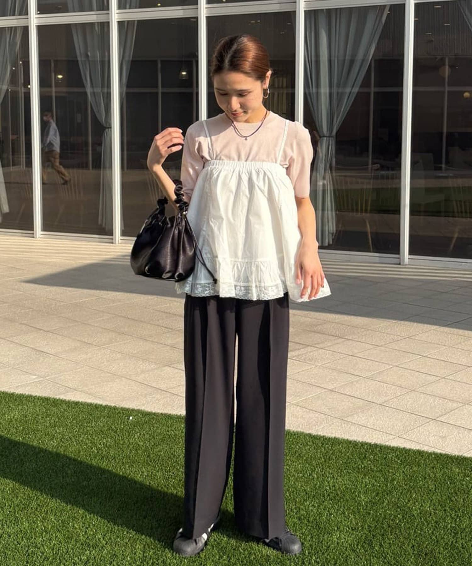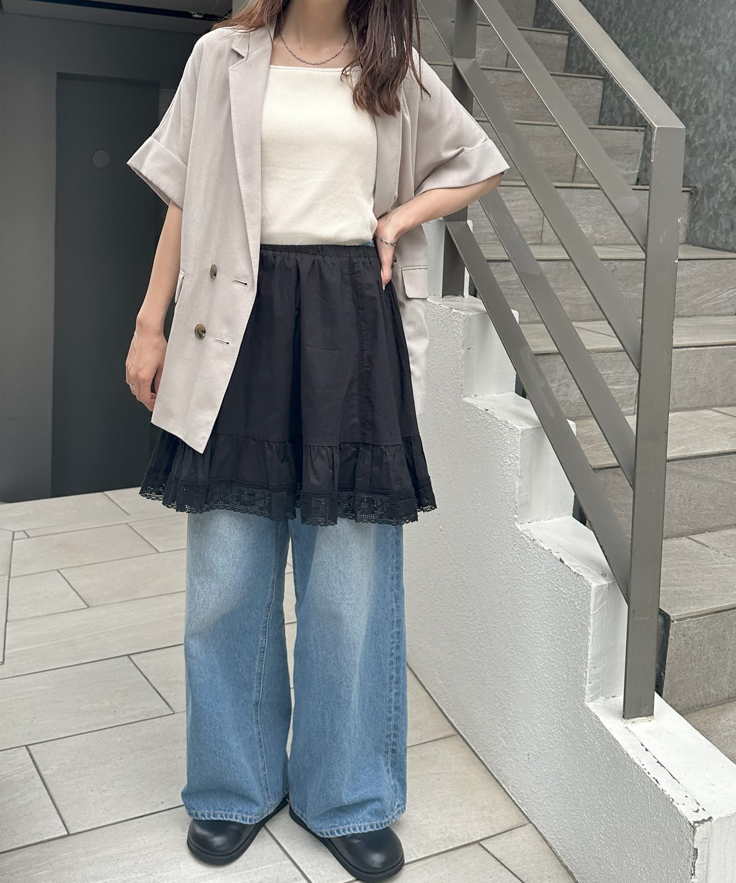 ②パンツと合わせたレイヤードコーデに